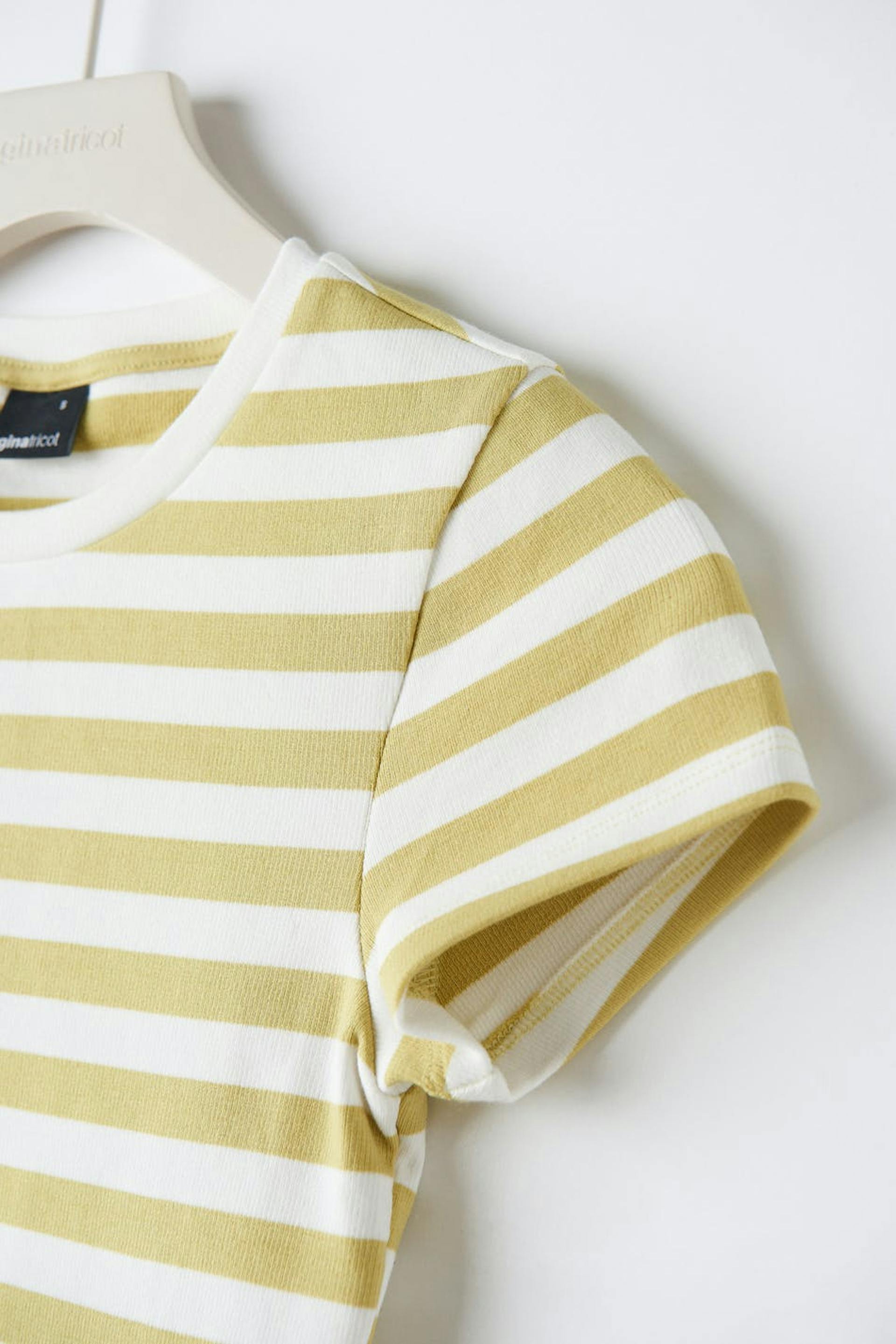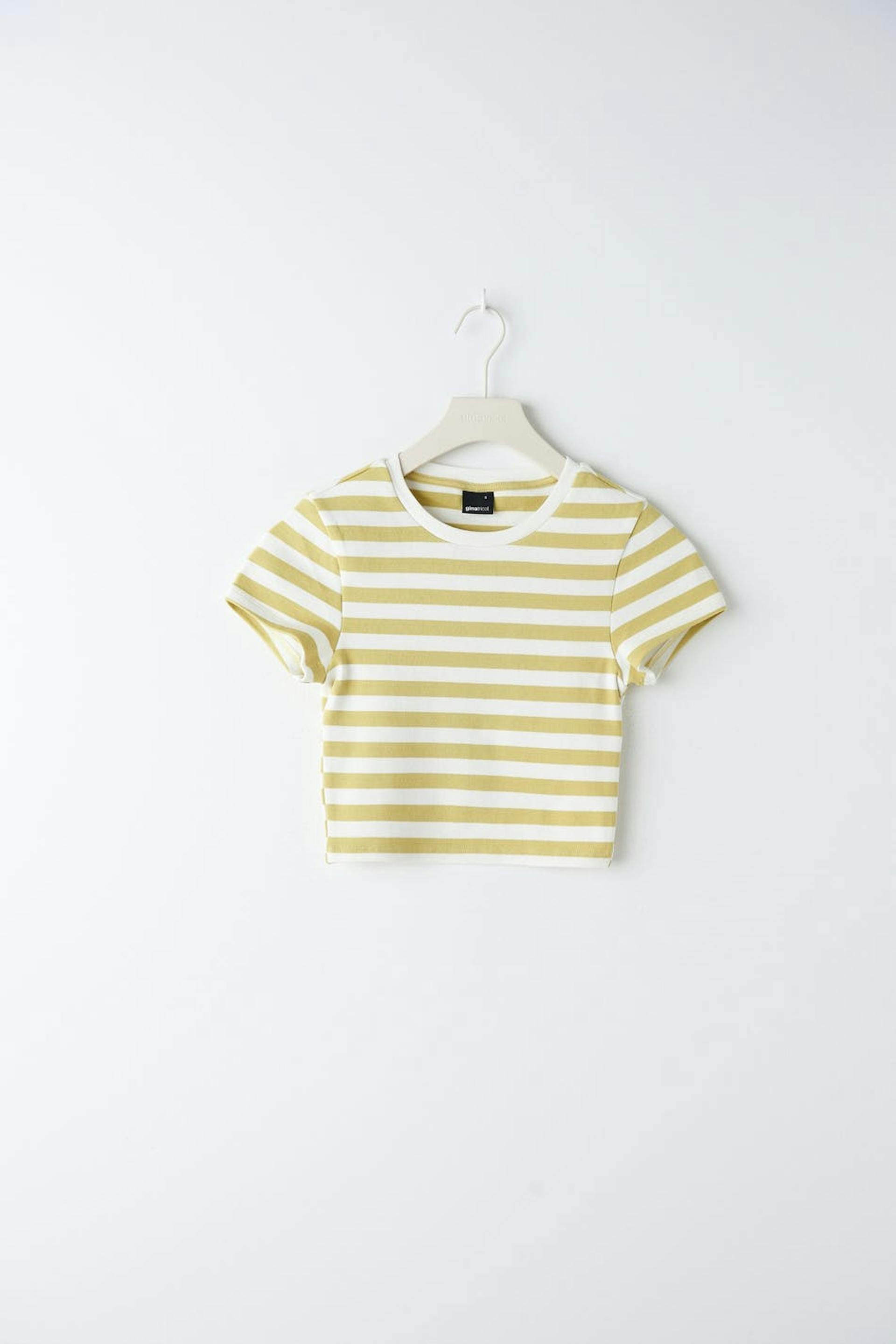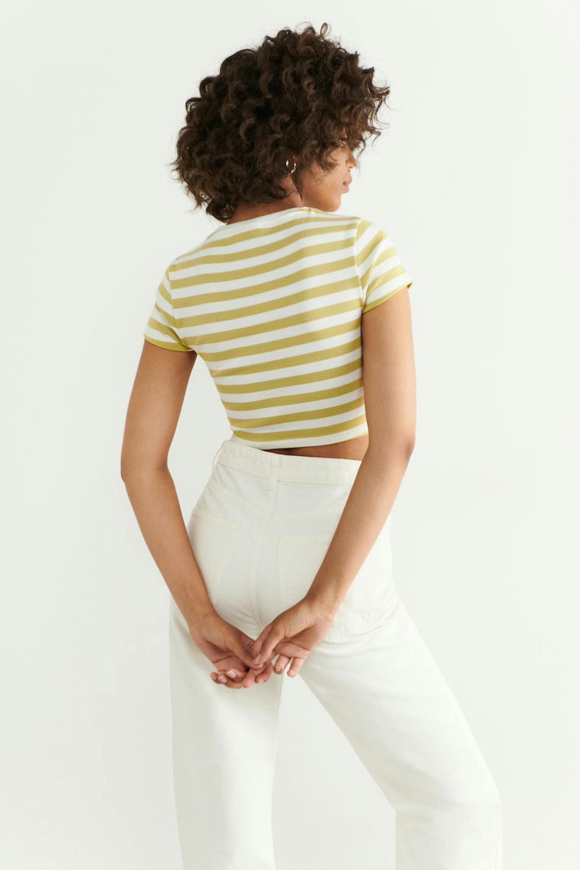 Striped top in jersey with a cropped length. The top is short-sleeved, ribbed and green.