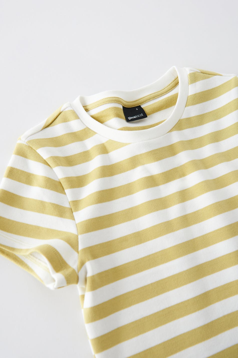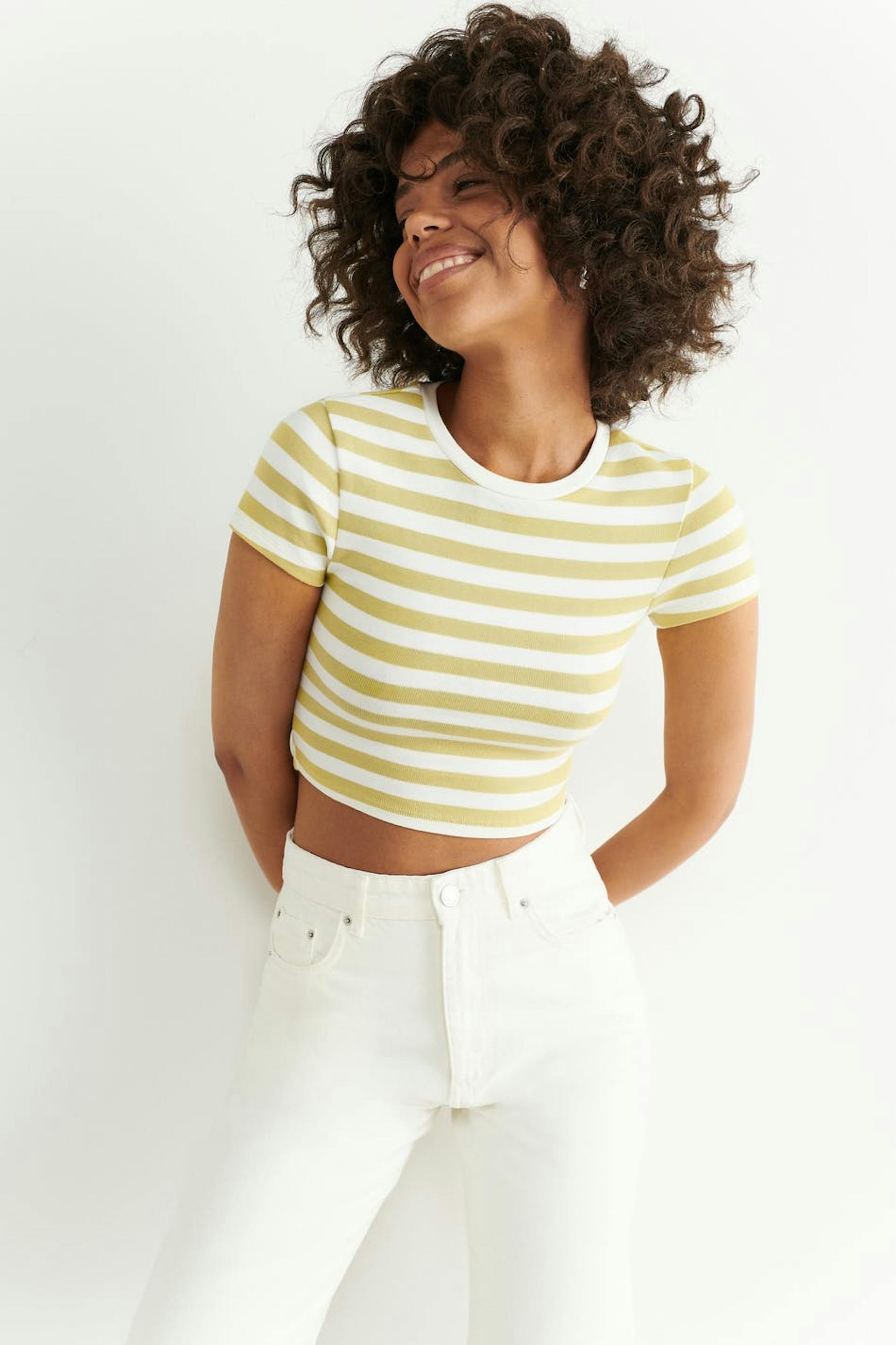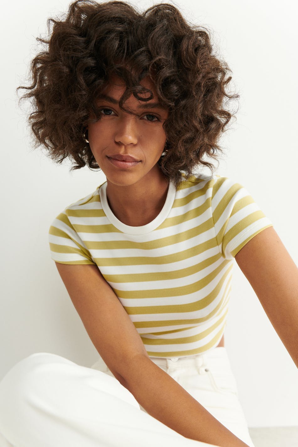 Striped top in jersey with a cropped length. The top is short-sleeved, ribbed and green.