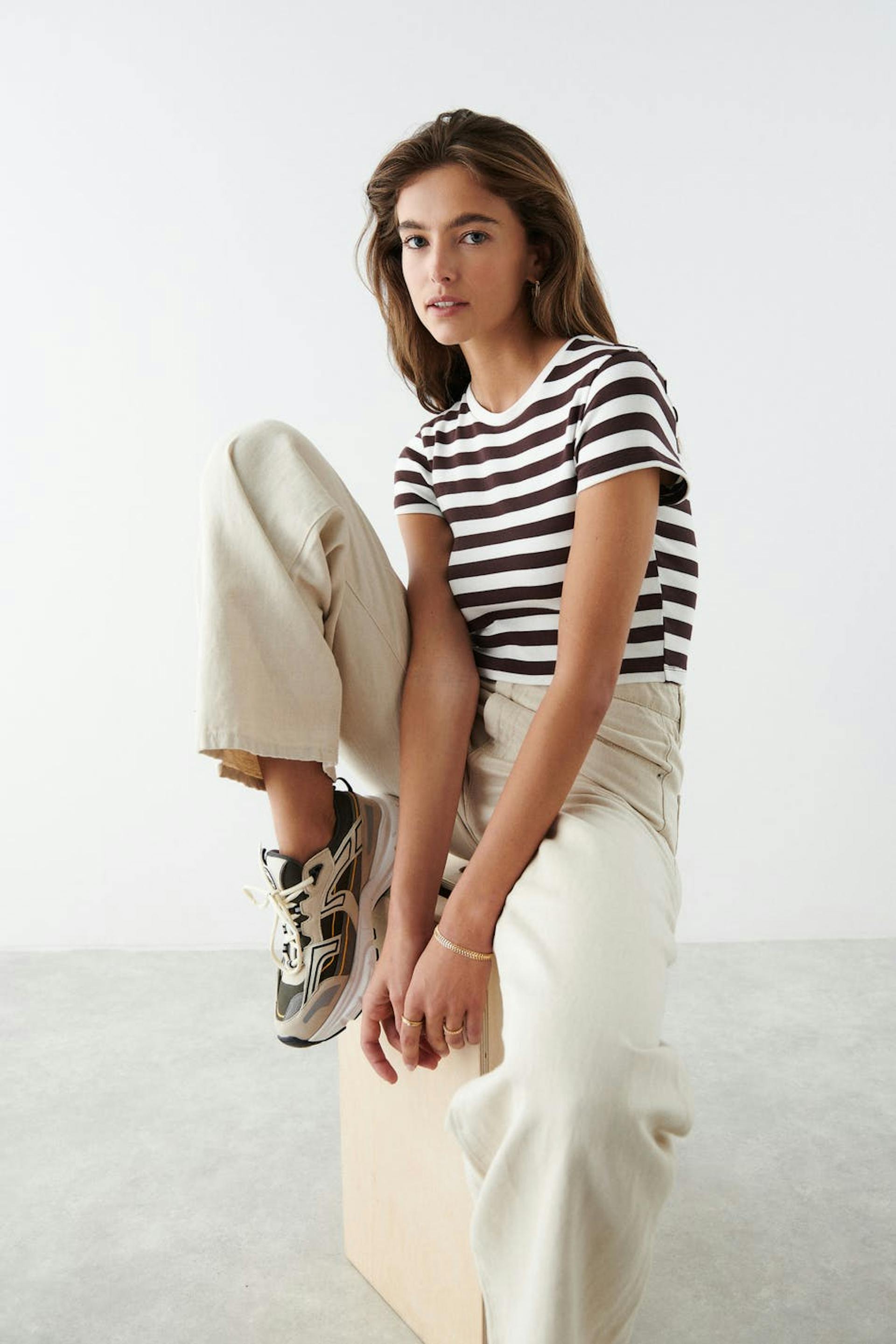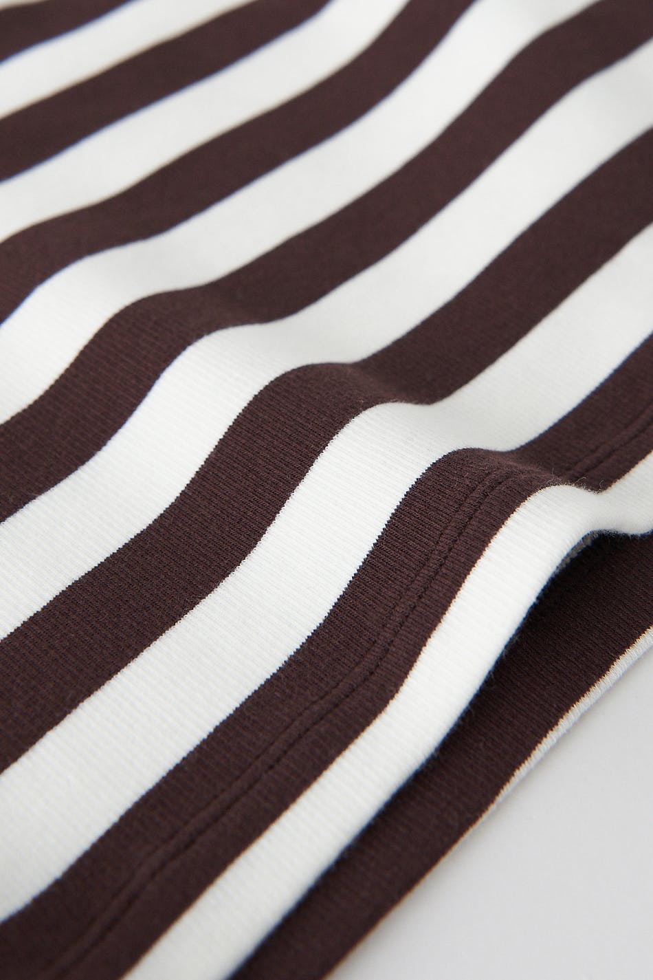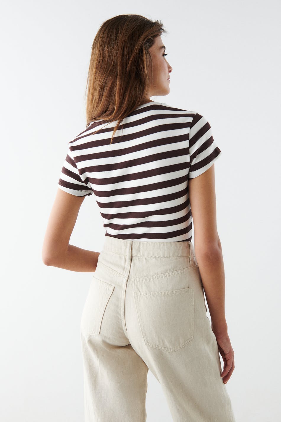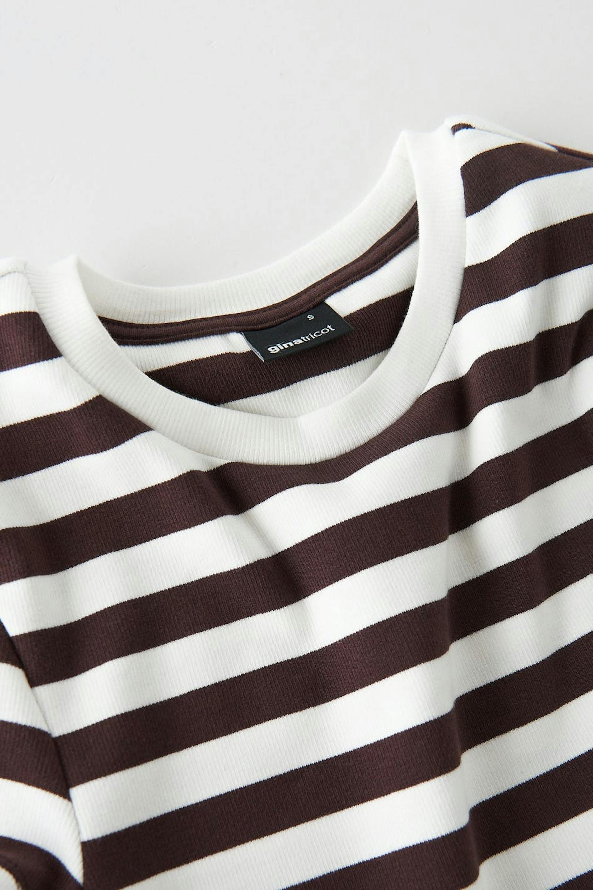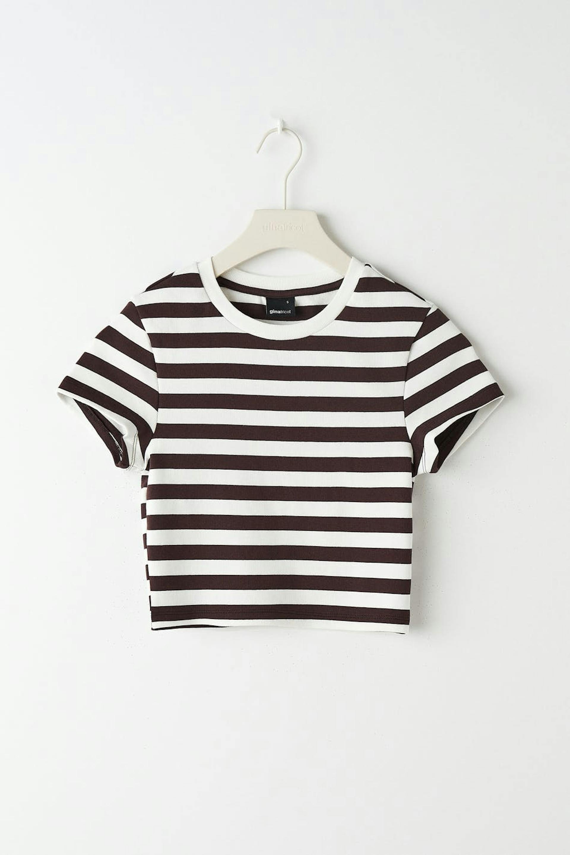 Striped top in jersey with a cropped length. The top is short-sleeved, ribbed and brown.
