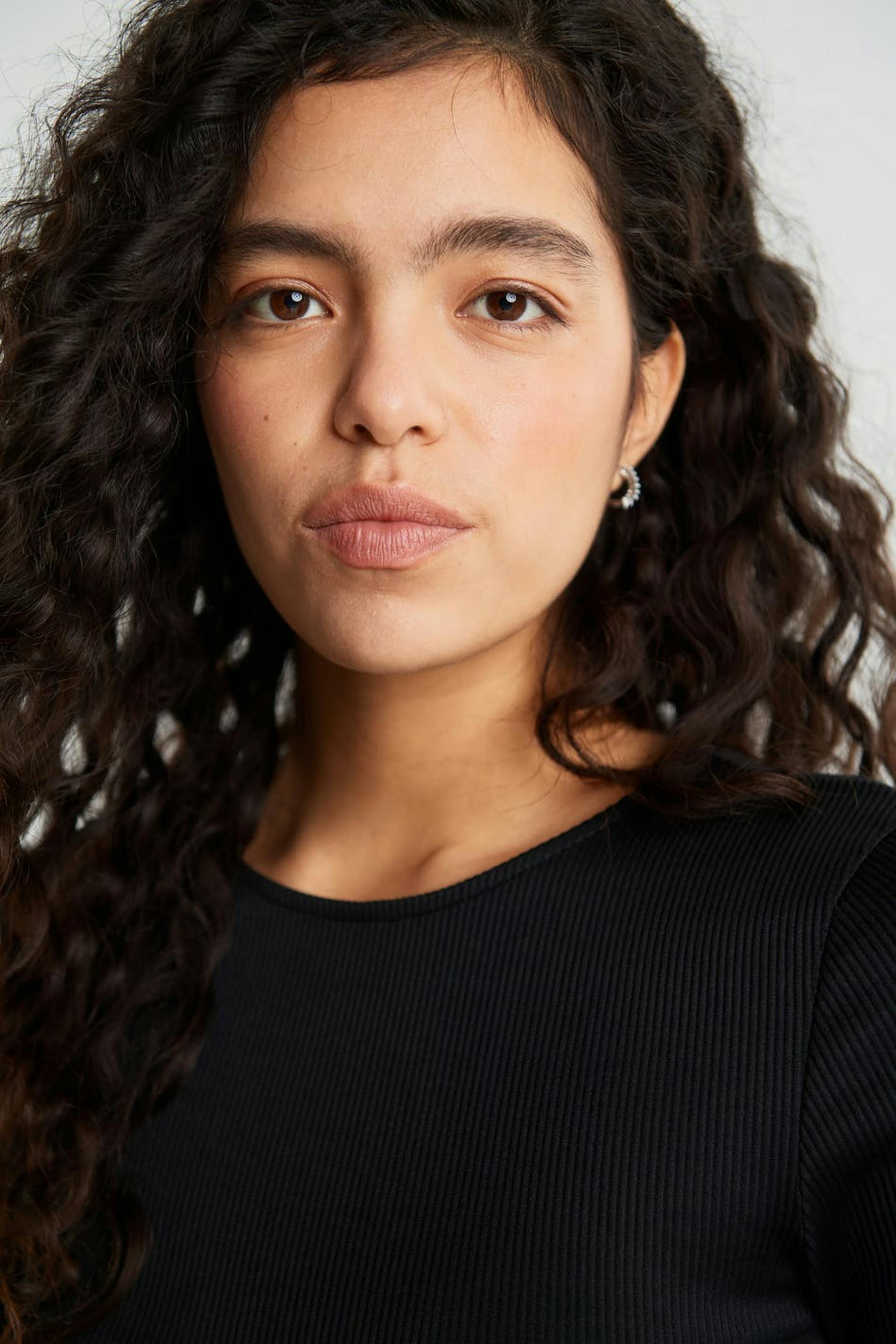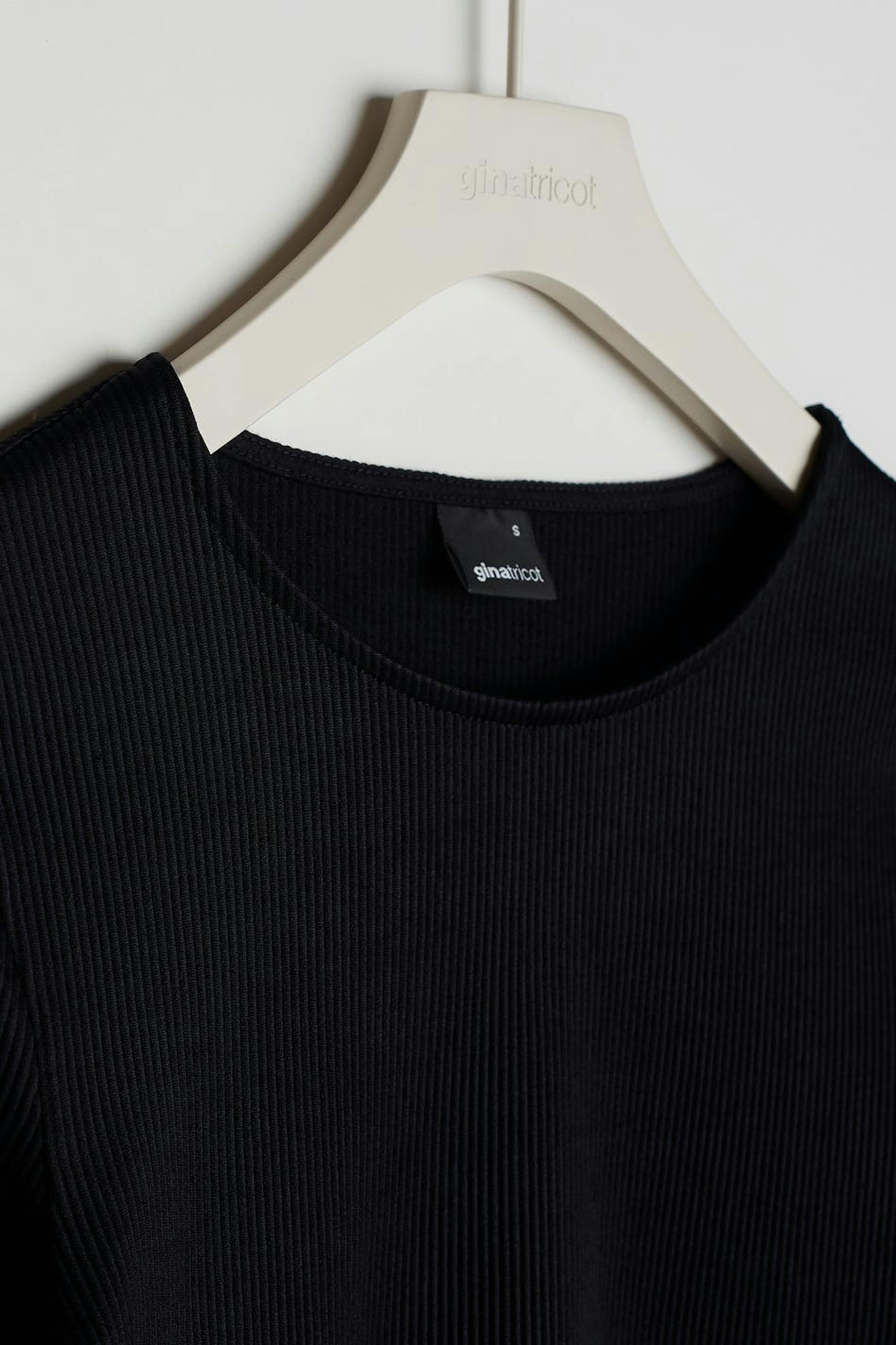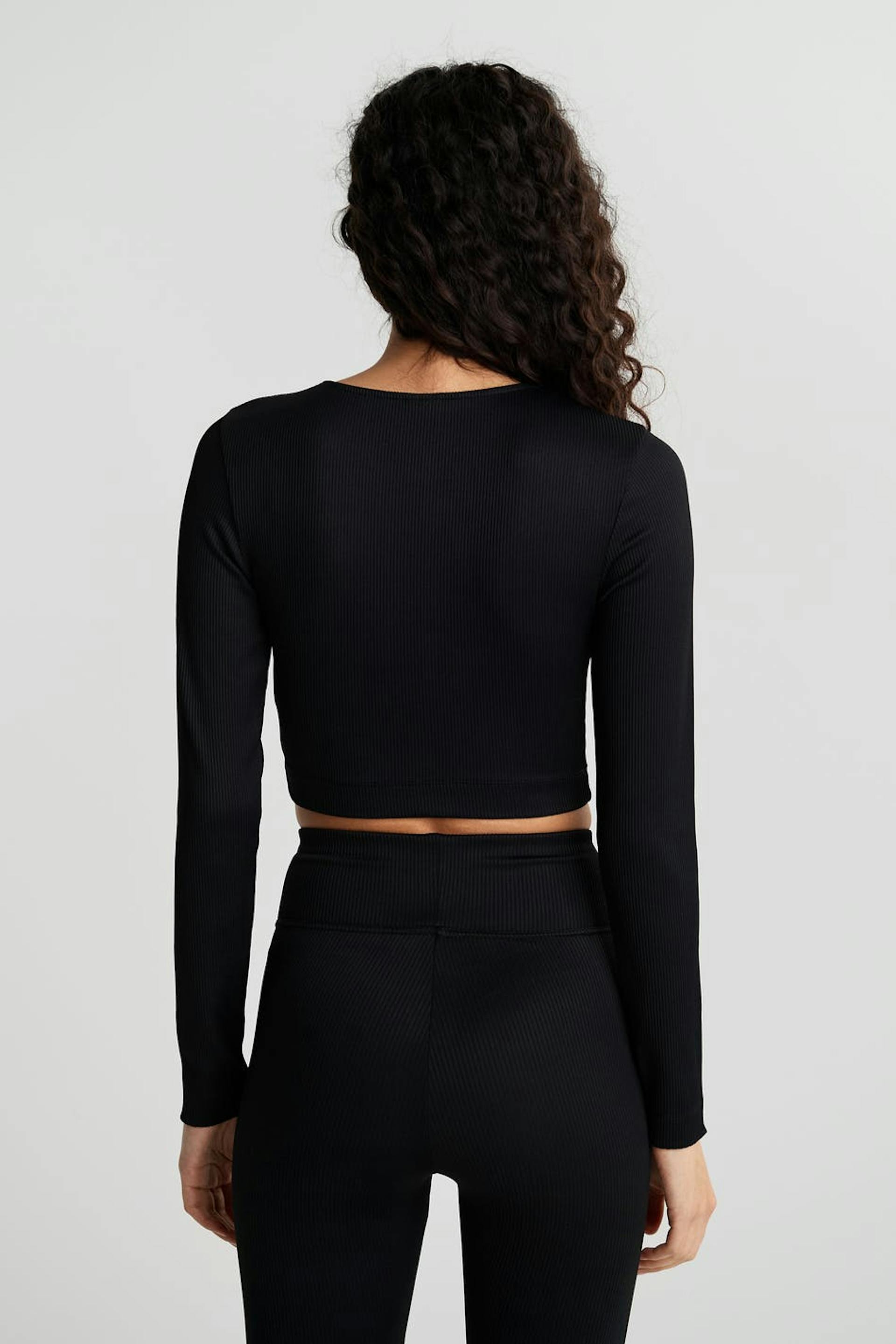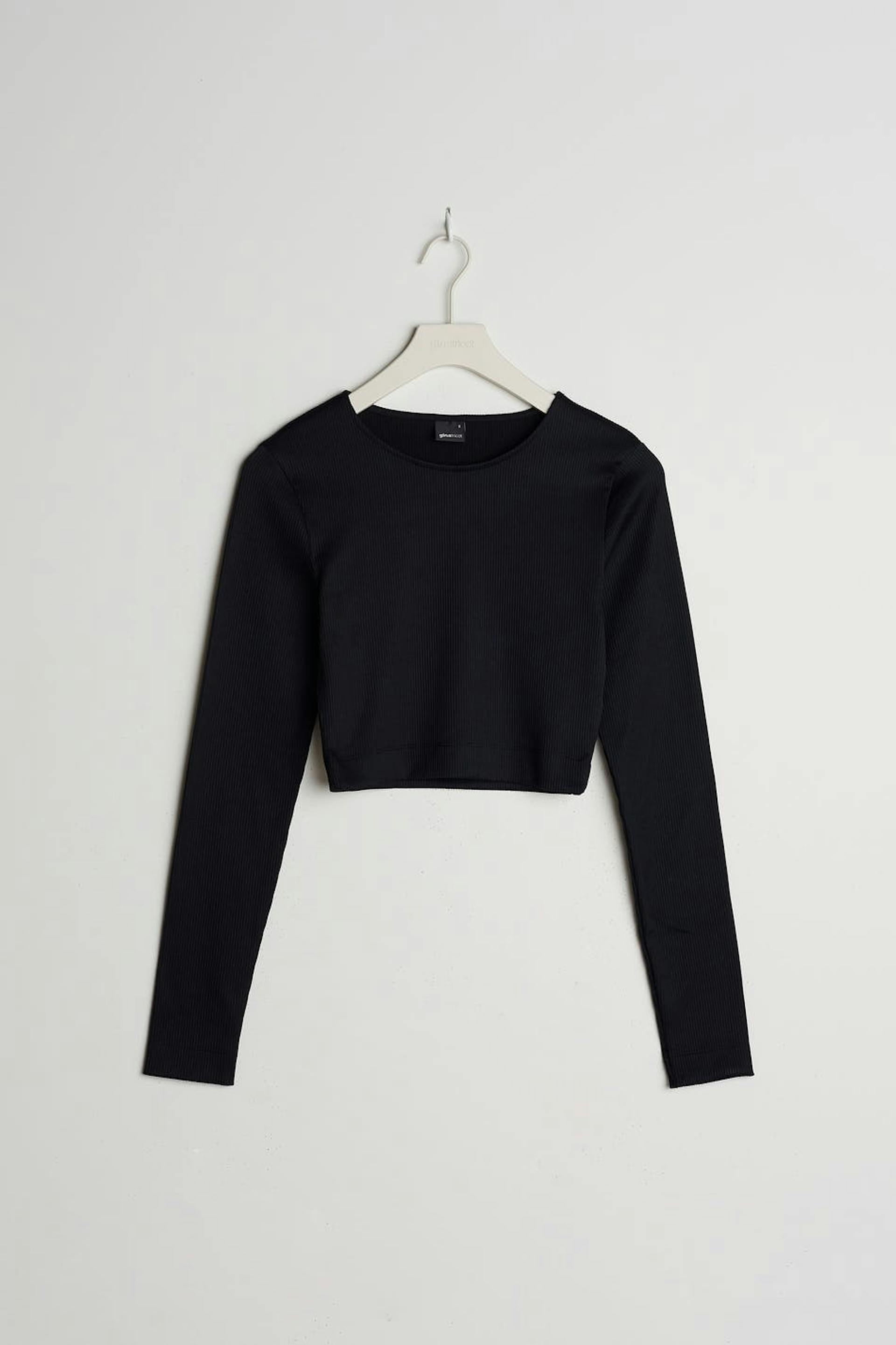 Cropped top with a fitted fit. The top is black and long-sleeved. It is made of jersey.