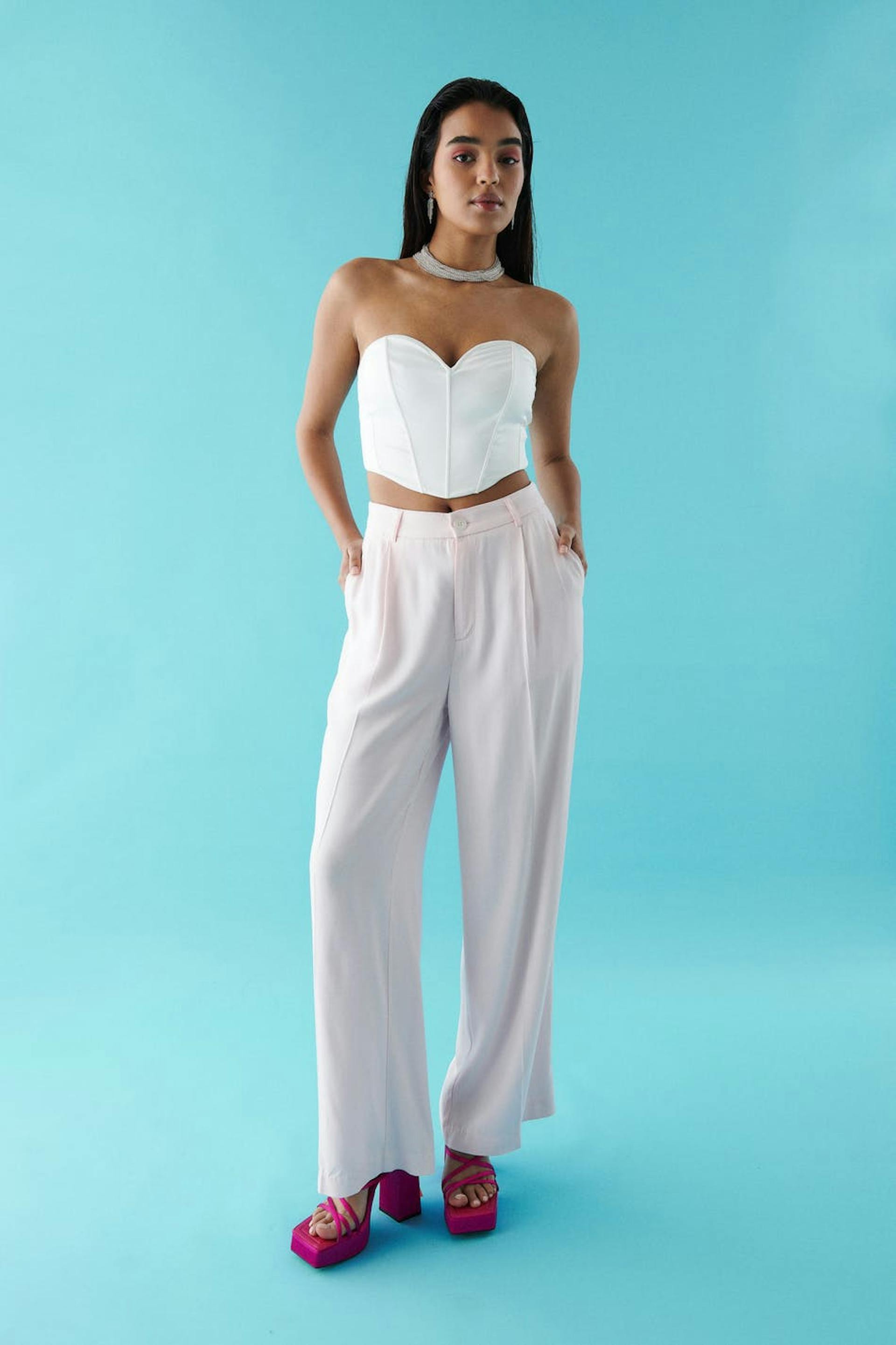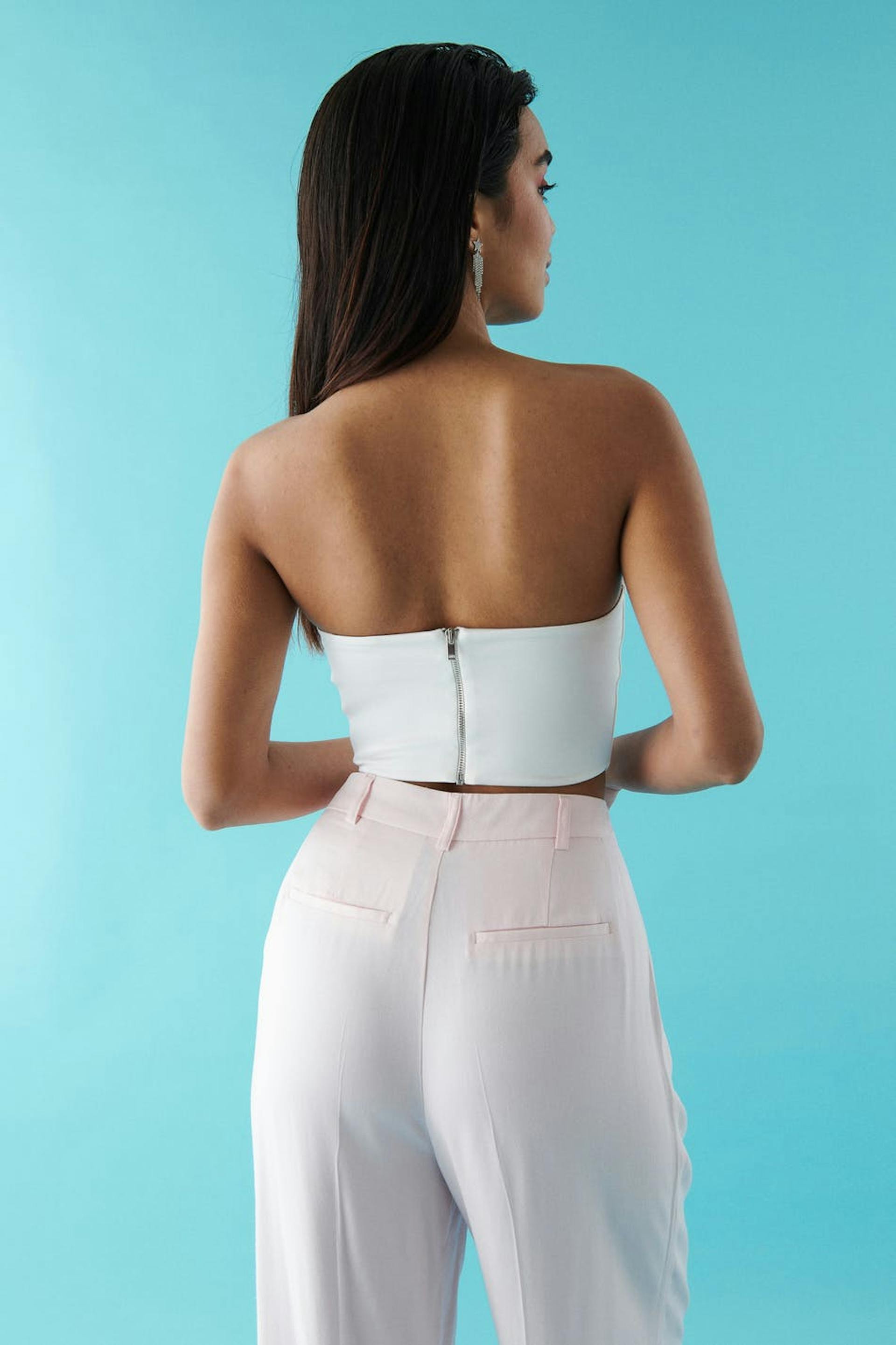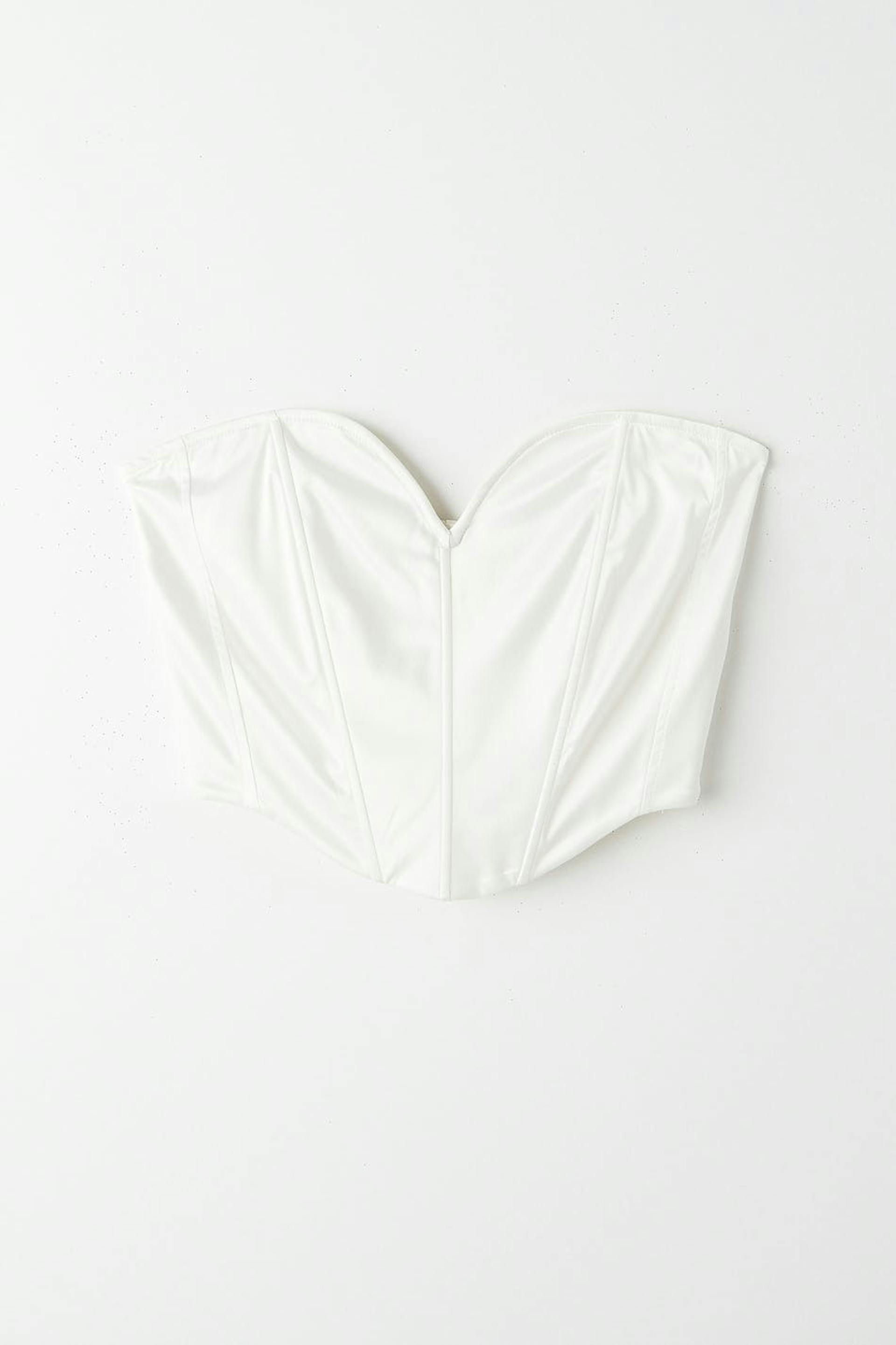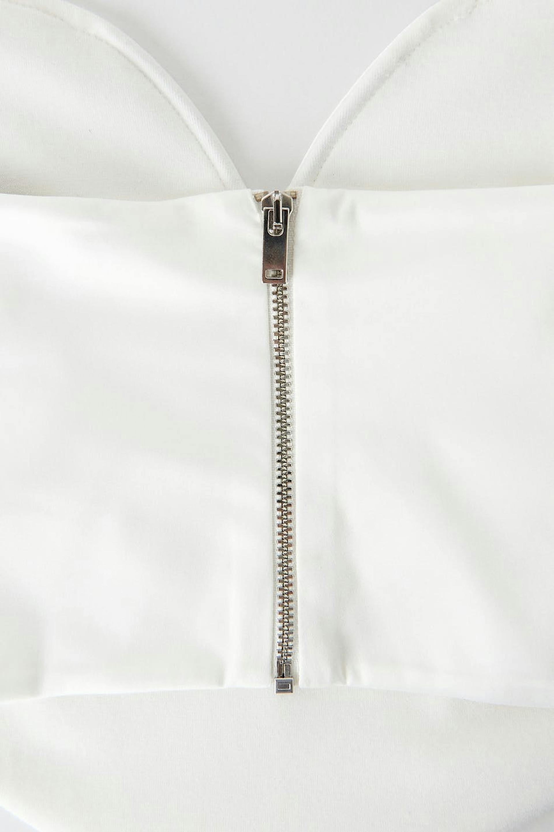 Corset with plunge neckline. The corset is white and has a stretchy material. It has a cropped length and zip closure in the back.