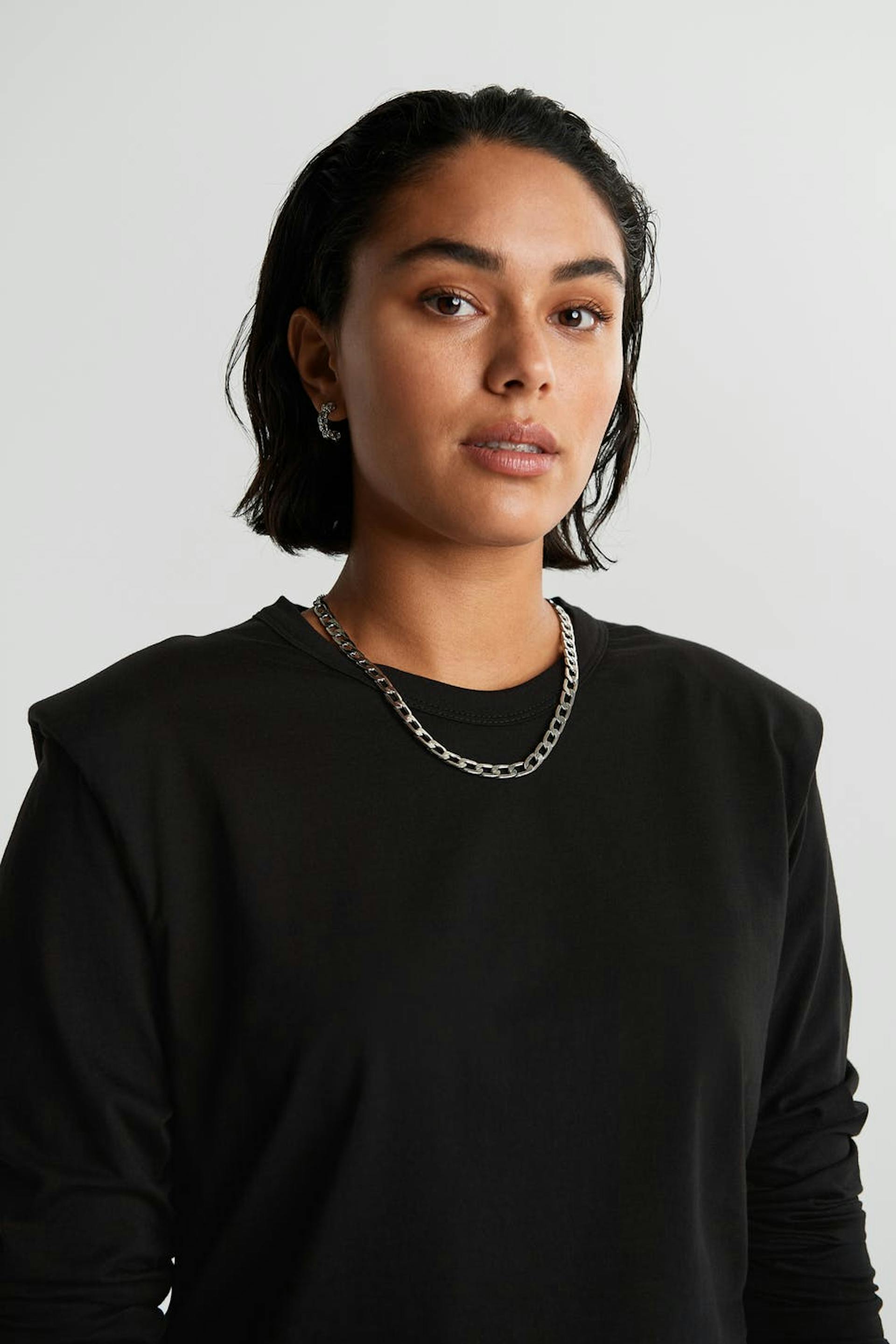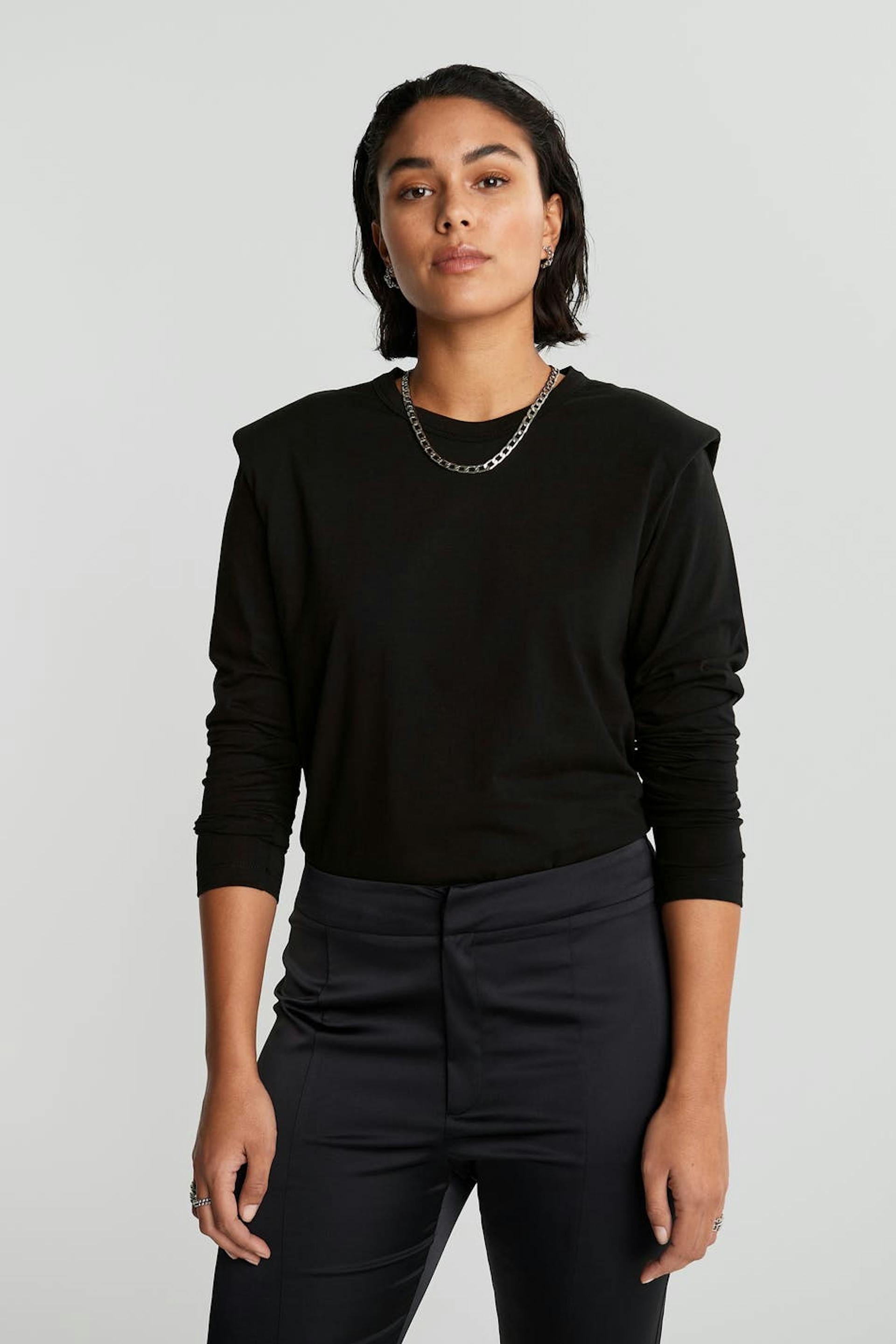 Long-sleeved top with an oversize fit. The top is black and has shoulder pads. It is made of jersey.