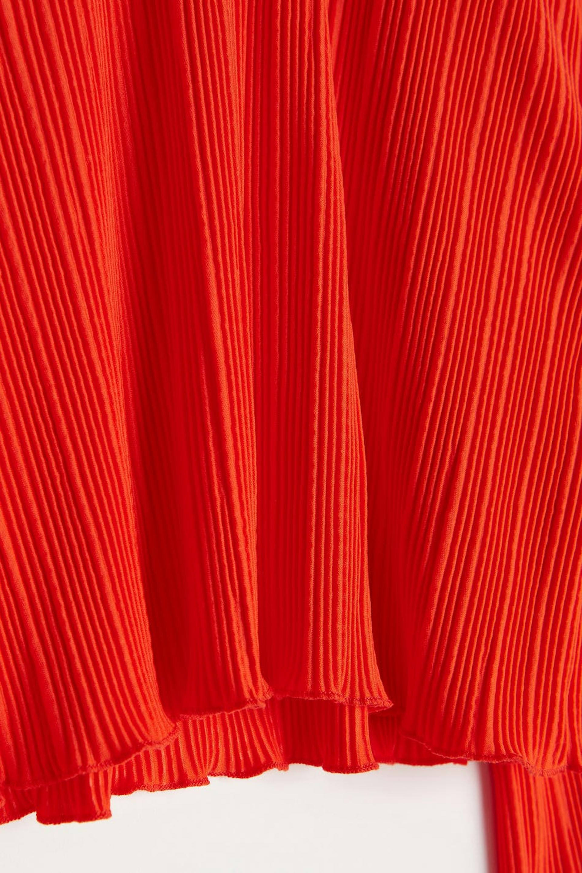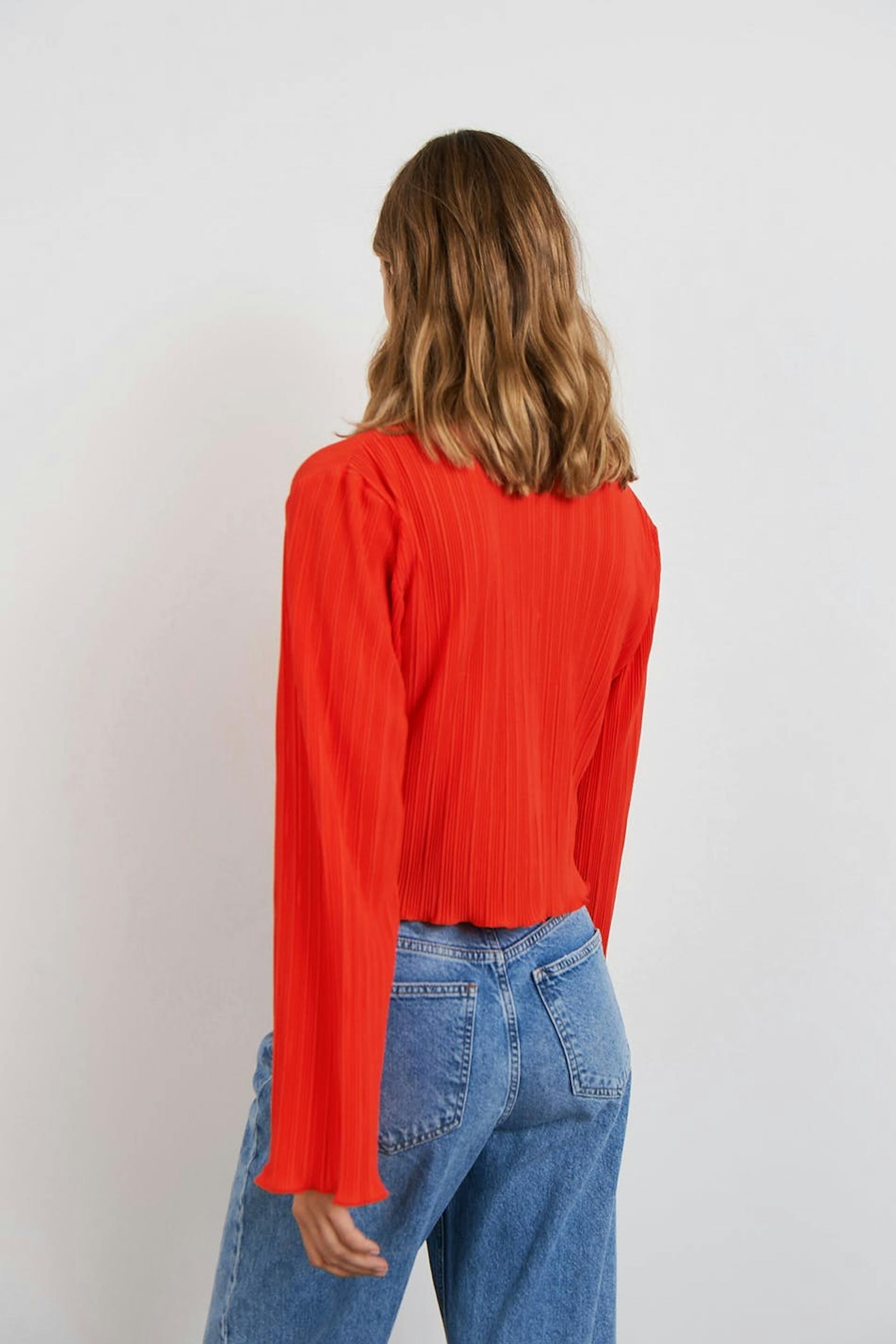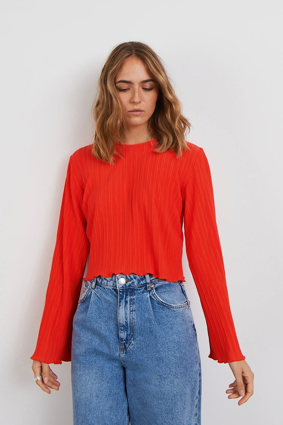 Pleated top with frills on the sleeve ends and at the bottom hem. The top is red and has wide, long sleeves. It has a rounded neckline, a cropped length and a loose-fitting style.