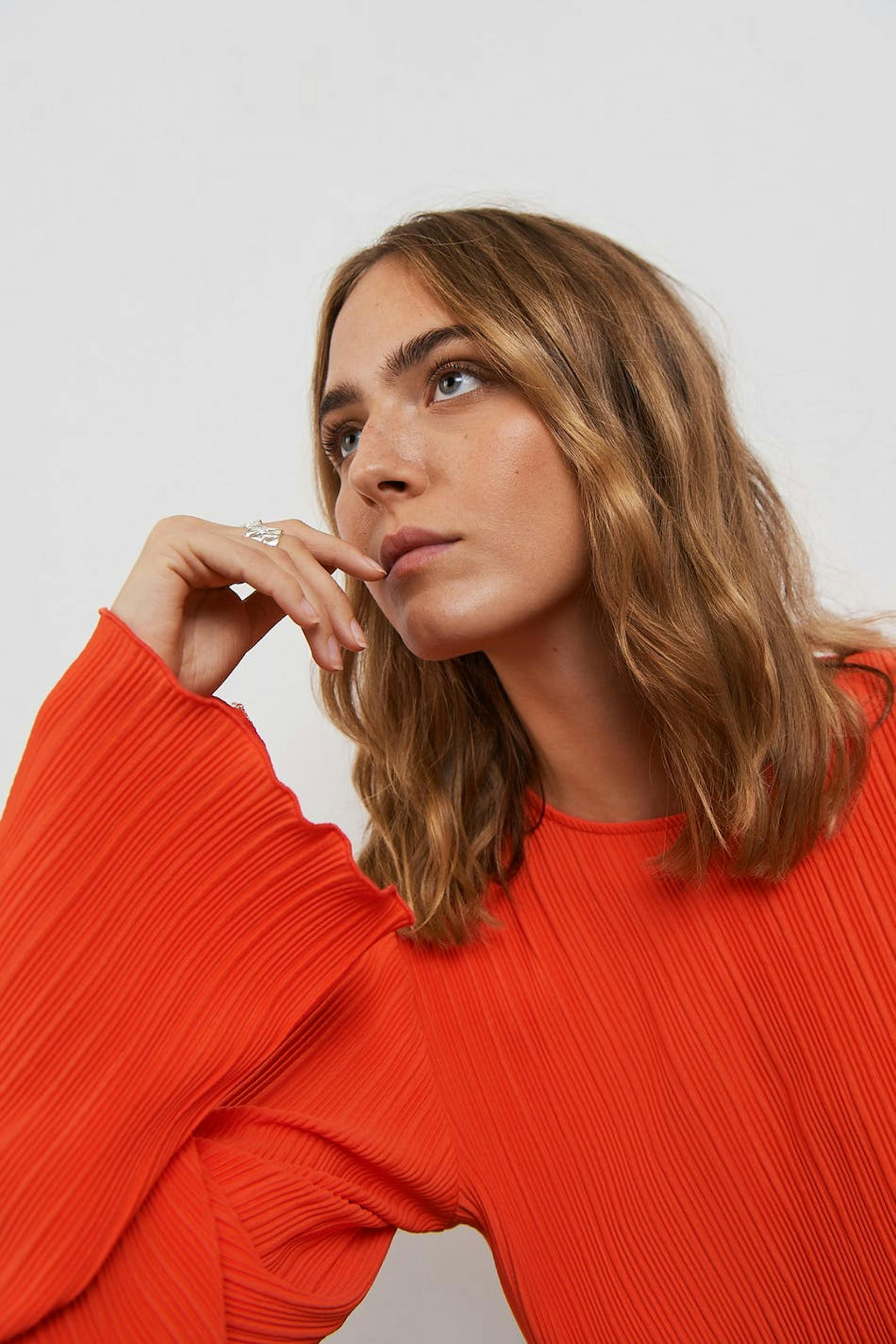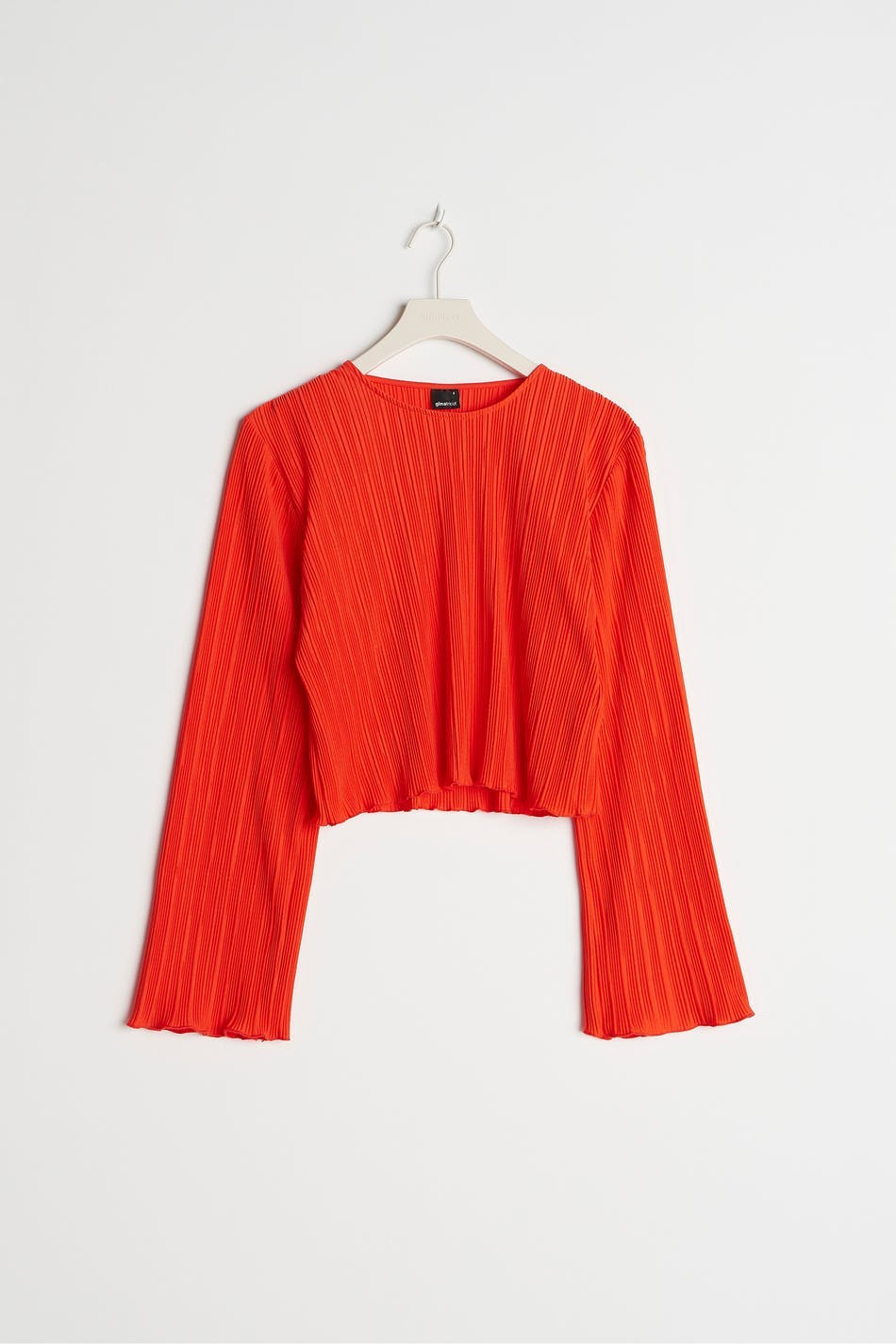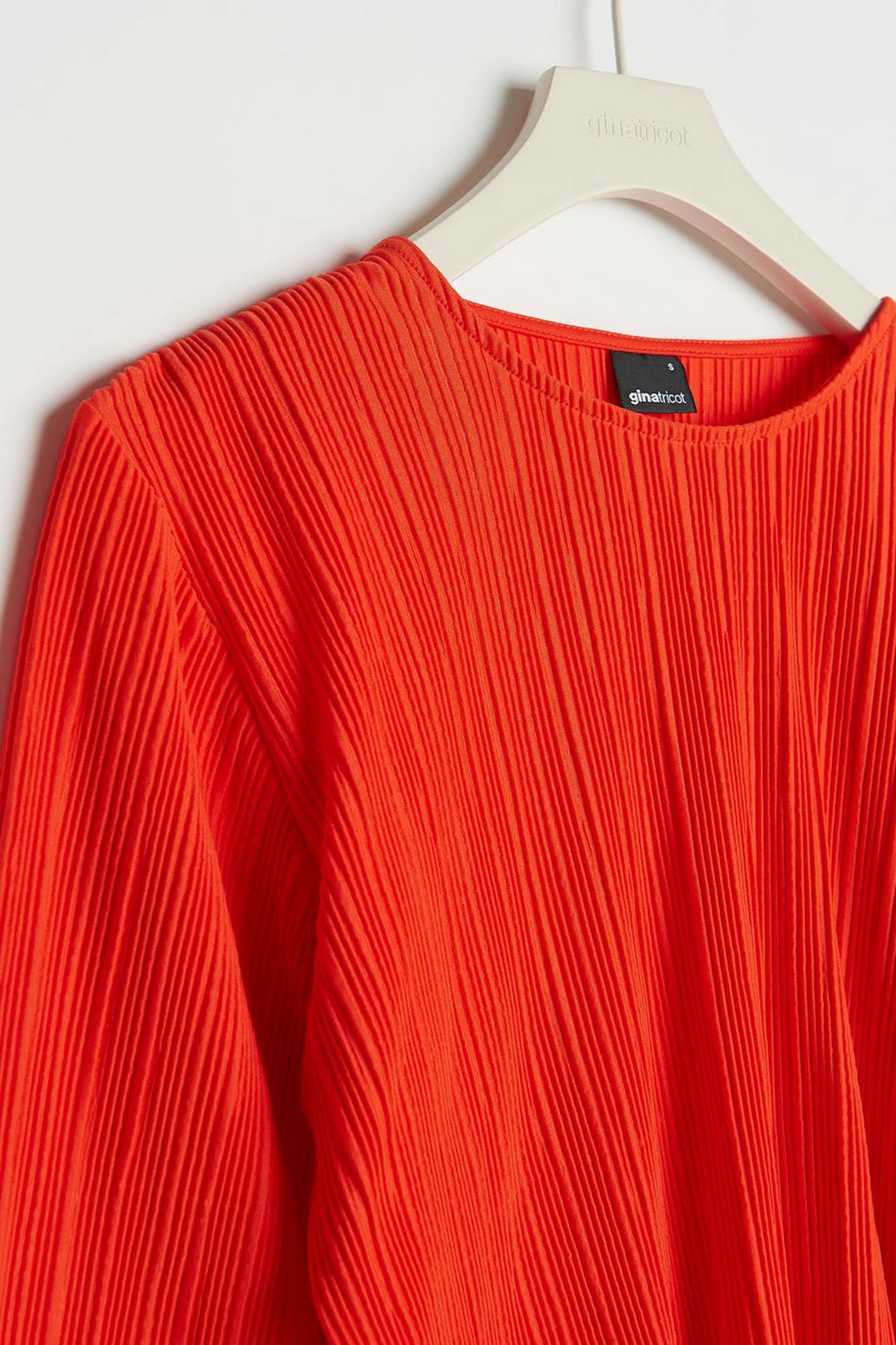 Pleated top with frills on the sleeve ends and at the bottom hem. The top is red and has wide, long sleeves. It has a rounded neckline, a cropped length and a loose-fitting style.