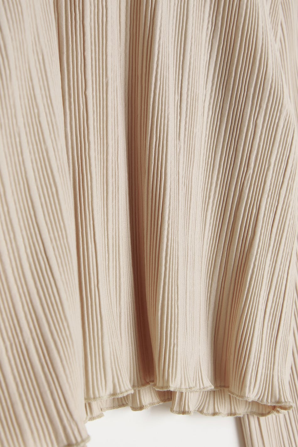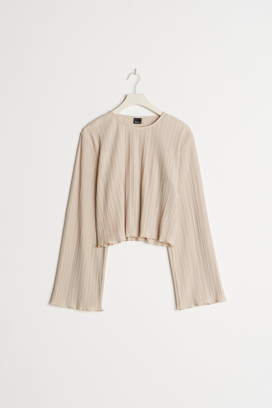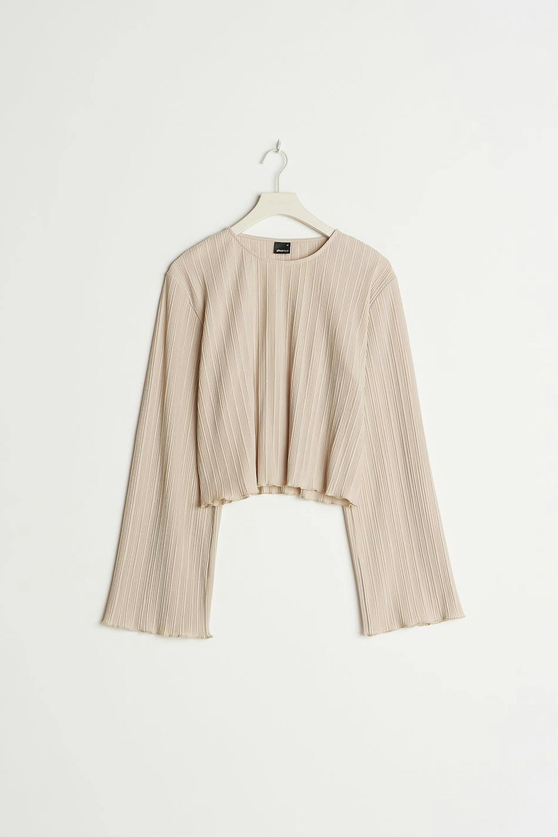 Pleated top with frills on the sleeve ends and at the bottom hem. The top is beige and has wide, long sleeves. It has a rounded neckline, a cropped length and a loose-fitting style.