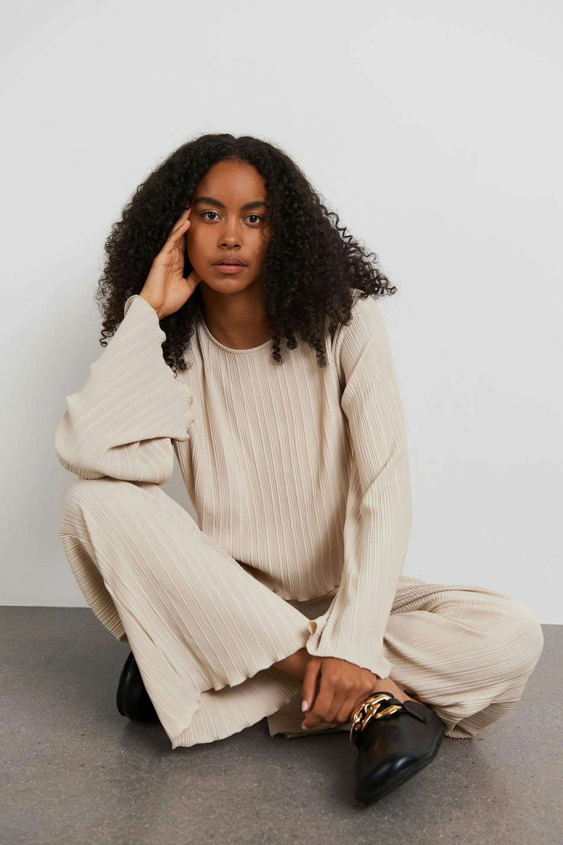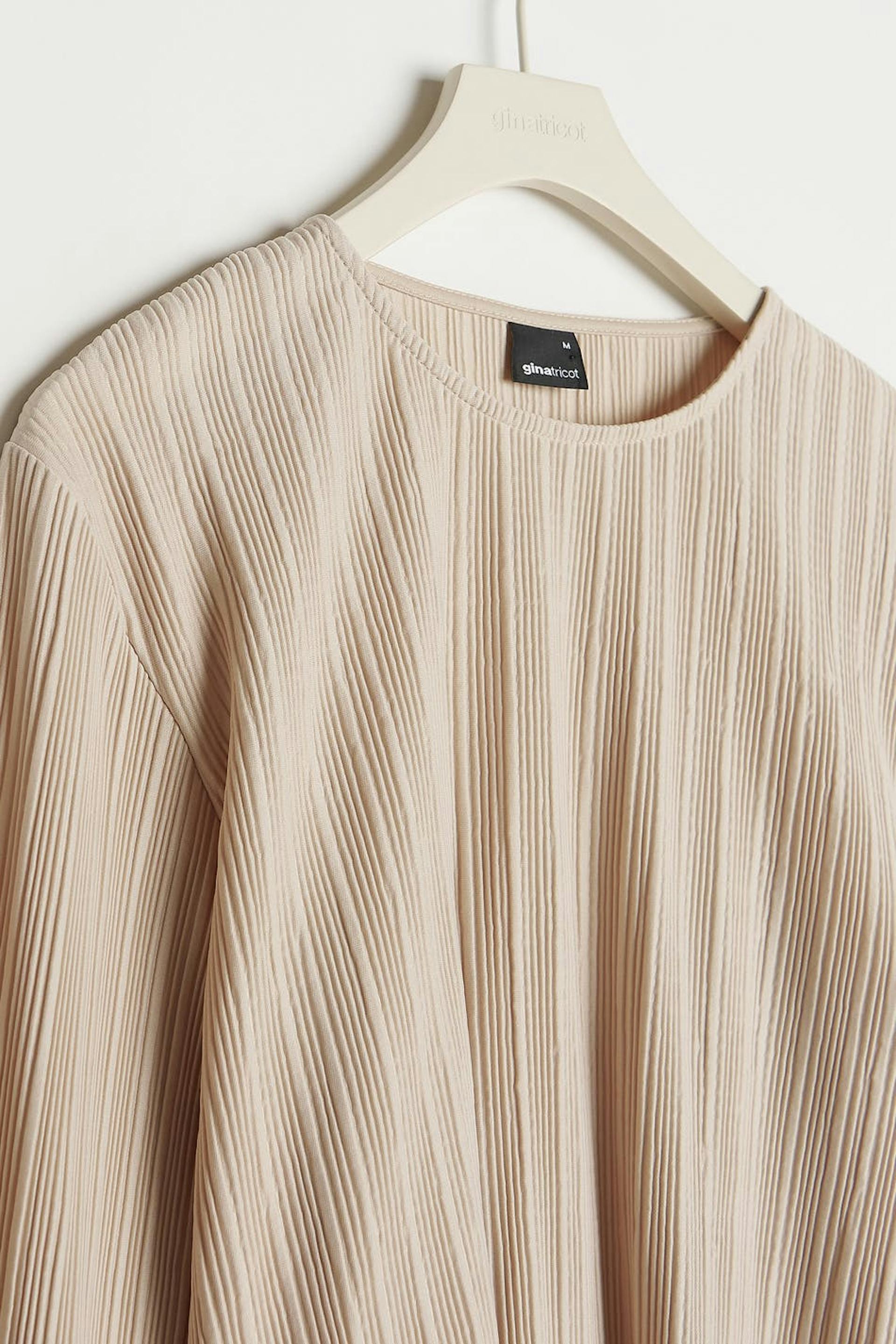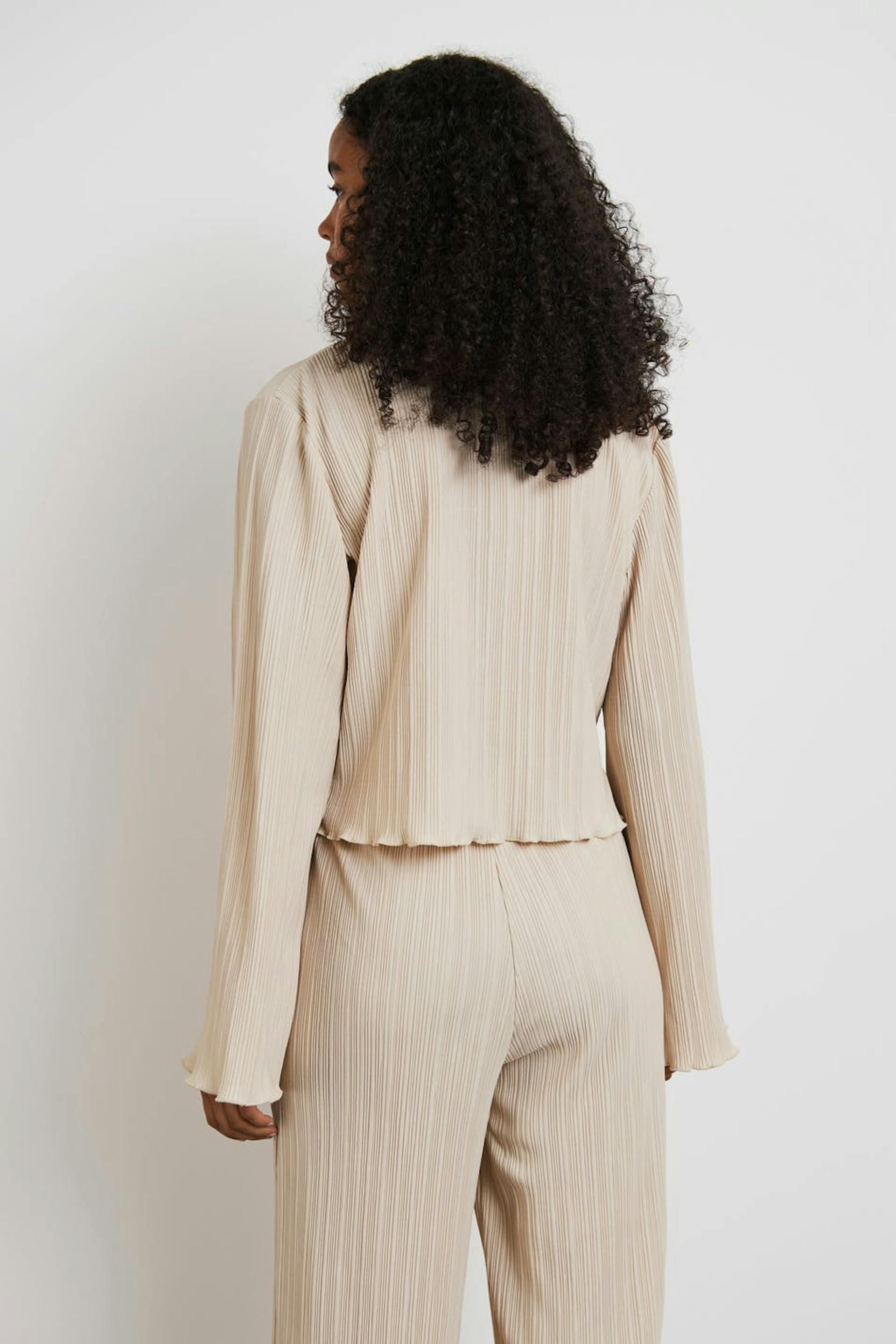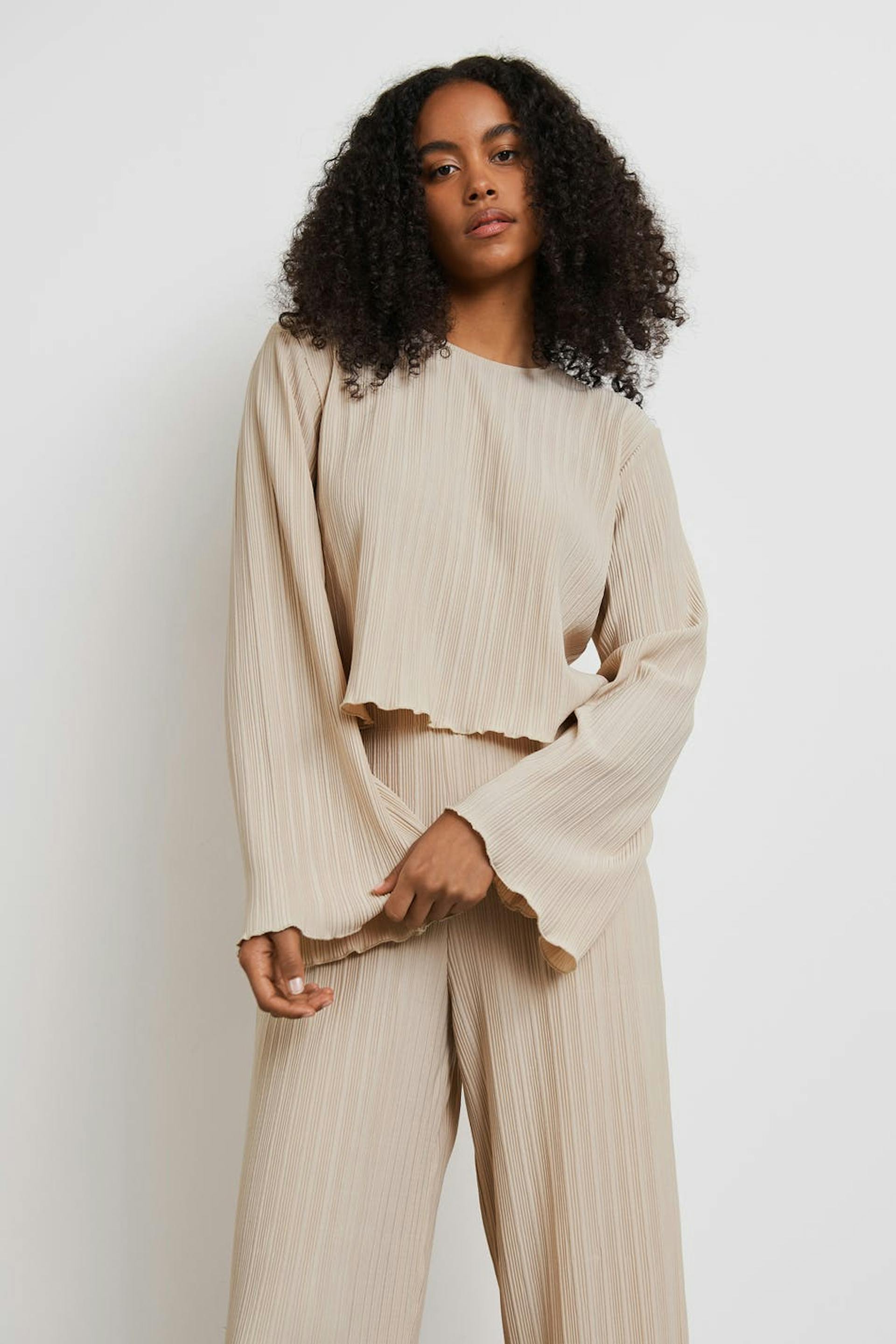 Pleated top with frills on the sleeve ends and at the bottom hem. The top is beige and has wide, long sleeves. It has a rounded neckline, a cropped length and a loose-fitting style.