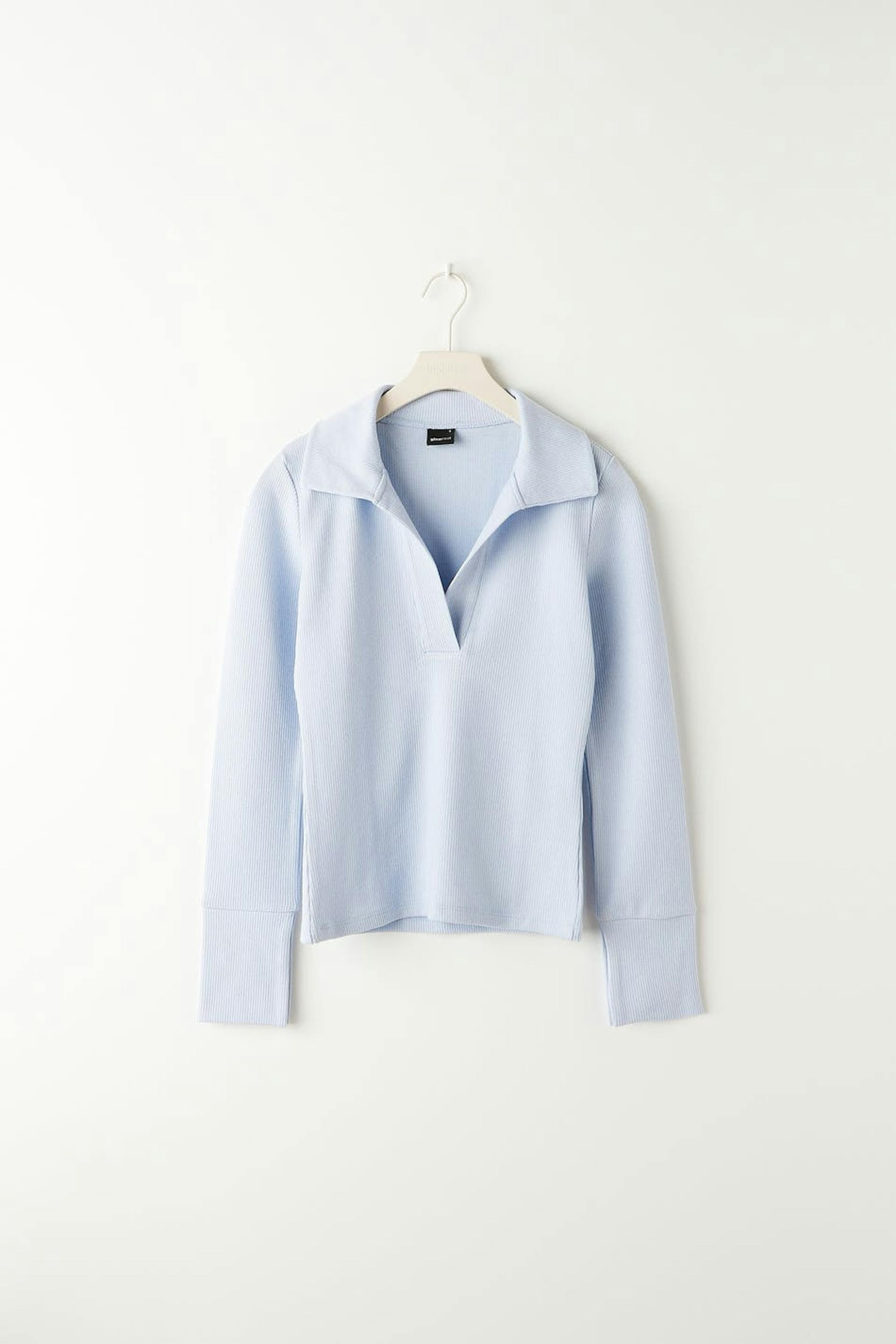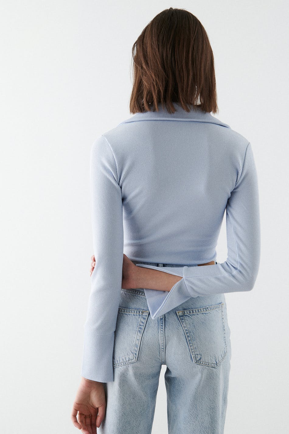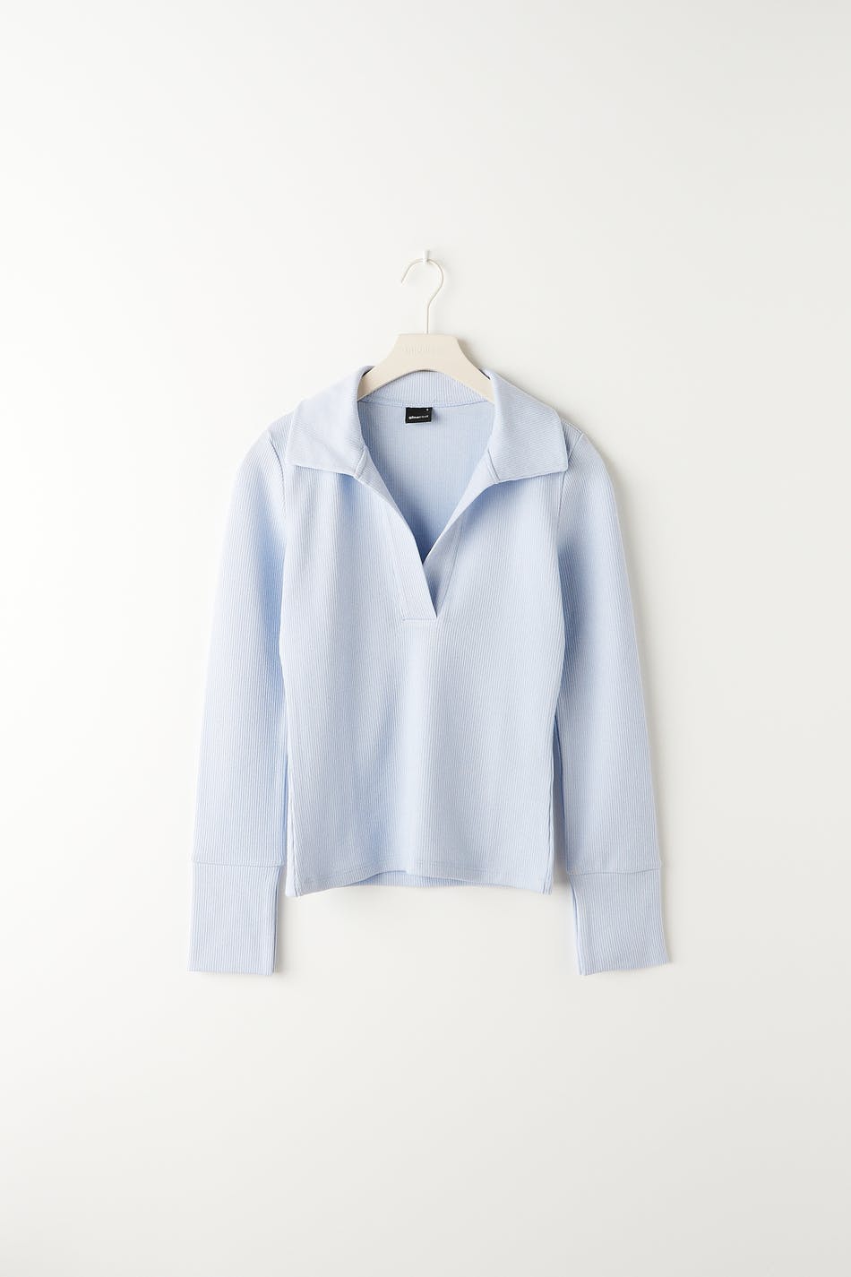 Long-sleeved top with V-neck. The top is blue and has a ribbed quality. It has a fitted fit, collar and slit on the sleeve ends.