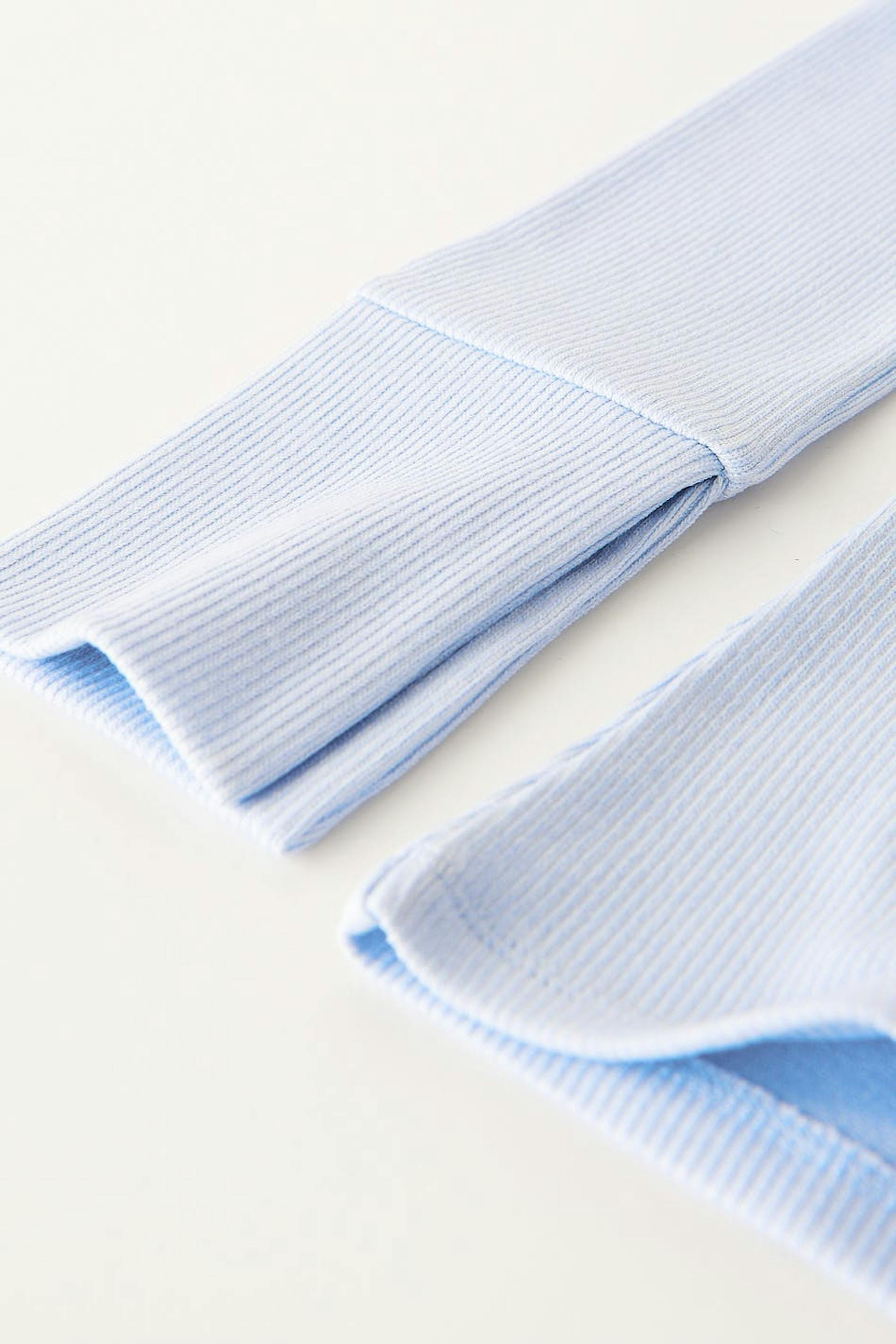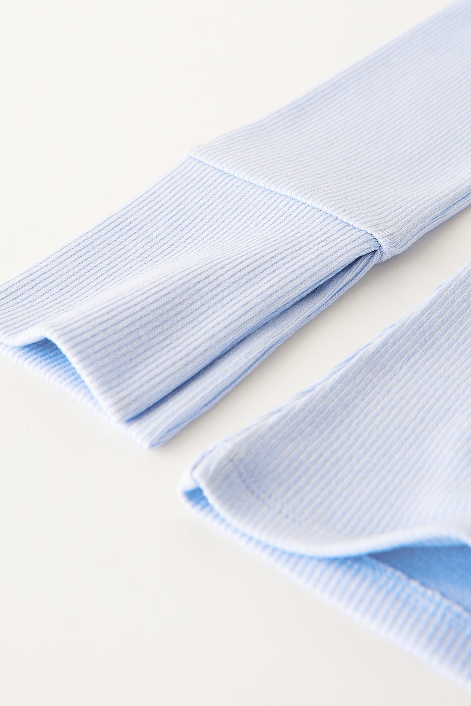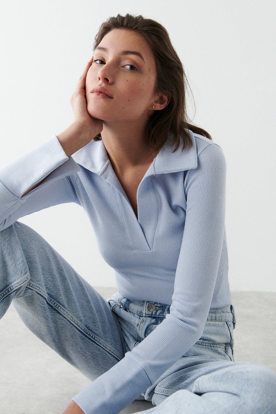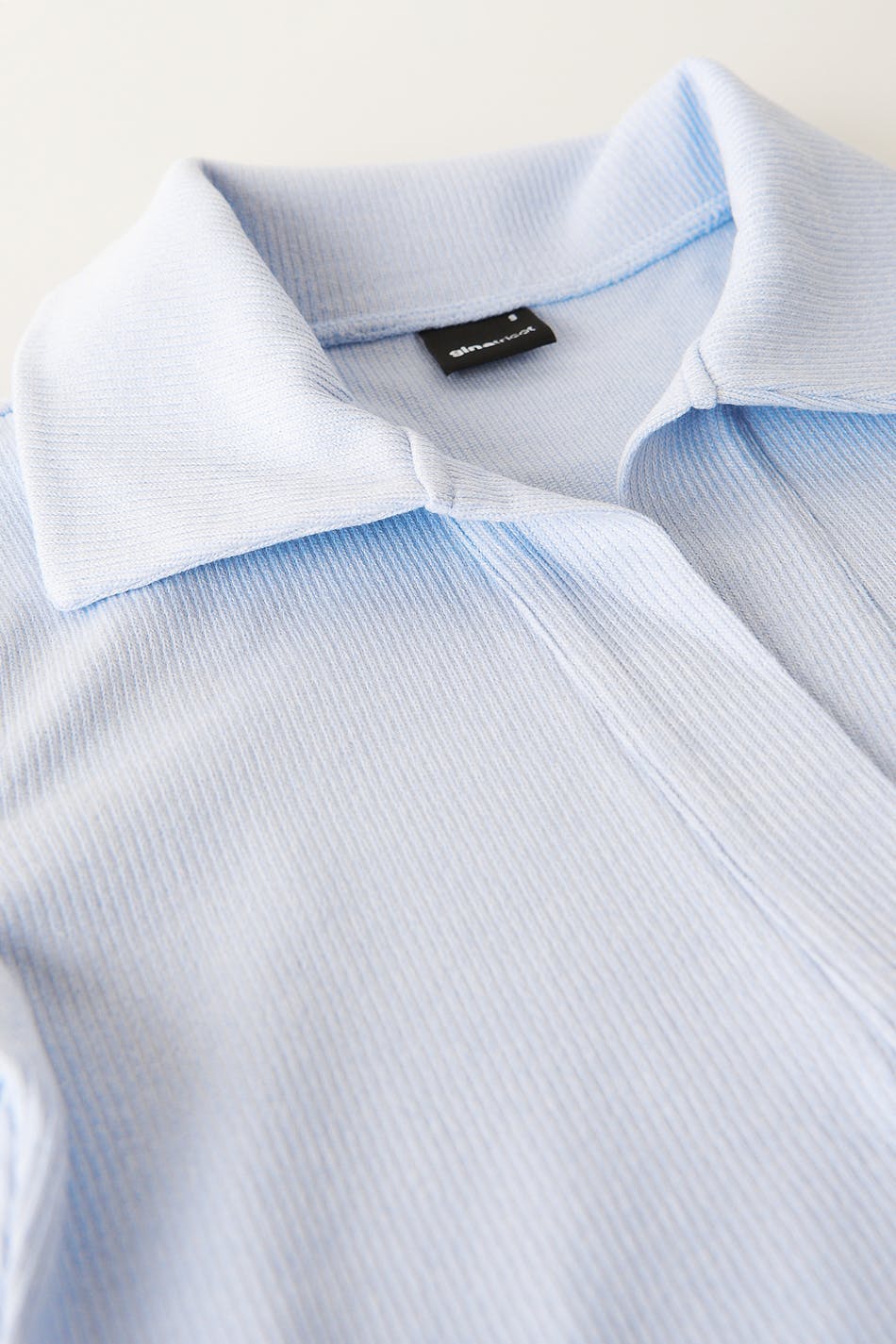 Long-sleeved top with V-neck. The top is blue and has a ribbed quality. It has a fitted fit, collar and slit on the sleeve ends.