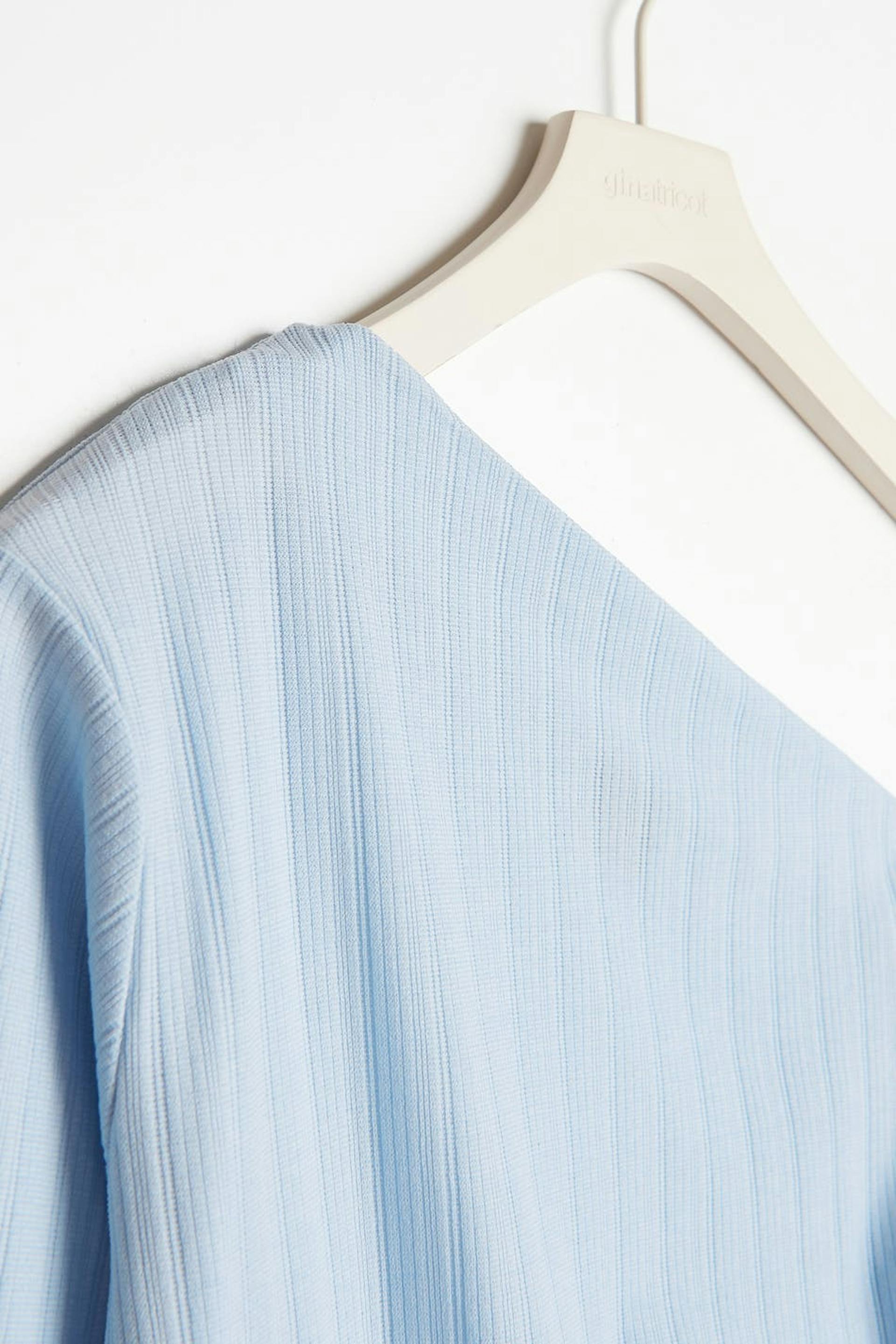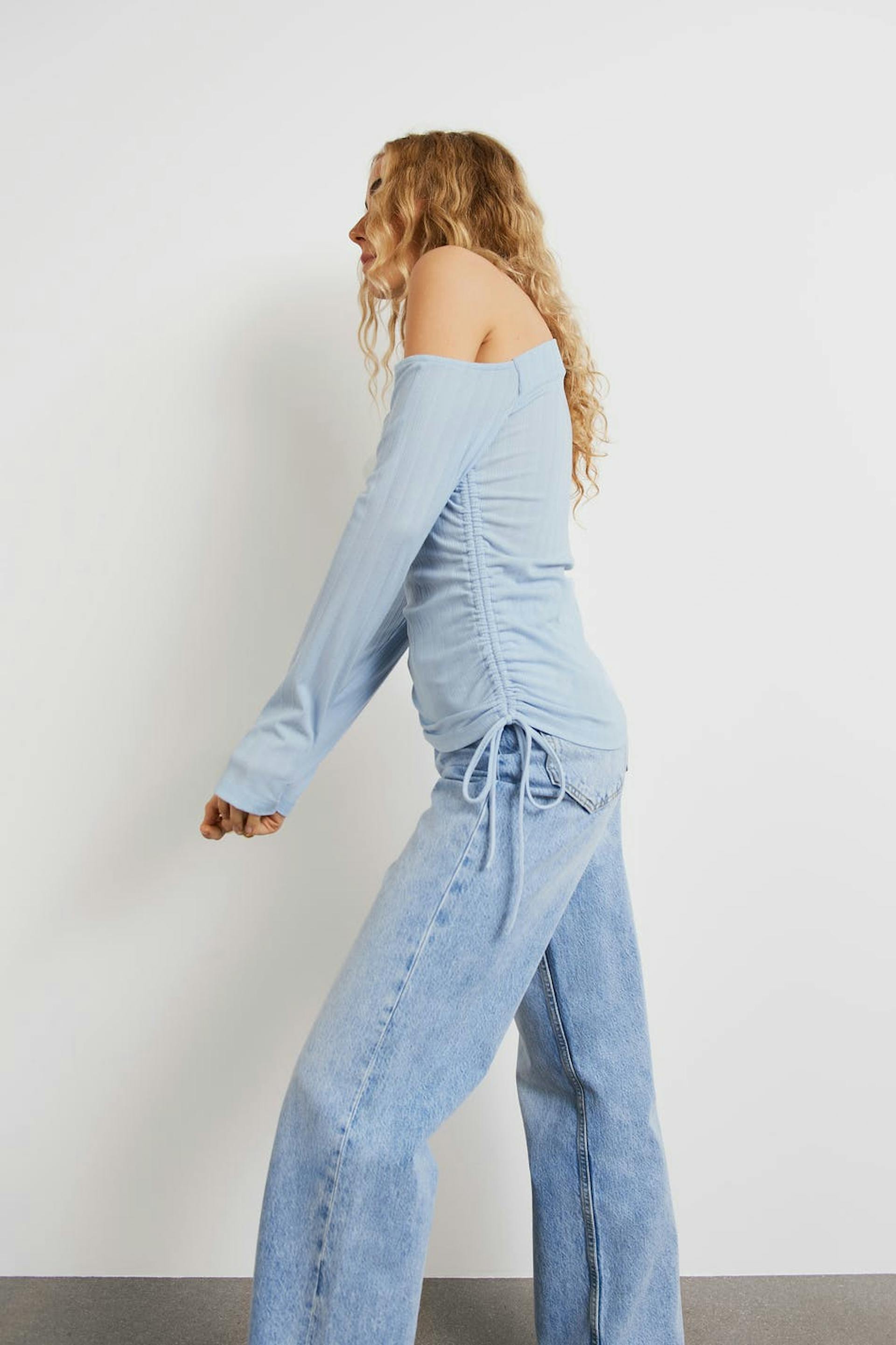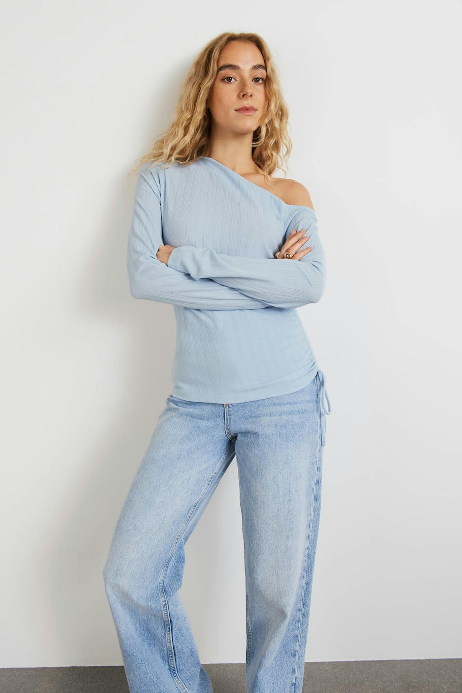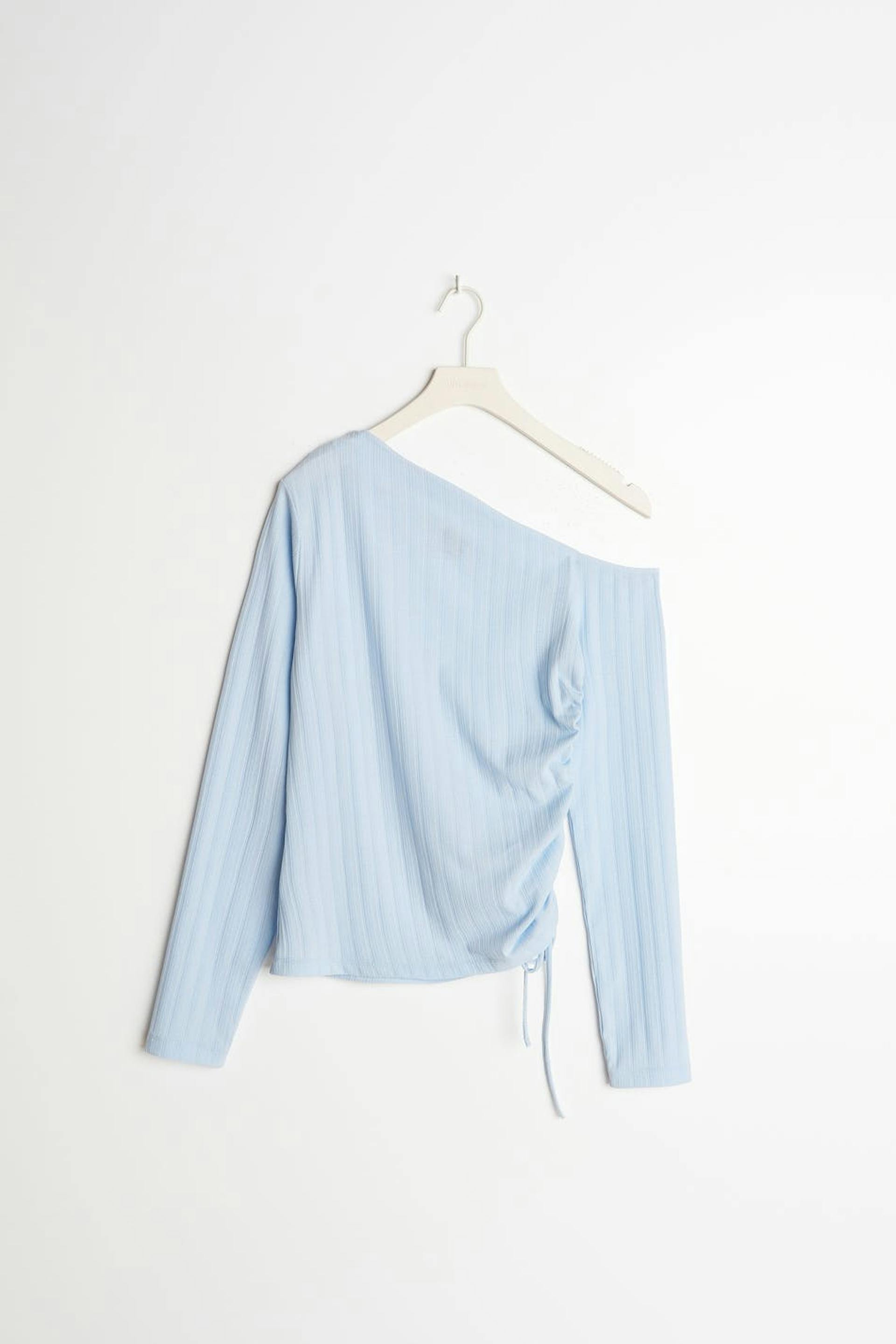 Long-sleeved one shoulder top with a regular fit. The top is blue and has an asymmetrical neckline. It has gathered details and an adjustable drawstring on one side with a self-tie at the bottom.