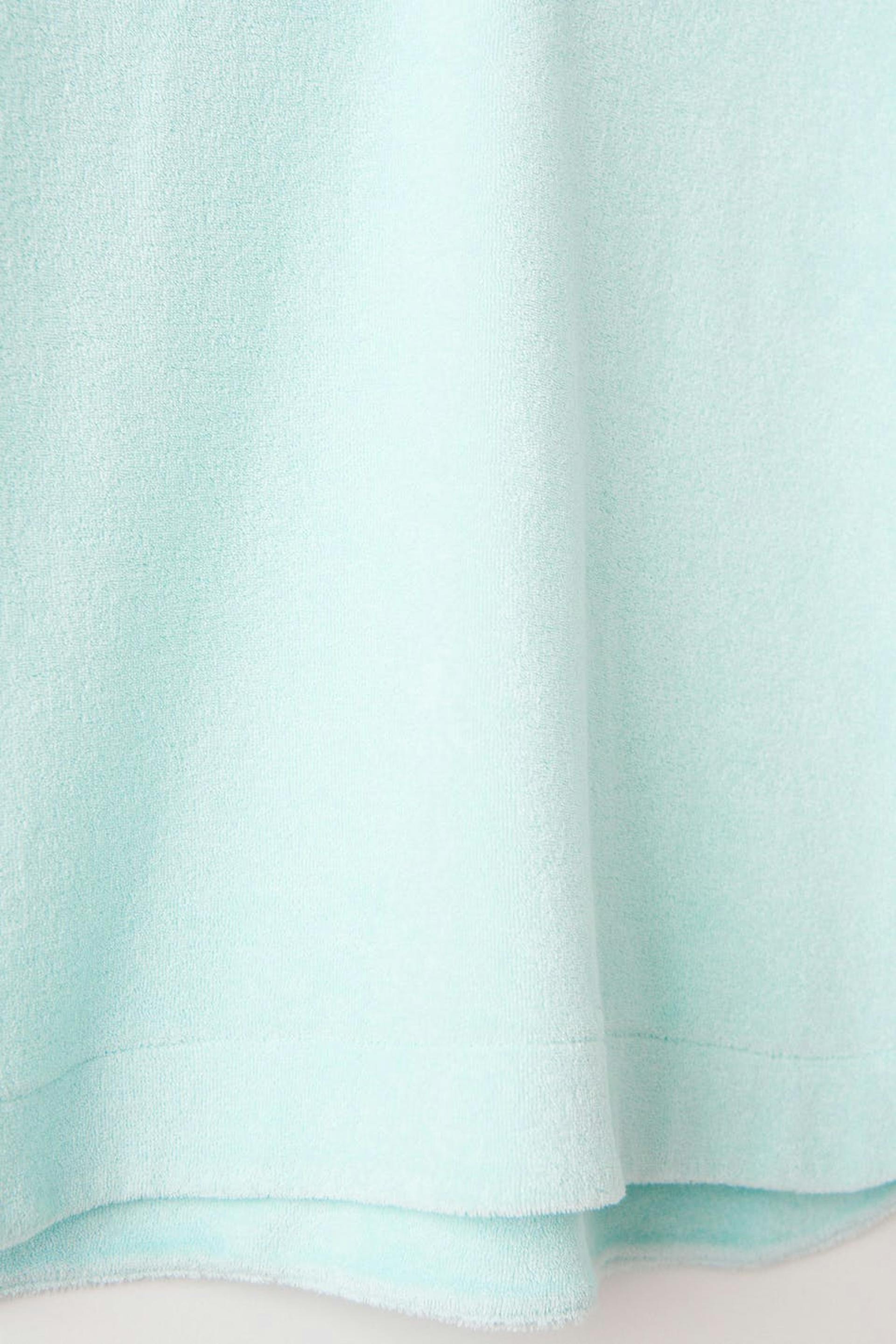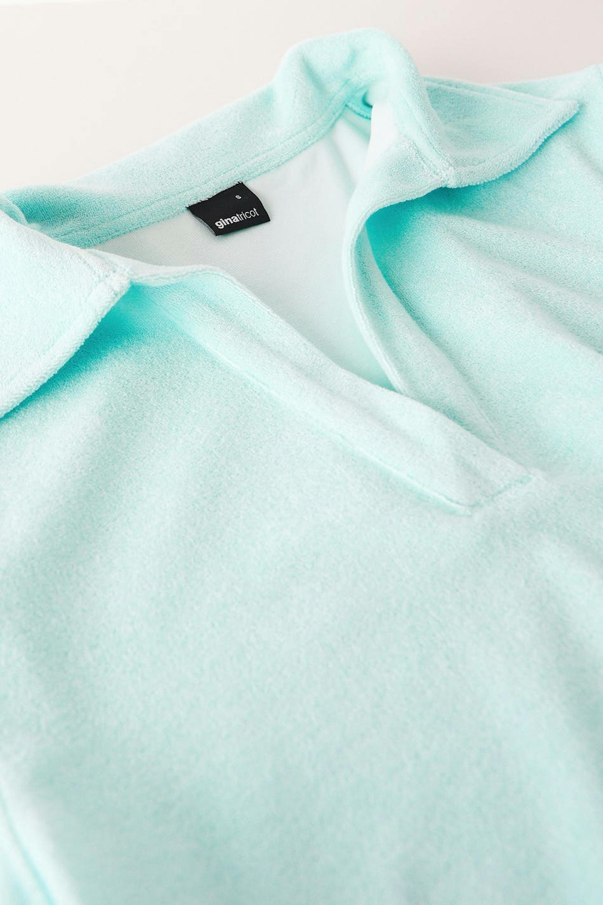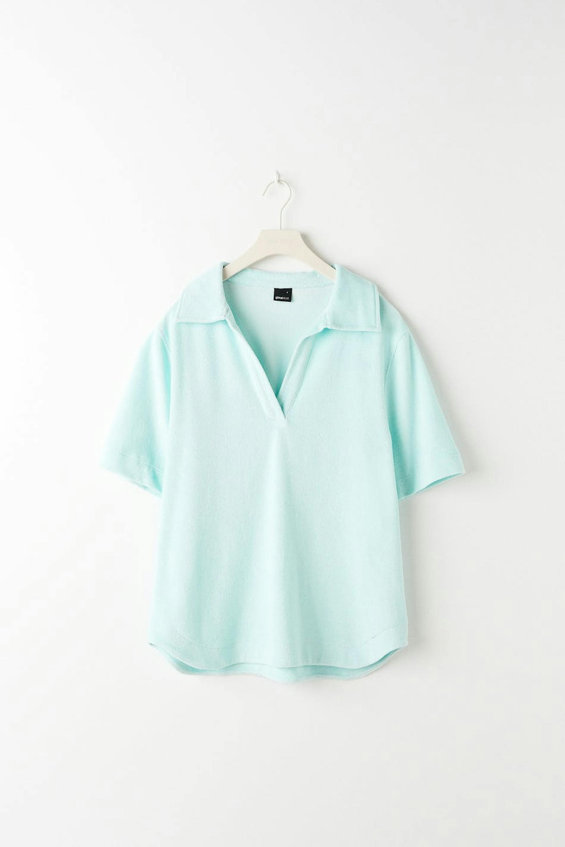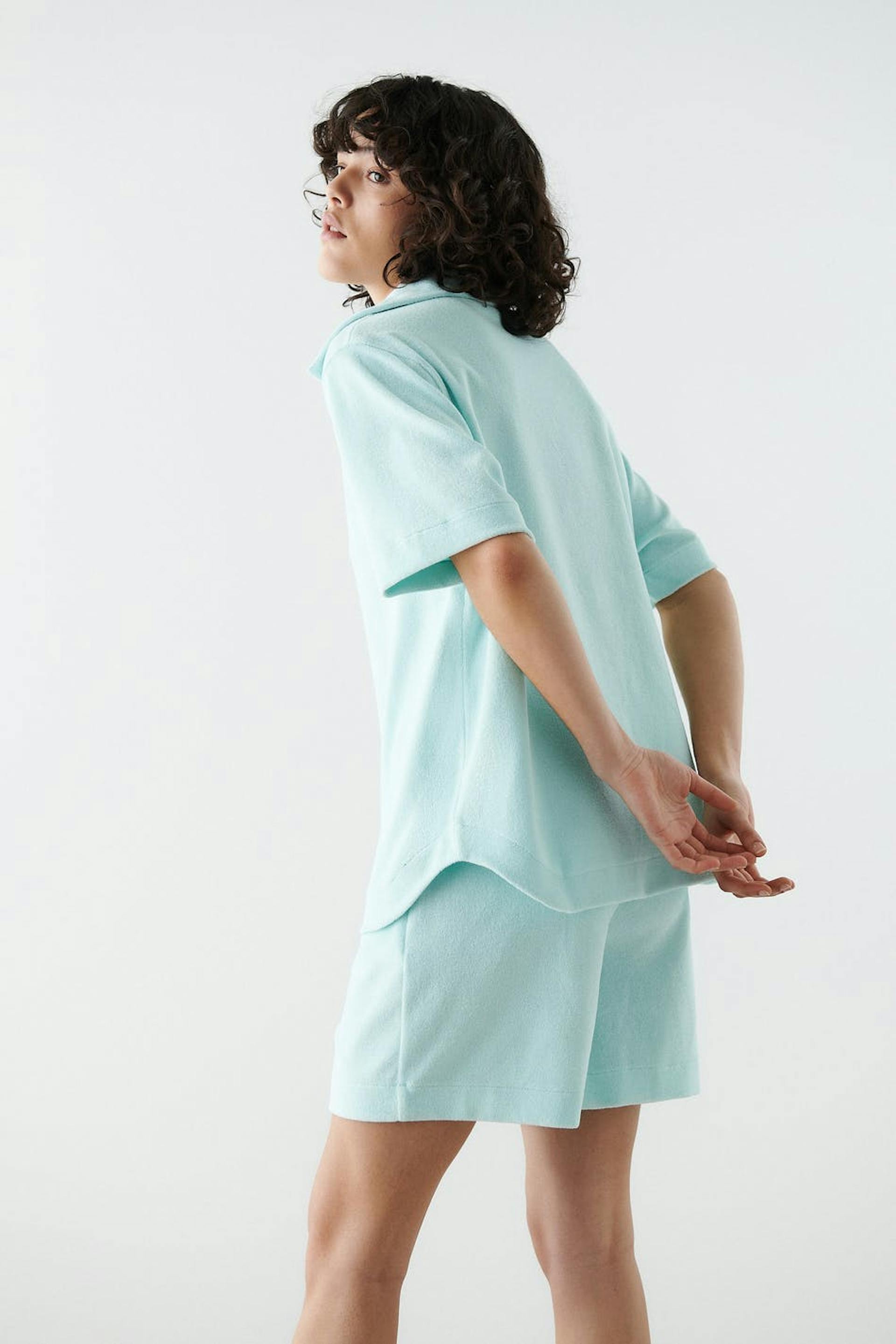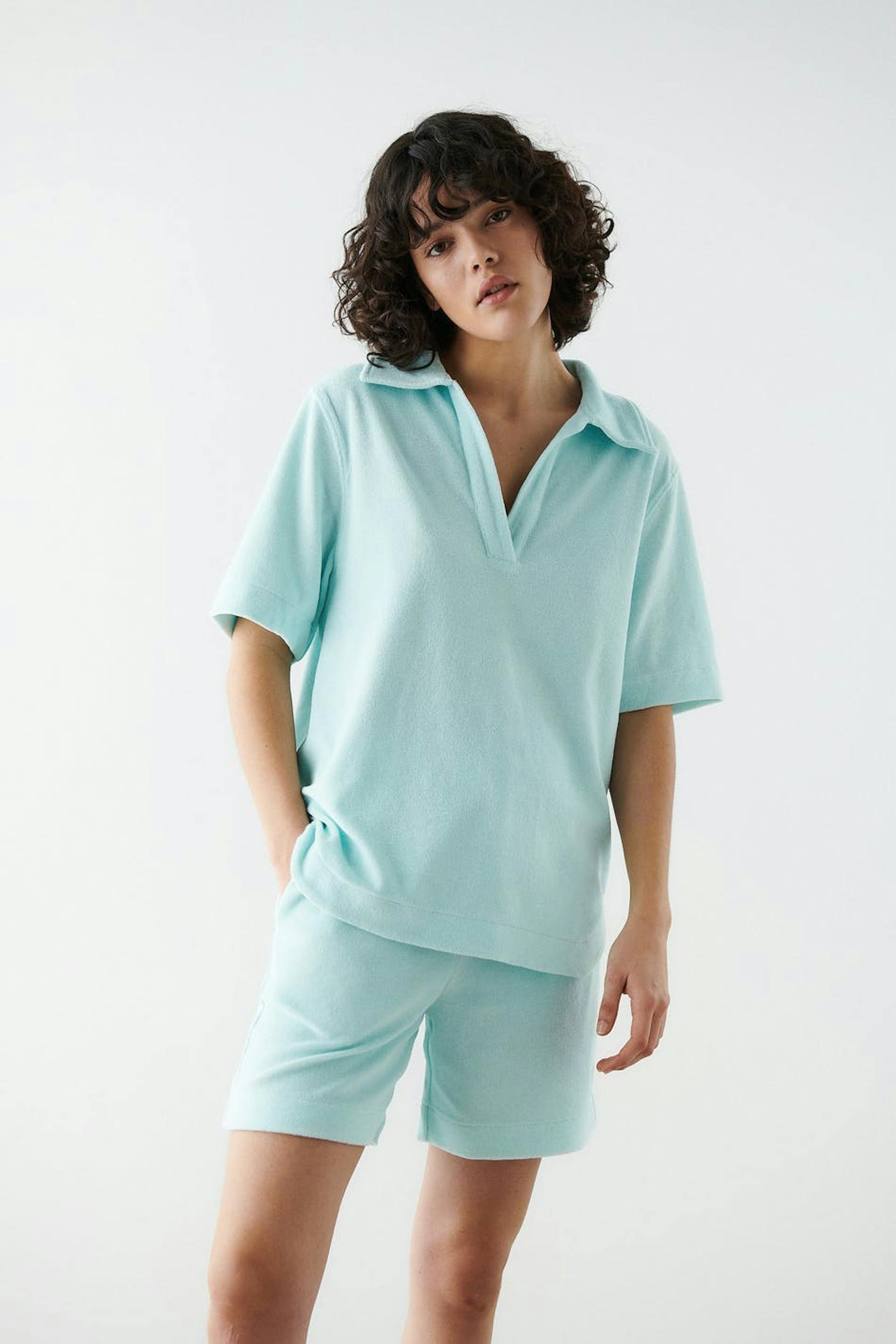 Short-sleeved top in jersey with an oversize fit. The top is blue and collared and has slits on the sides.