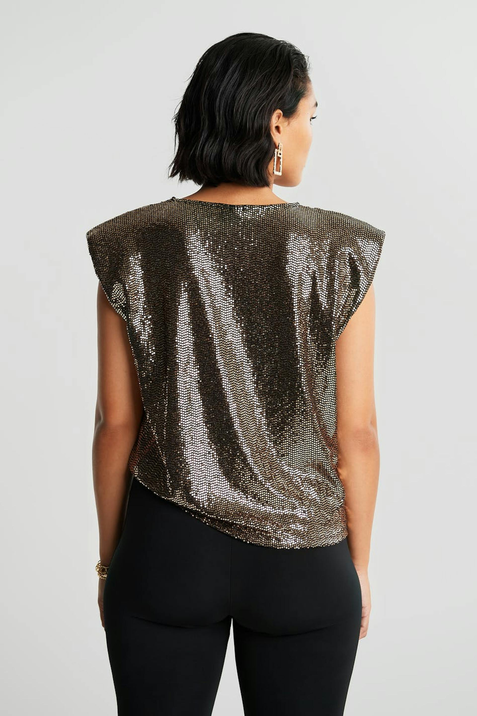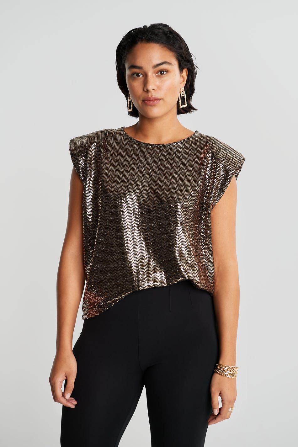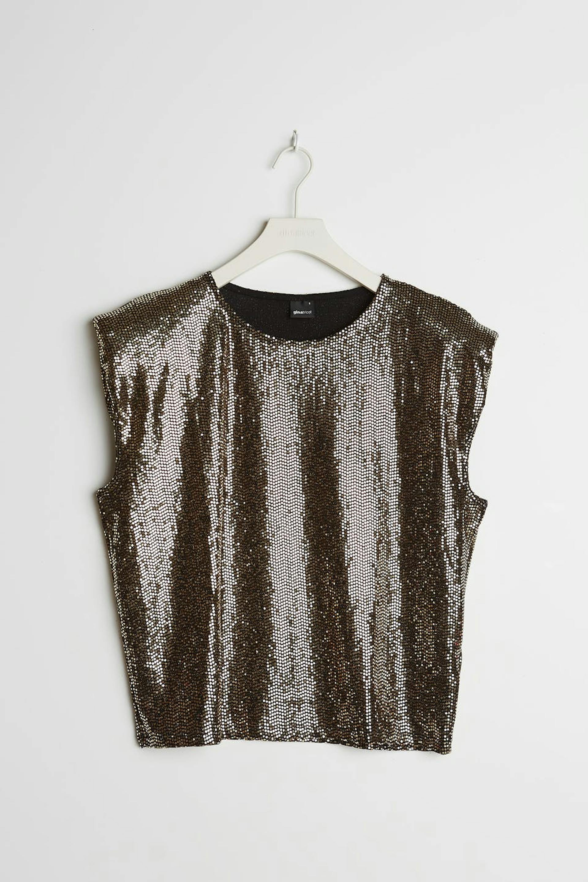 Glittery top with shoulder pads. The top is perfect for the party, gold coloured and sleeveless.