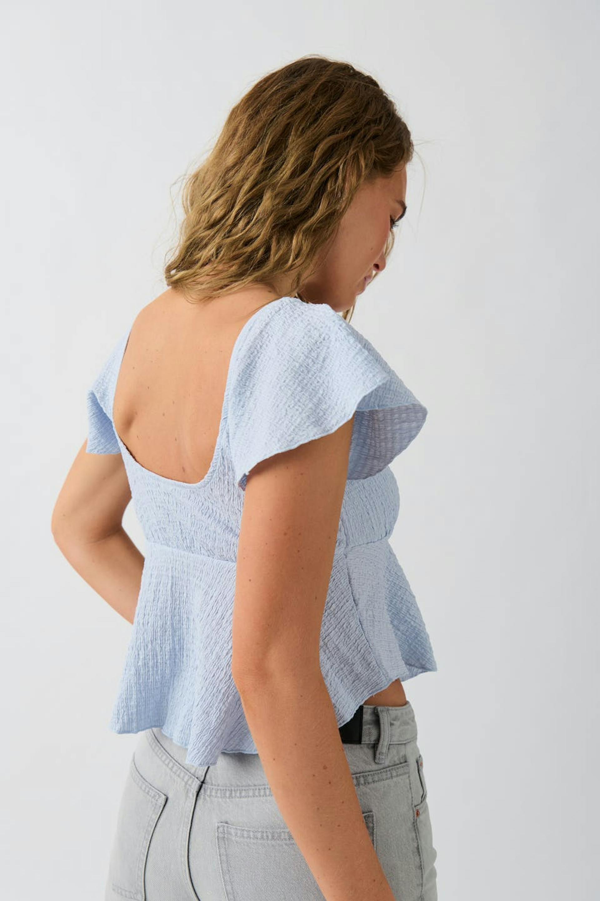 Cropped top in jersey with frill at the bottom. The top is blue and has short butterfly sleeve. It has structured material, regular fit, deep v-neck and seam detail at chest.