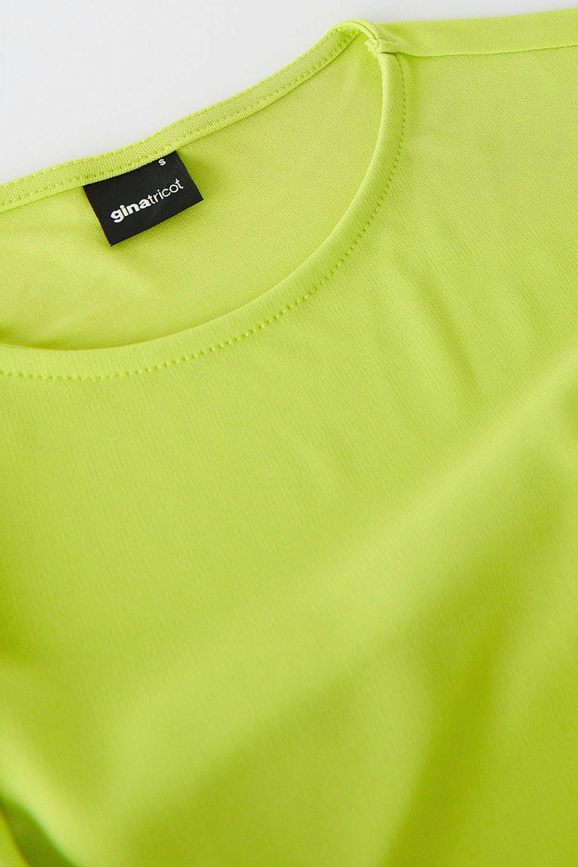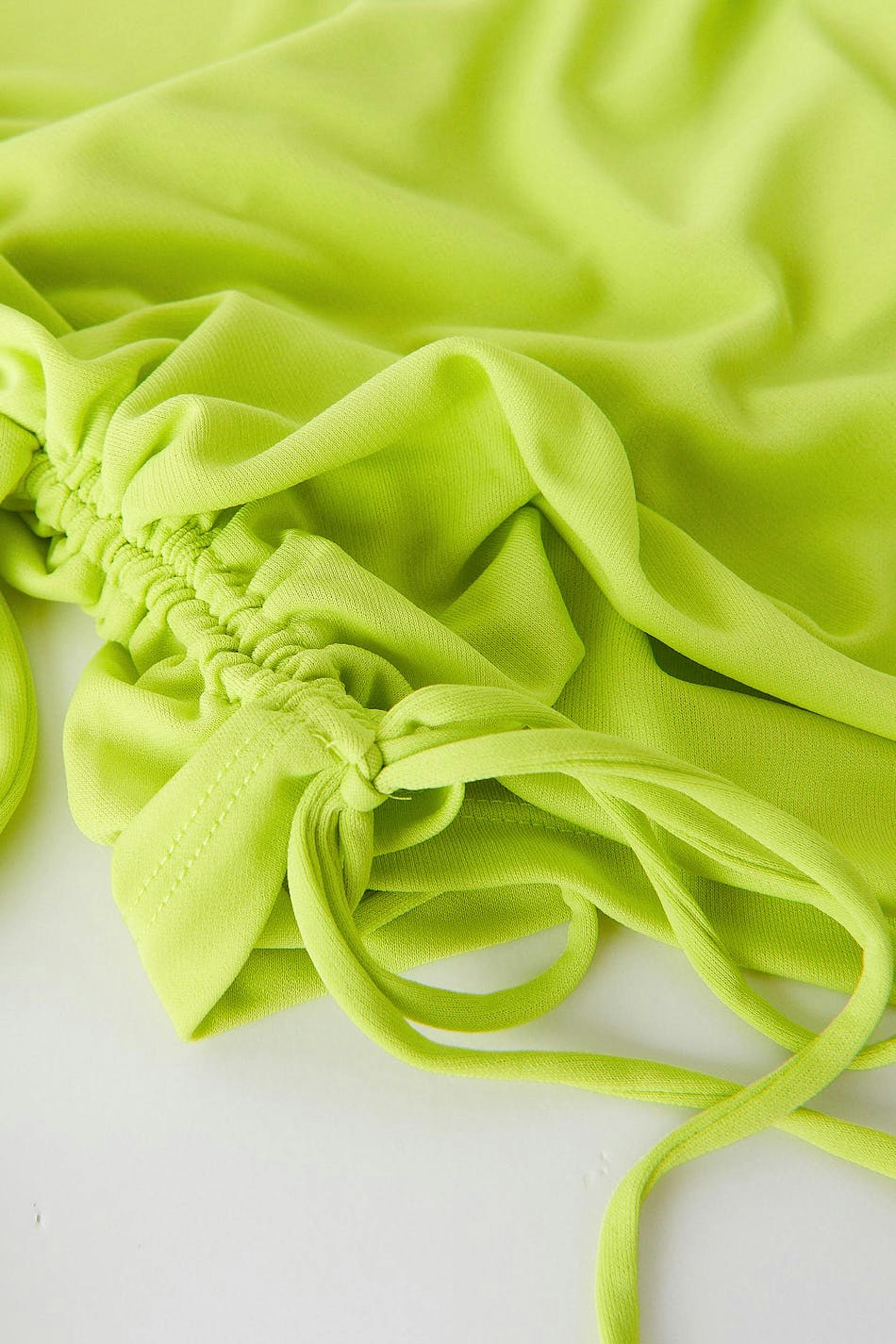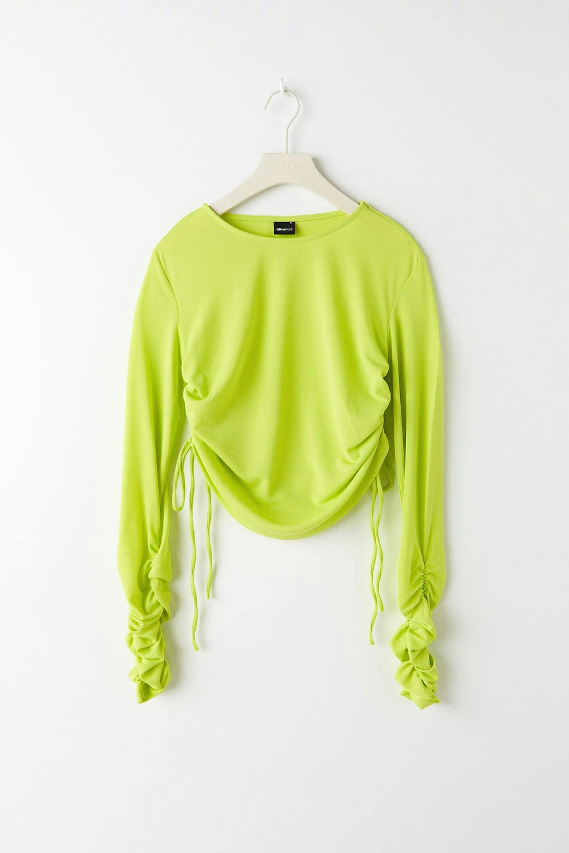 Cropped top with gathering on the sleeves. The top is green and has self-tie drawstrings in the sides.