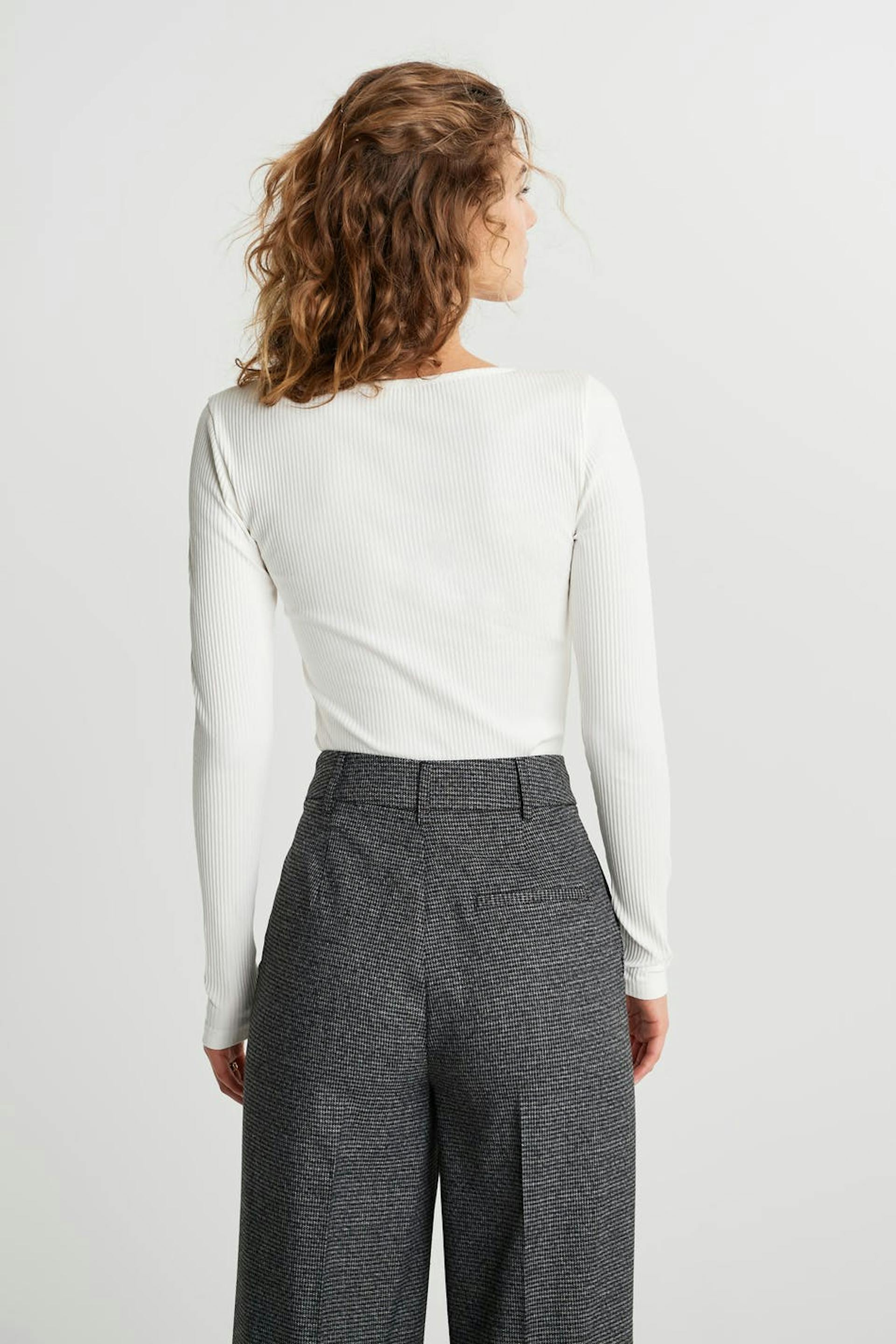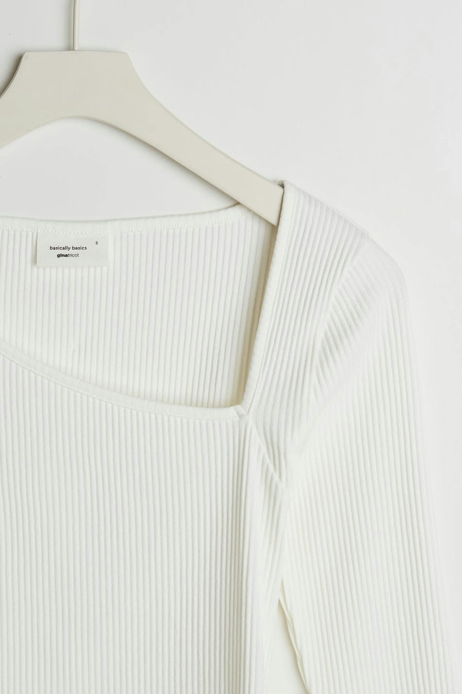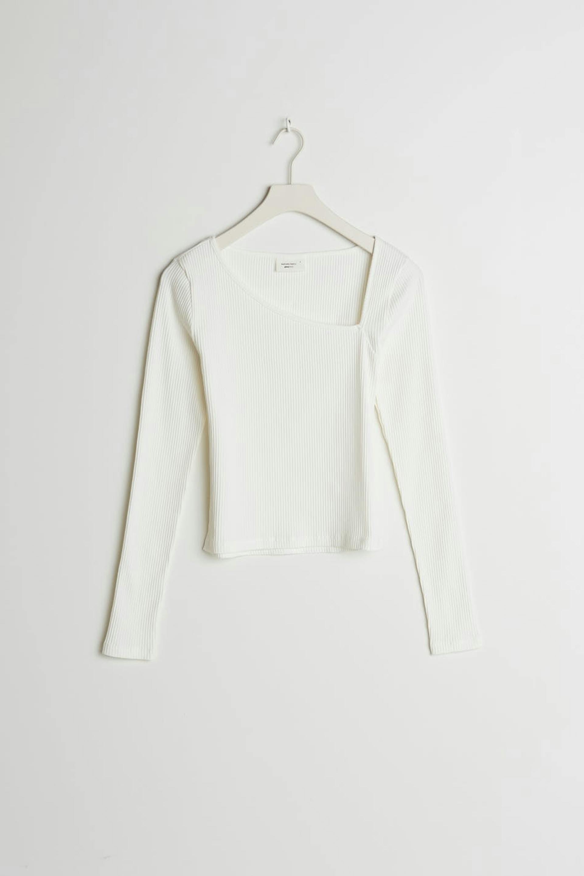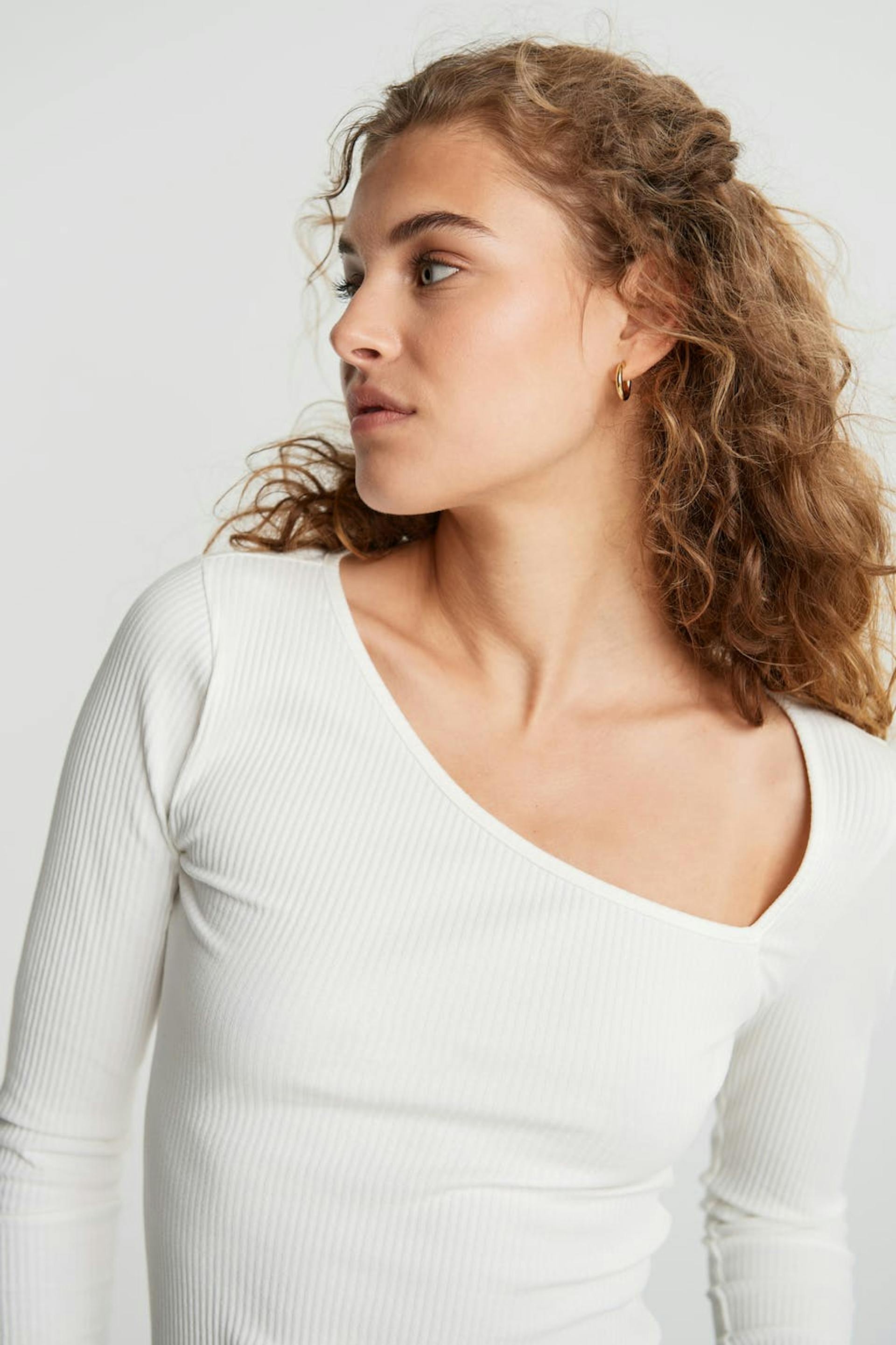 Long-sleeved top with a fitted fit. The top is white and ribbed and has an asymmetrical cutout detail on the neckline. It is made of jersey.