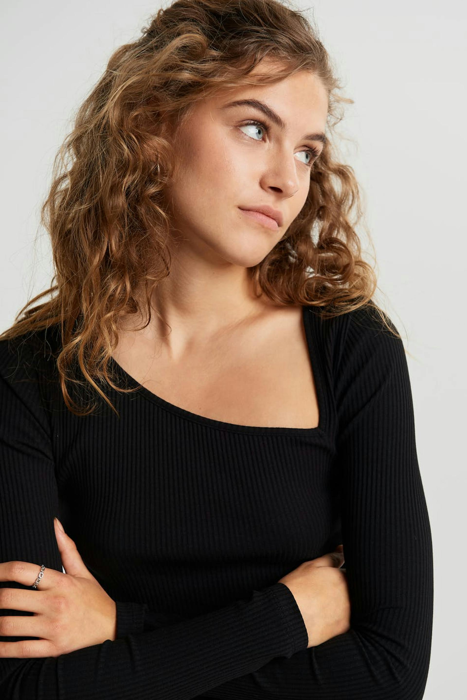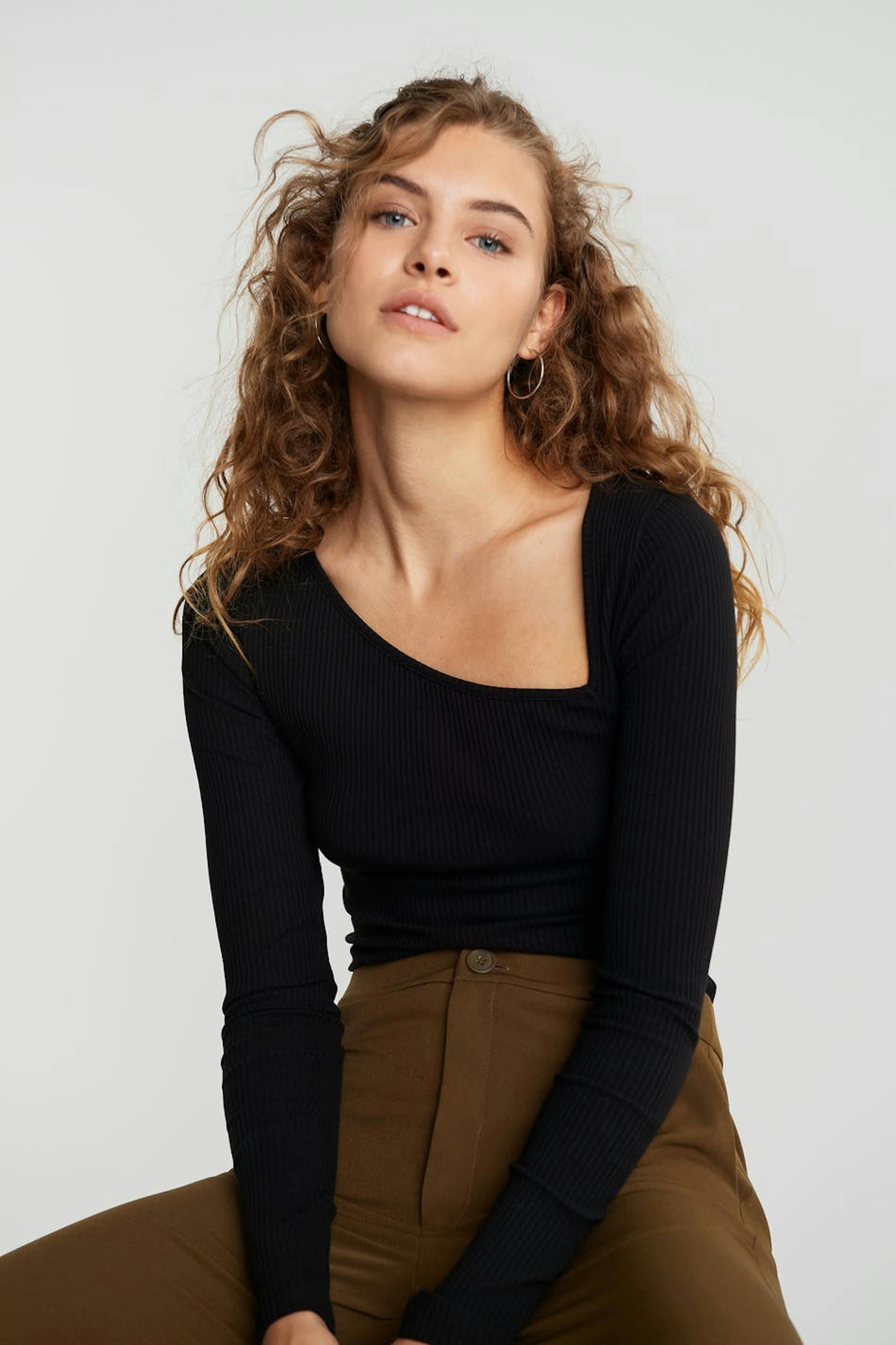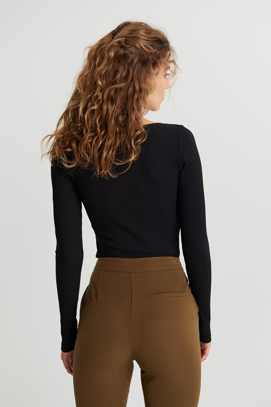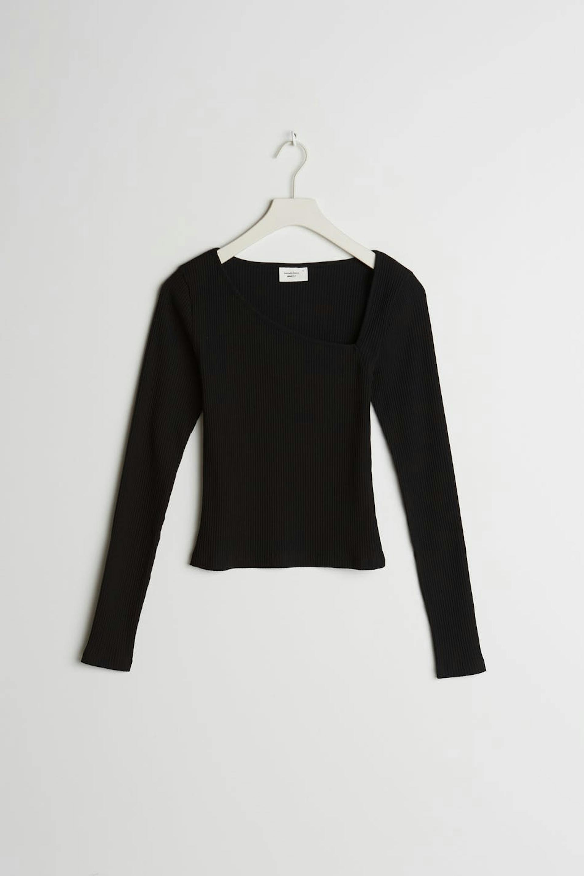 Long-sleeved top with a fitted fit. The top is black and ribbed and has an asymmetrical cutout detail on the neckline. It is made of jersey.