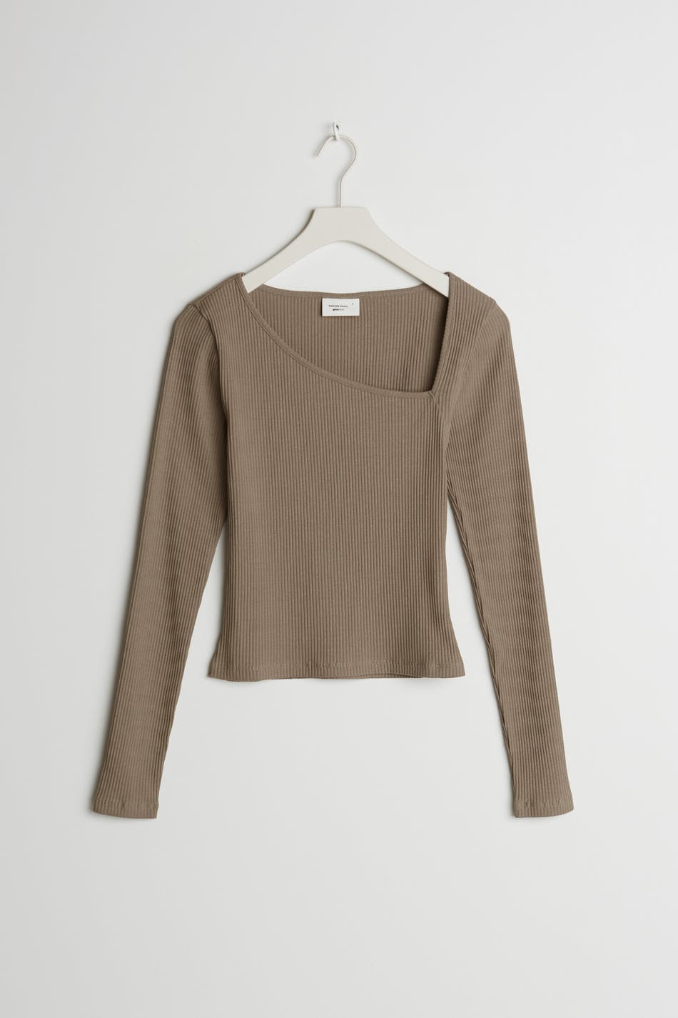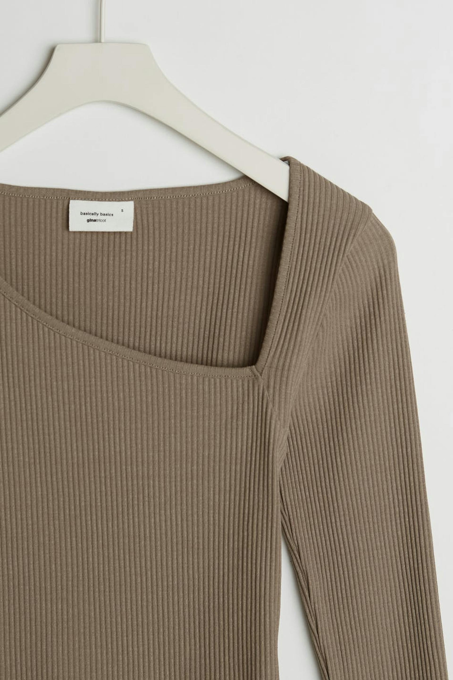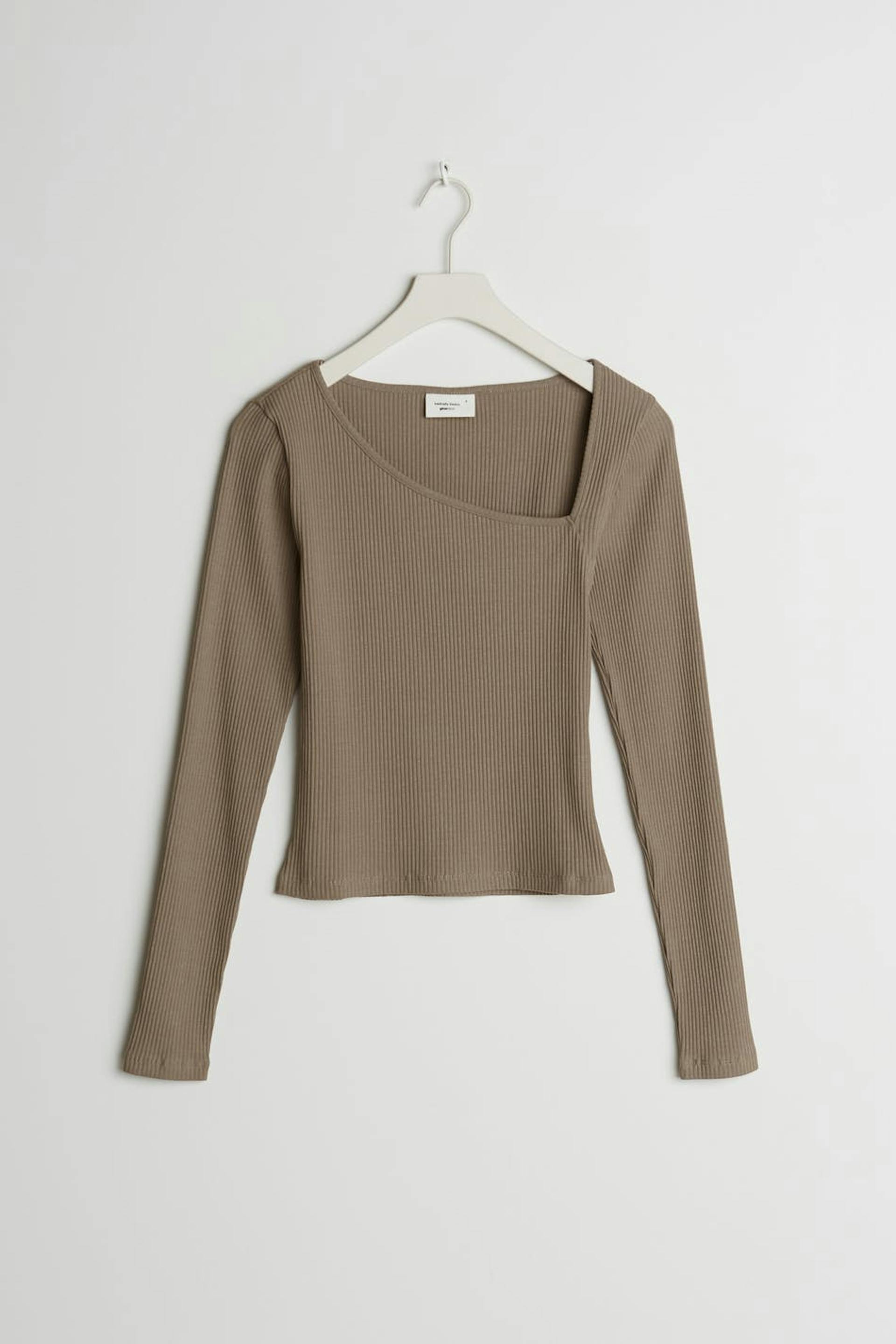 Long-sleeved top with a fitted fit. The top is brown and ribbed and has an asymmetrical cutout detail on the neckline. It is made of jersey.