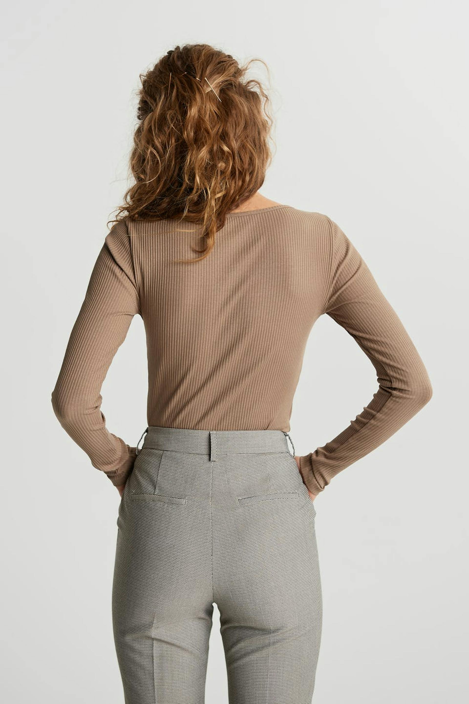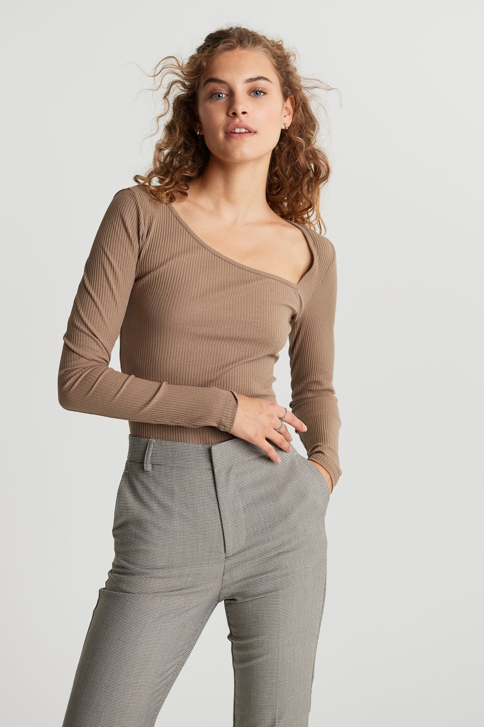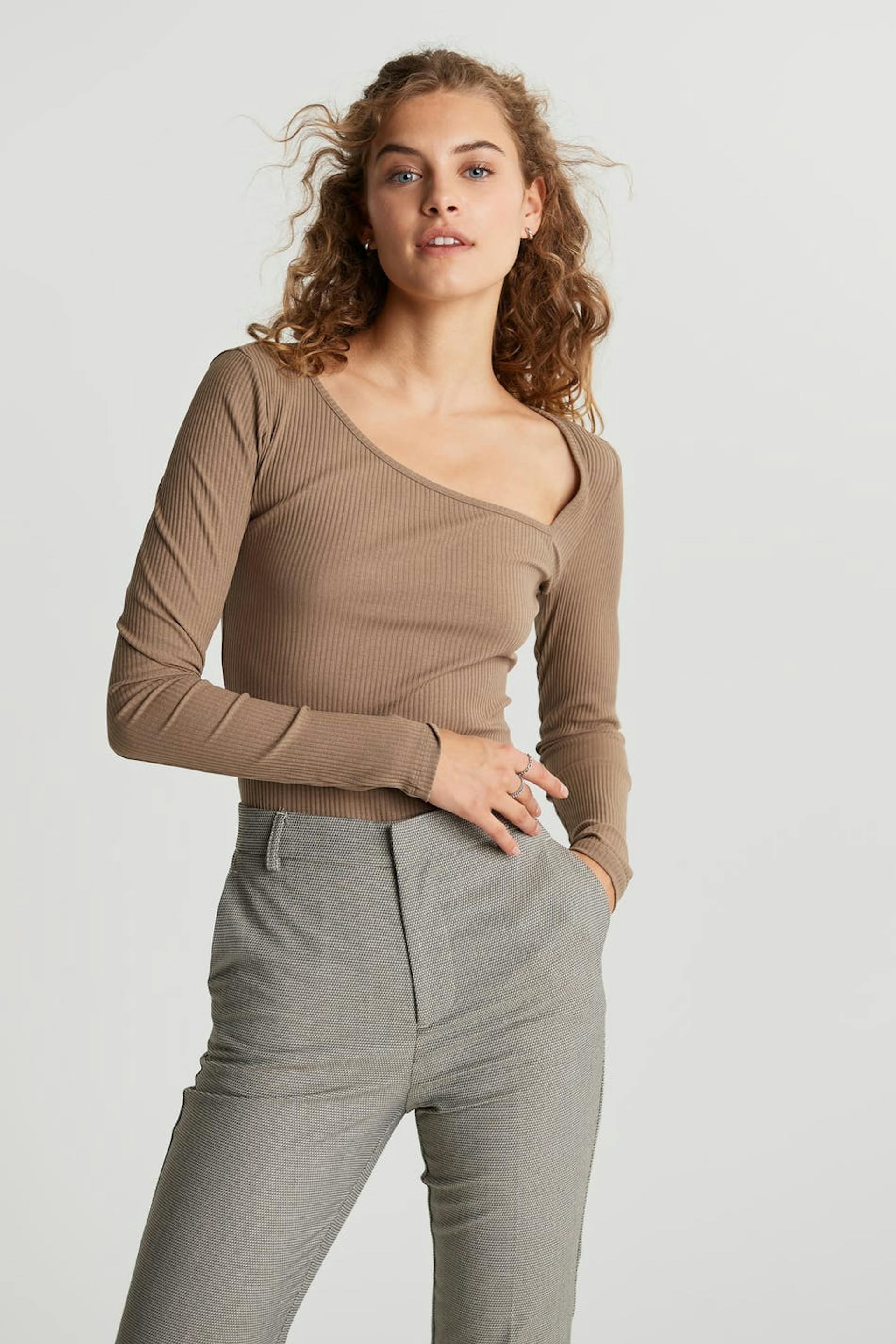 Long-sleeved top with a fitted fit. The top is brown and ribbed and has an asymmetrical cutout detail on the neckline. It is made of jersey.