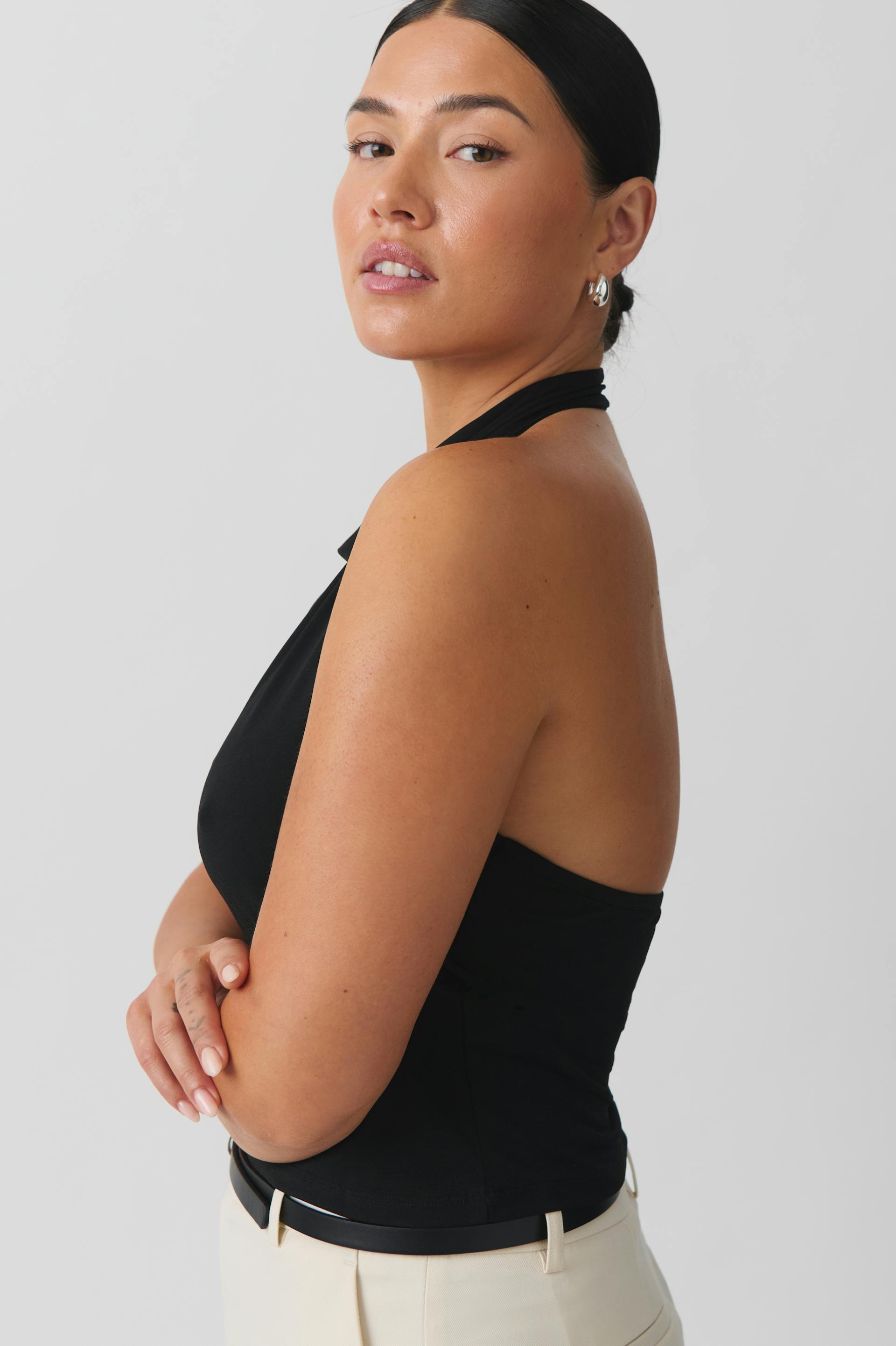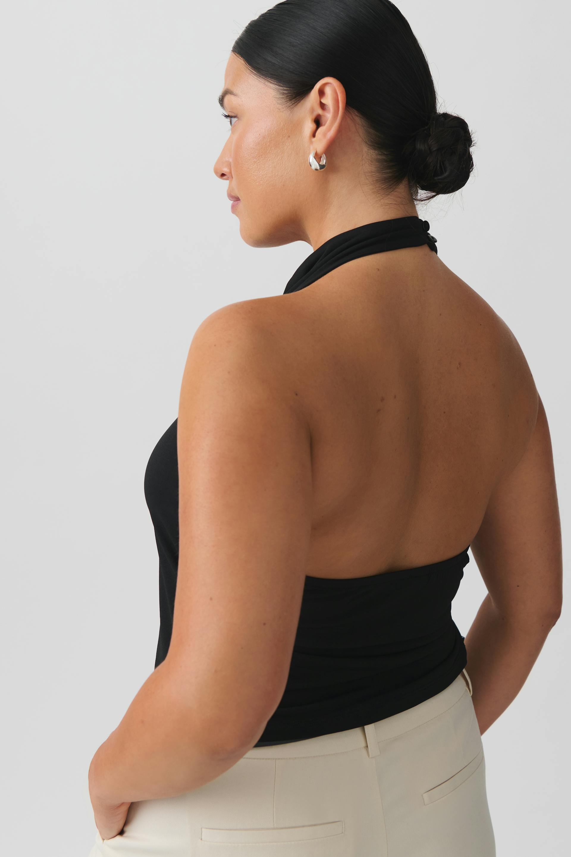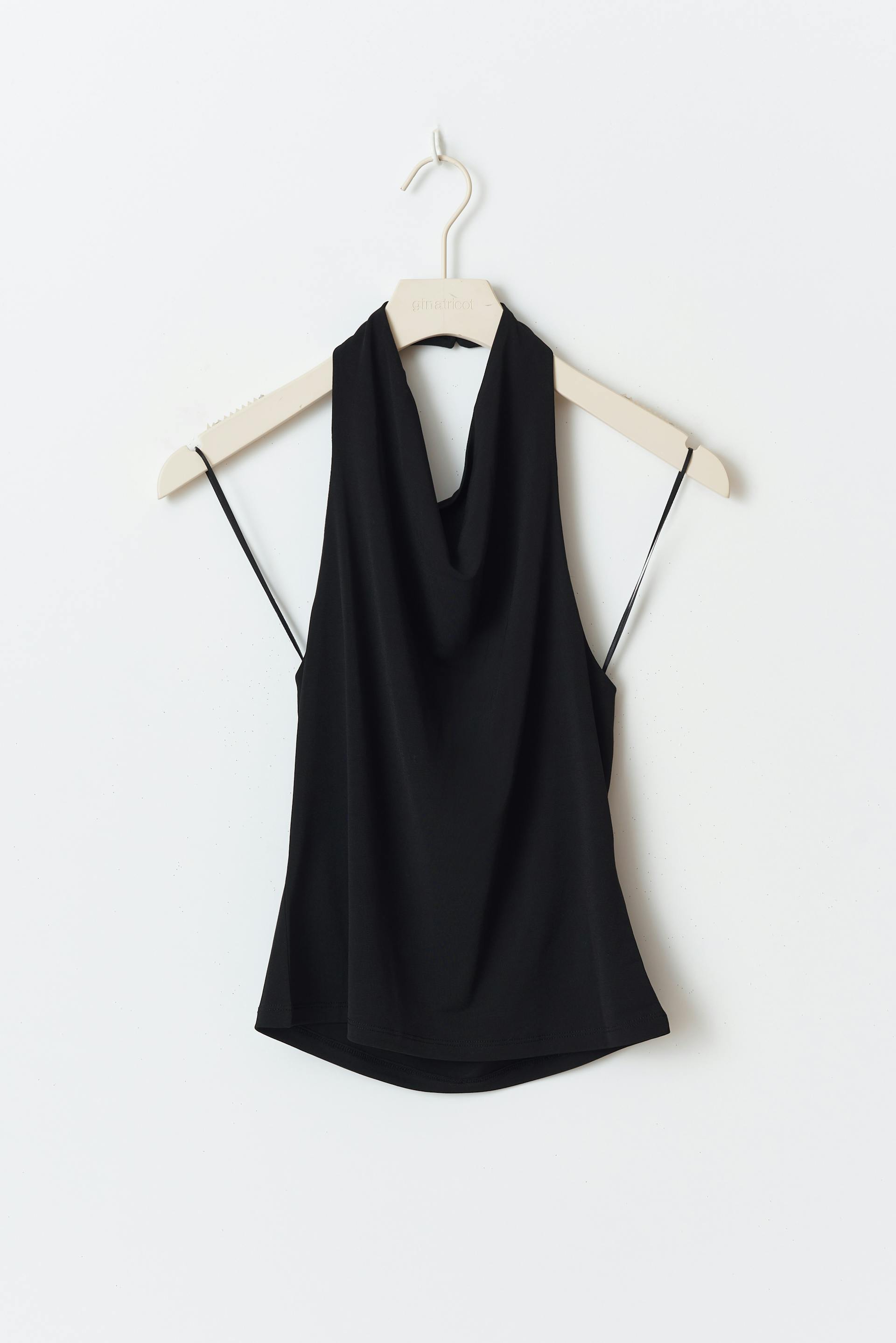 Halterneck top with cowl neck. The top is black and has open back. It has figure-hugging fit and buttoning at neck.