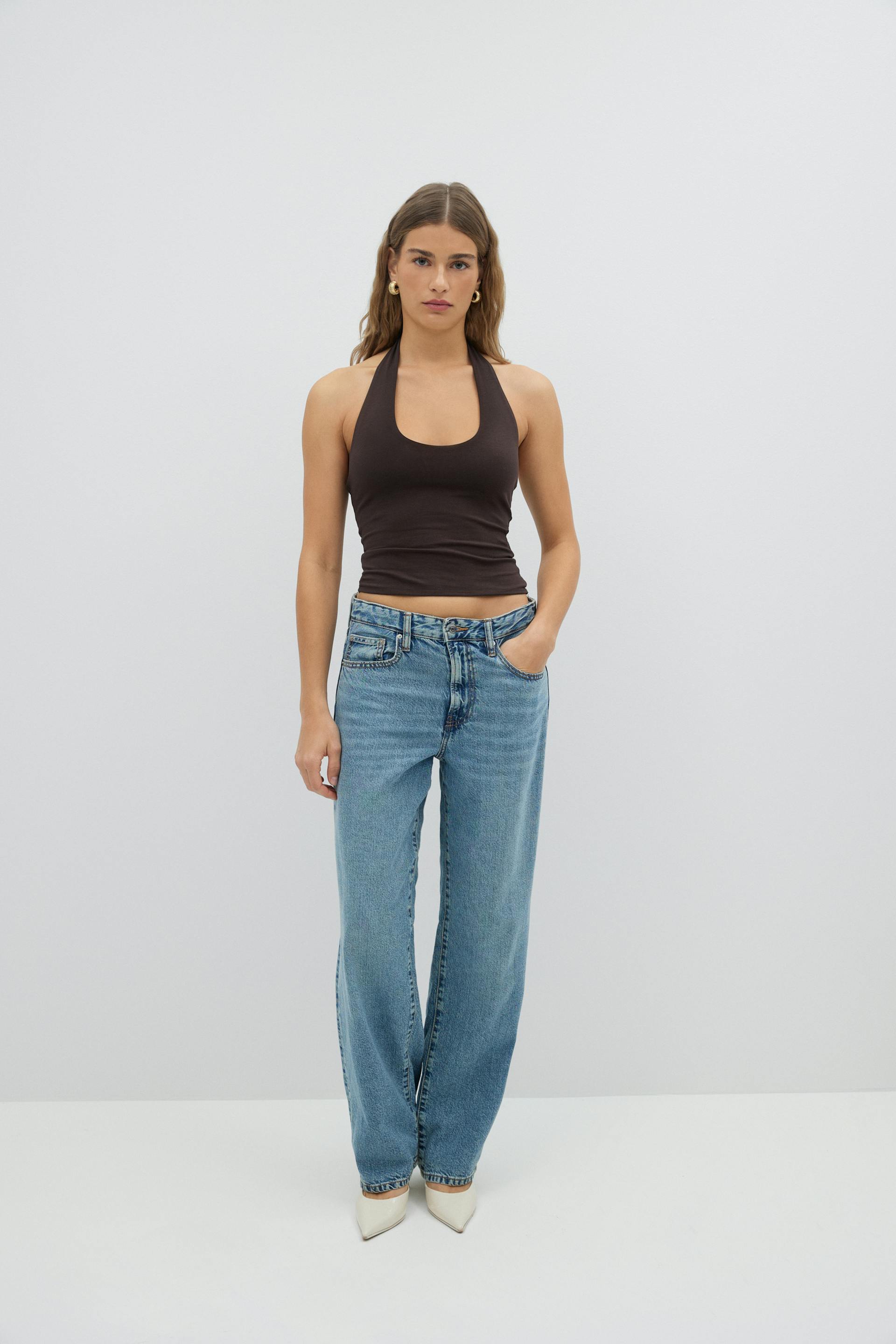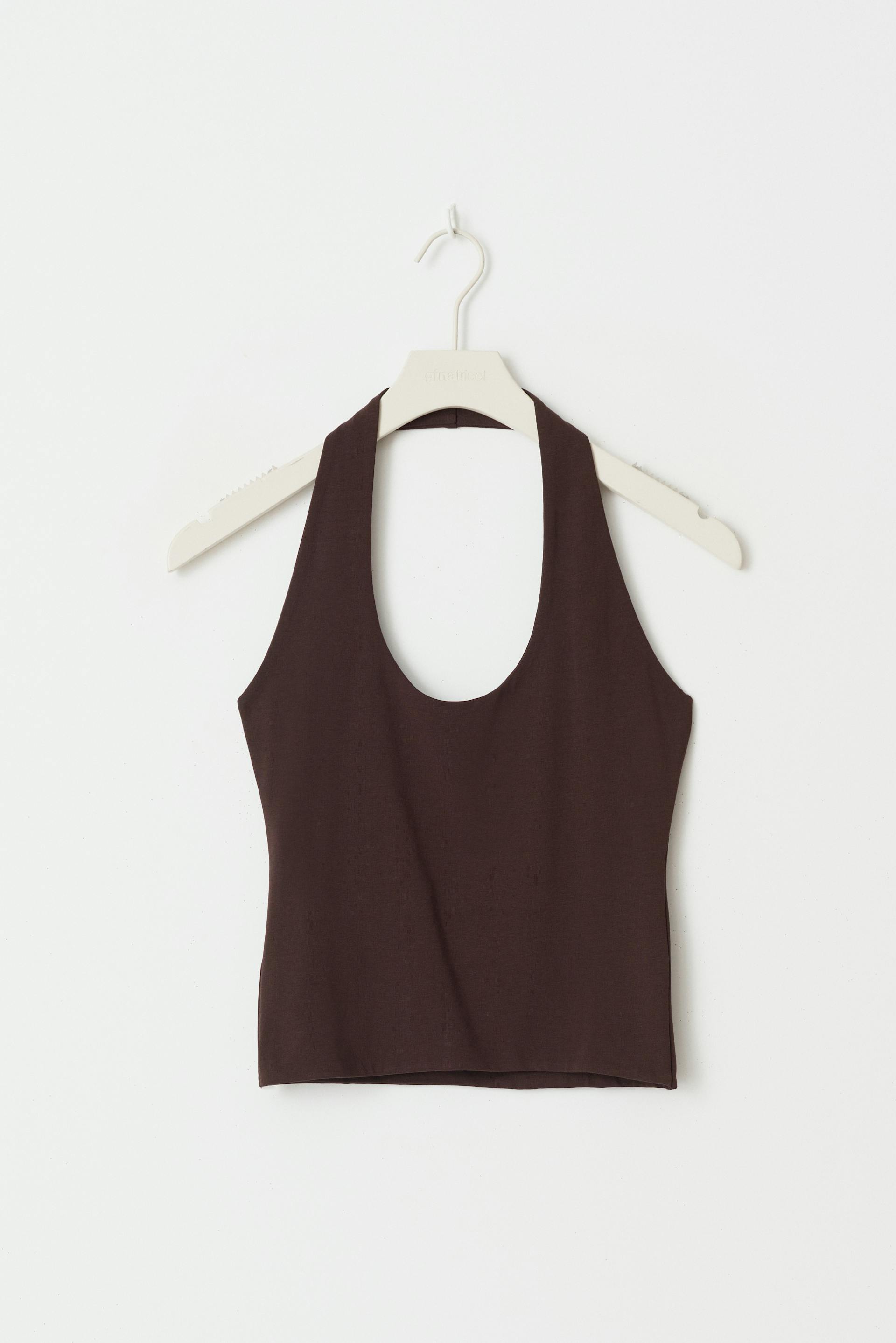 Sleeveless halterneck top with open back. The top is brown and has stretchy material. It has figure-hugging fit and short length. Lined.