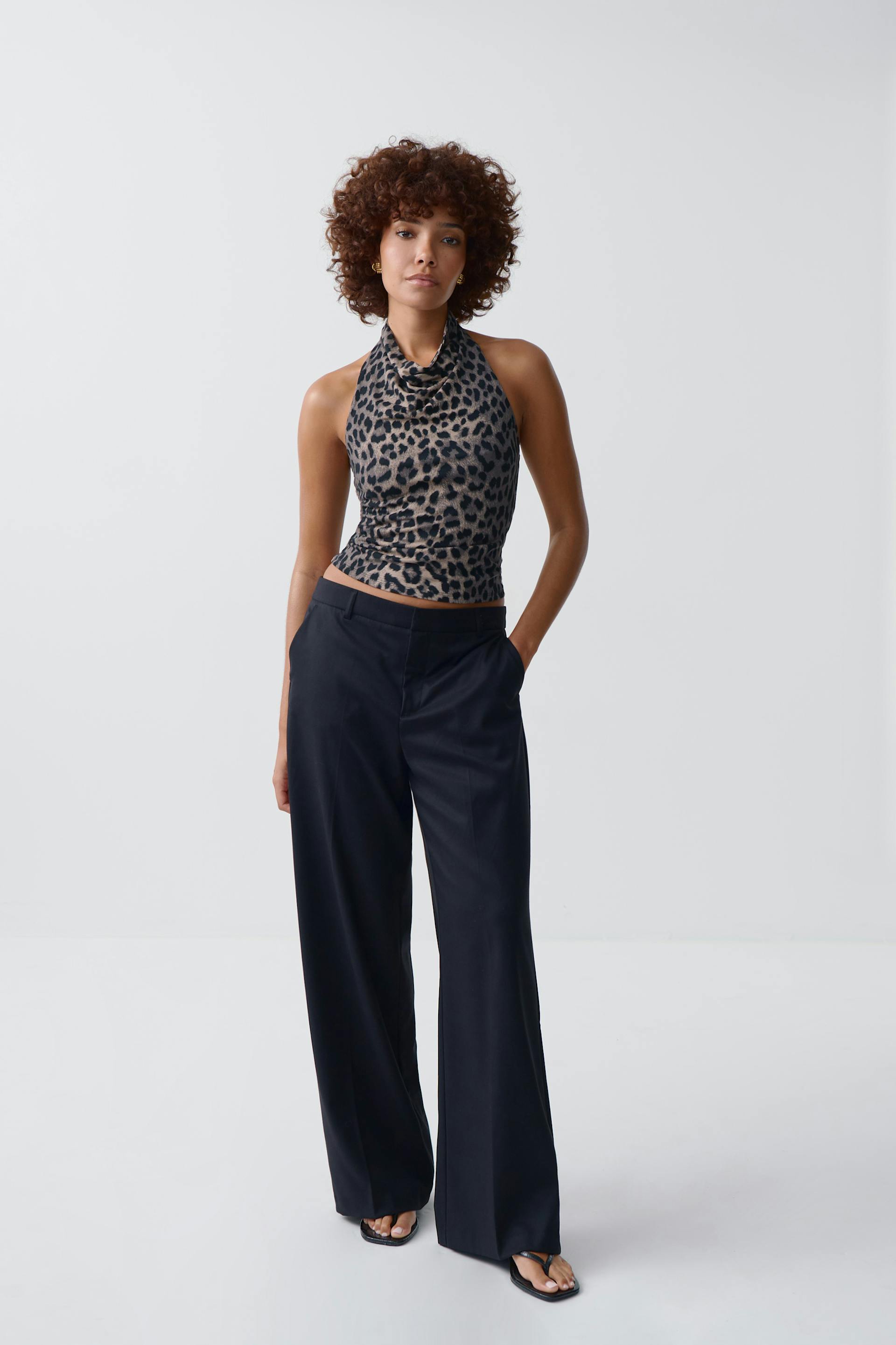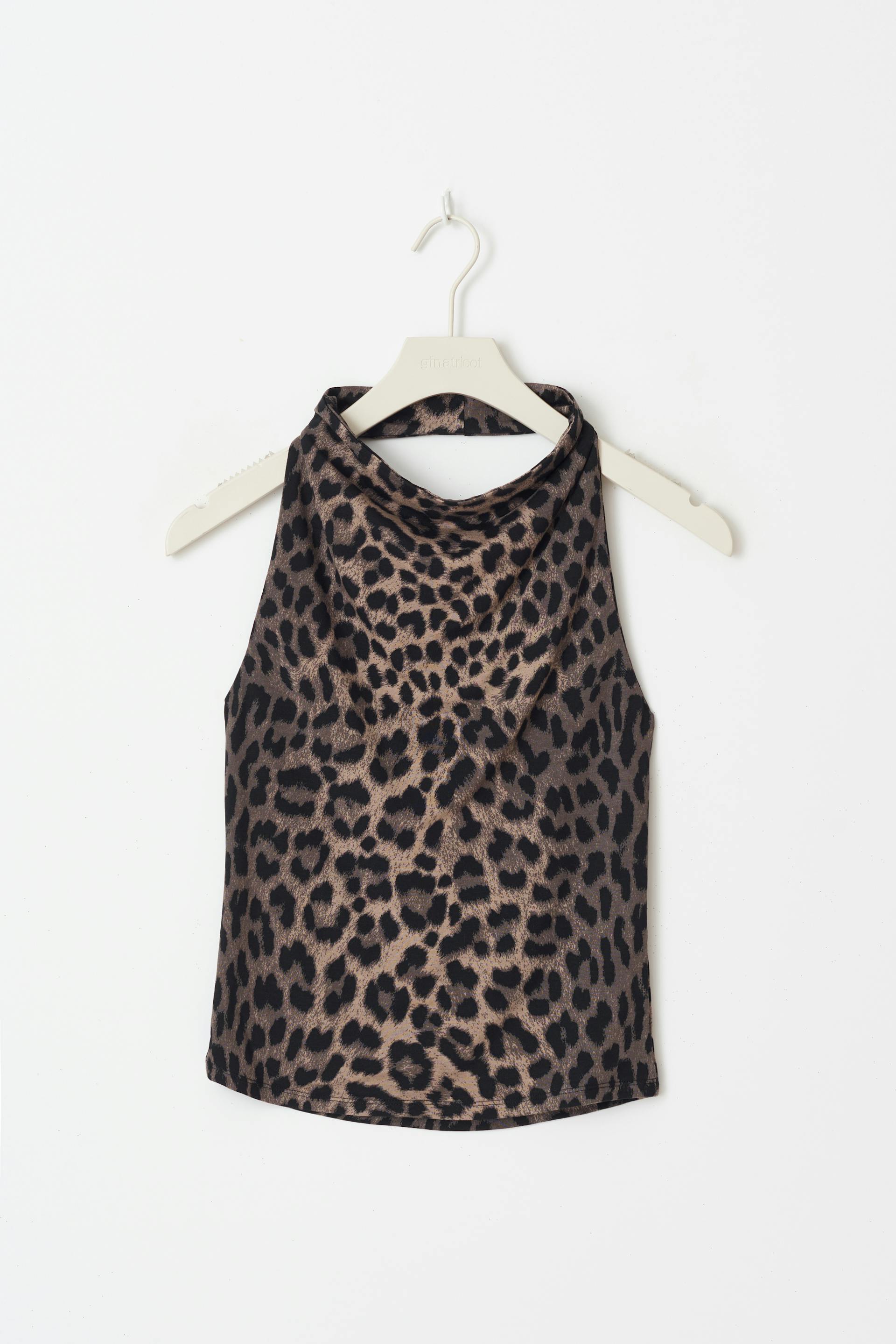 Leopard patterned top in soft viscose with cowl neck. The top is brown and sleeveless and has cropped length. It has open back and stretchy quality. Lined.