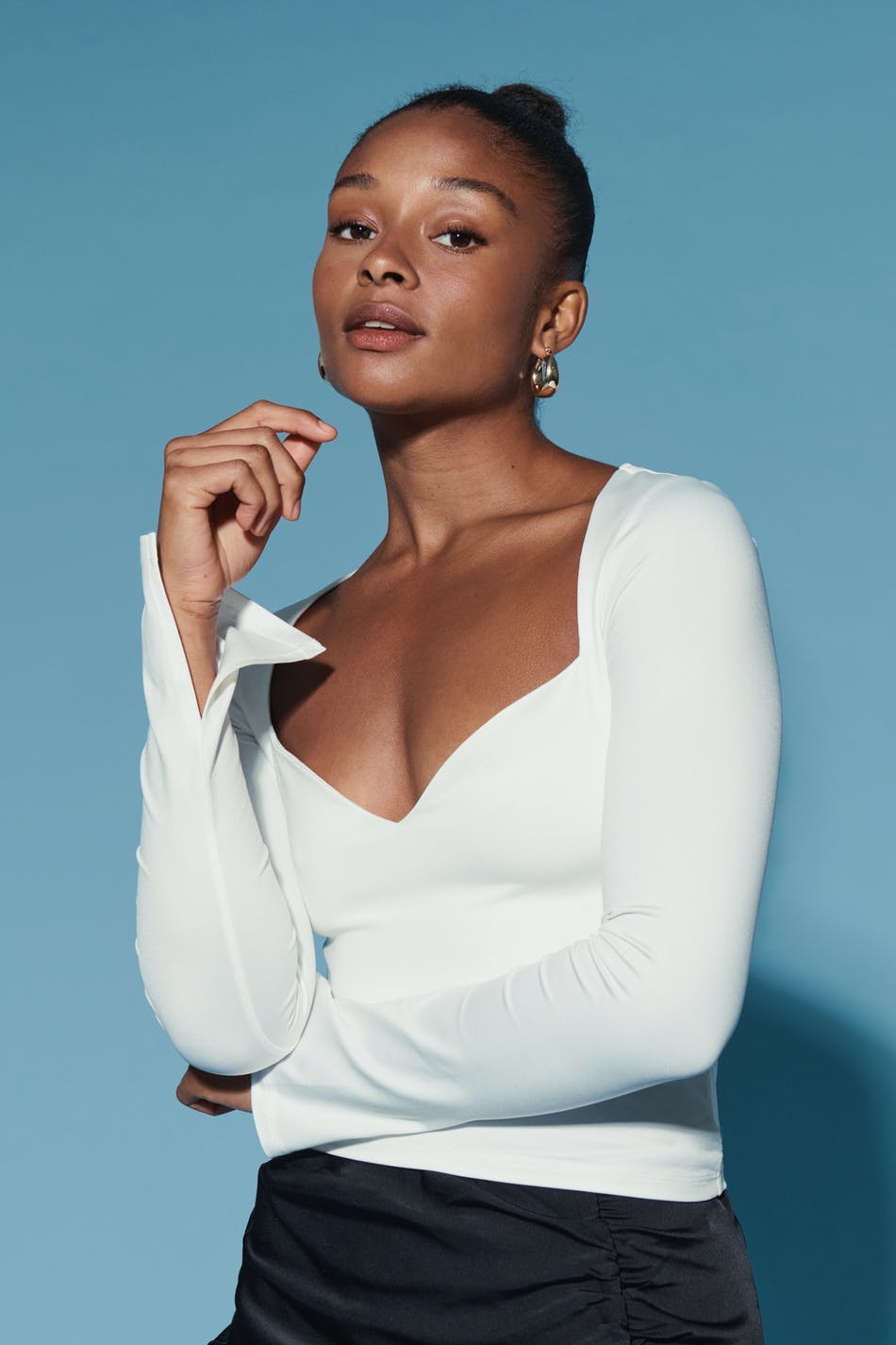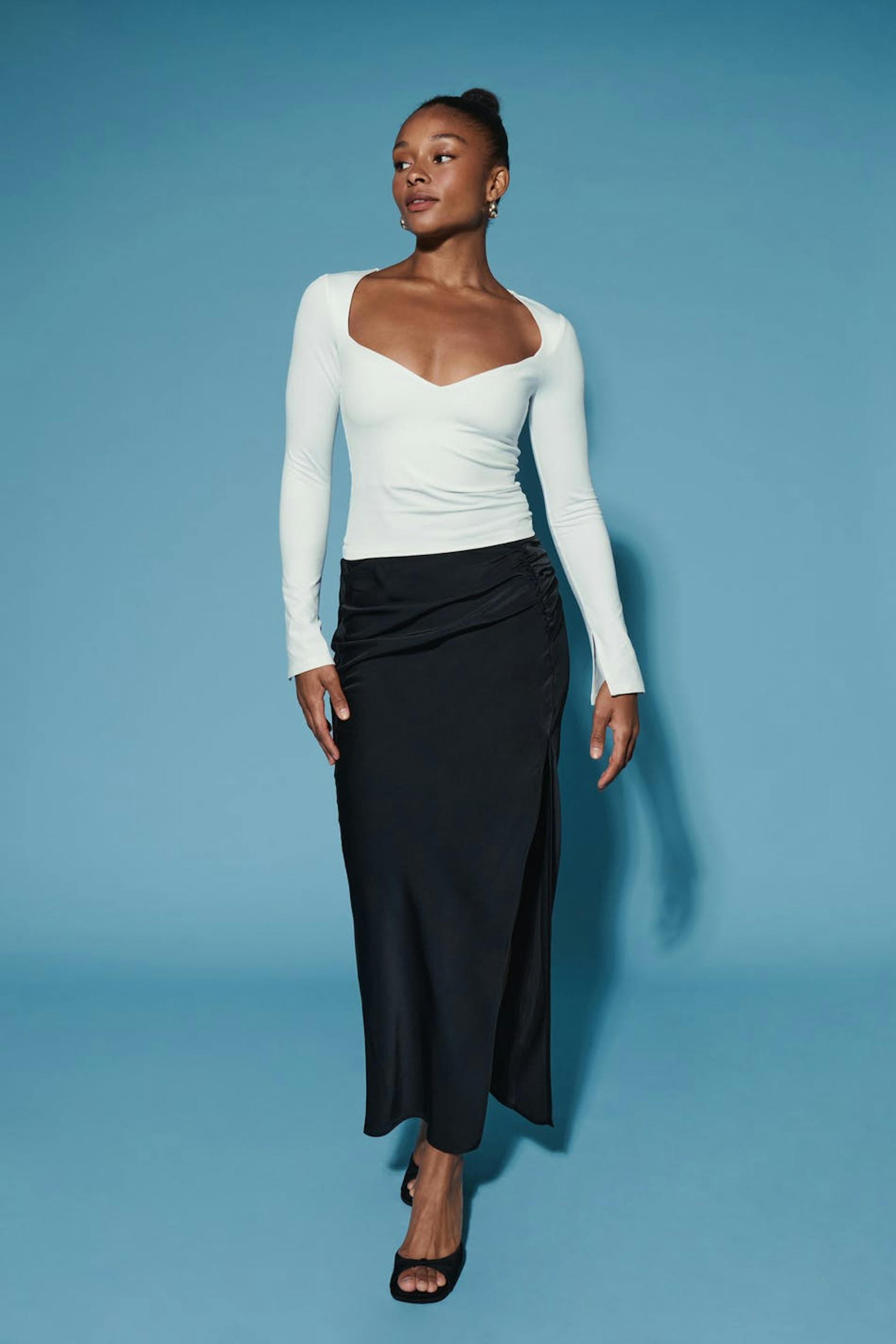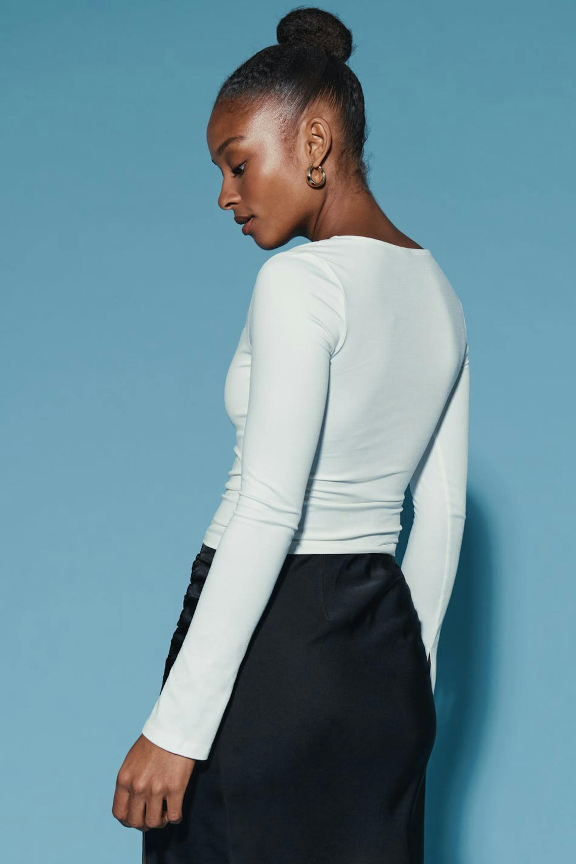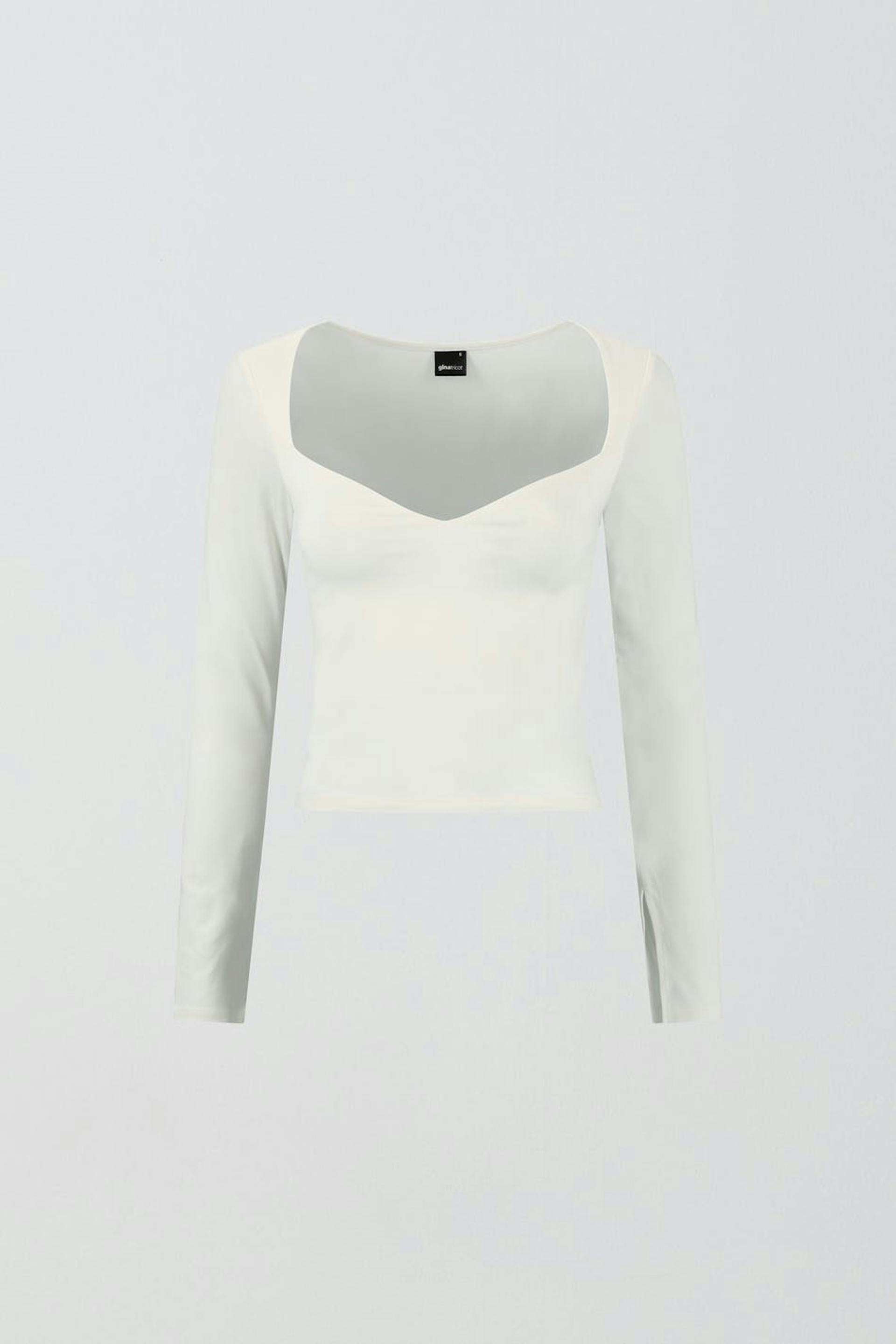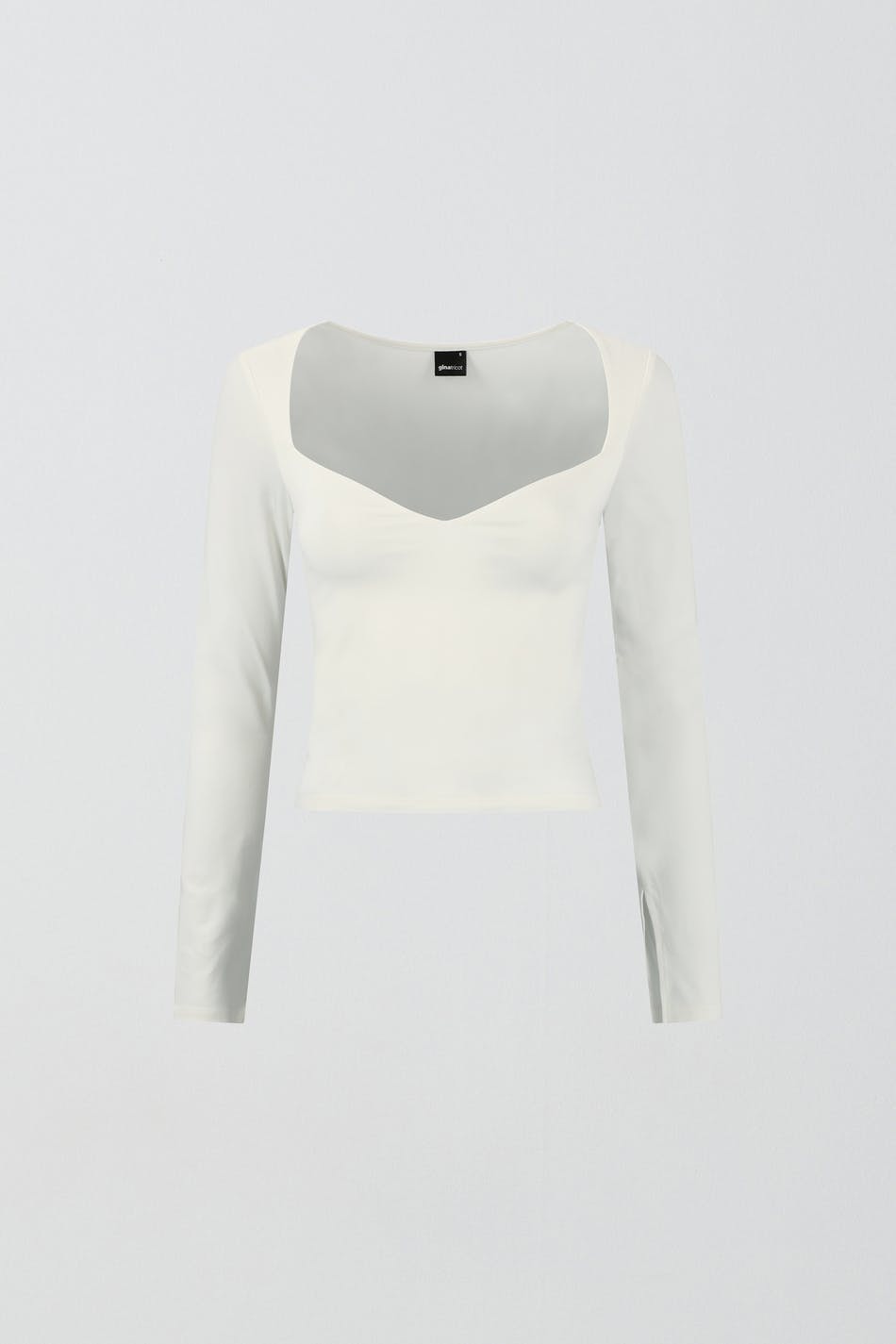 Long-sleeved top in jersey with sweetheart neckline. The top is white and has slit on the sleeve ends. It has figure-hugging fit and stretchy quality.