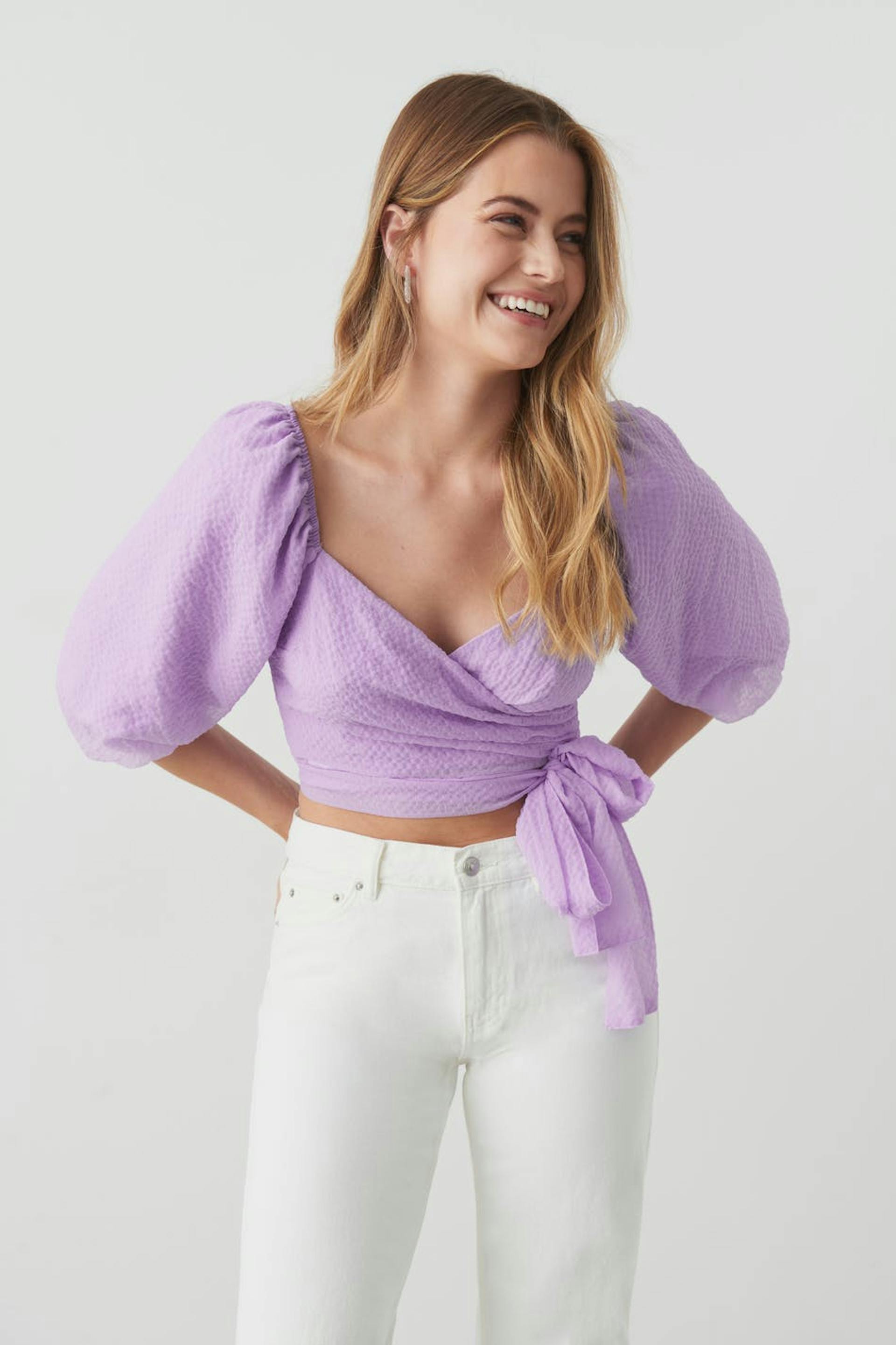 Wrap top with voluminous sleeves. The top is purple and has a textured material. It has elastic around the shoulders, self-tie at the waist and cropped length.