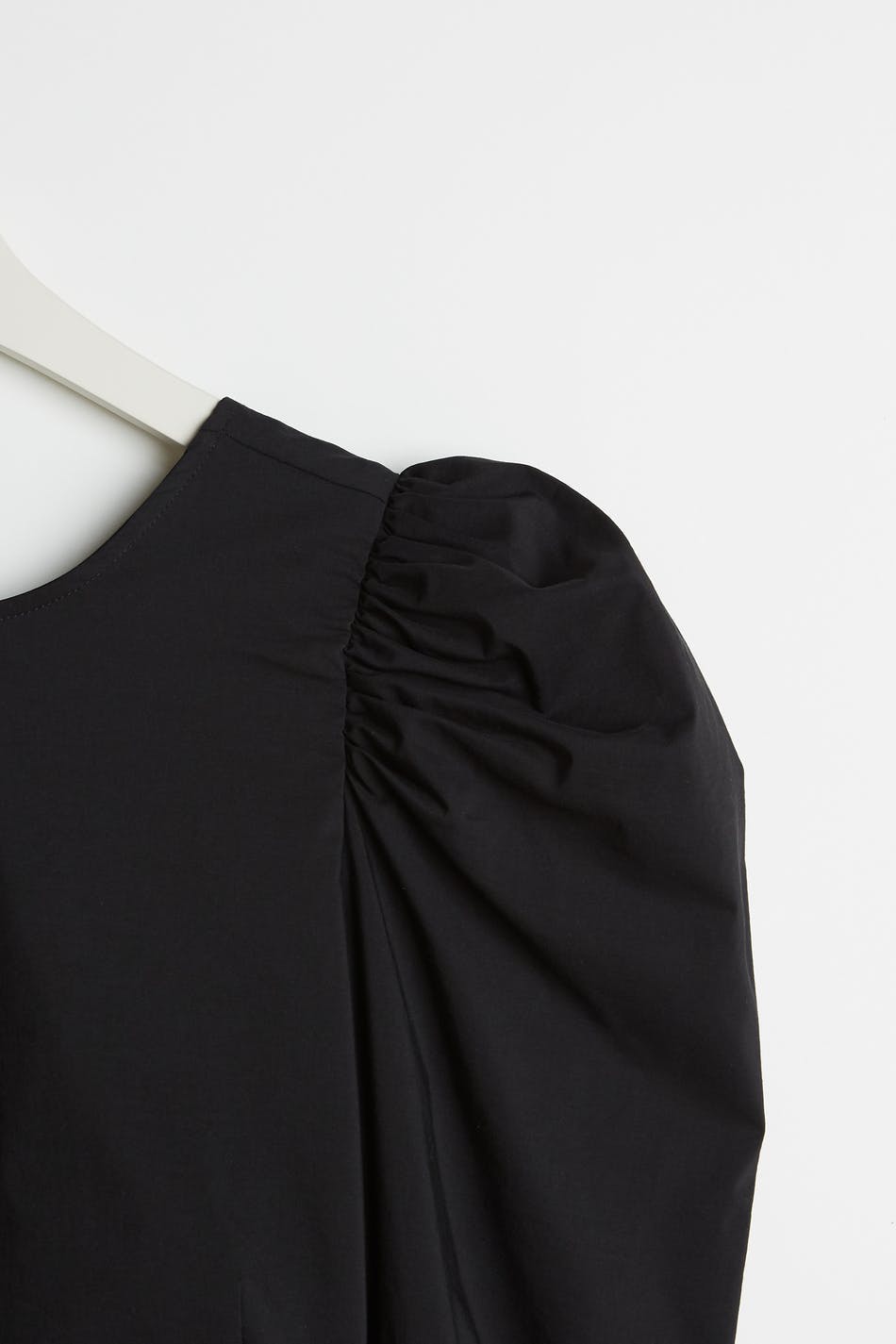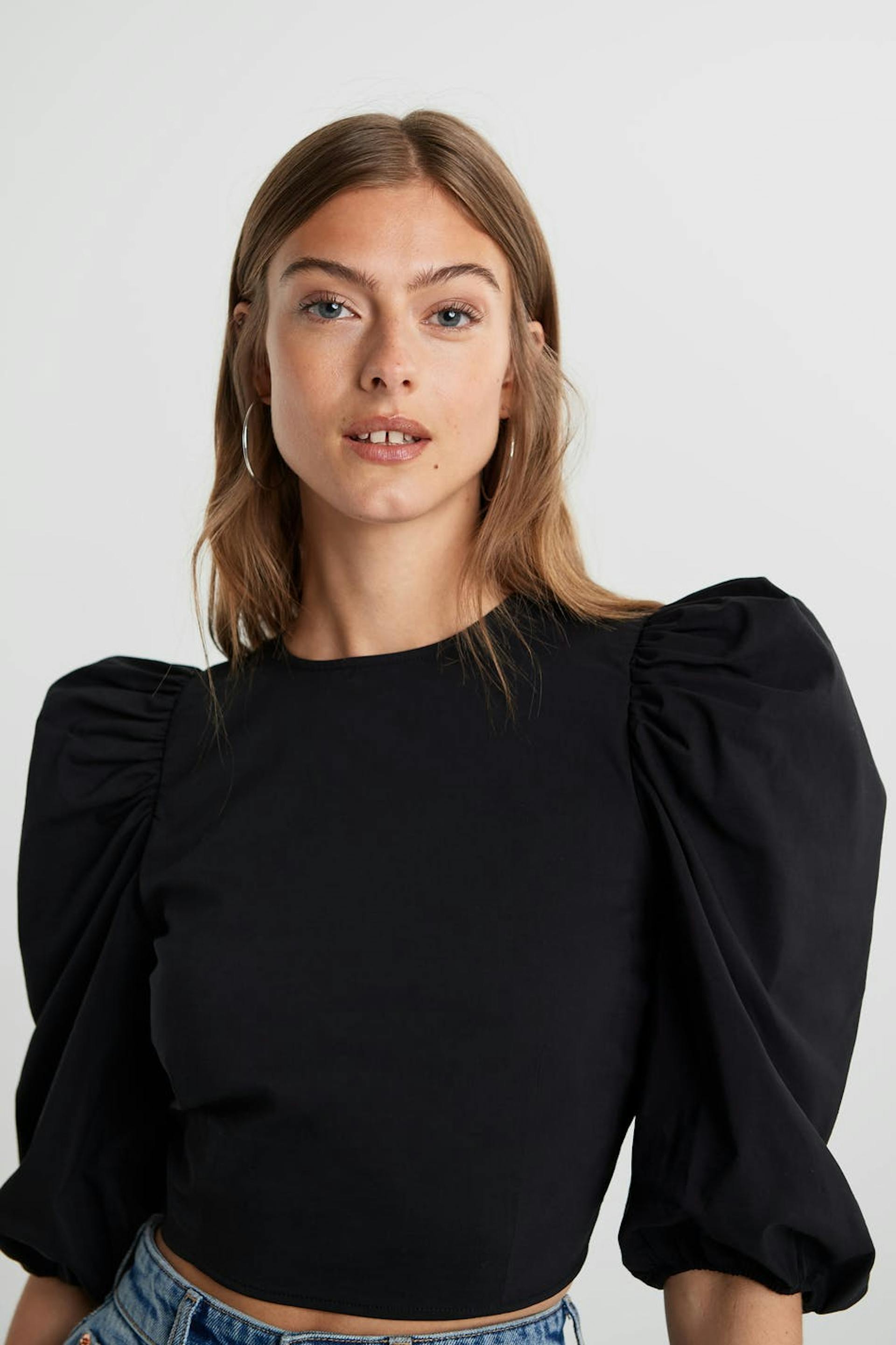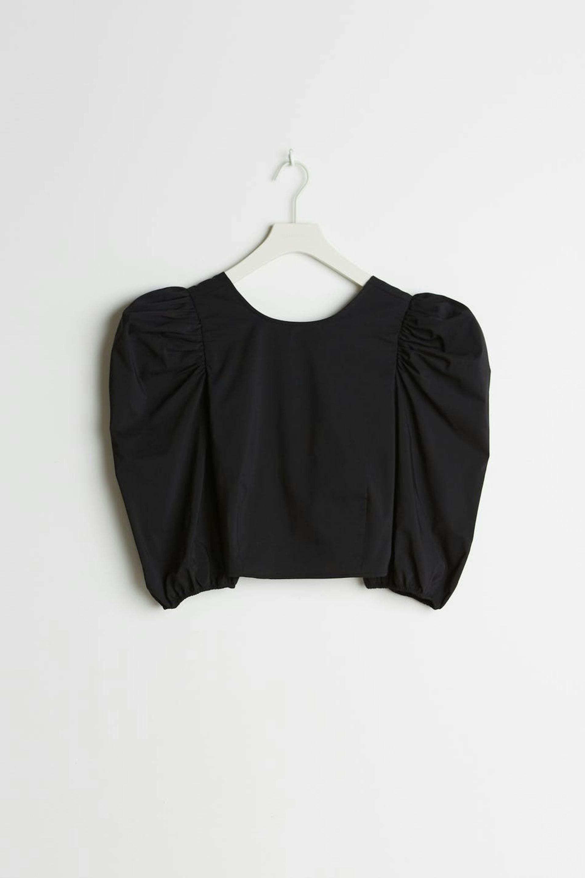 Short top with an open back design with thin, criss crossed tie straps. The top is perfect for the party and black and has short puff sleeves.