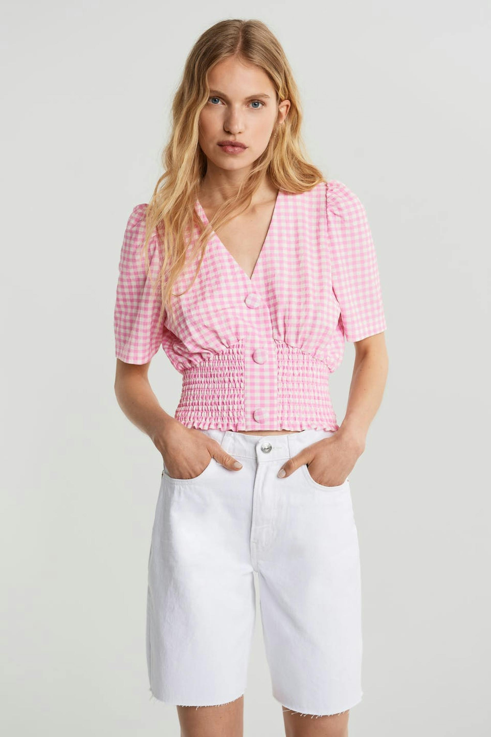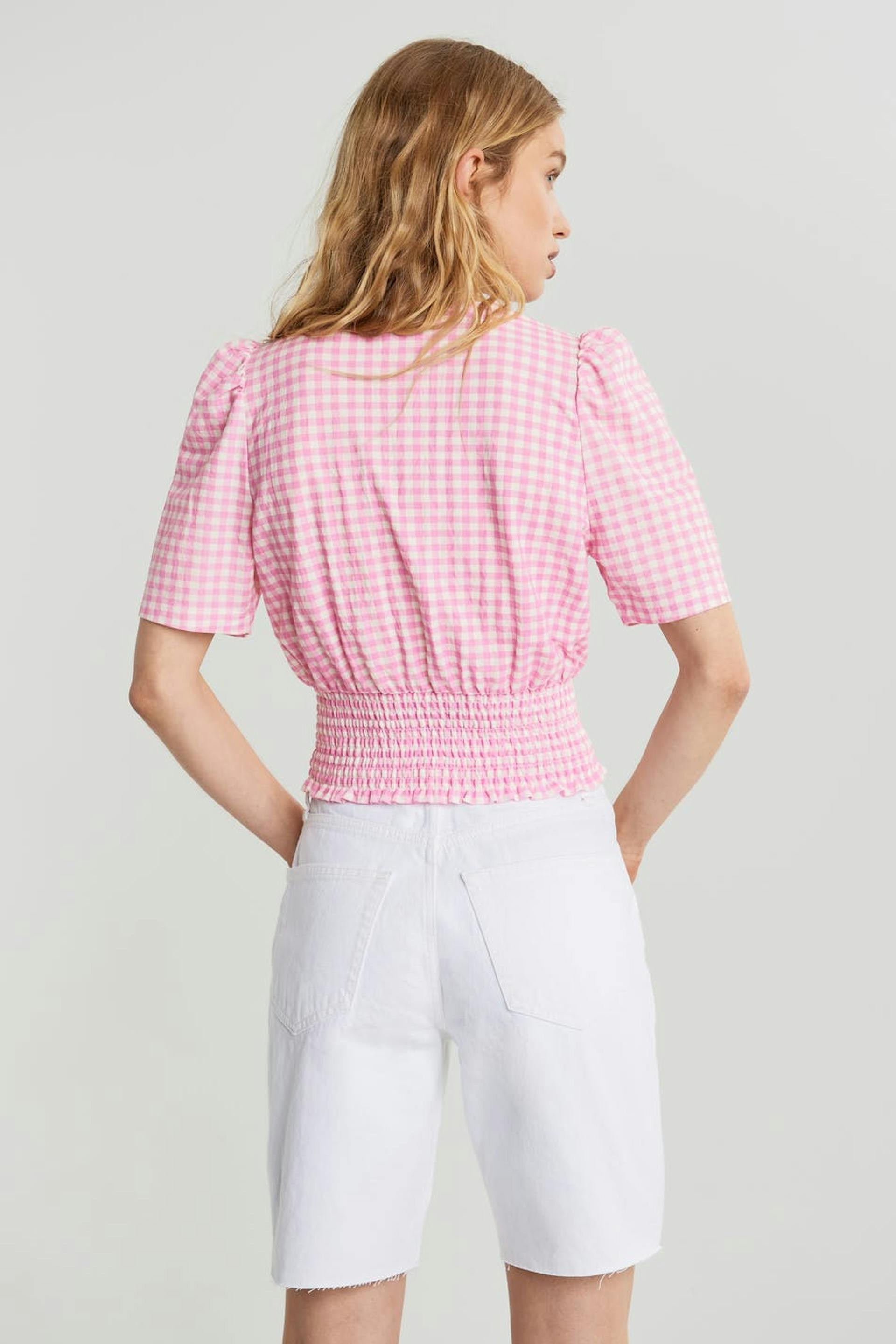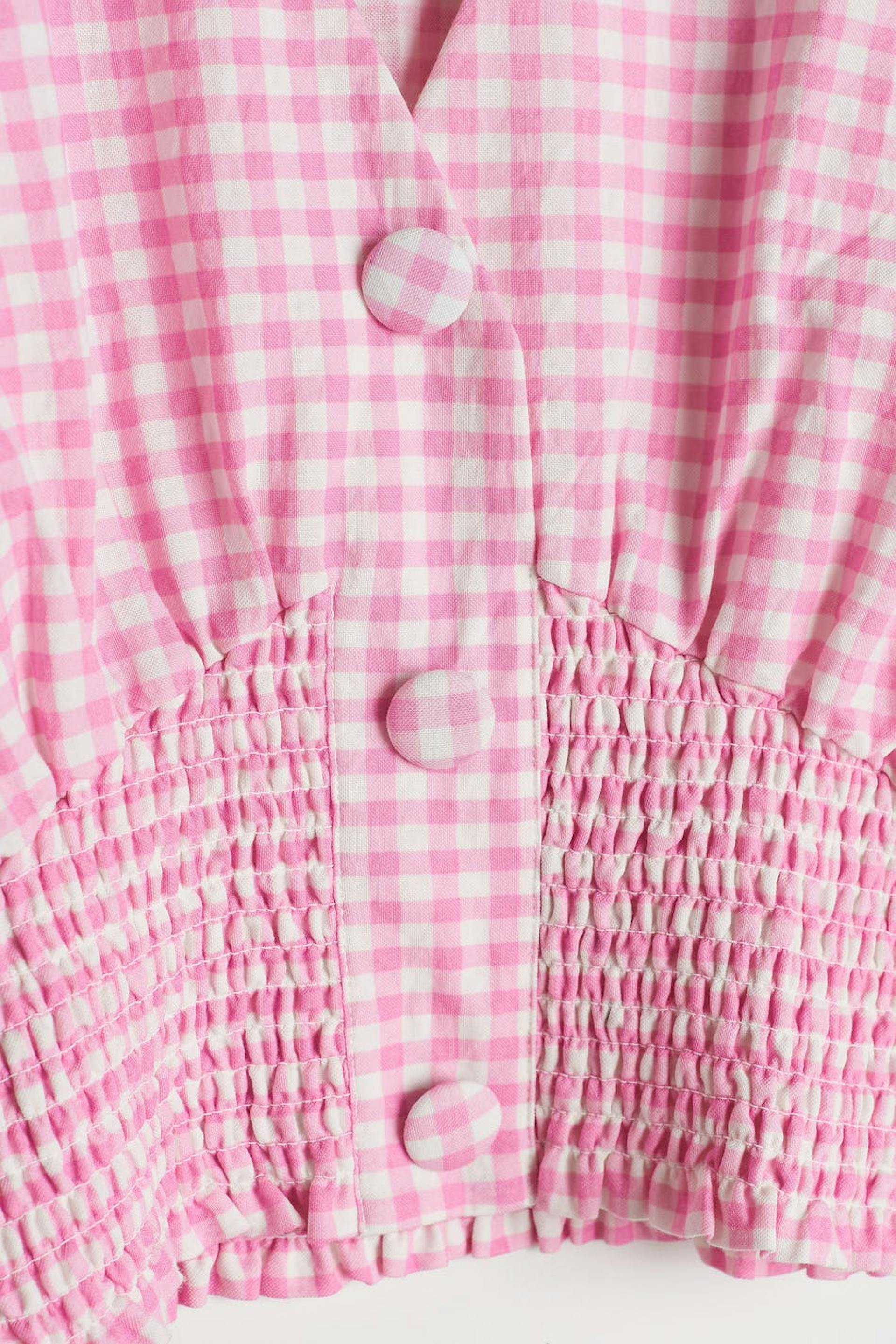 Checked top with short sleeves with defined shoulders. The top is pink and white and has a V-neck. It has fabric covered, big buttons down the front and a smocking at the hem.