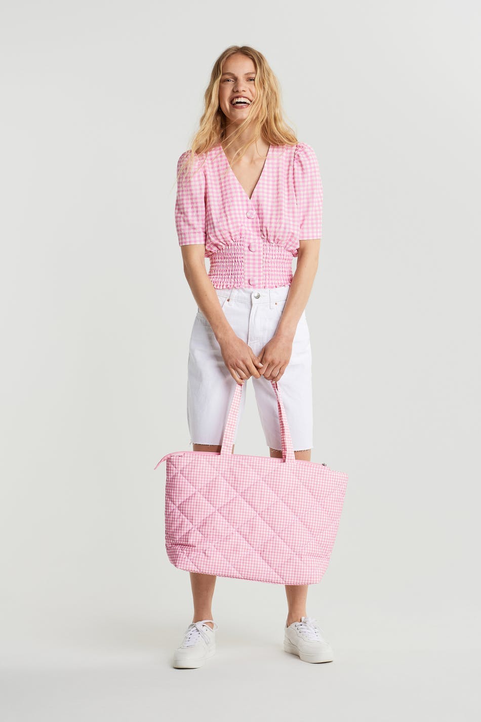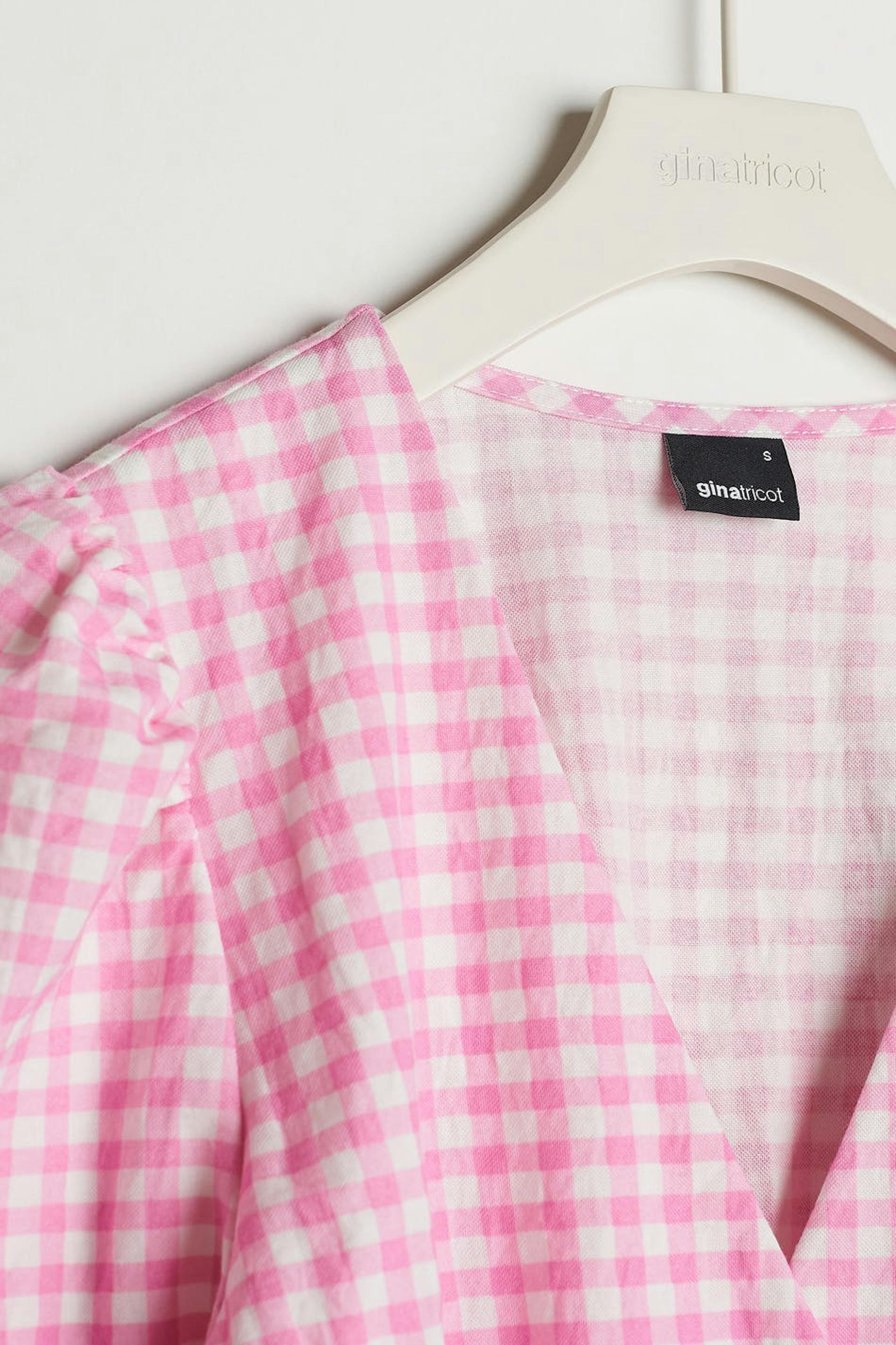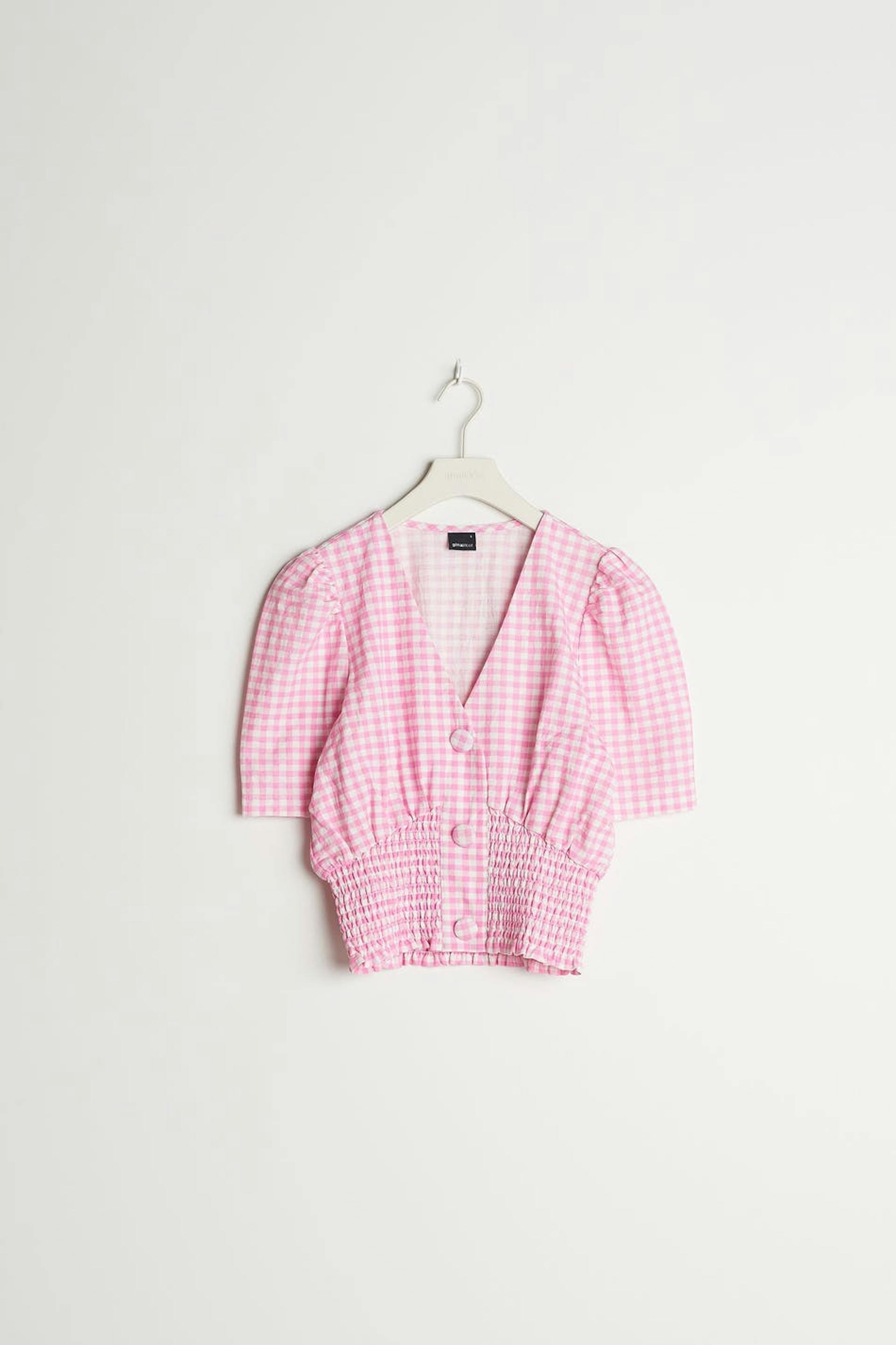 Checked top with short sleeves with defined shoulders. The top is pink and white and has a V-neck. It has fabric covered, big buttons down the front and a smocking at the hem.