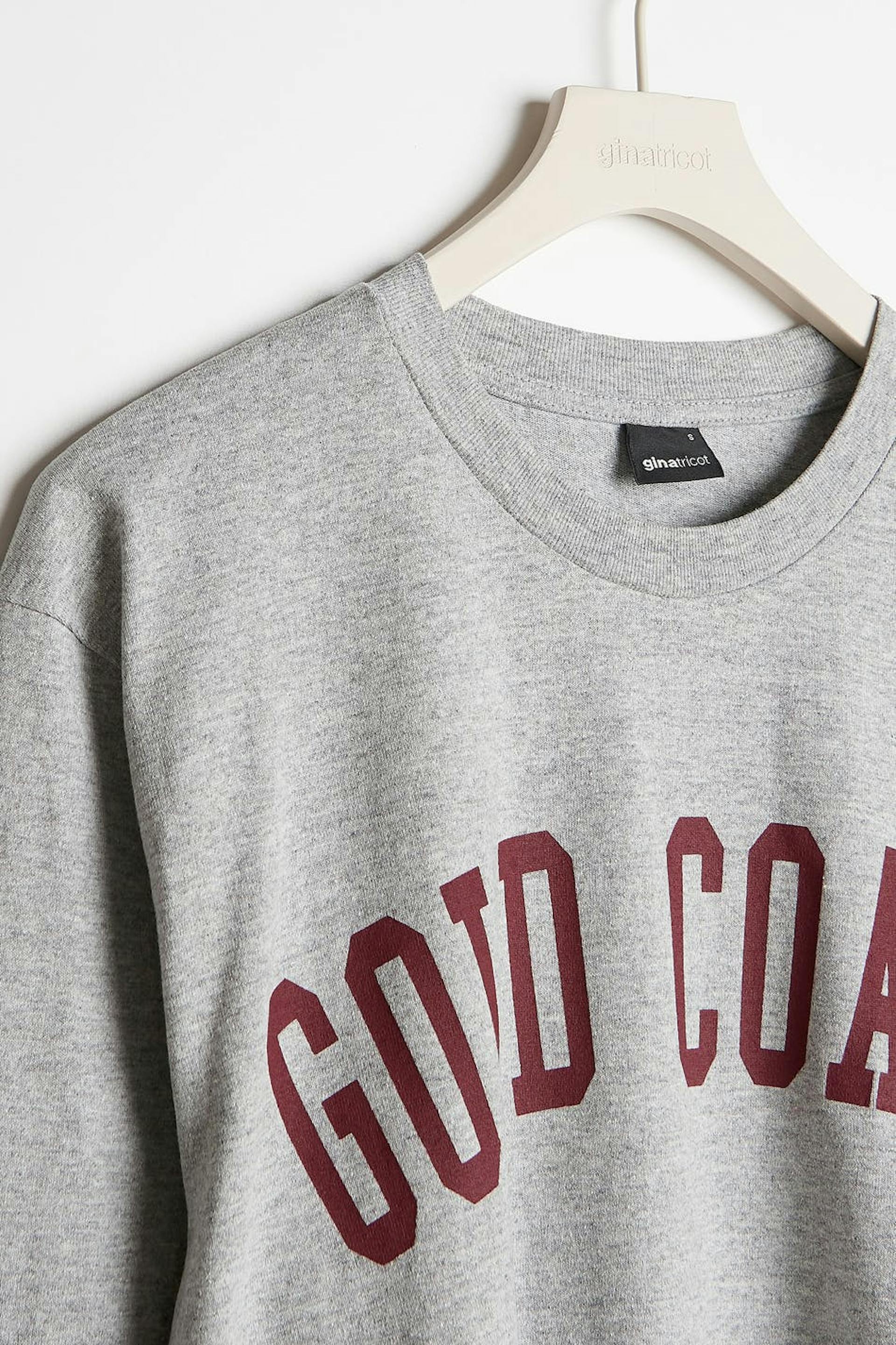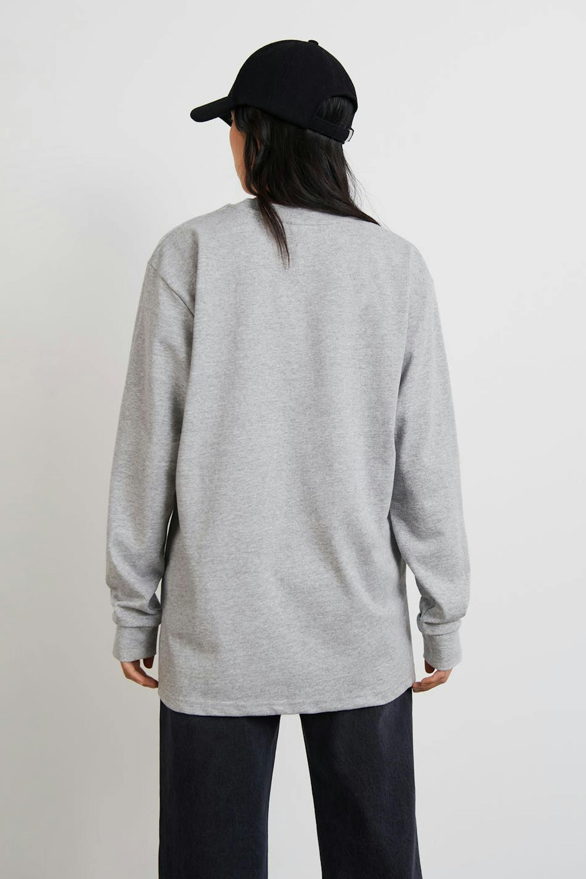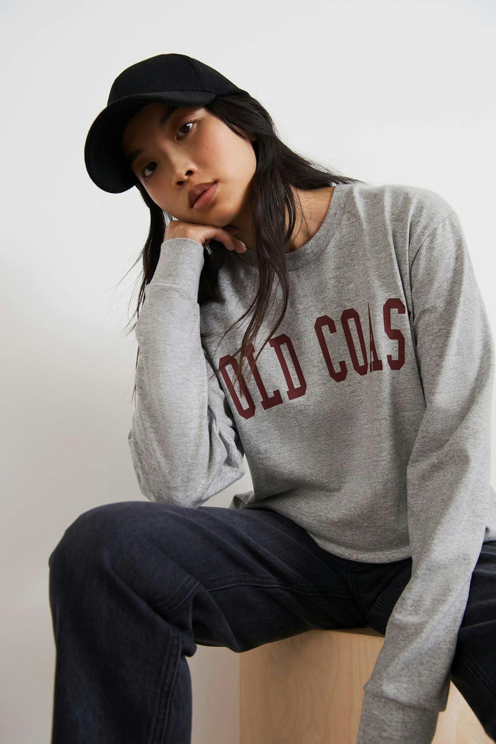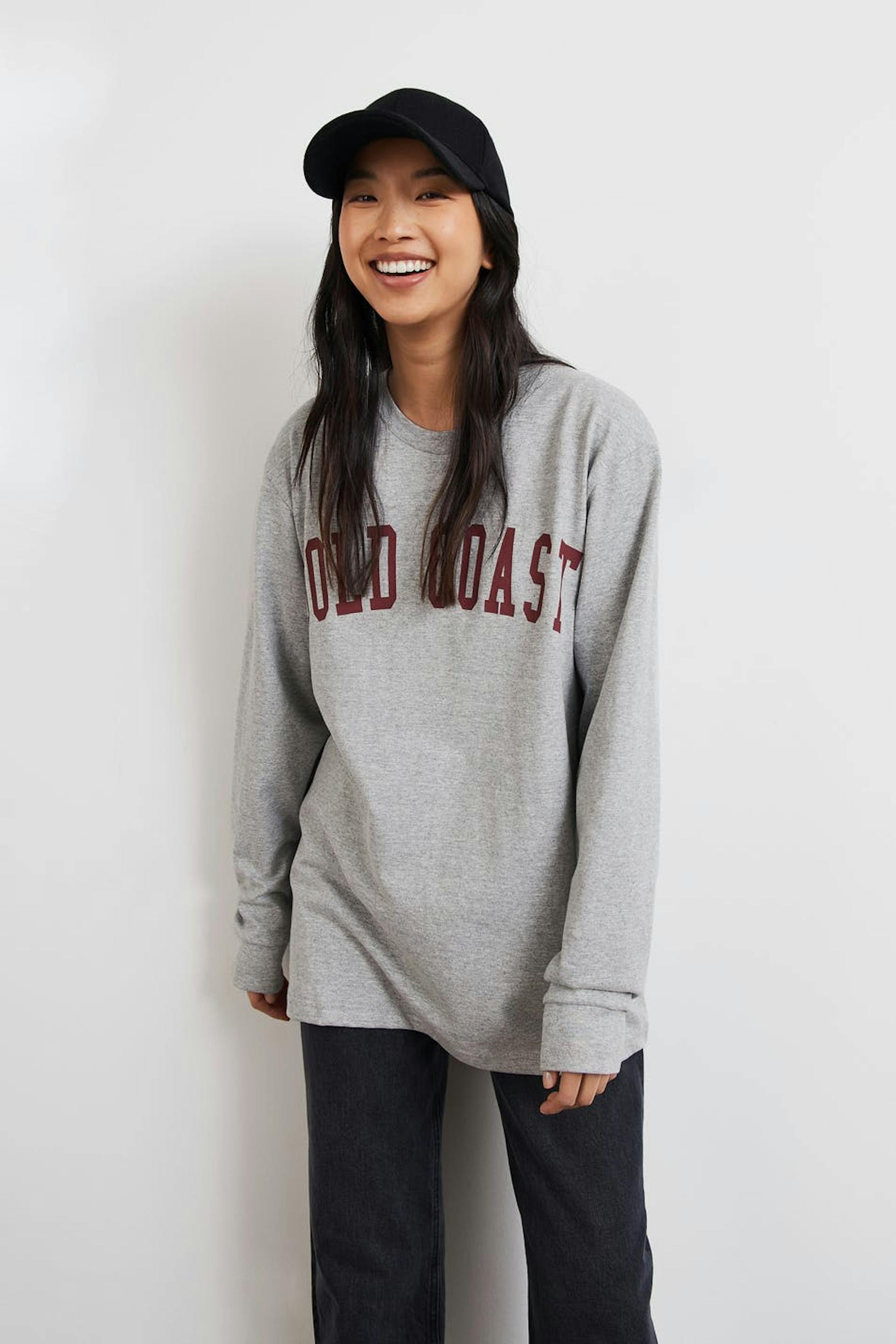 Long-sleeved t-shirt with an oversize fit. The t-shirt is grey and has a print at the front. It has a crew neckline and a soft material in cotton.