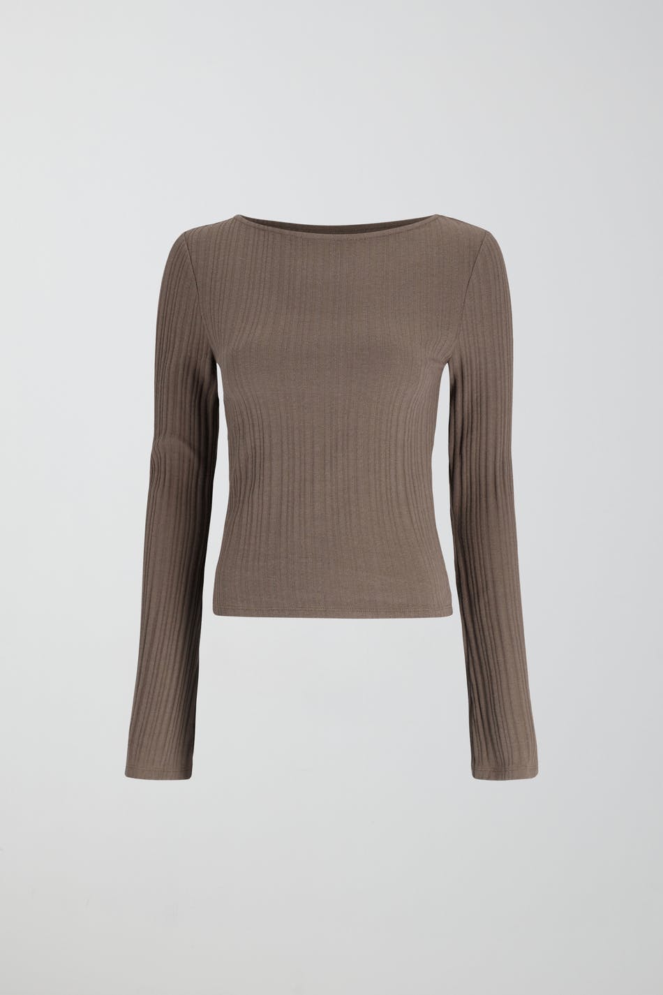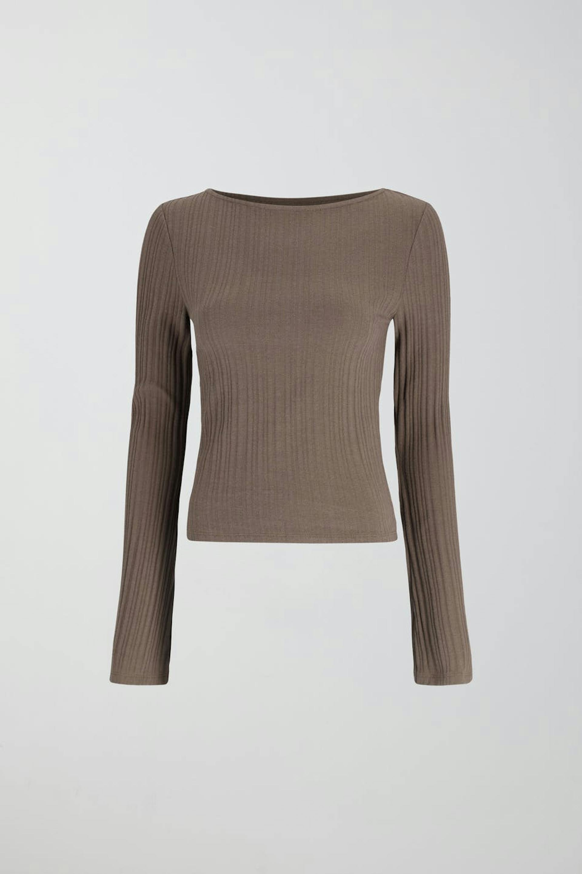Ribbed top with boat neck. The top is beige and has lantern sleeves. It has fitted fit and a soft quality in jersey.
