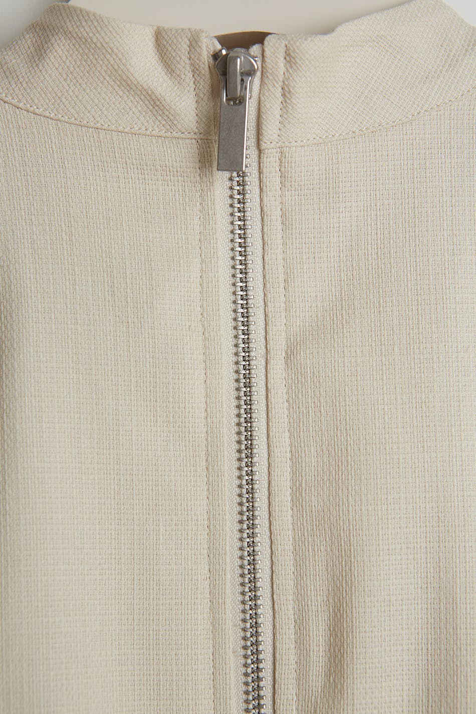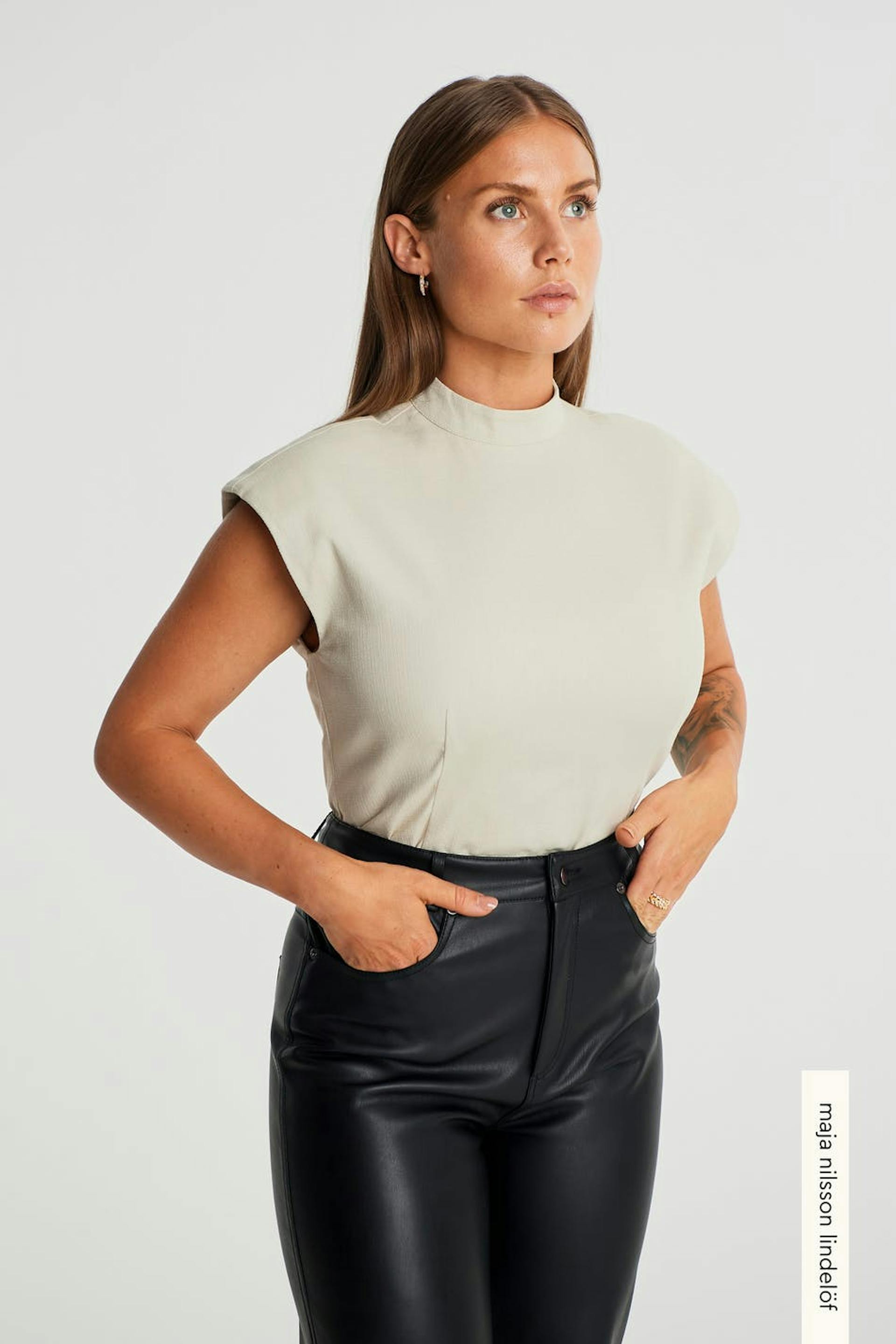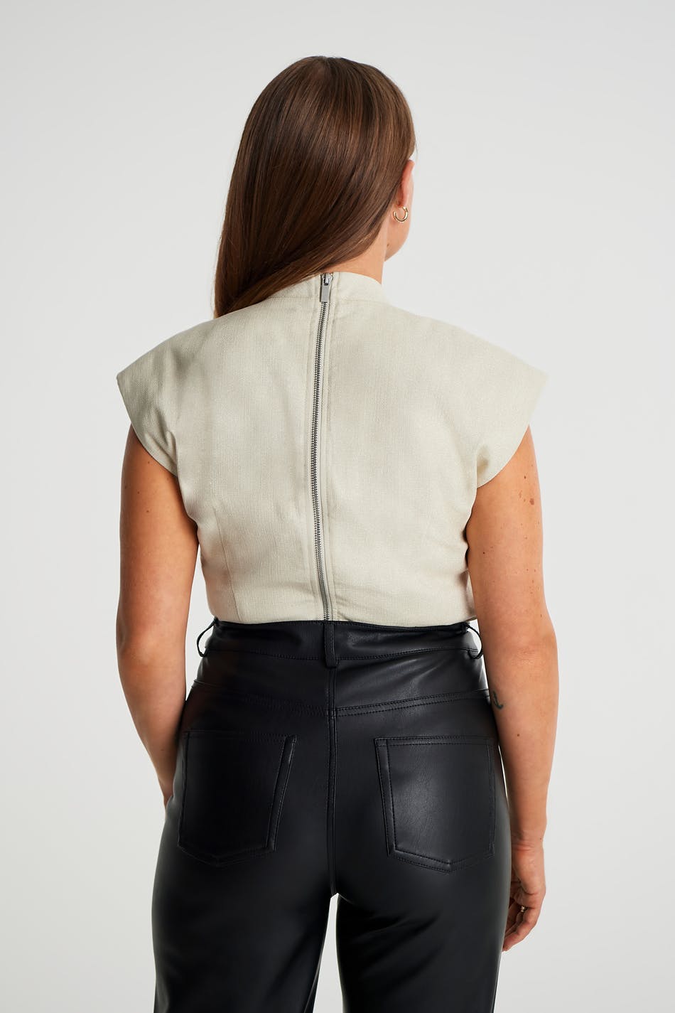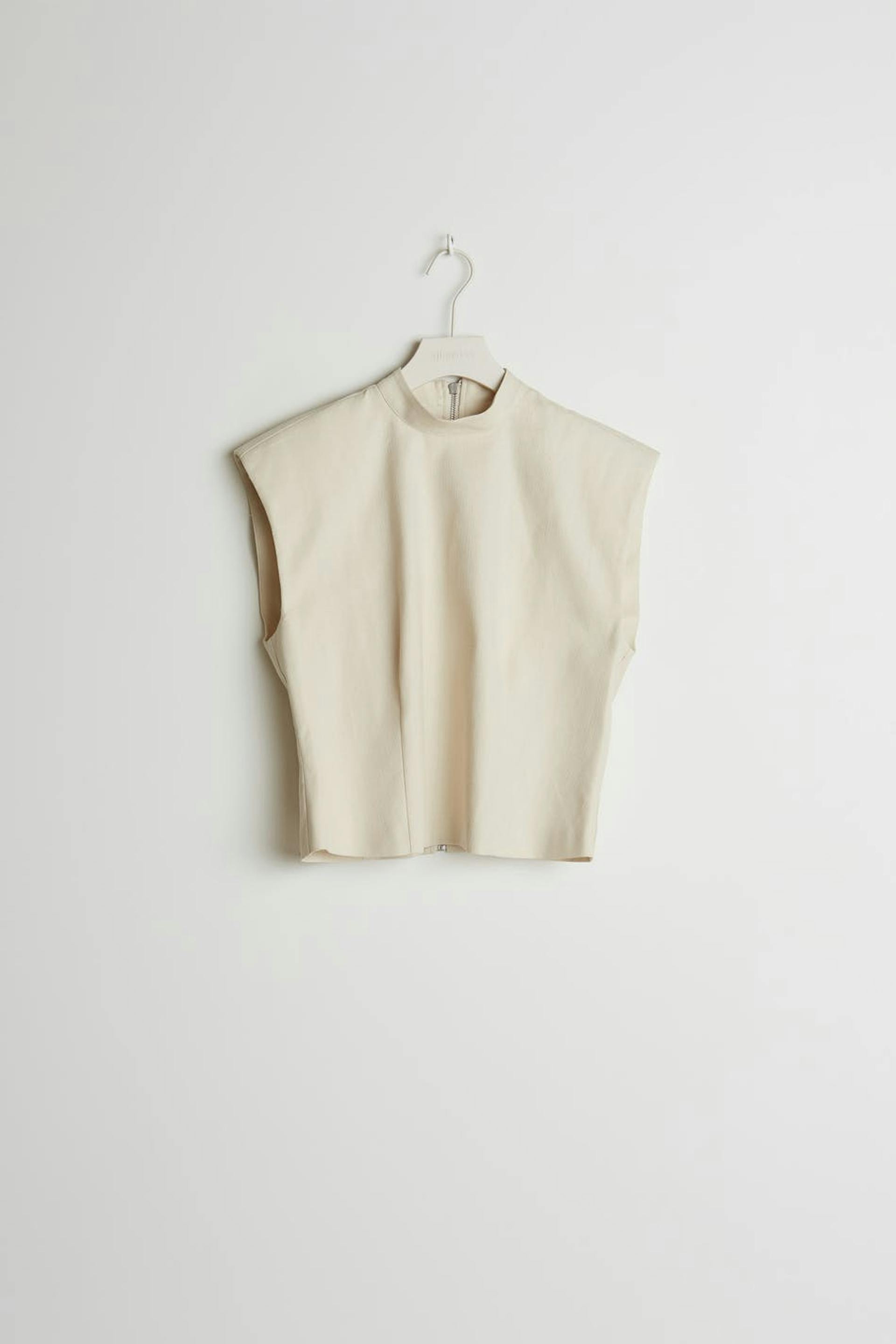Maja X Gina tricot. Sleeveless top with padded shoulders. The top is beige and has a zip in the back.