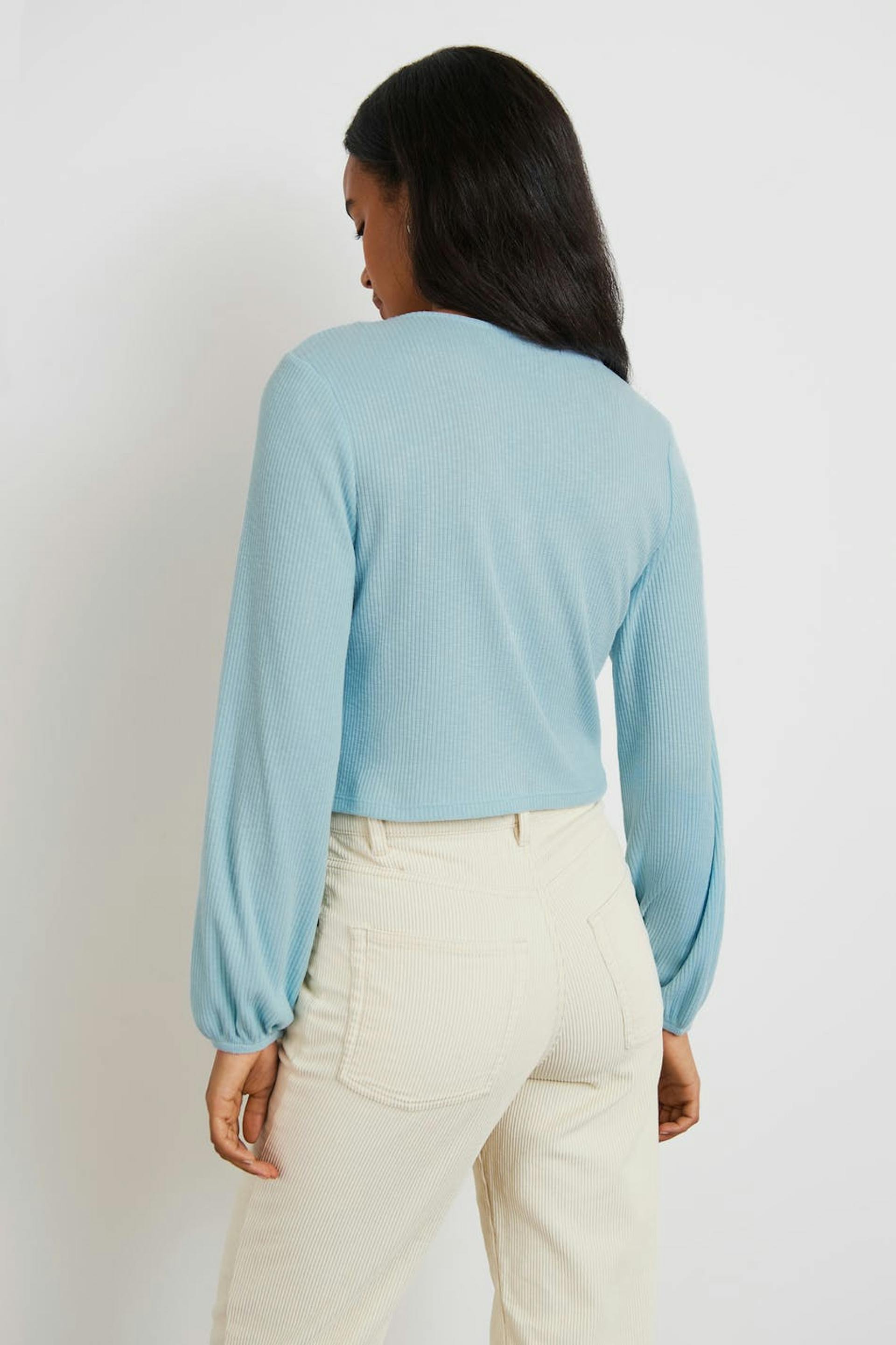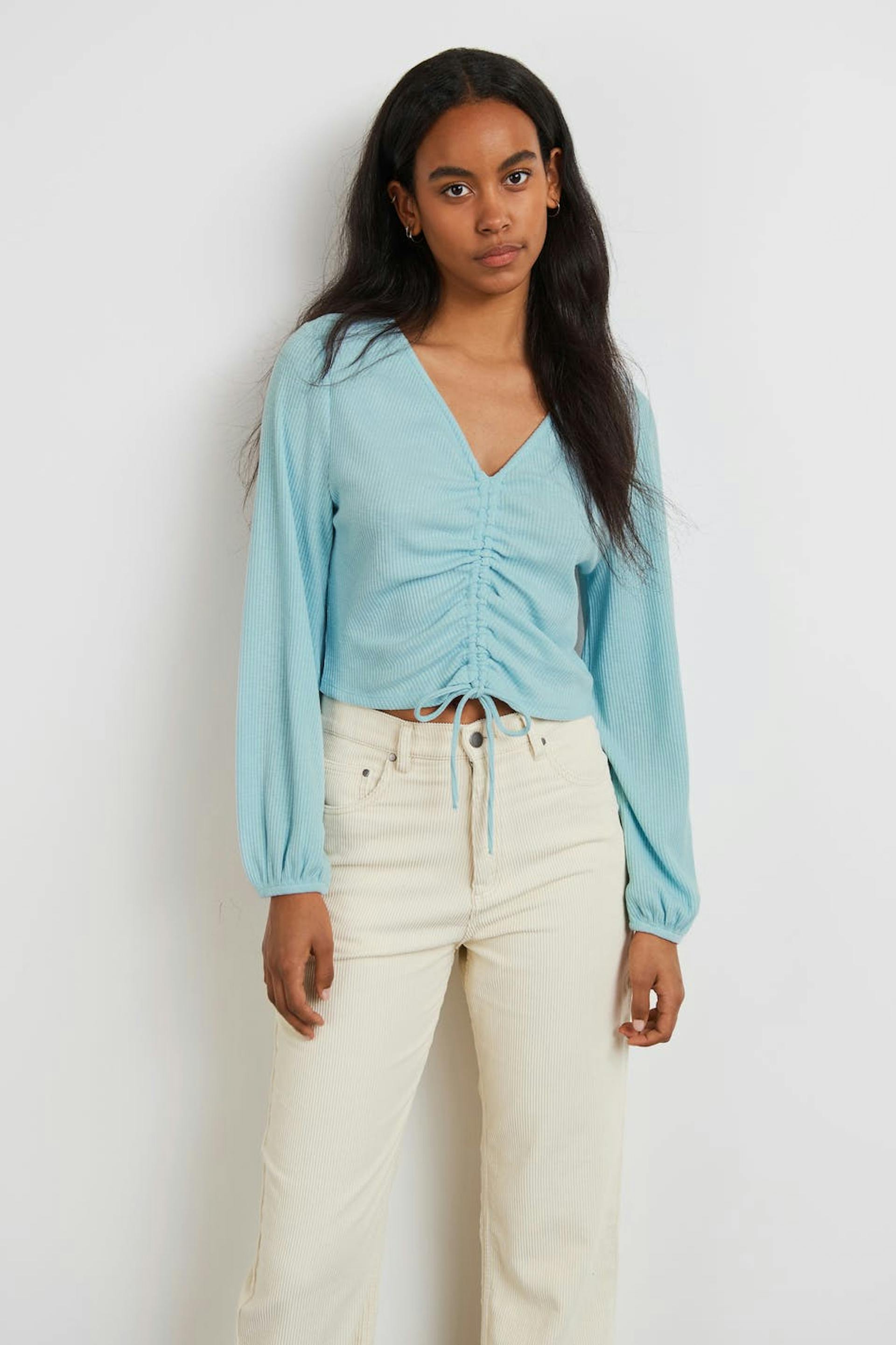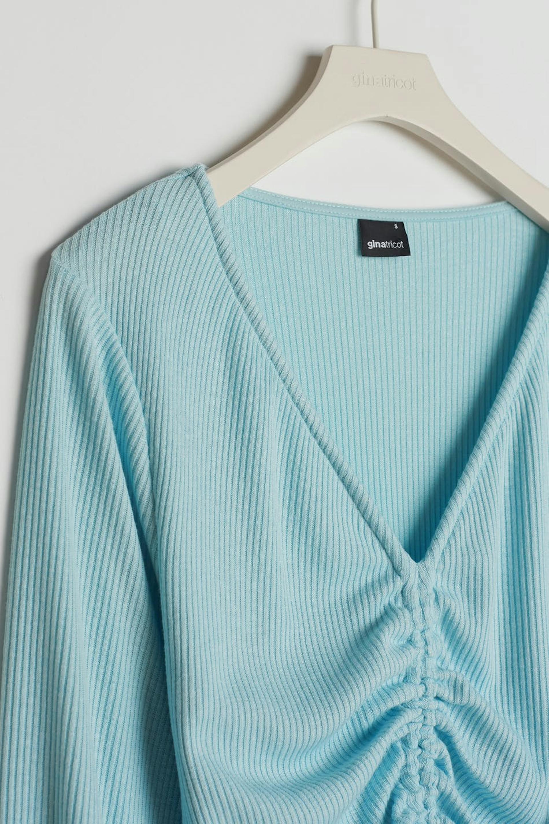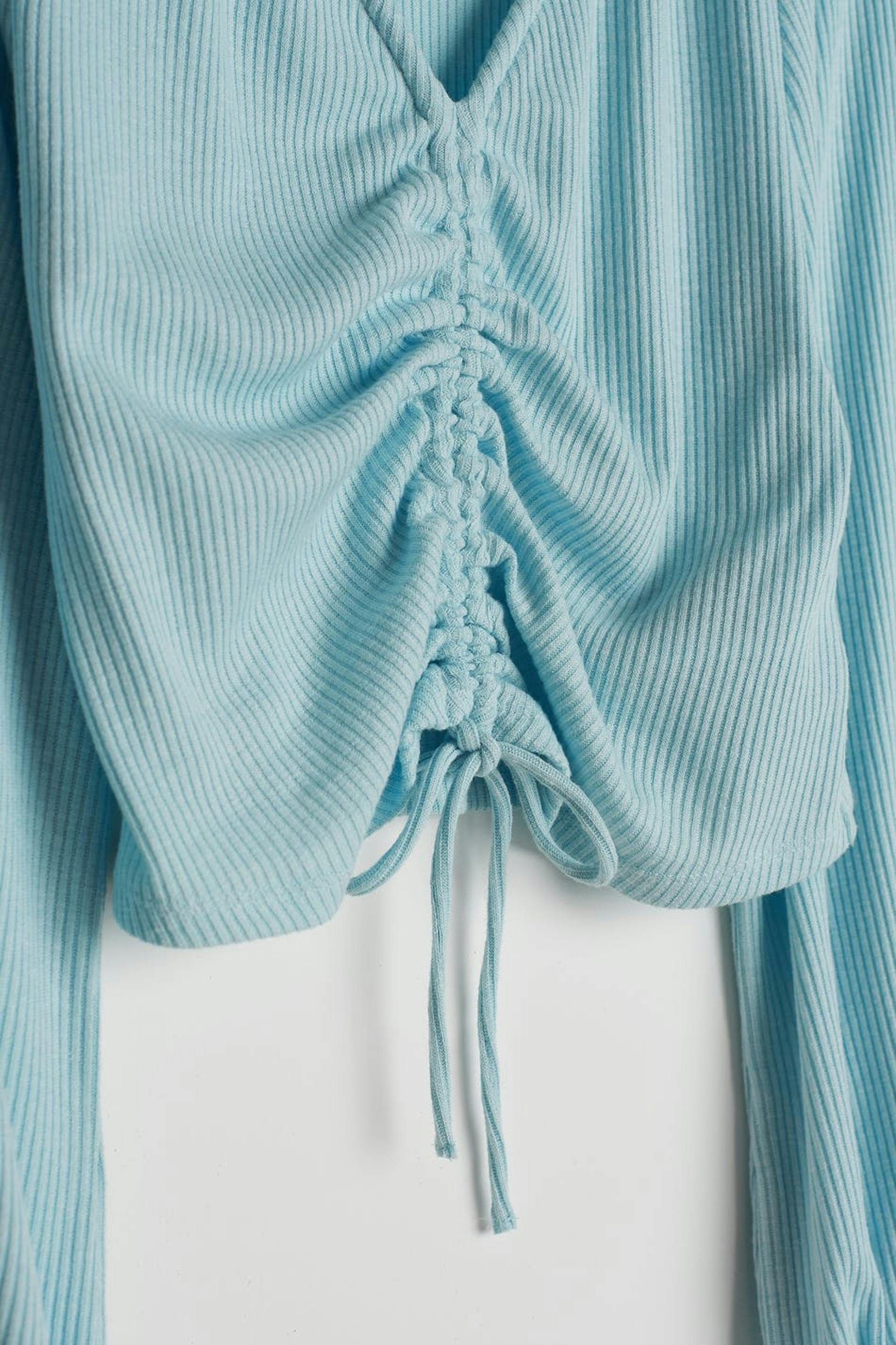 Ribbed top with an oversize fit. The top is blue, long-sleeved and cropped. It has a plunge neckline, gathered details at the front and an adjustable drawstring with a self-tie at the bottom hem.