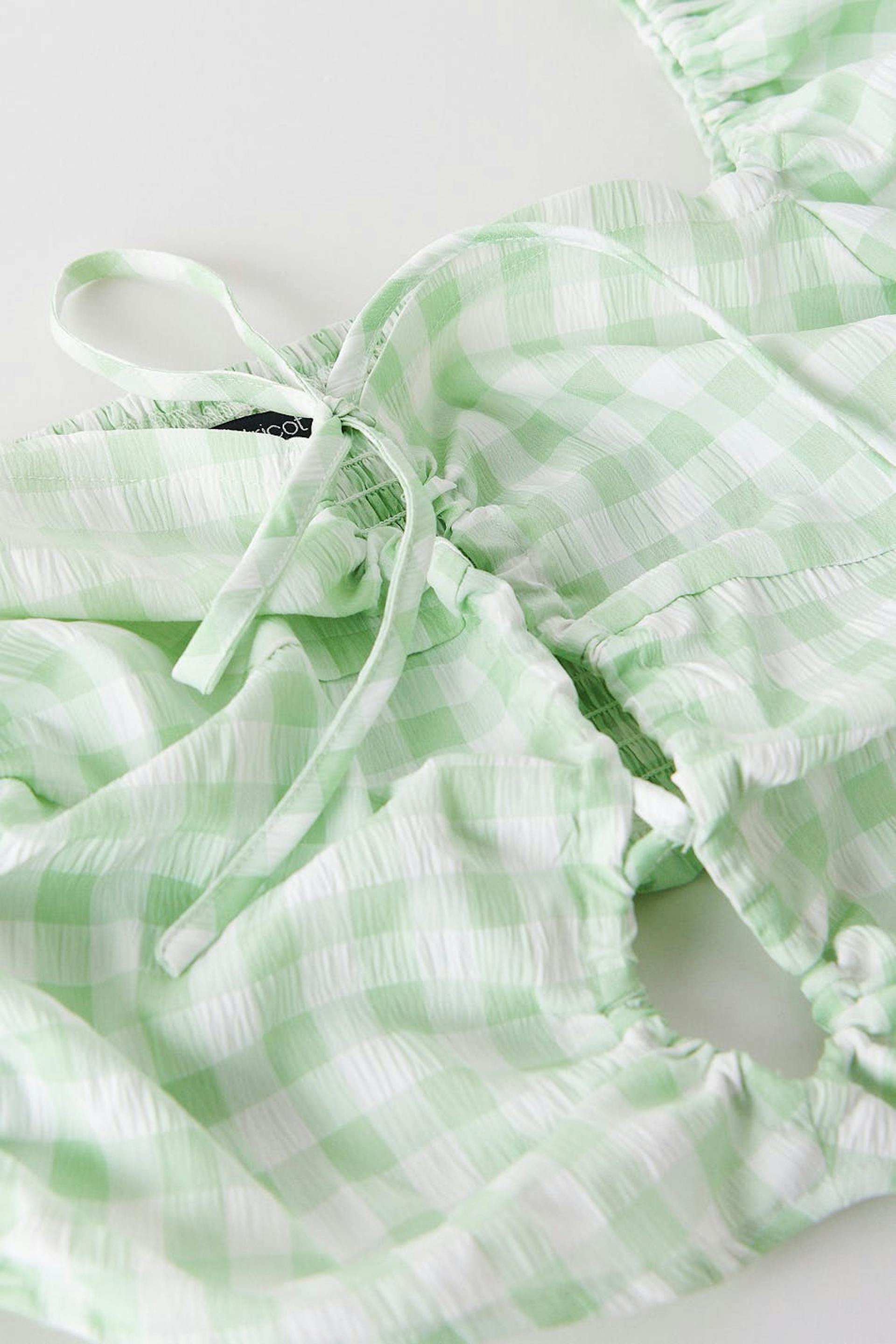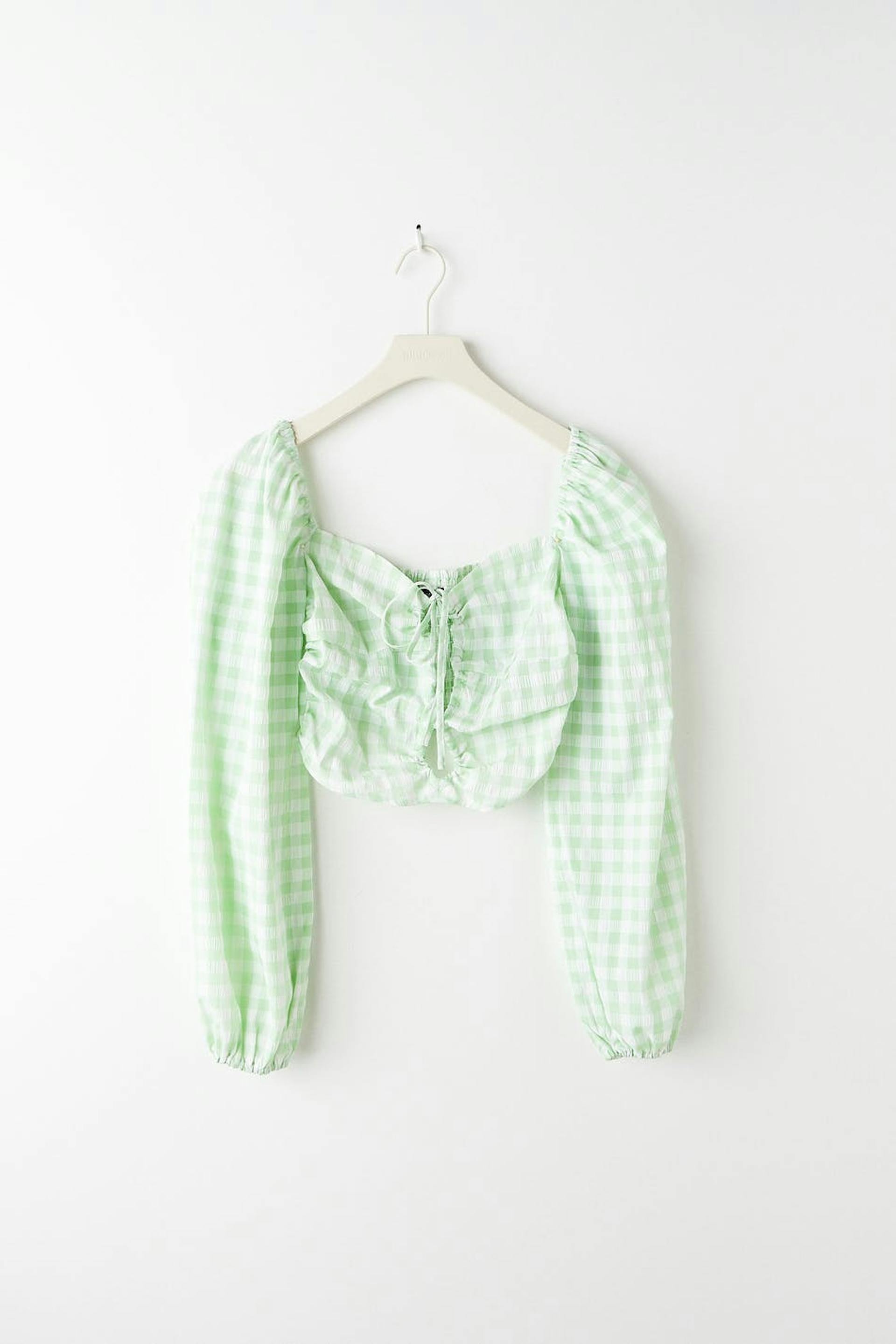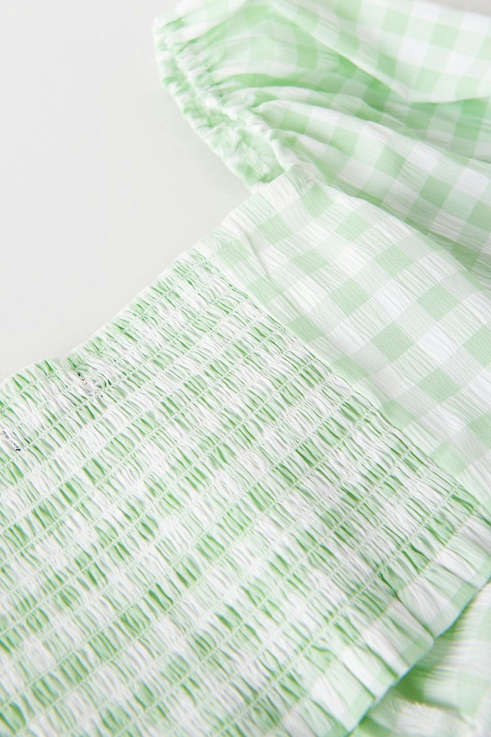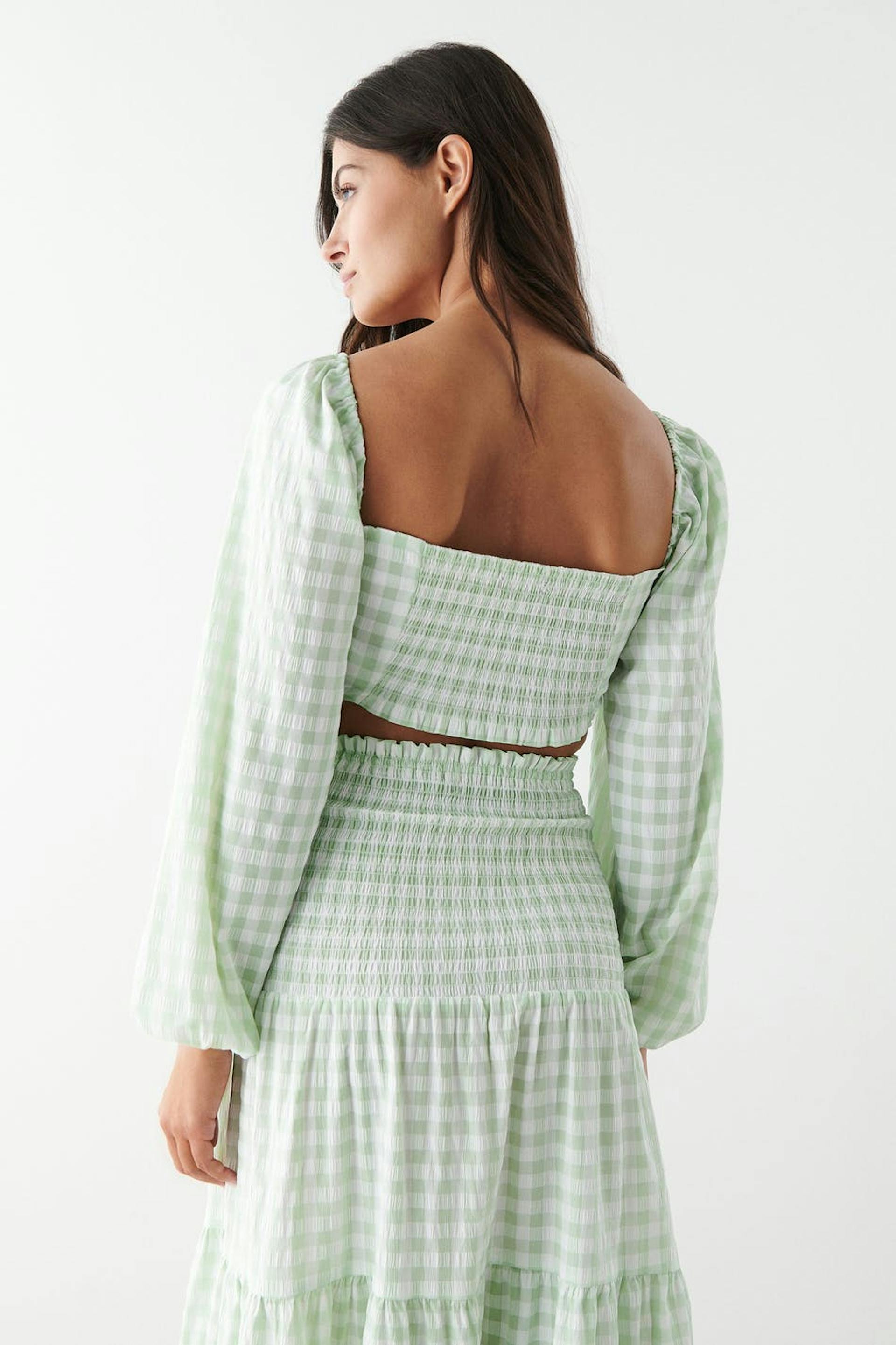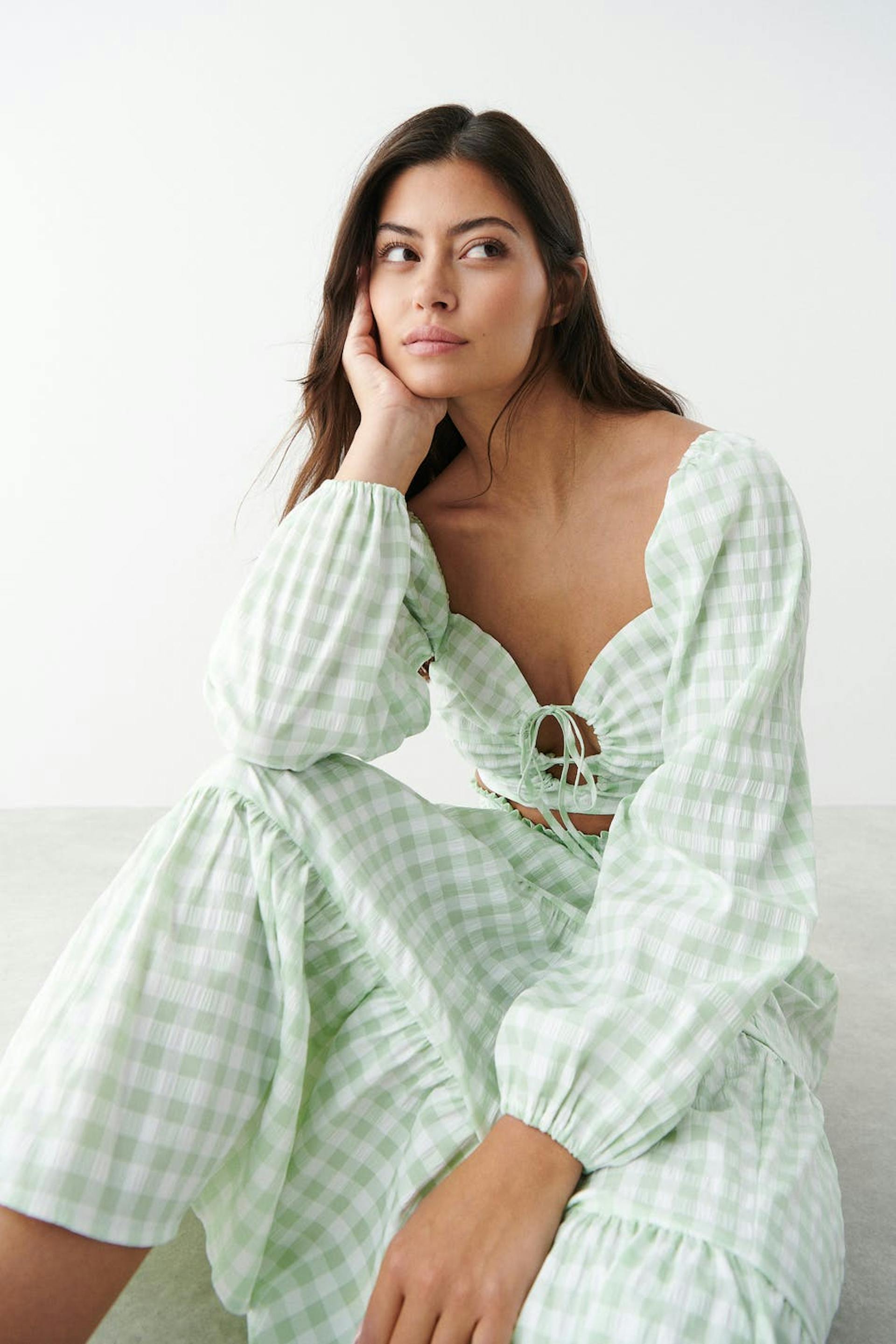 Checked crop top with long bubble sleeves. The top is green and has a knot detail at the front. It has a smocked backside, cut-out details in front and elastic at the shoulders and on the sleeve ends.