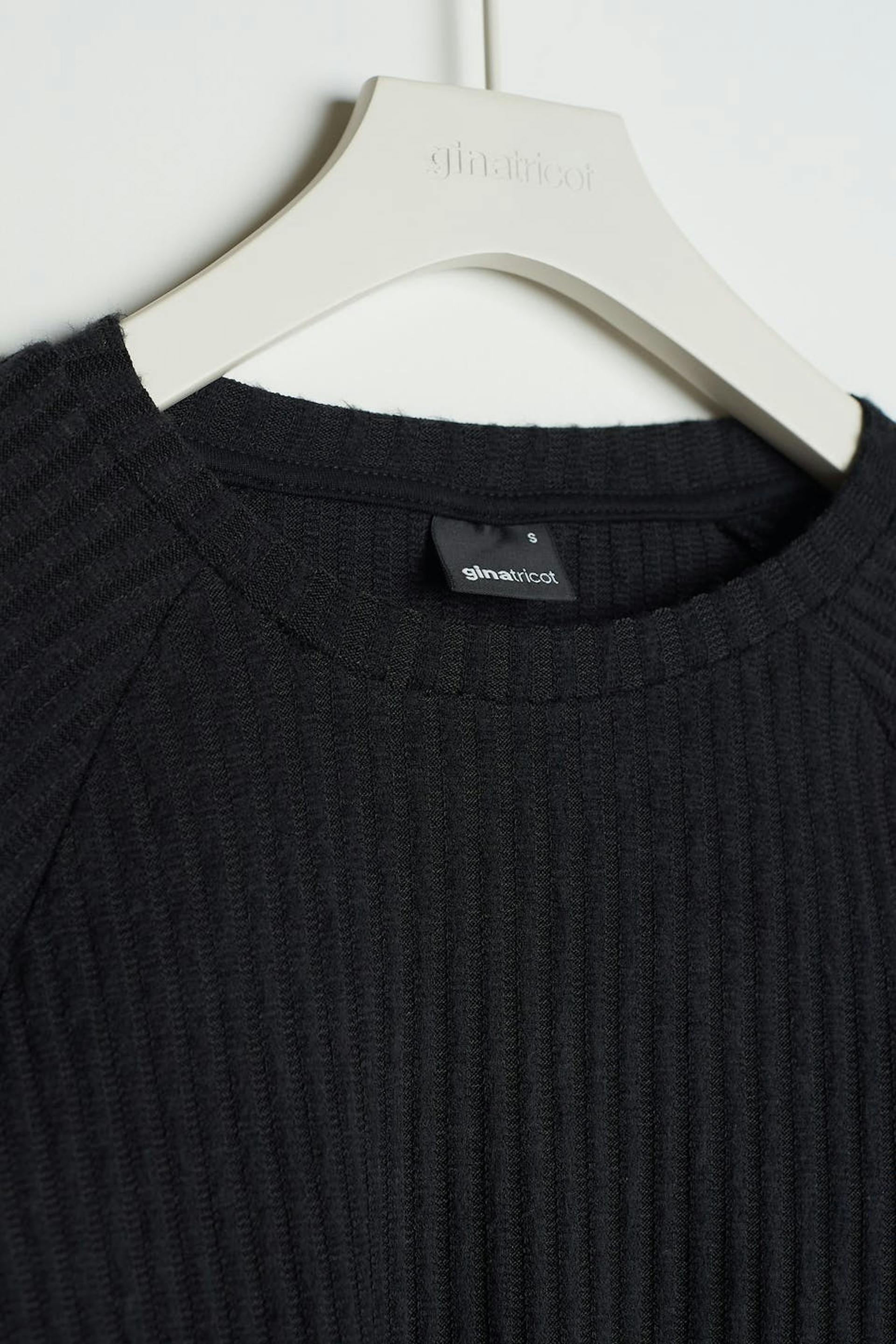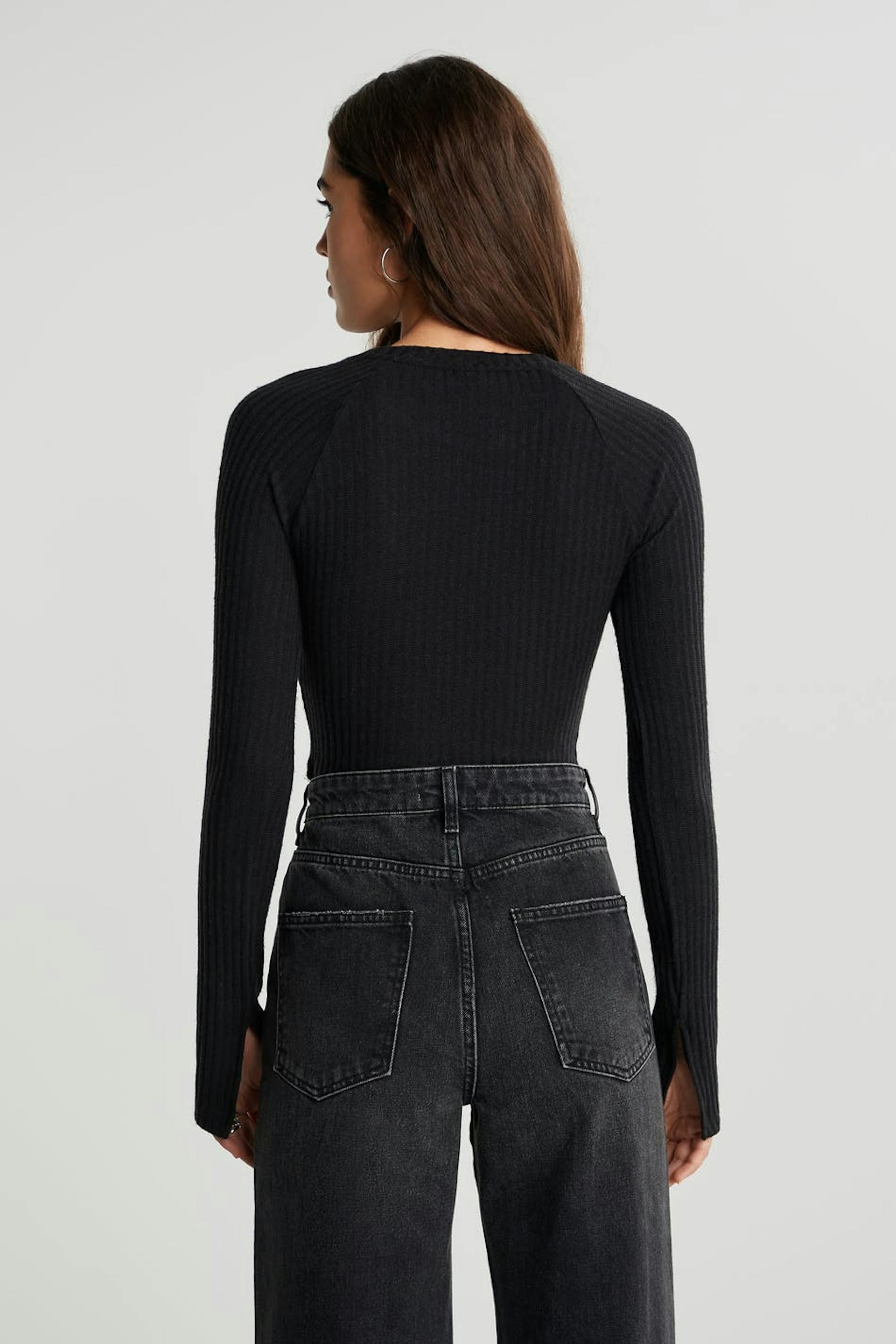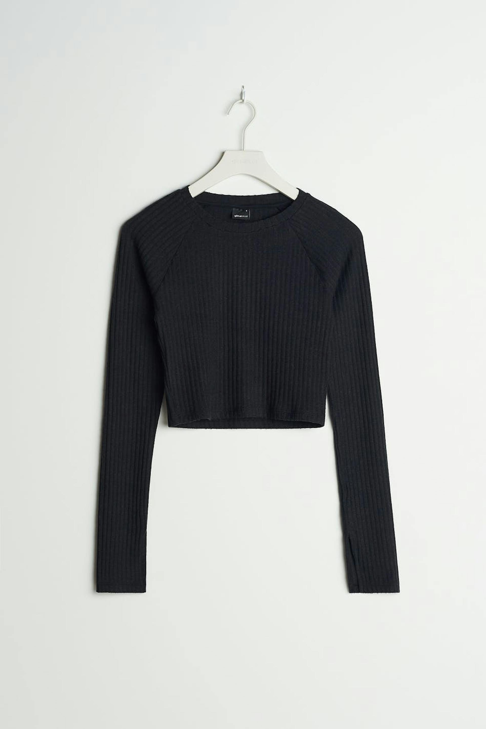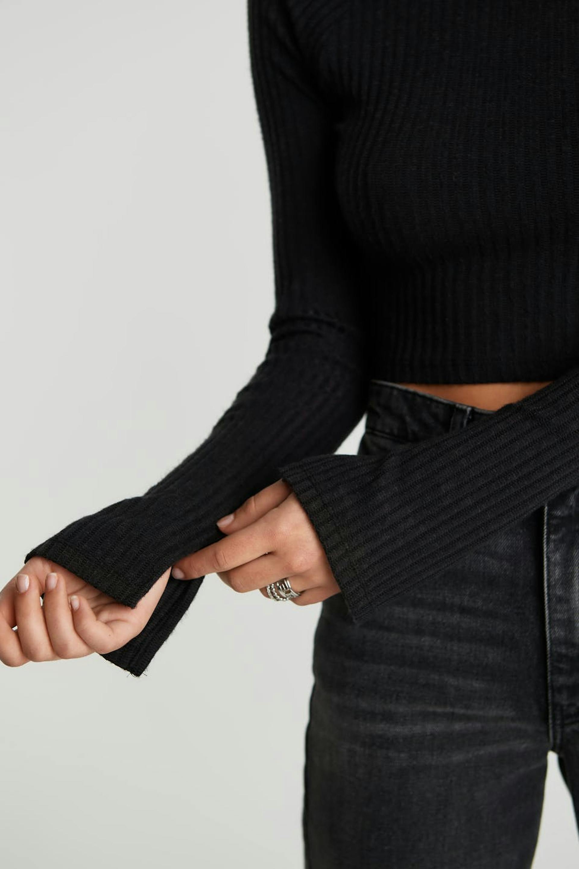 Cropped top with a regular fit. The top is black and has long, gently flared sleeves with a slit on the sleeve ends. It has a ribbed, soft brushed quality.