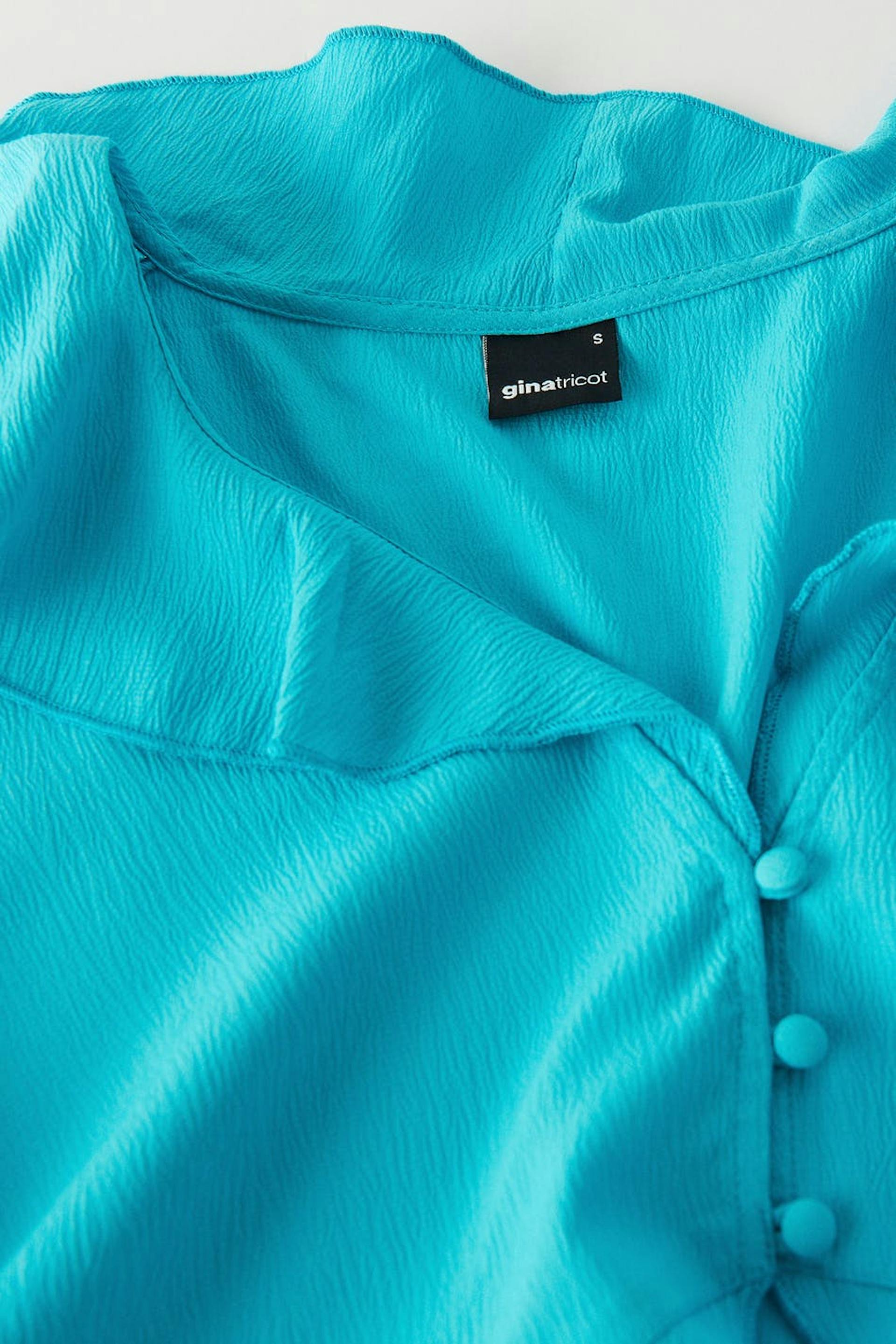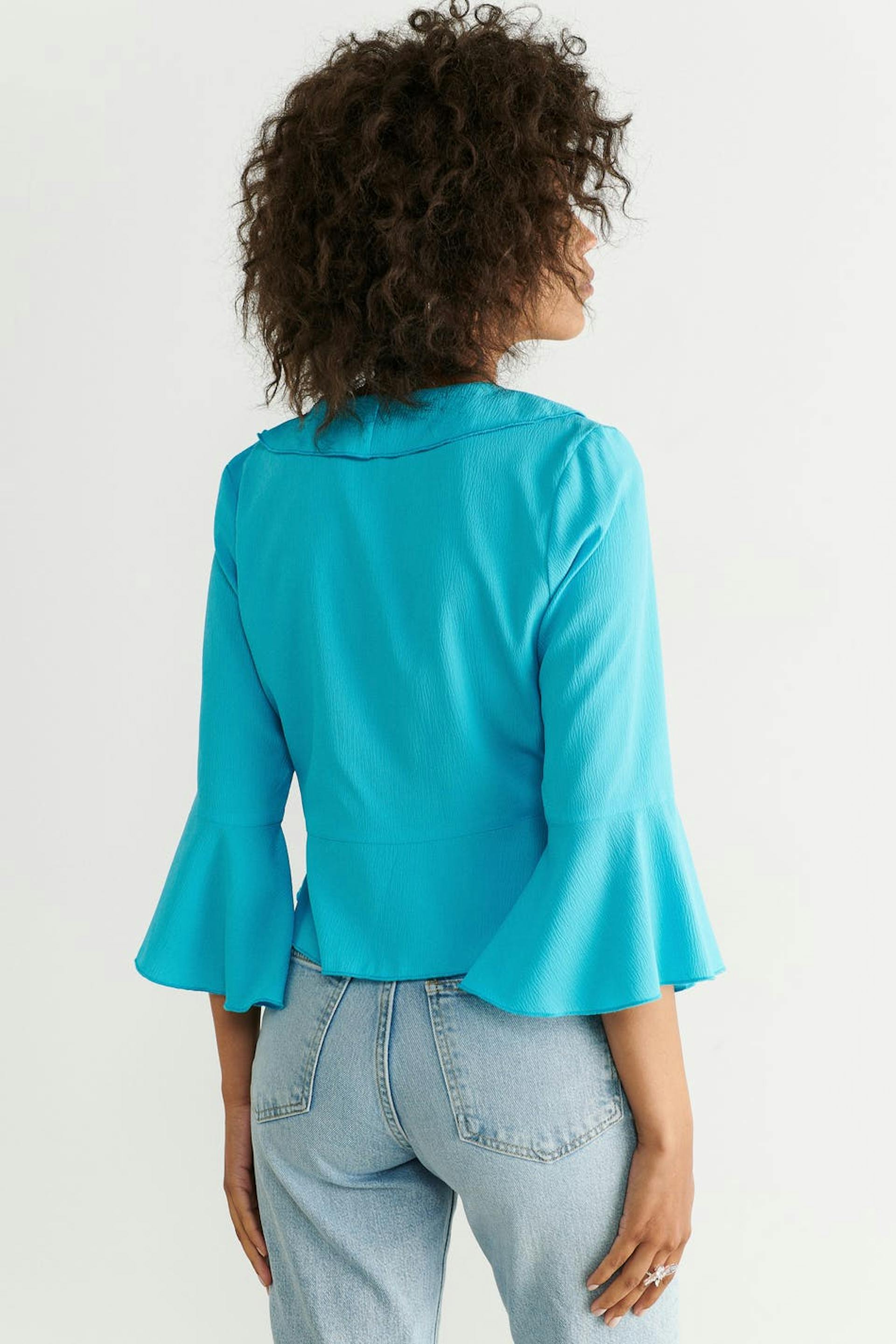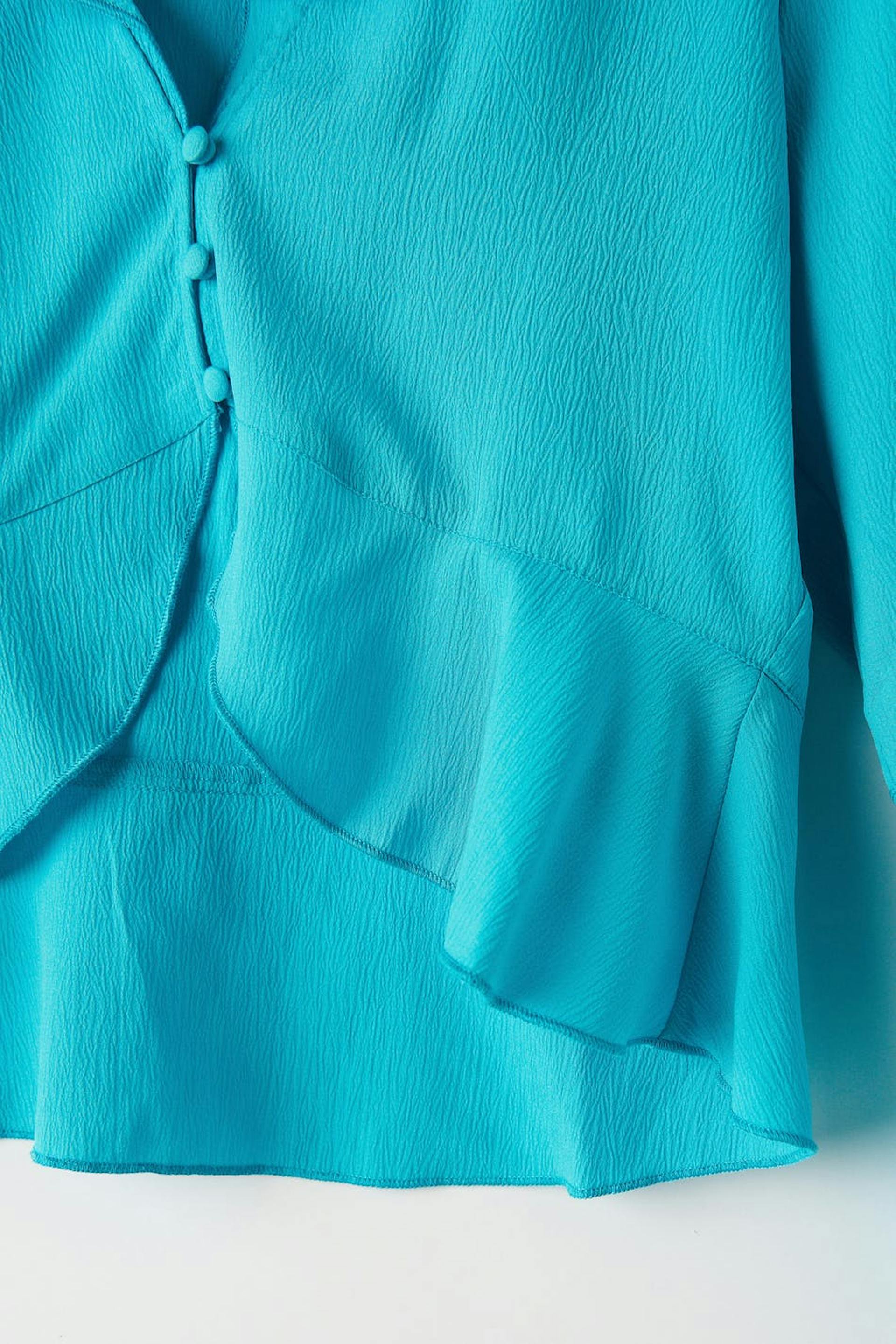 Long-sleeved top with plunge neckline. The top is blue and has a fitted fit. It has three-quarter length sleeves, button closure in front and flounces at the front, at sleeve ends and at the bottom.