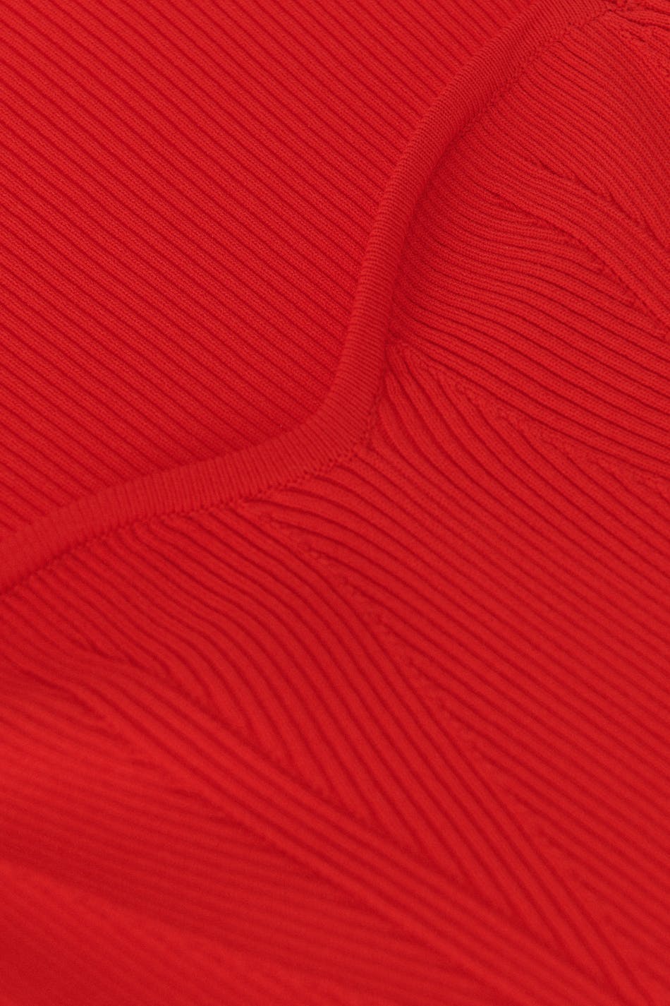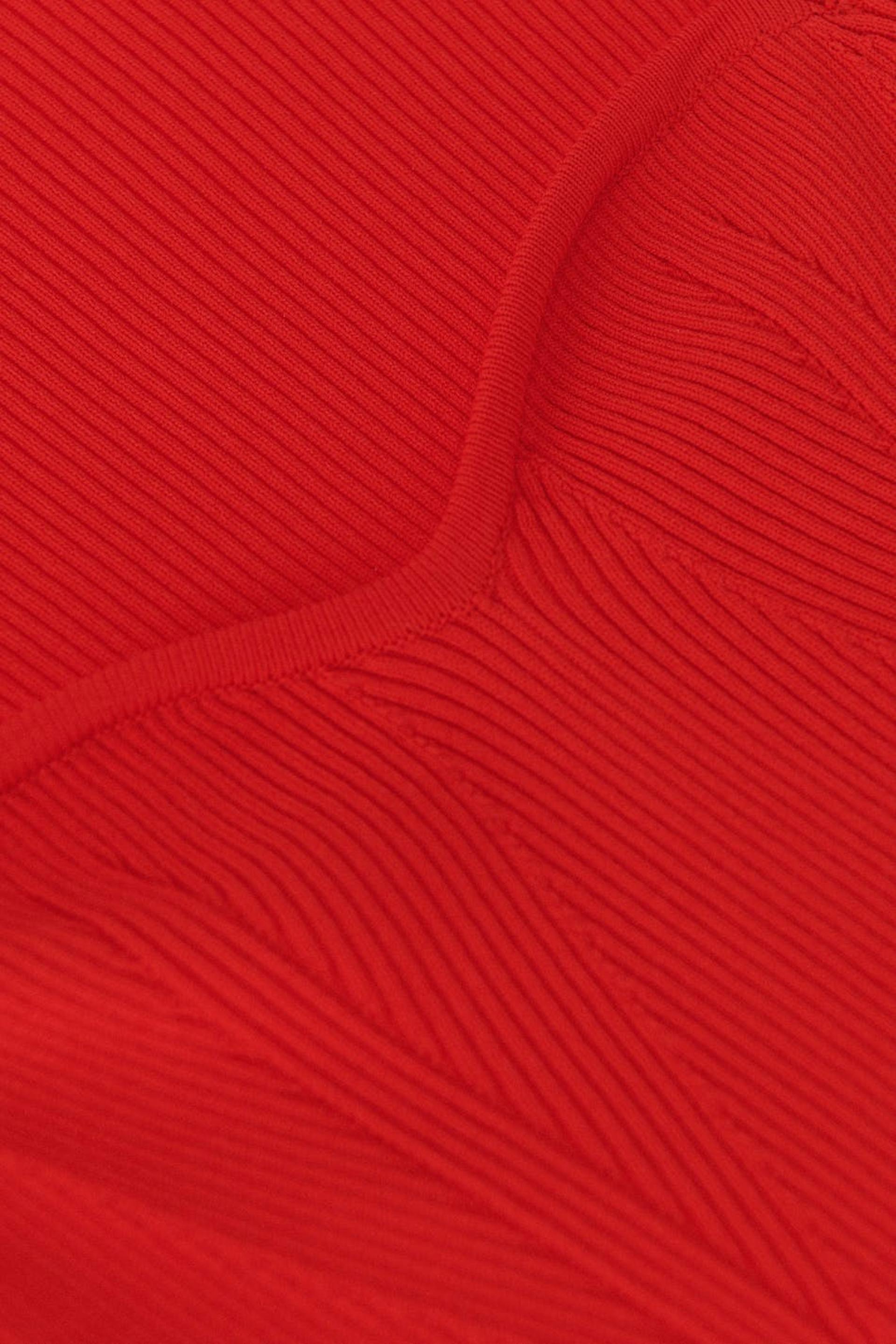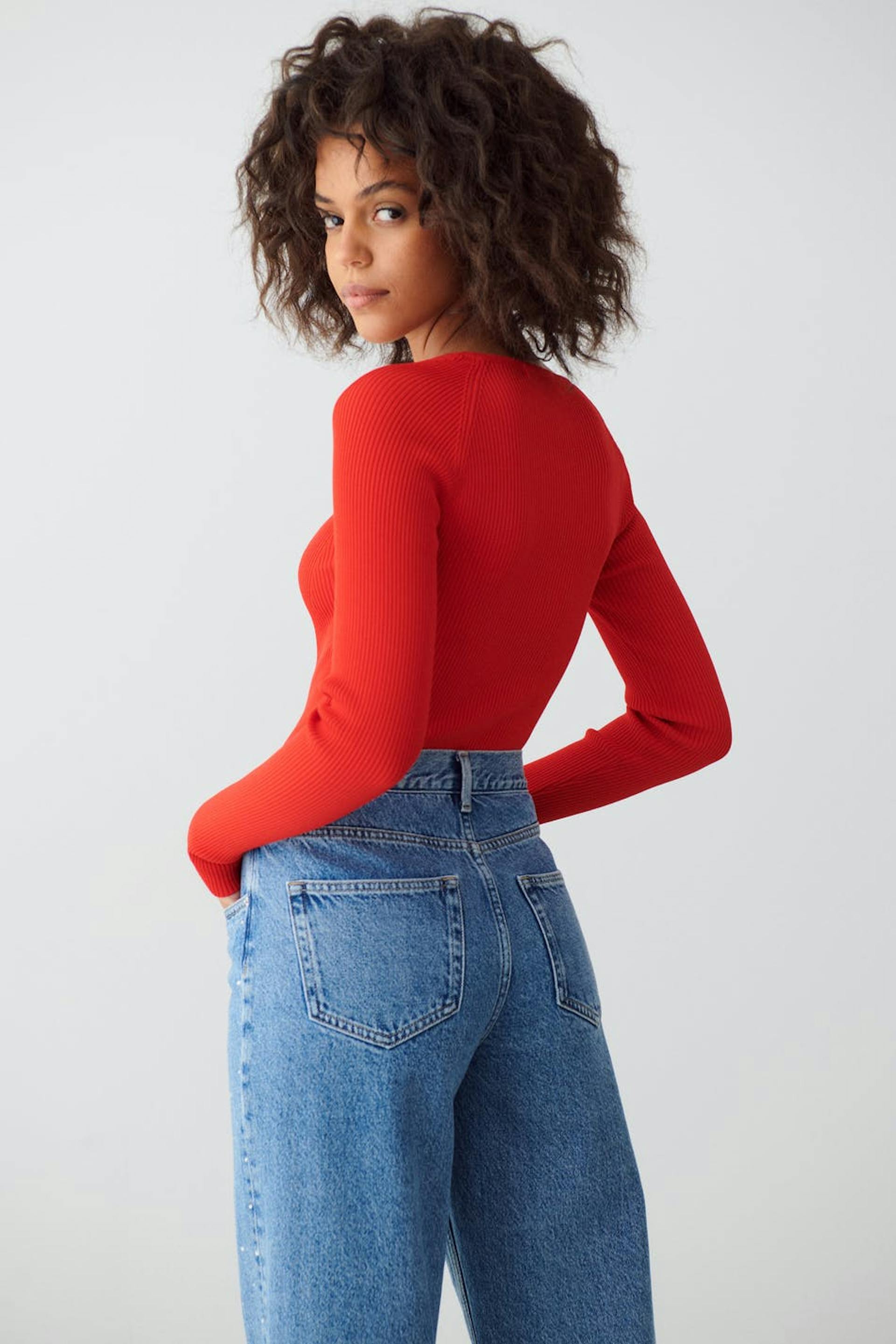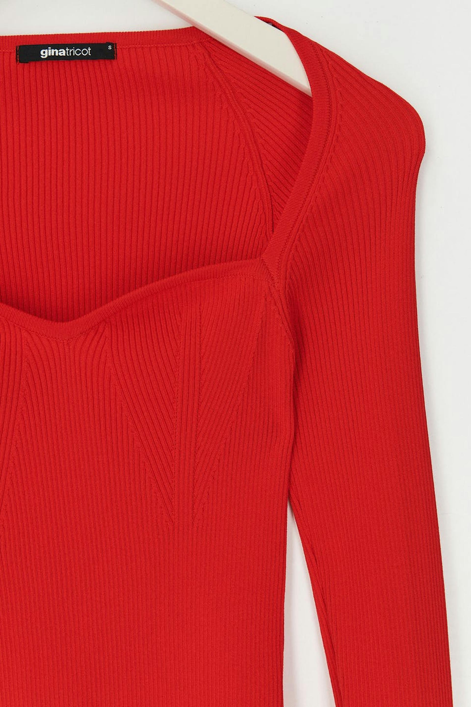 Knitted top with sweetheart neckline. The top is red, long-sleeved and ribbed. It has figure-hugging fit and fully-fashioned sections below the bust.