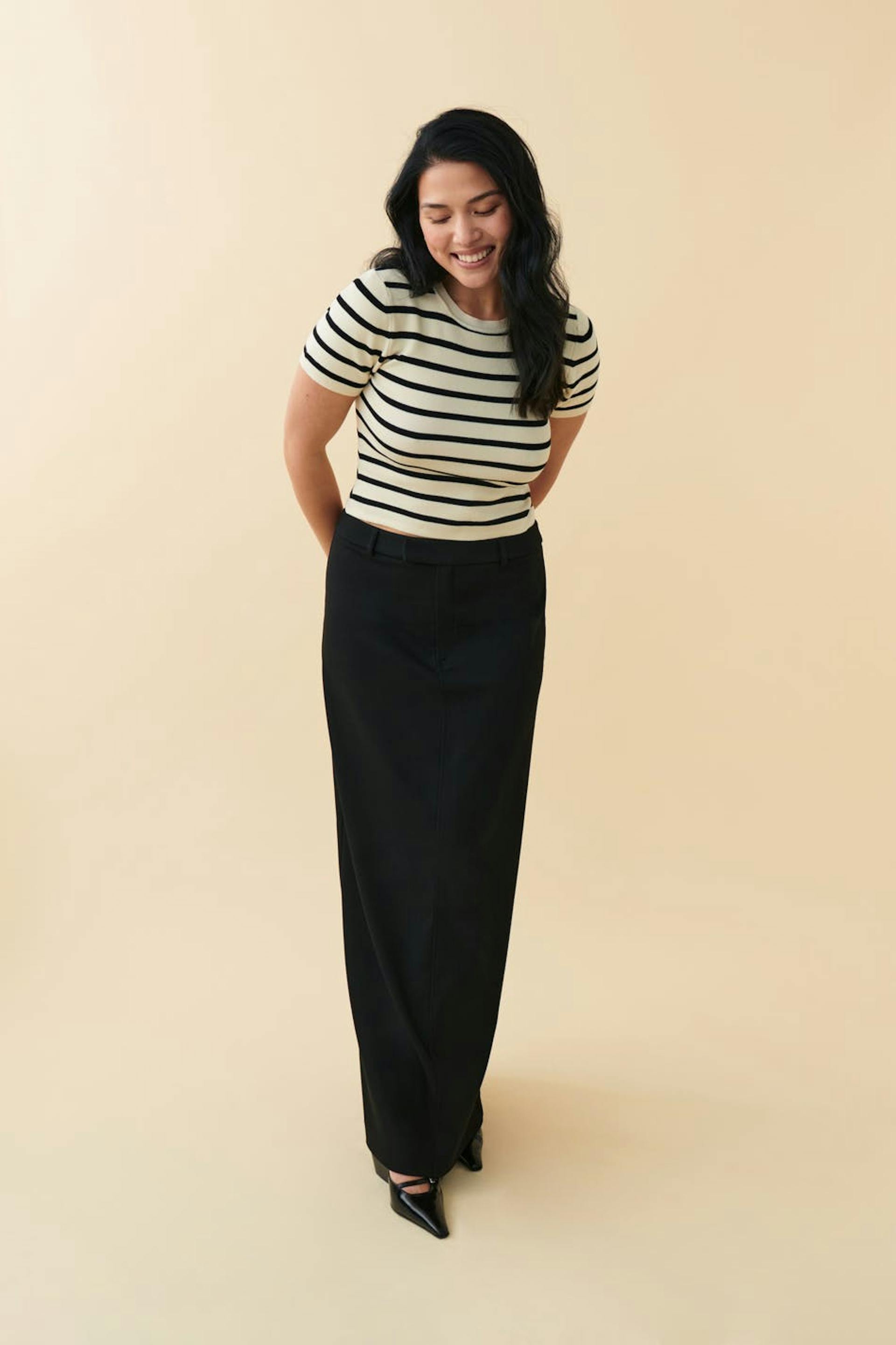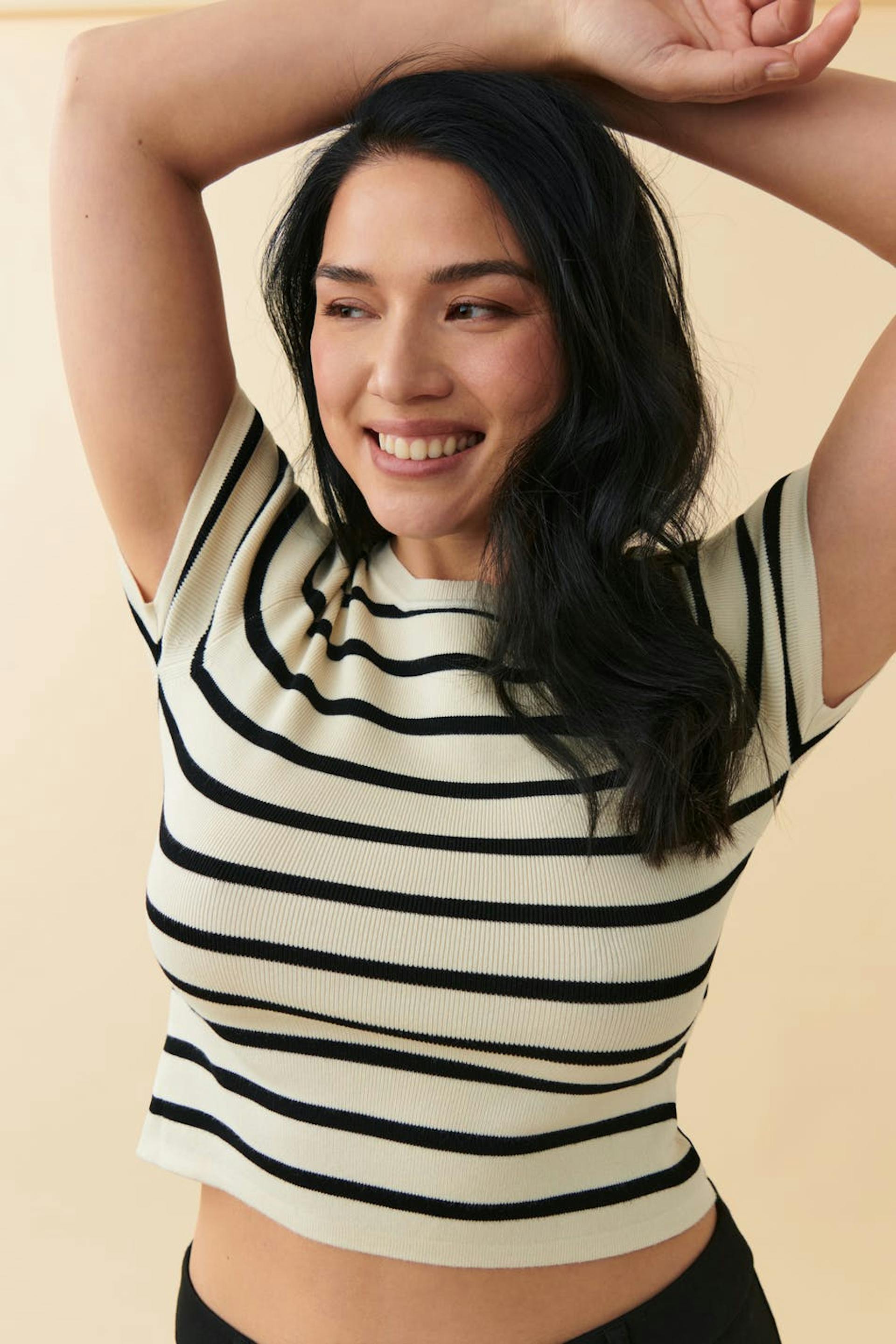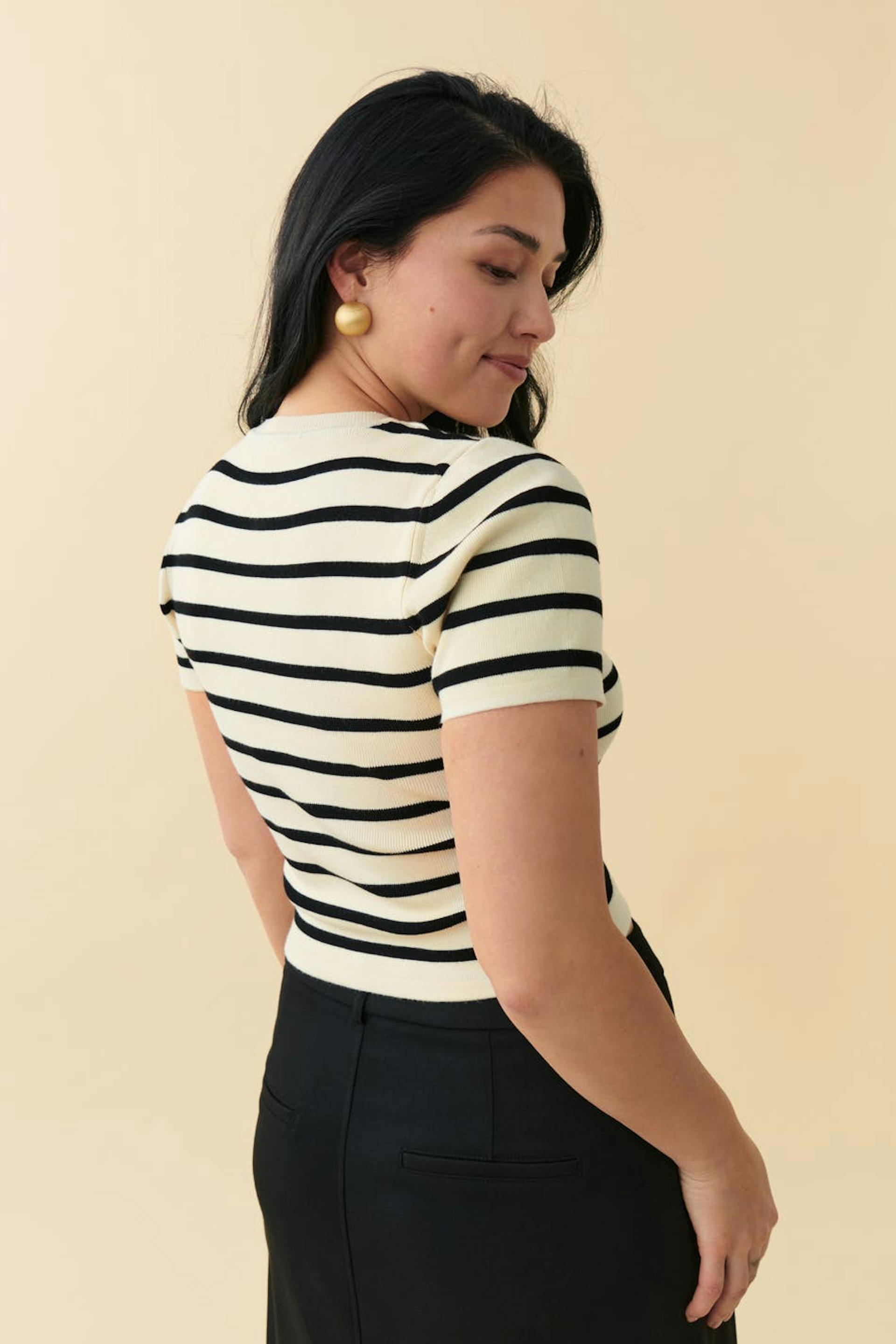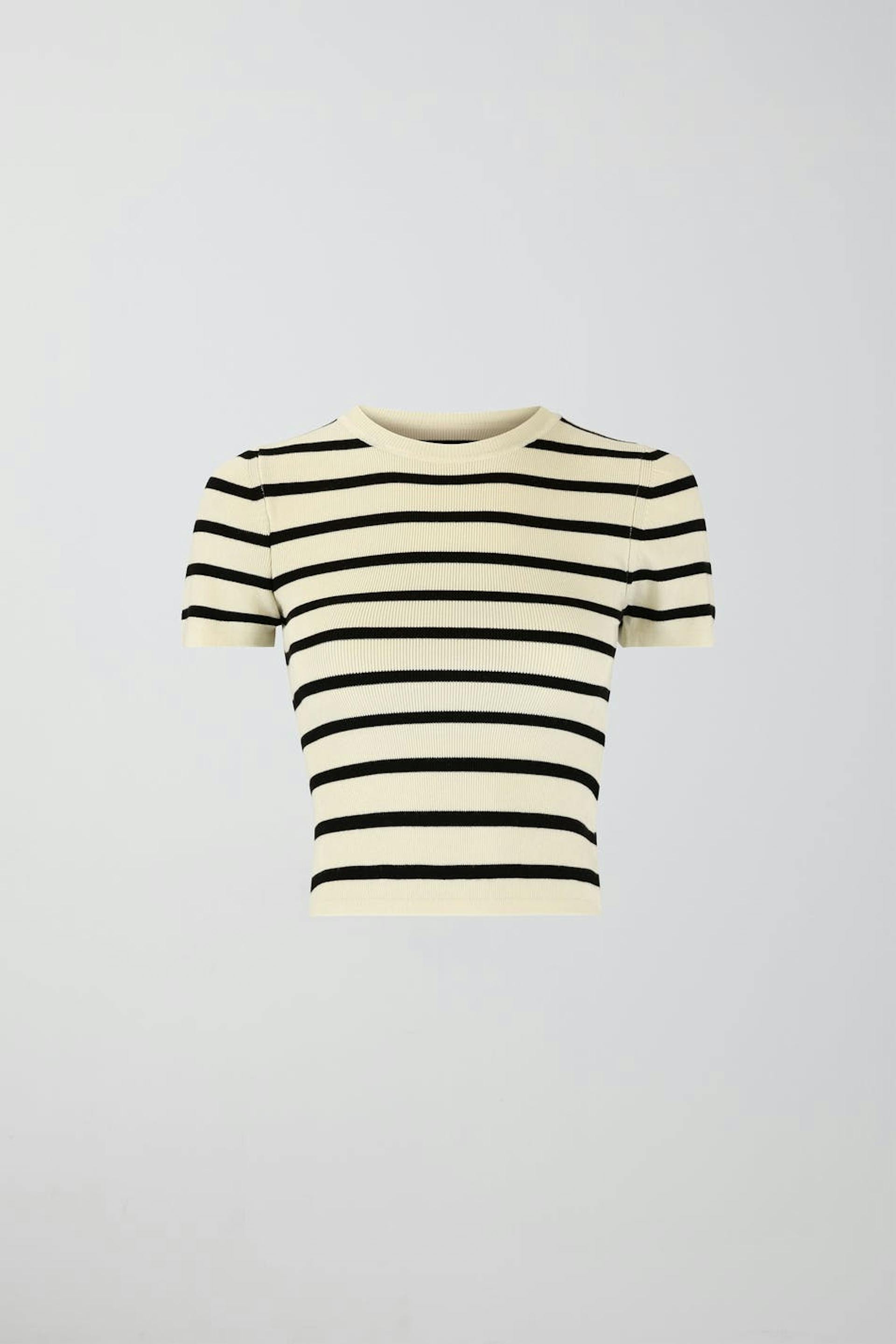 Striped top with short sleeve. The top is black, beige and knitted. It has figure-hugging fit.