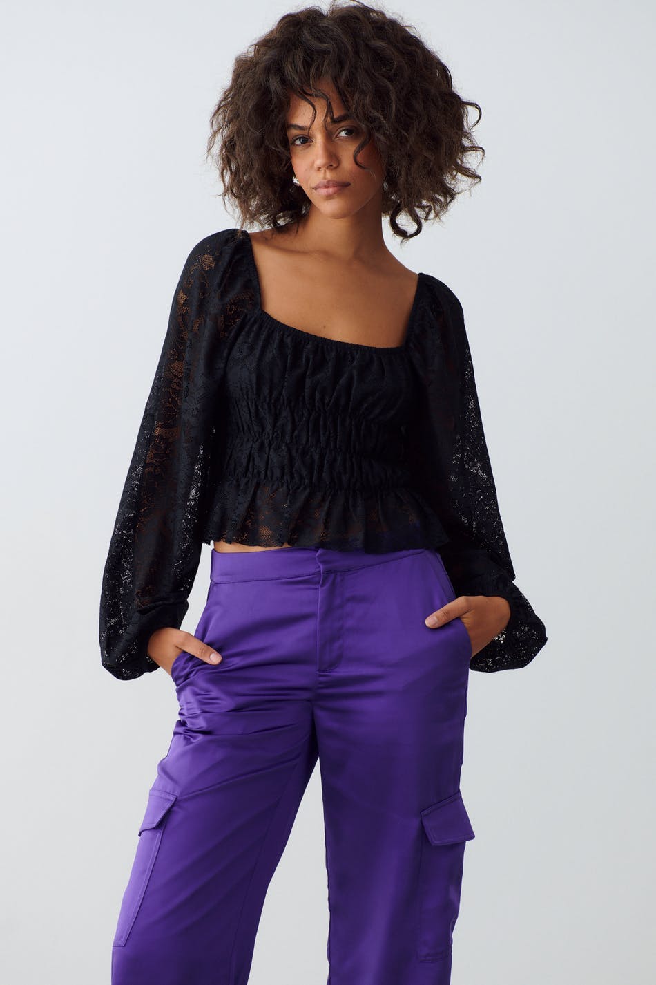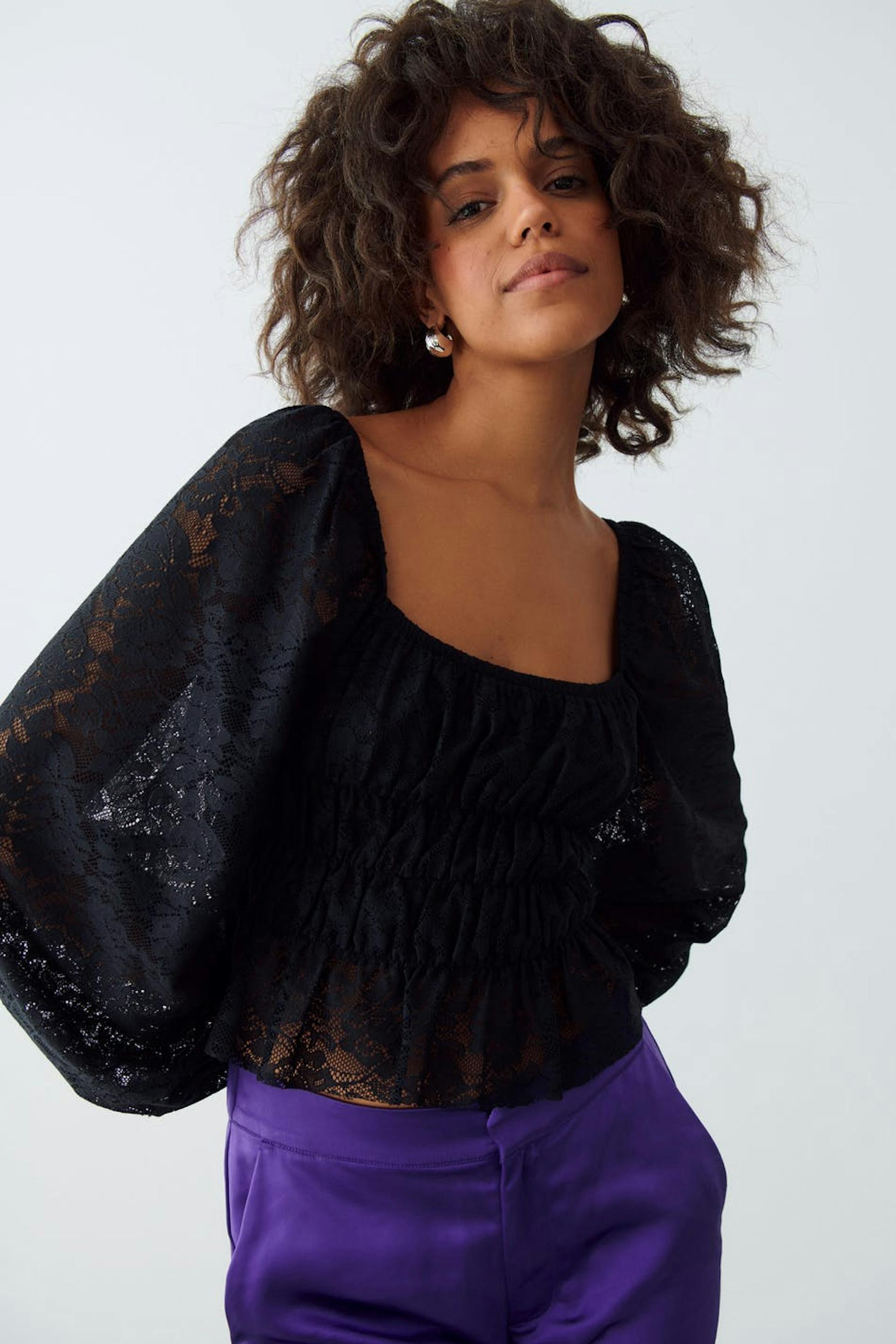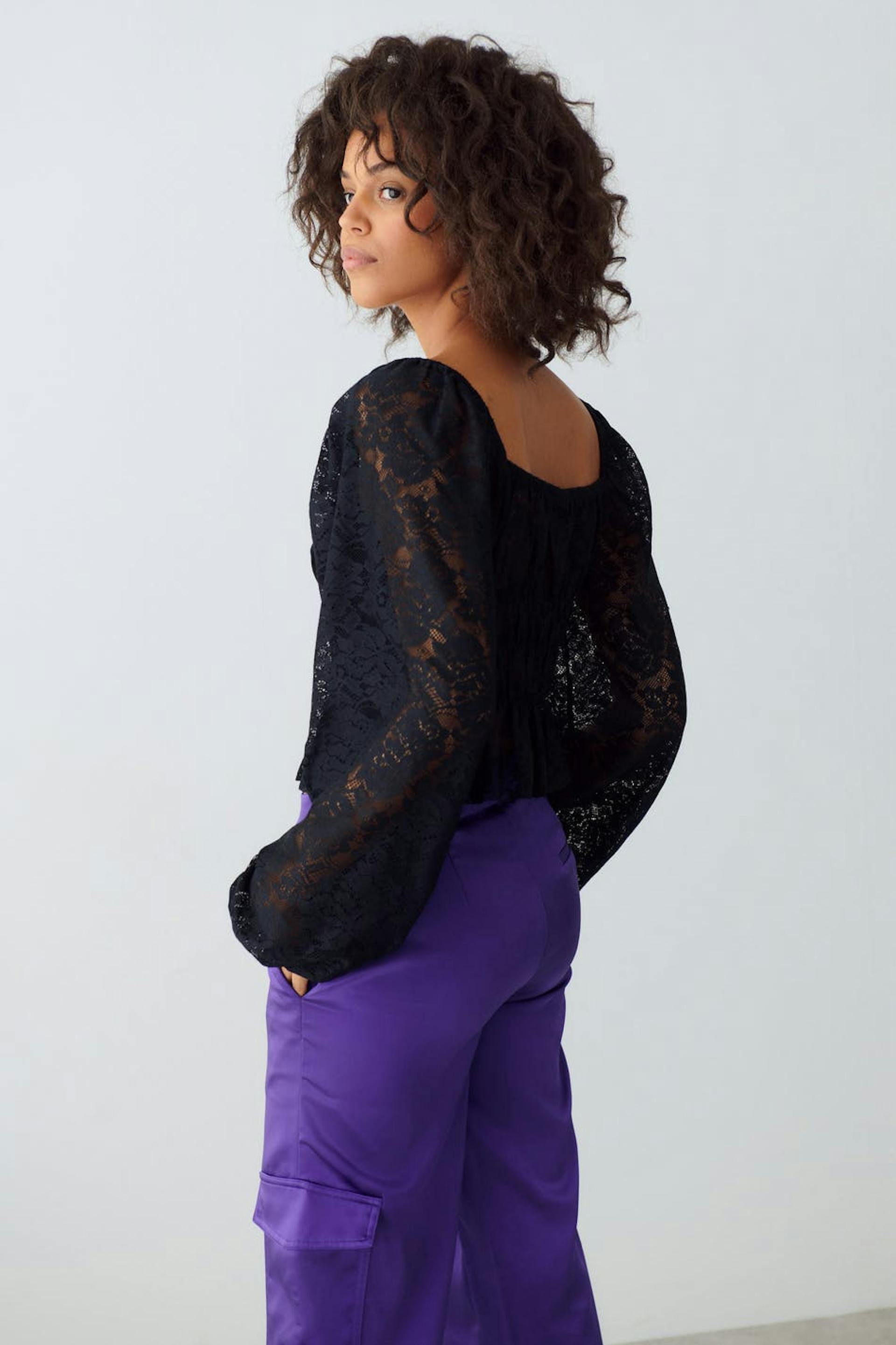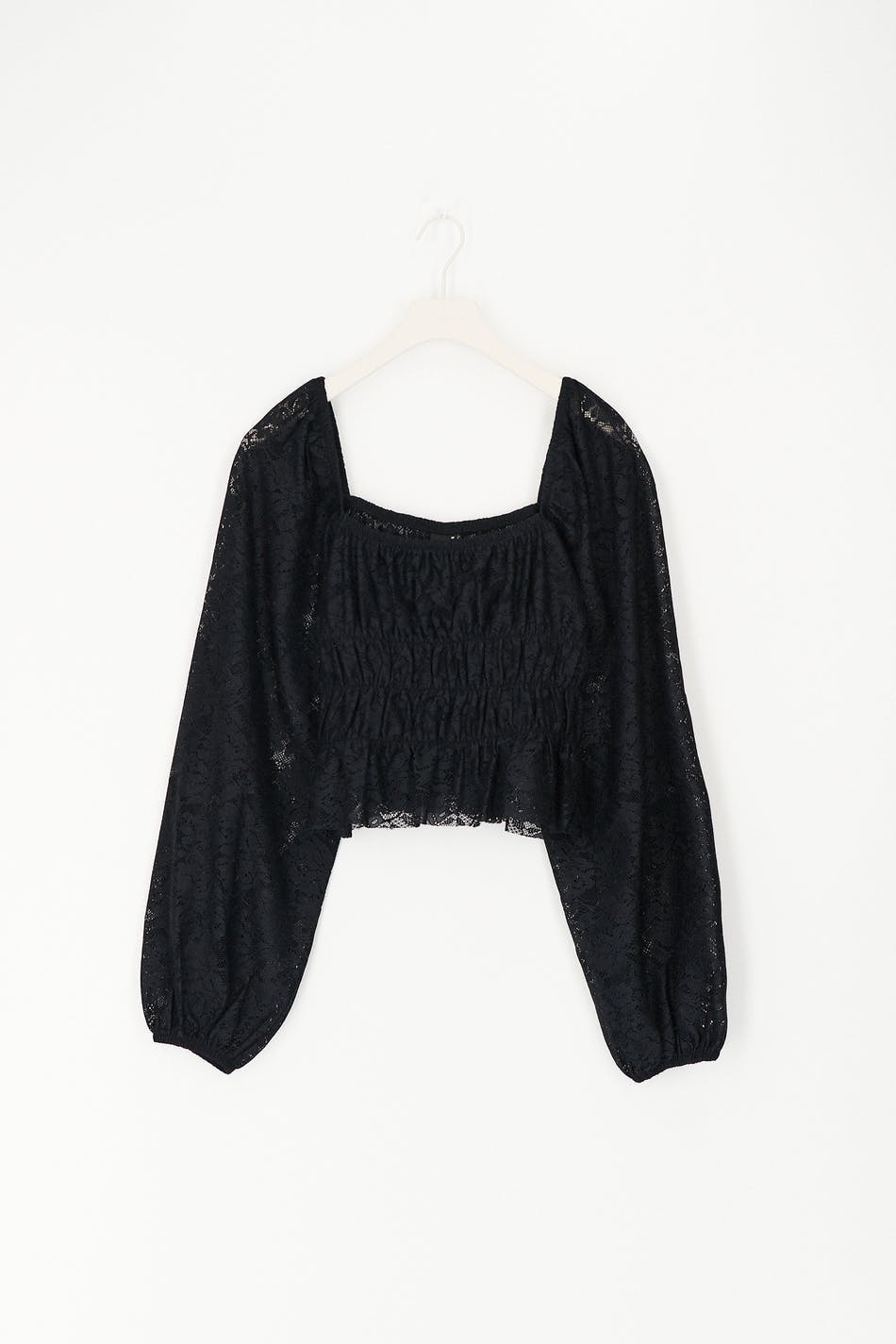 Lace top with balloon sleeves. The top is black and has square neckline. It has cropped length and elastic at the waist and on the neckline.