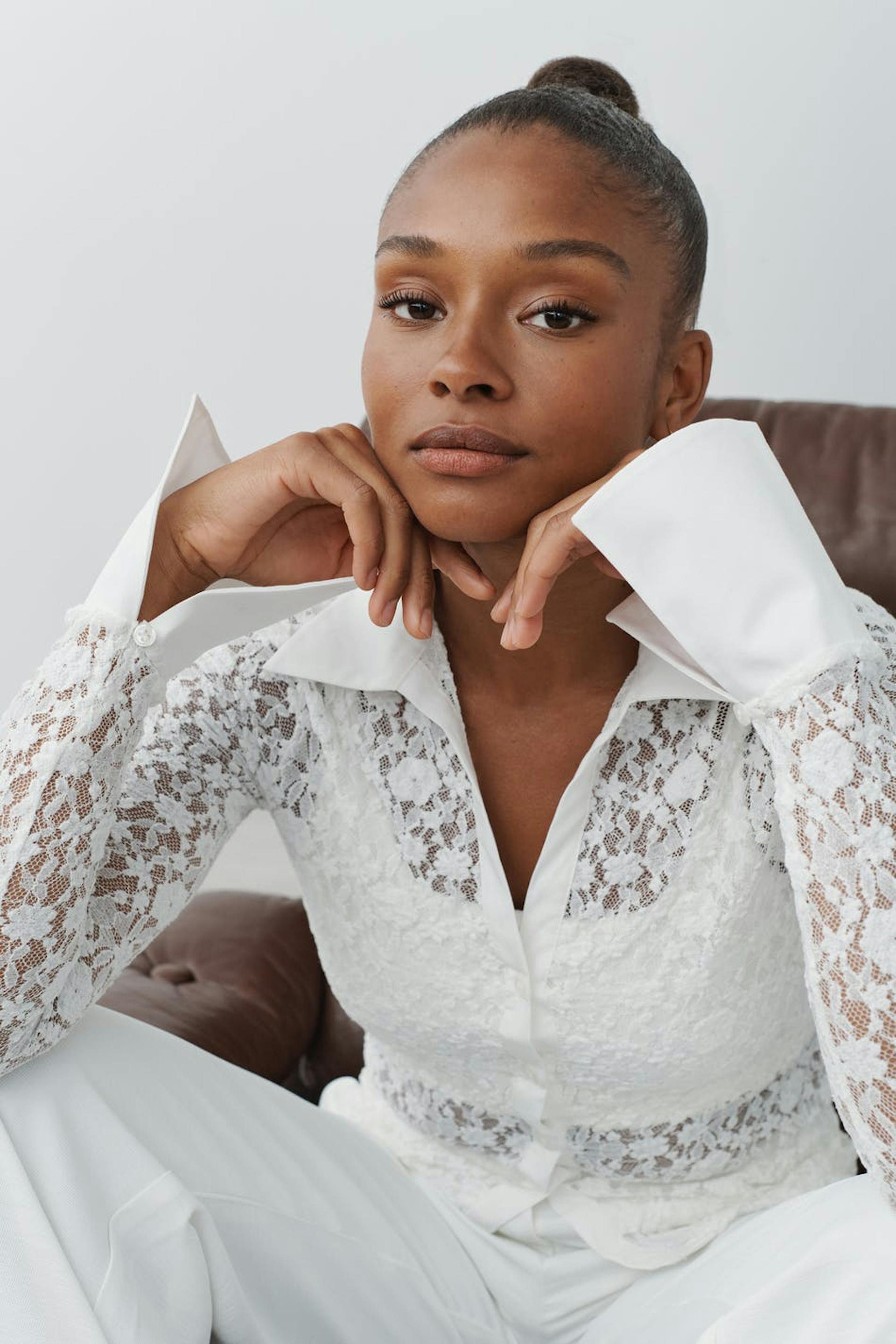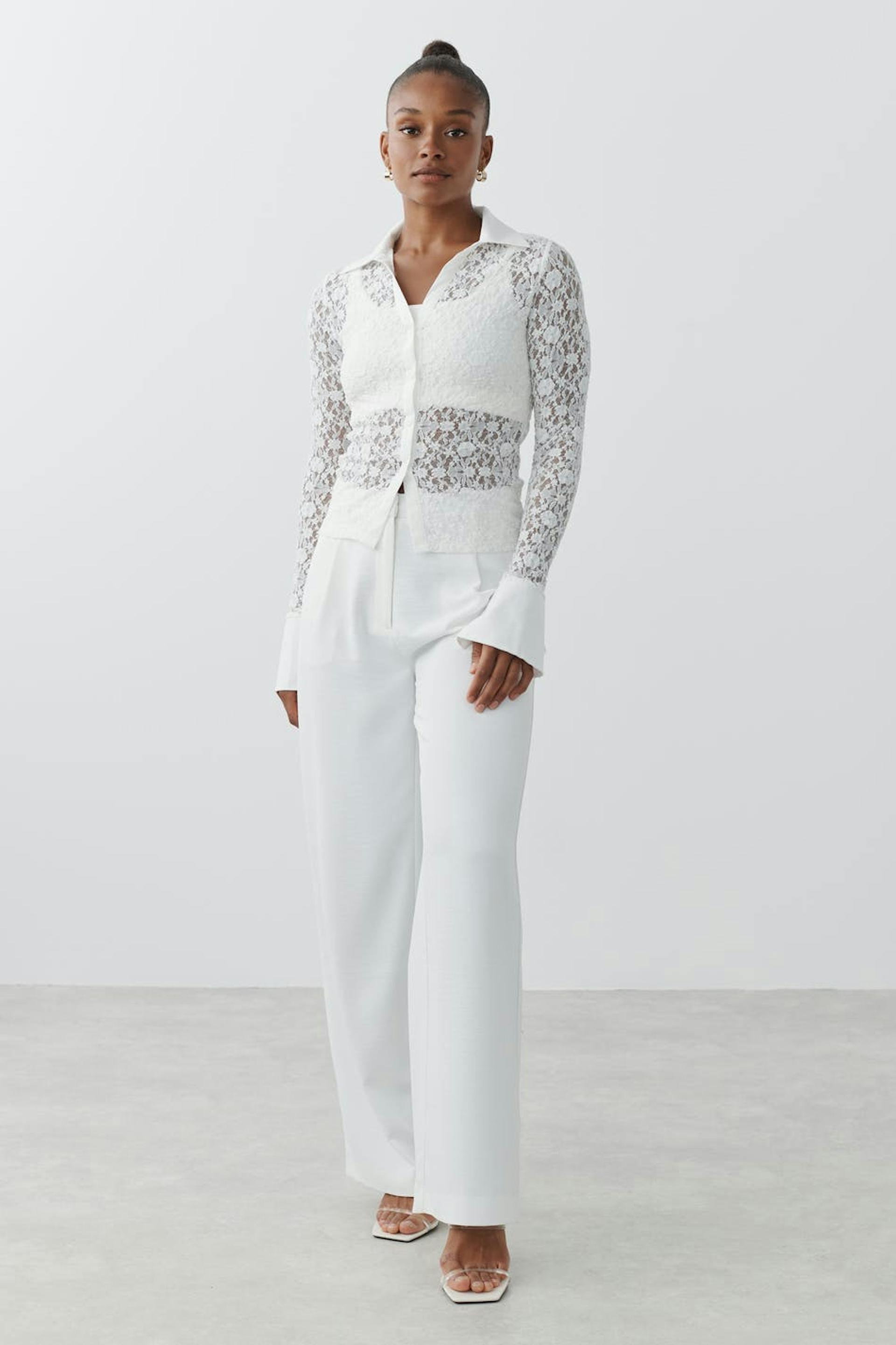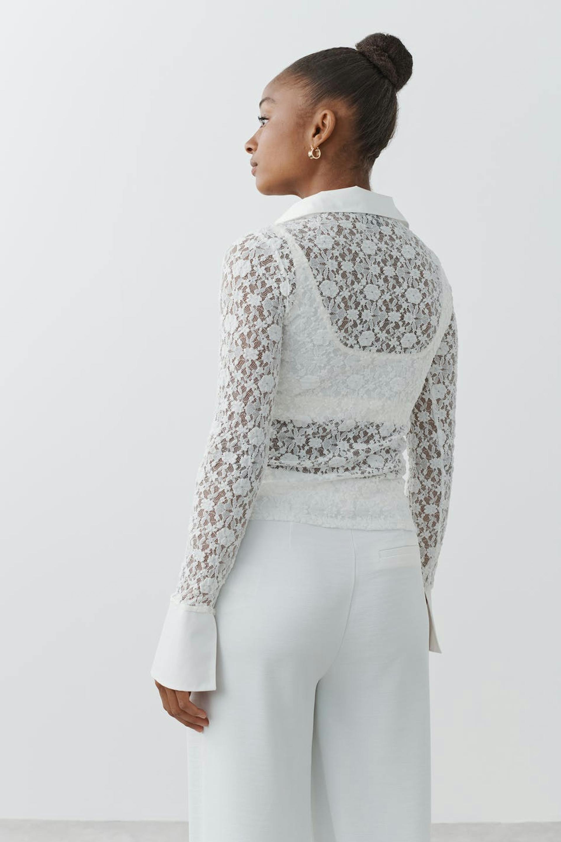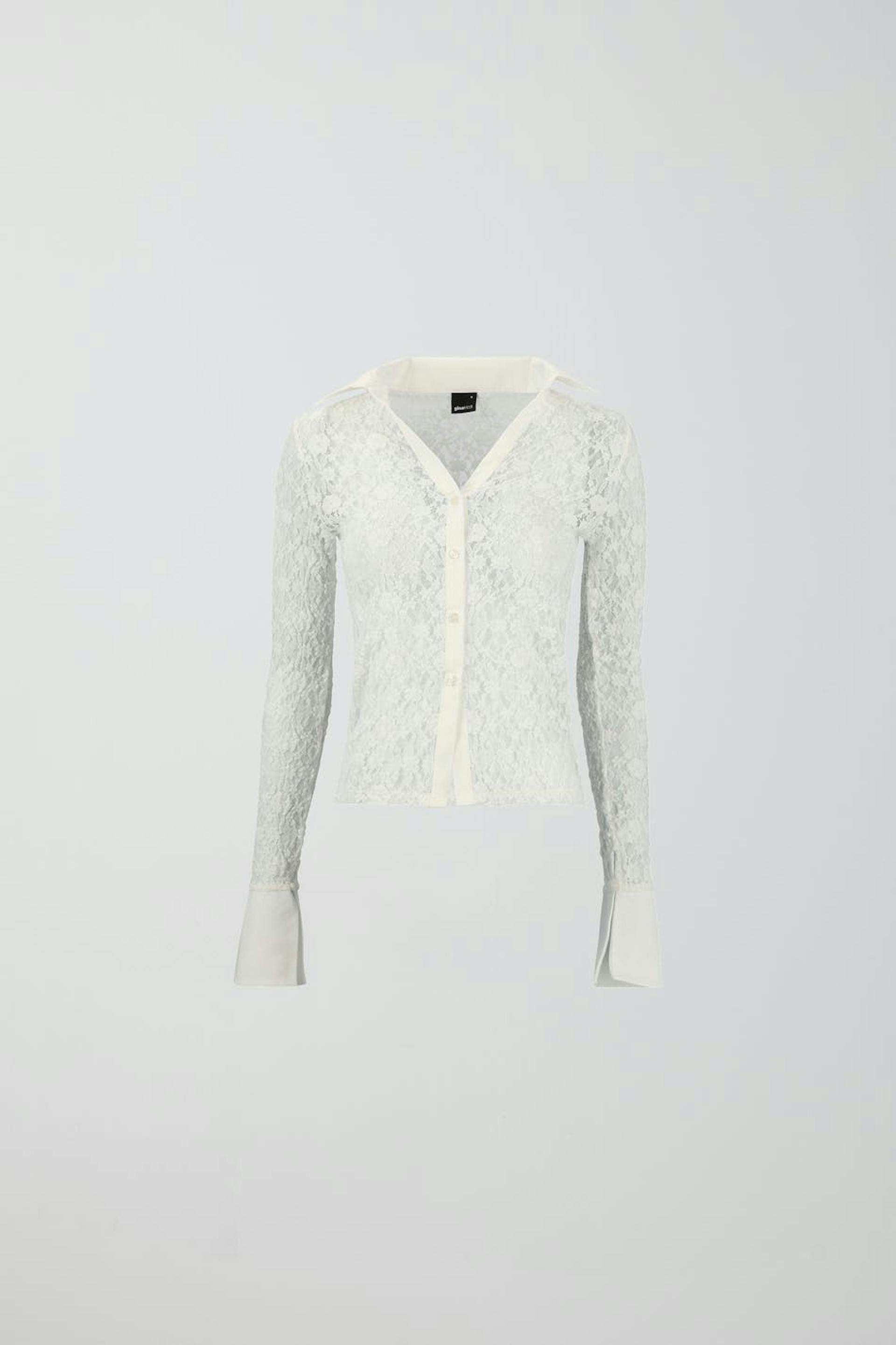 Lace shirt in stretch jersey with figure-hugging fit. The shirt is white and has button placket at the front. It has collar and long sleeve with button and cuff.