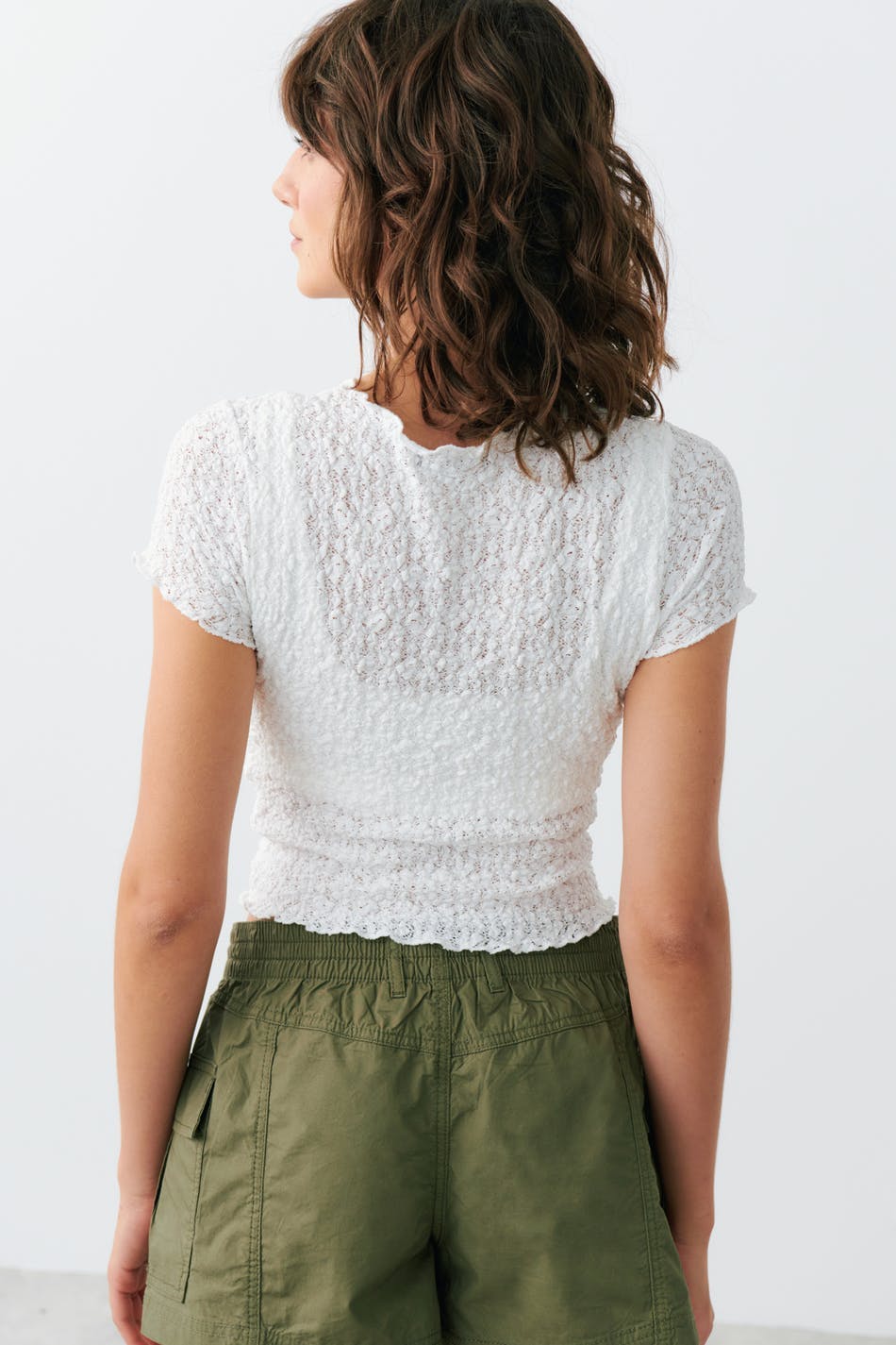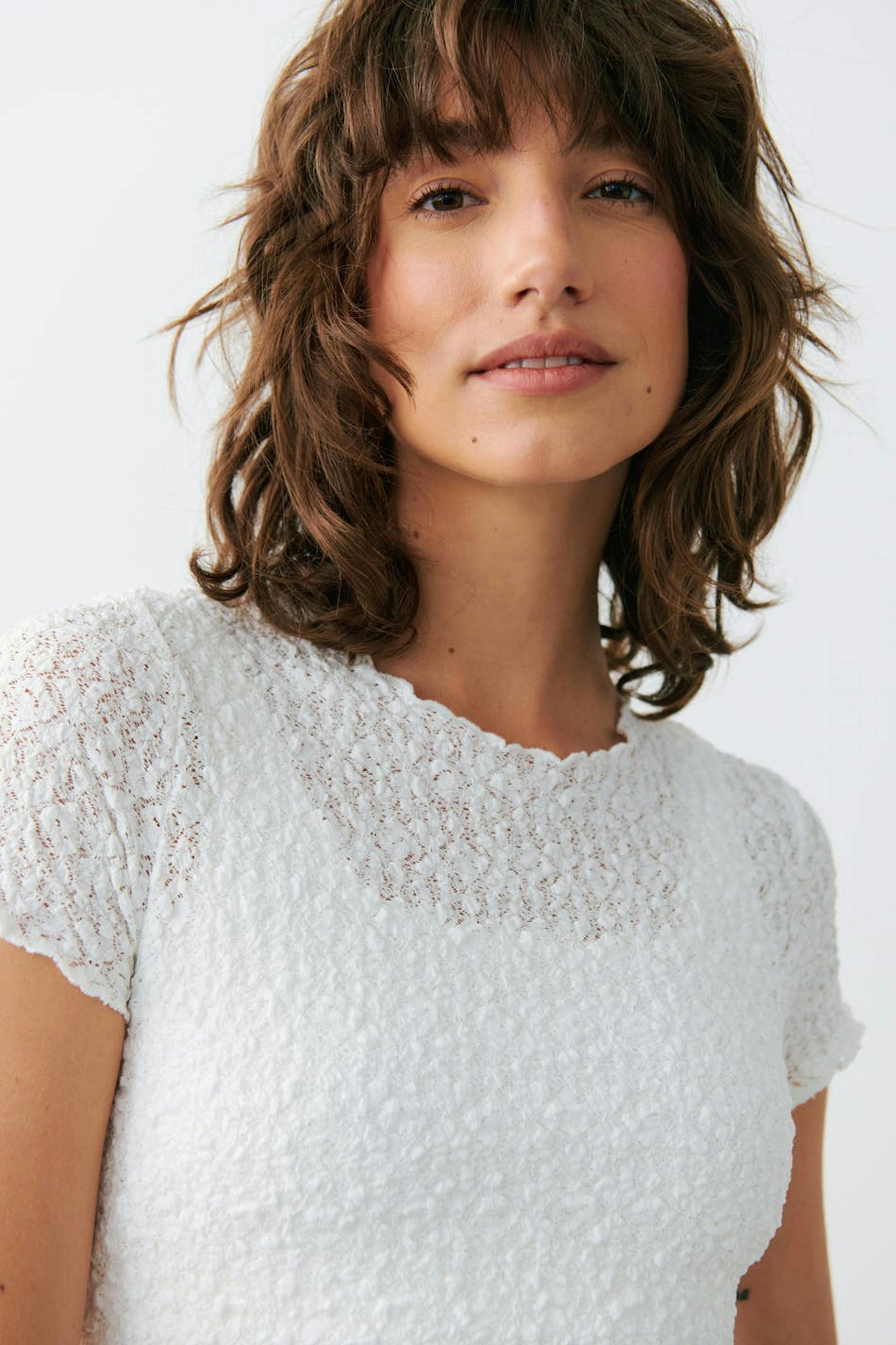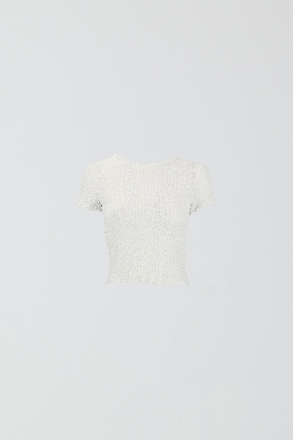Short-sleeved lace top with cap sleeve. The top is white and has normal fit. It has high neckline, textured quality, cropped length and overlocked hem.
