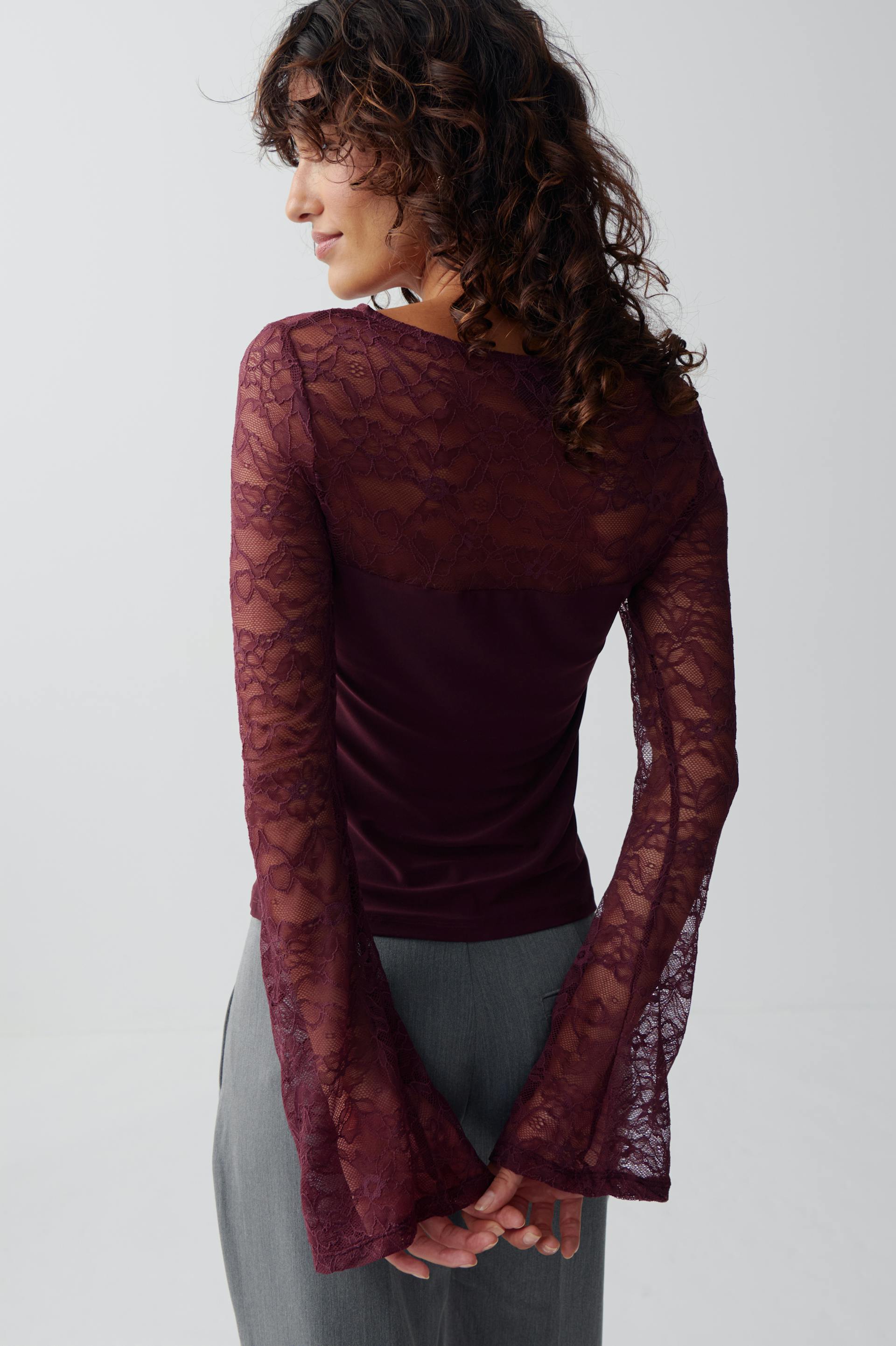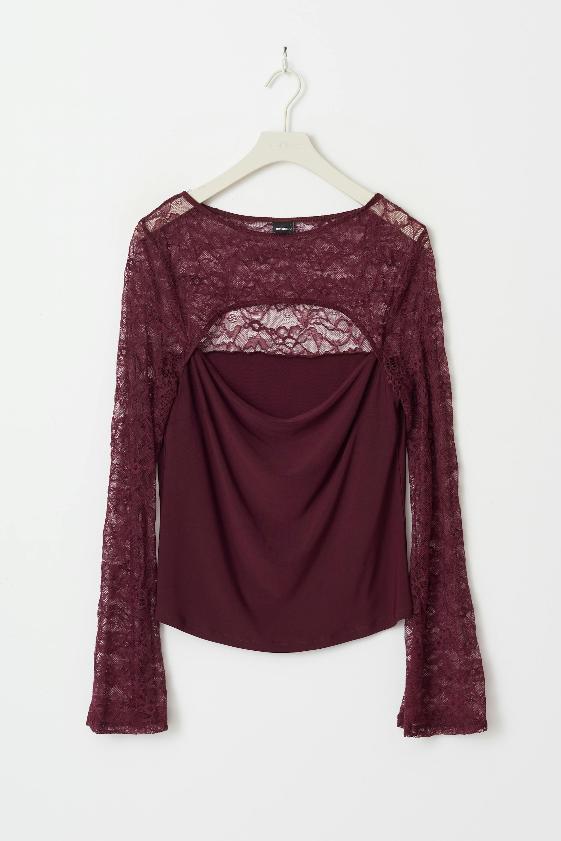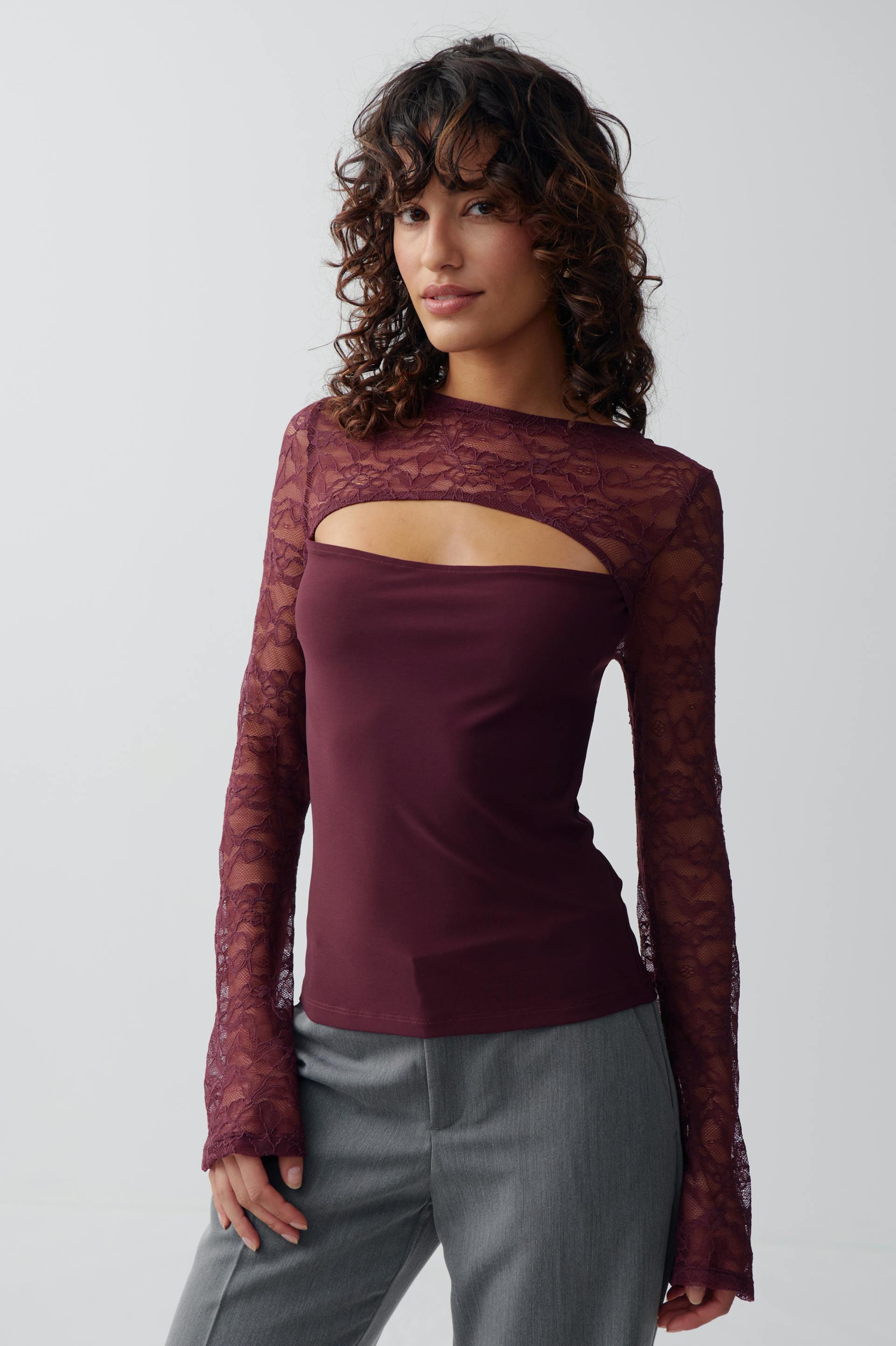 Long-sleeved lace top with cut-out detail at the front. The top is wine and has boat neckline. It has figure-hugging fit and regular length.