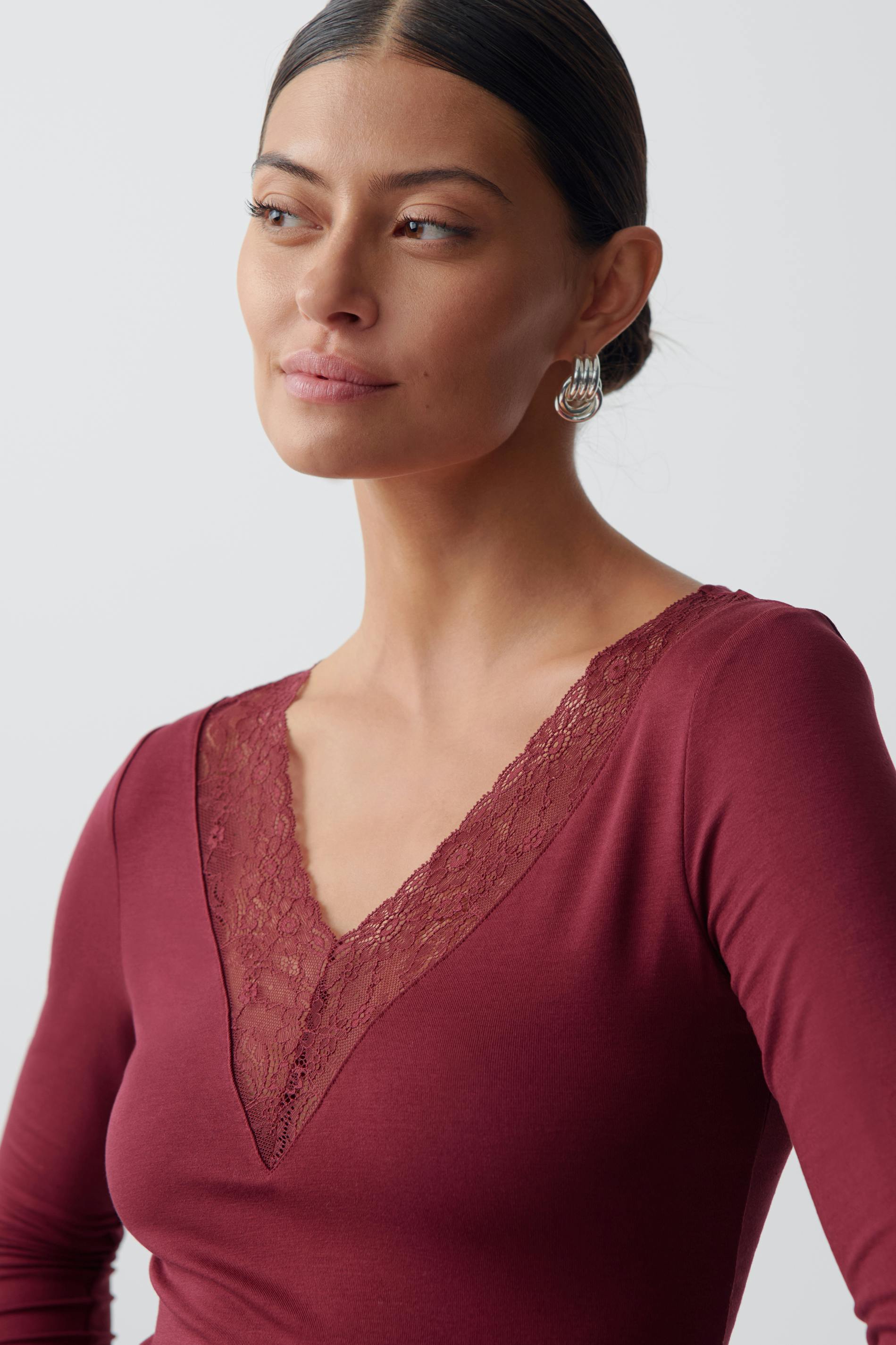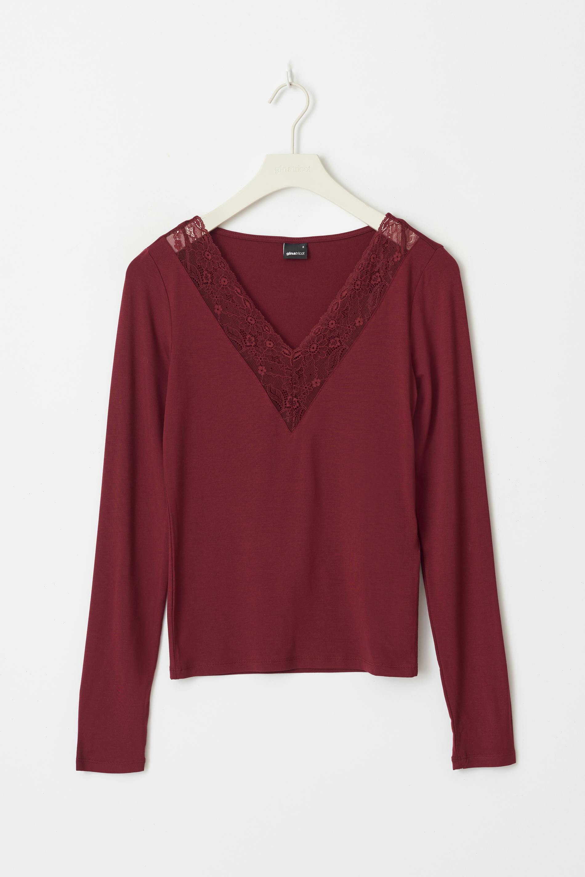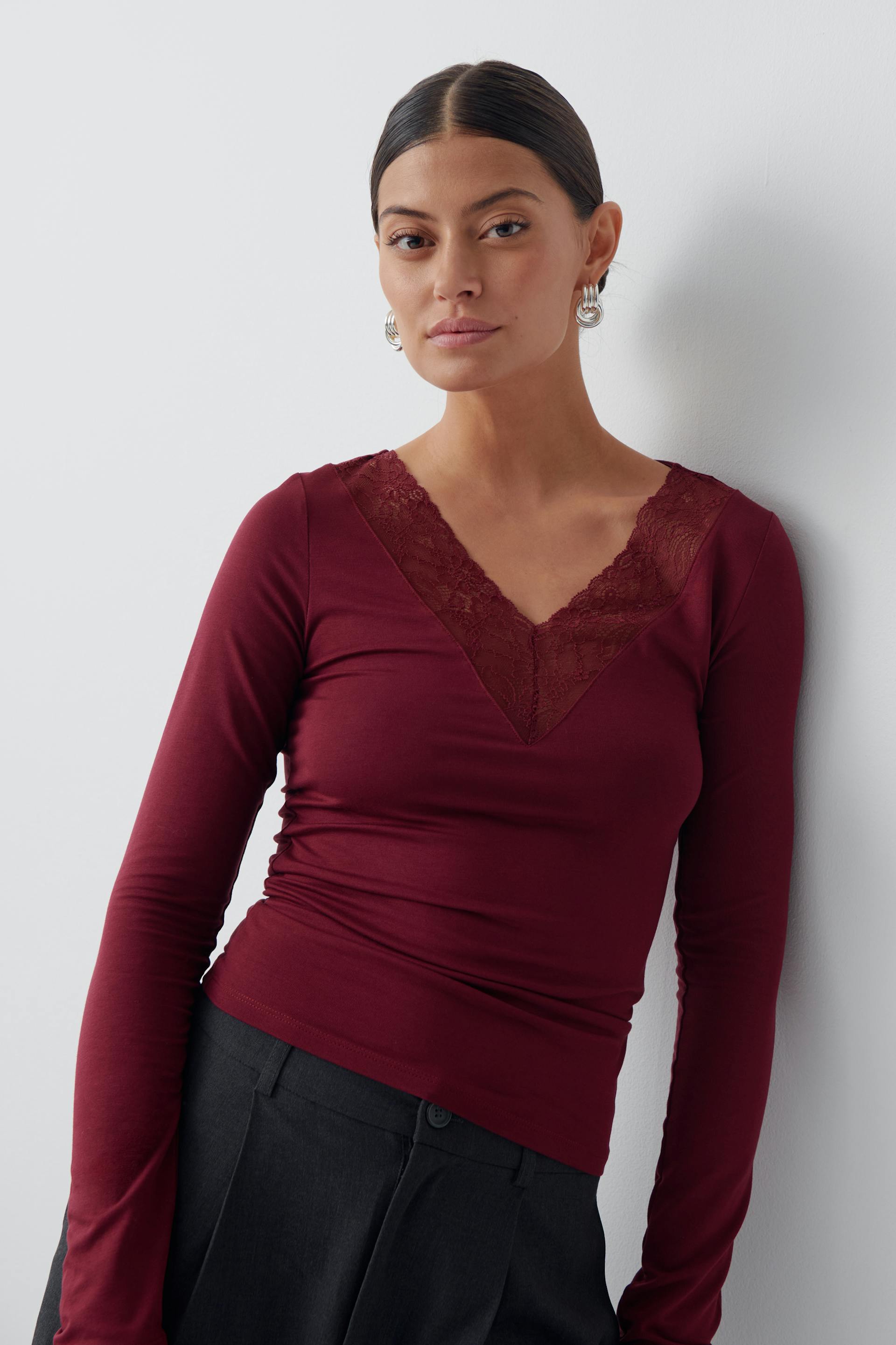 Long sleeve top in soft viscose with lace on the neckline. The top is wine and has regular fit. It has stretchy quality, v-neck and regular length.