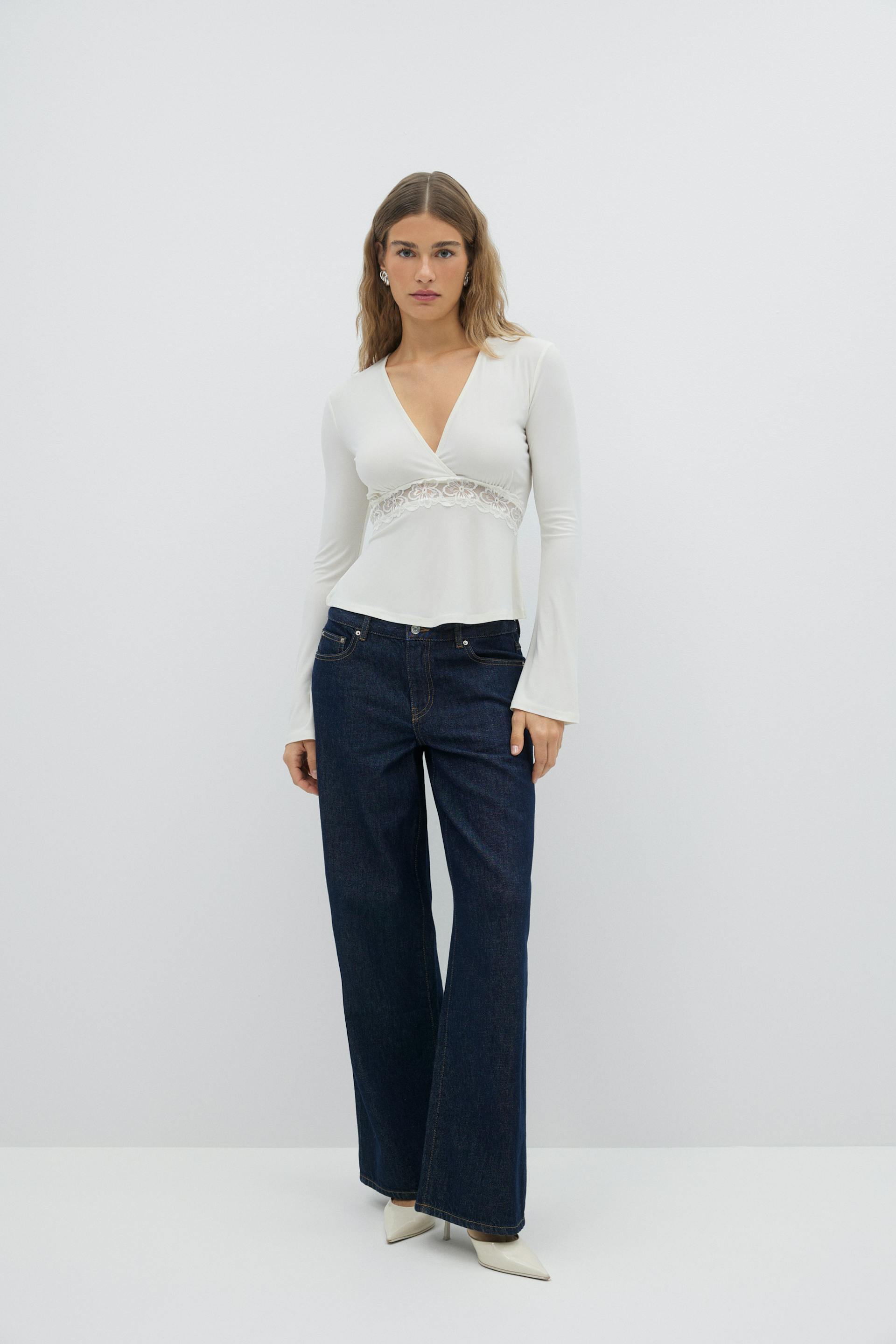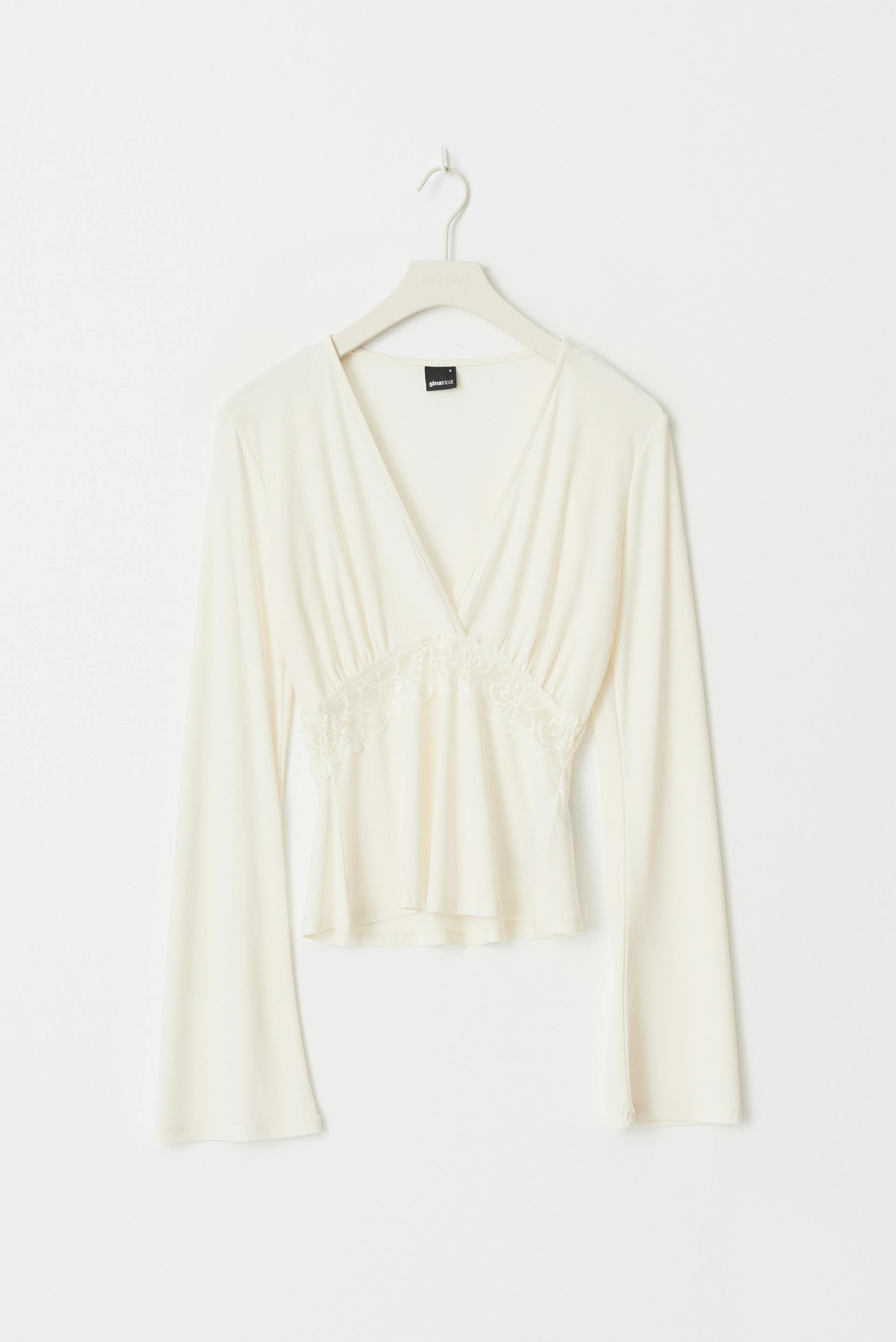Long sleeve top with lace detail at the waist. The top is white and has v-neck. It has lantern sleeve and regular length.