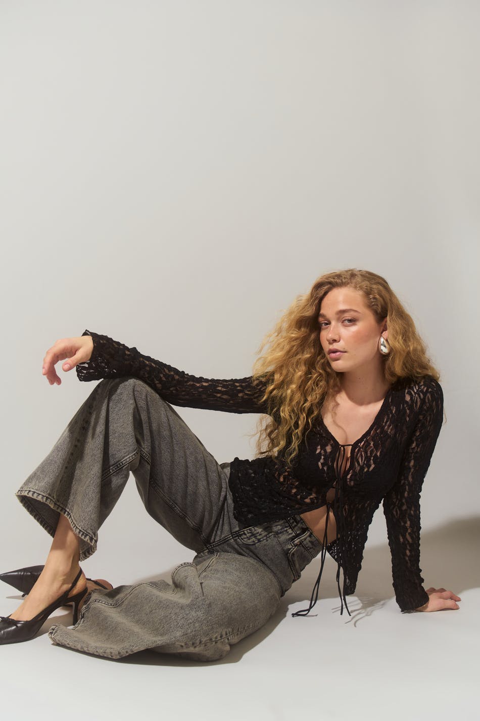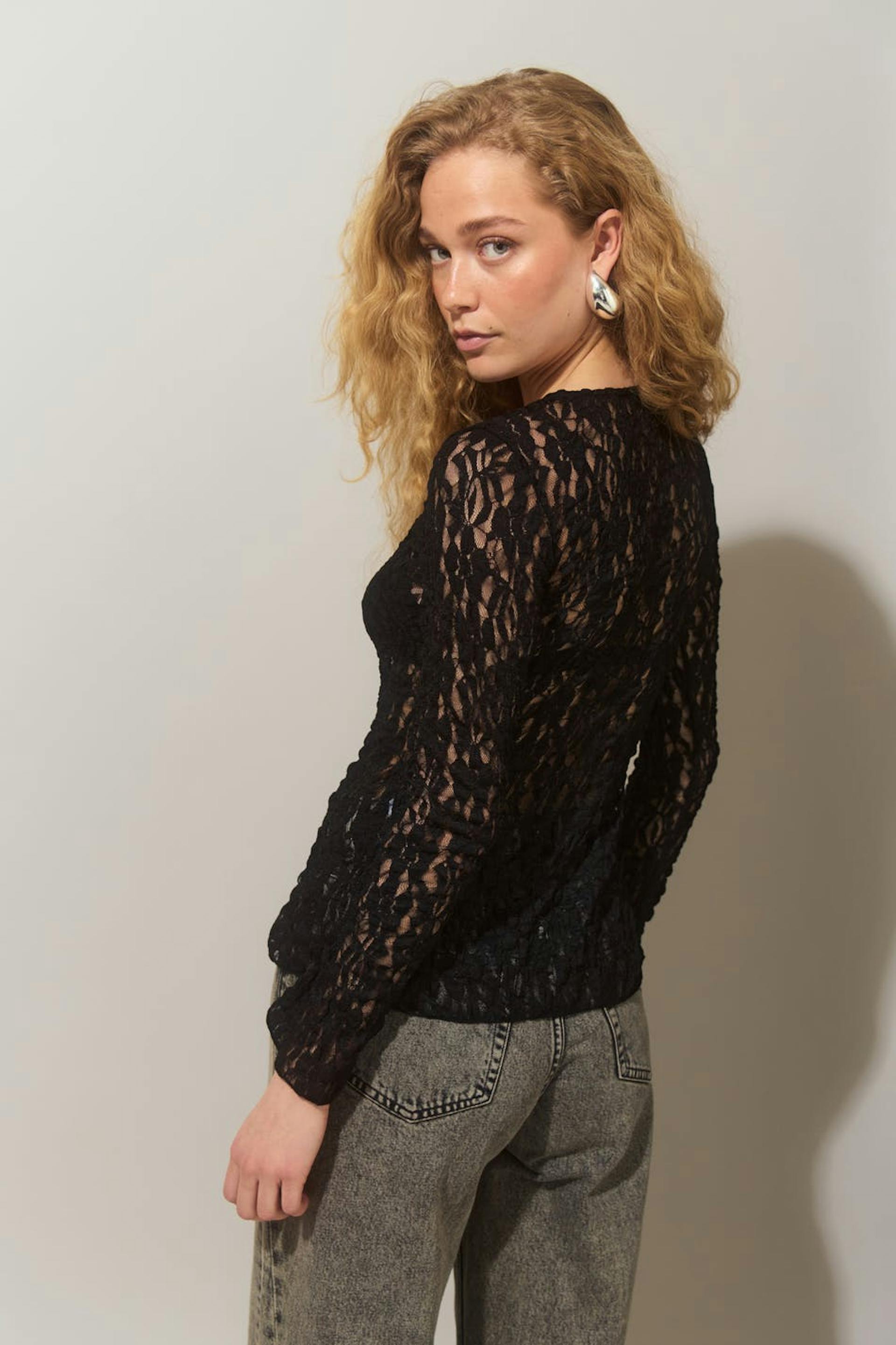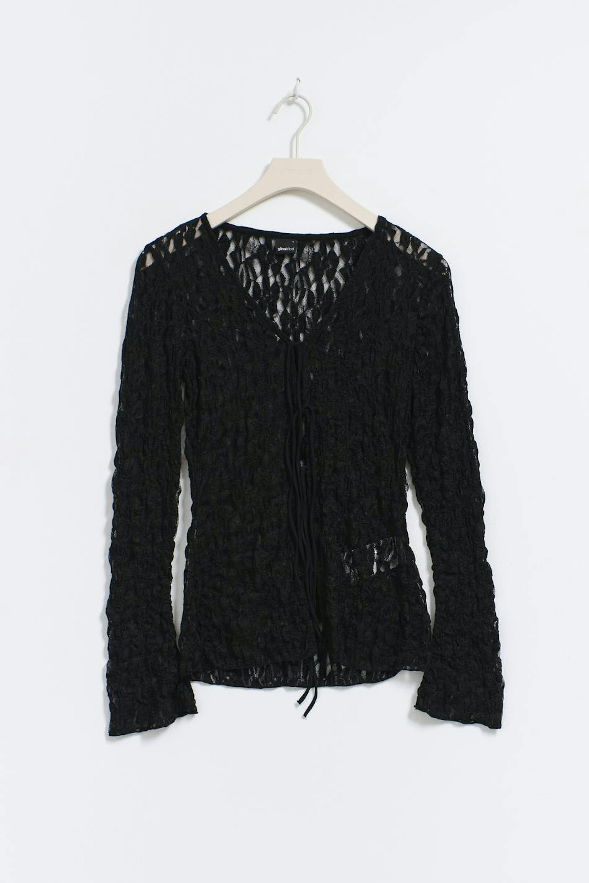 Lace top with string tie closure at the front. The top is black and has regular fit. It has v-neck, long sleeve and regular length.