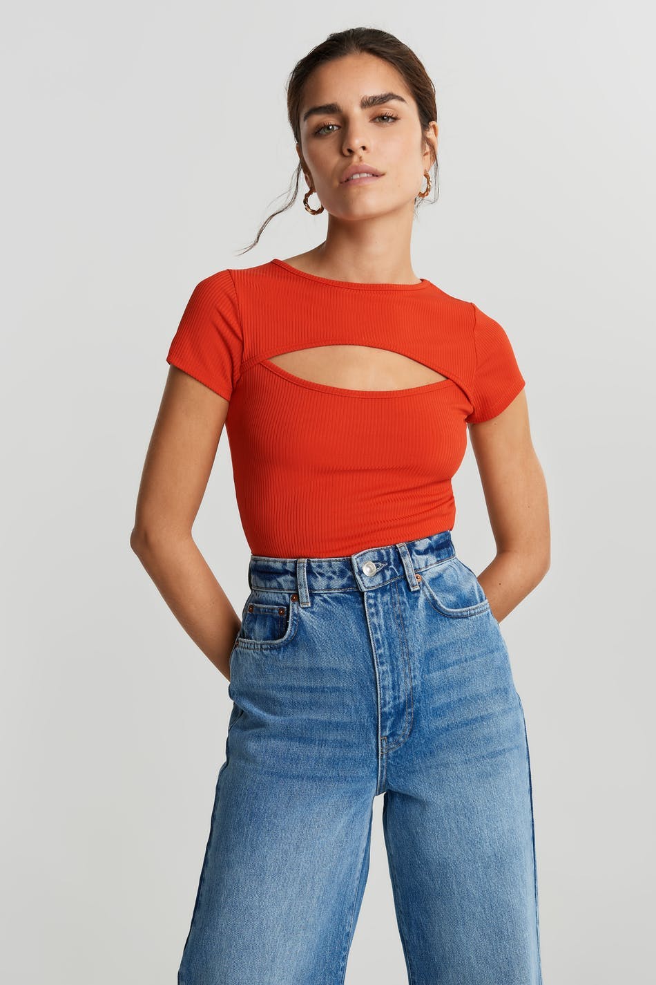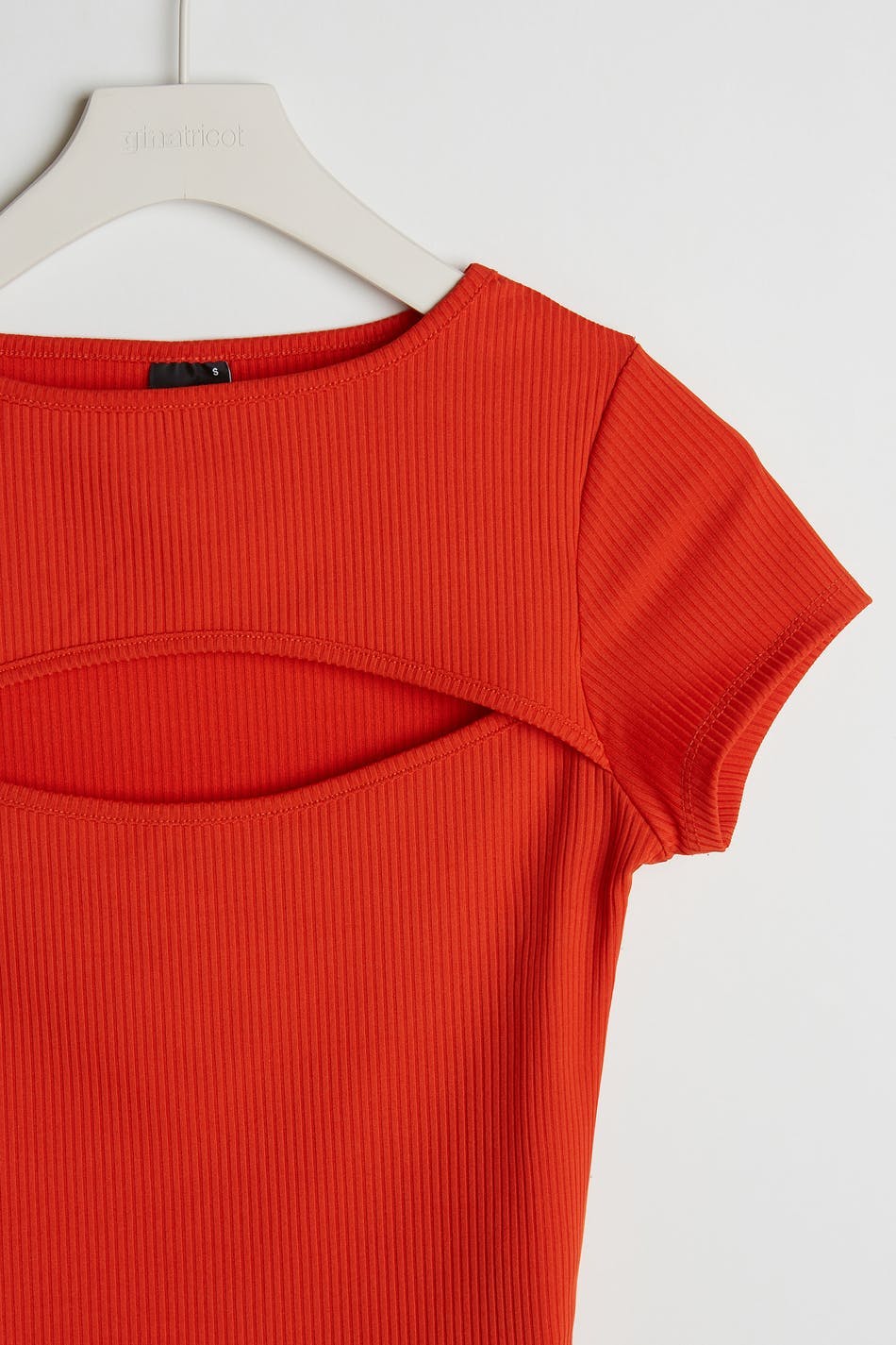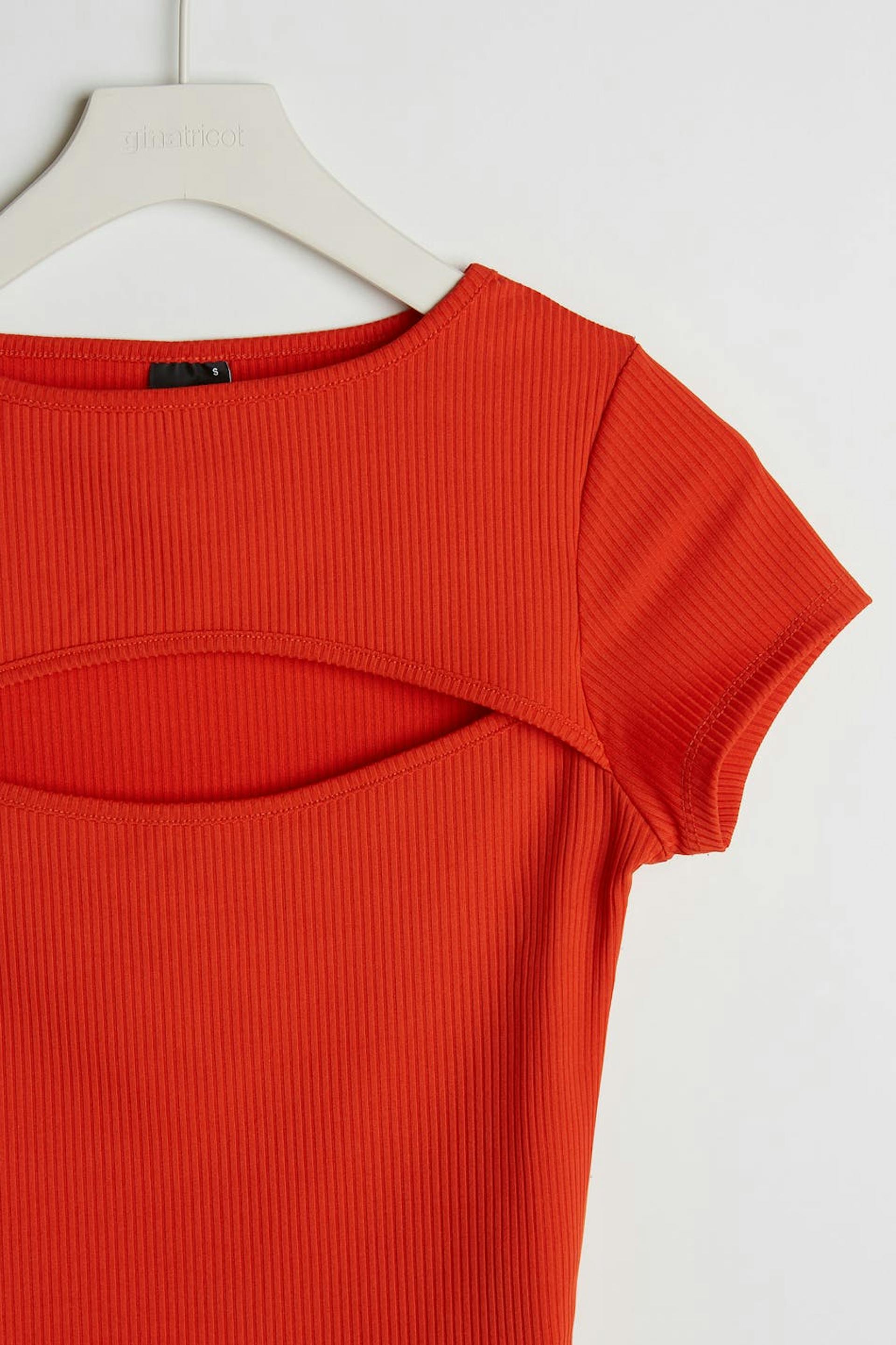 Short-sleeved top with a normal fit. The top is red and has a cutout detail above the bust.