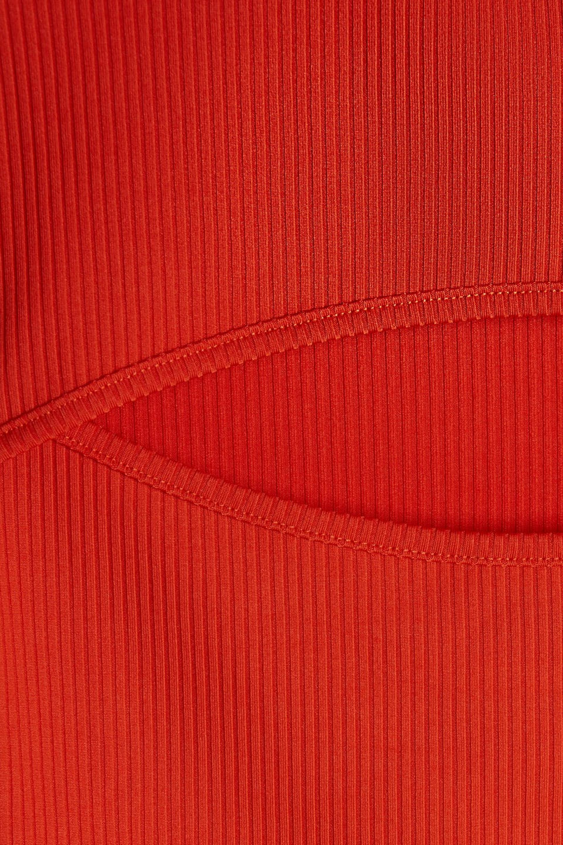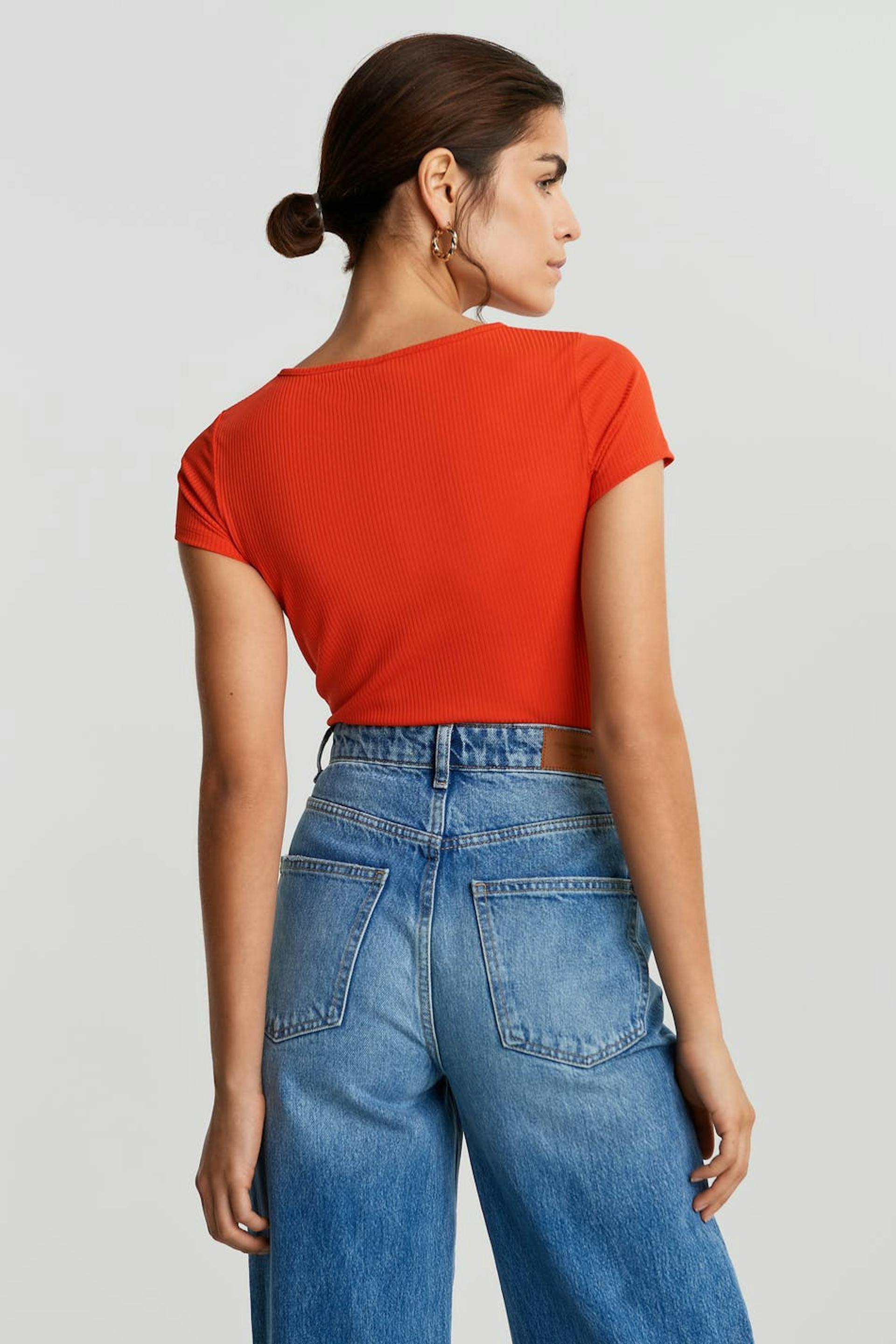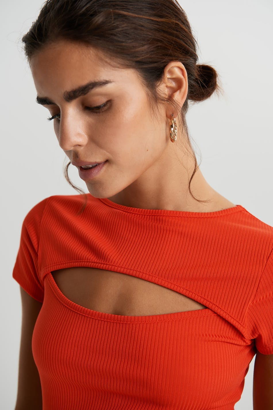 Short-sleeved top with a normal fit. The top is red and has a cutout detail above the bust.
