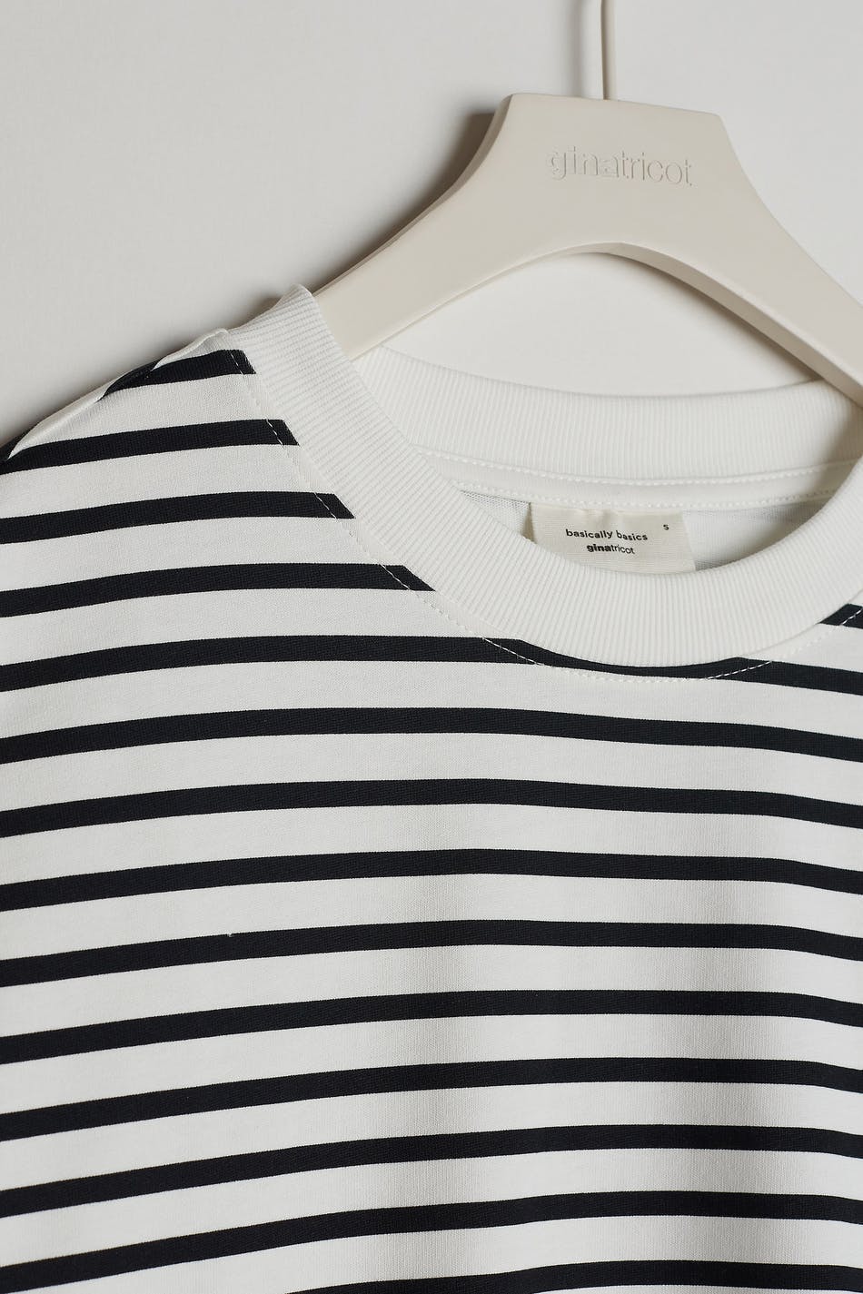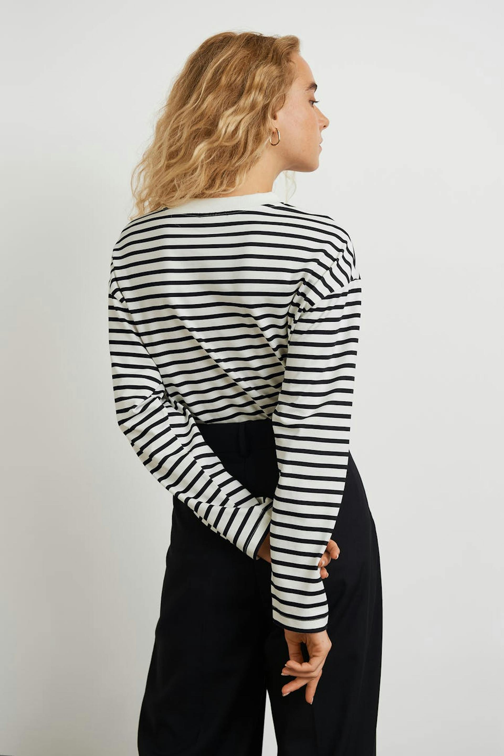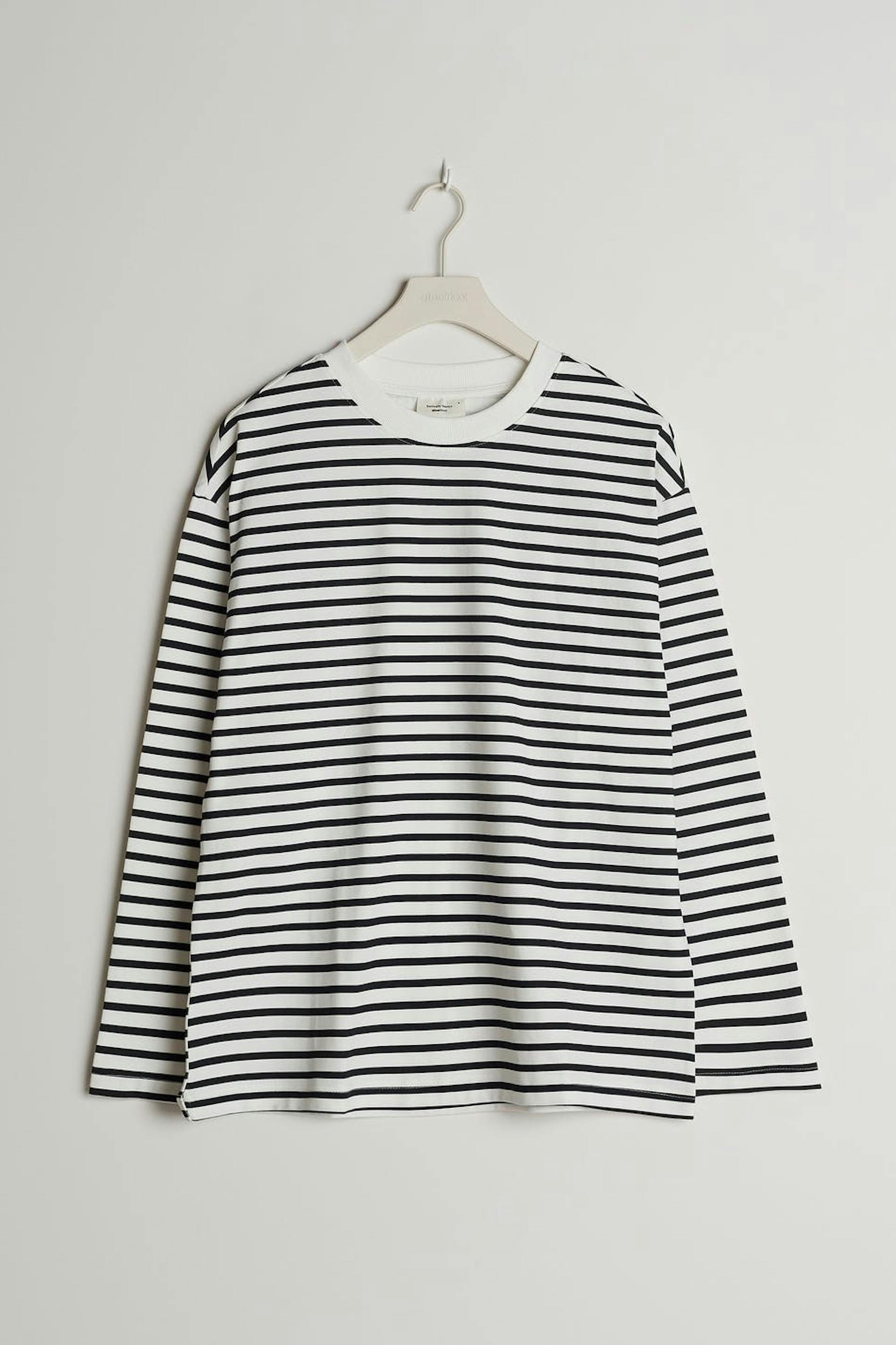 Striped top with an oversize fit. The top is white, black and long-sleeved. It has a soft material in cotton and a rounded neckline with a ribbed cuff.