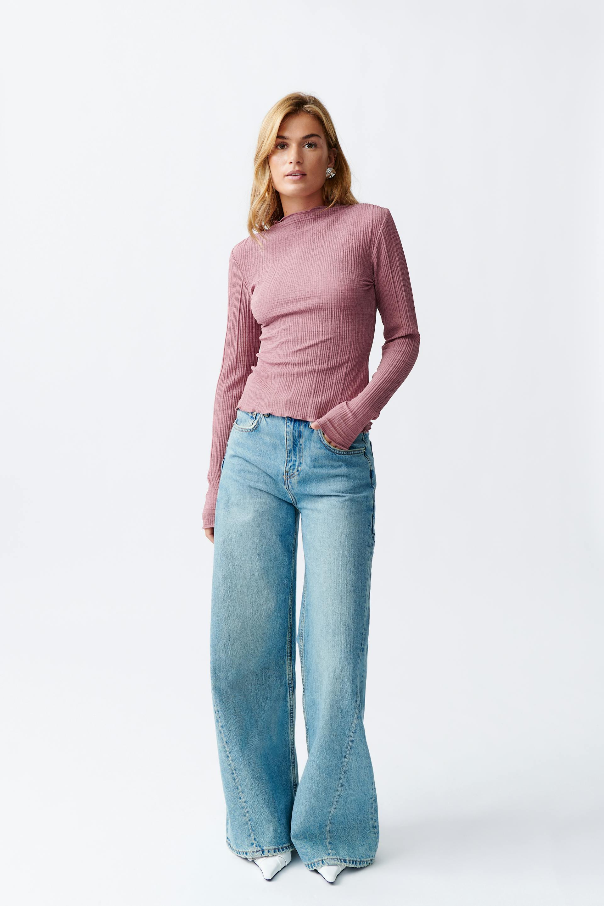 Pleated top with boat neckline. The top is pink and has sheer quality. It has regular fit, structured material, long sleeve and overlocked hem.