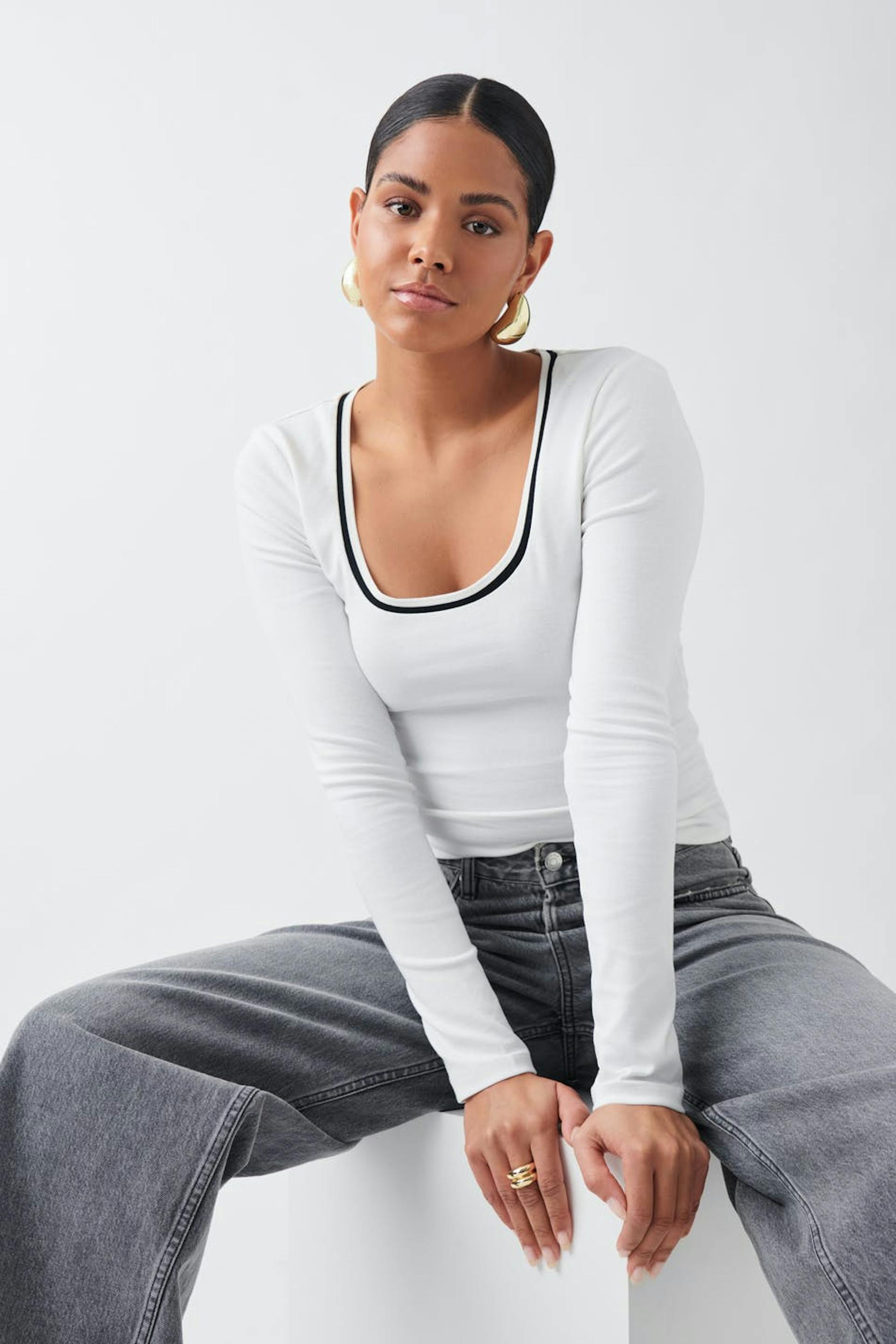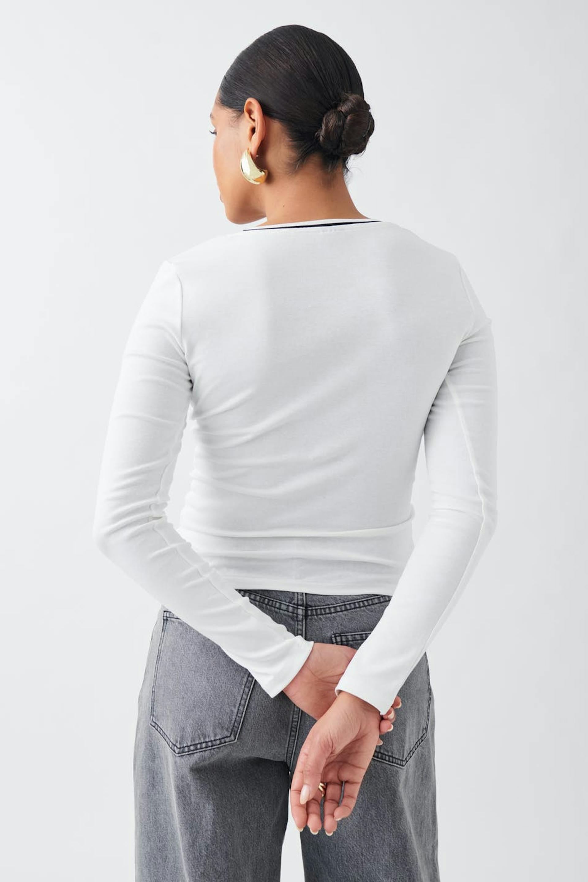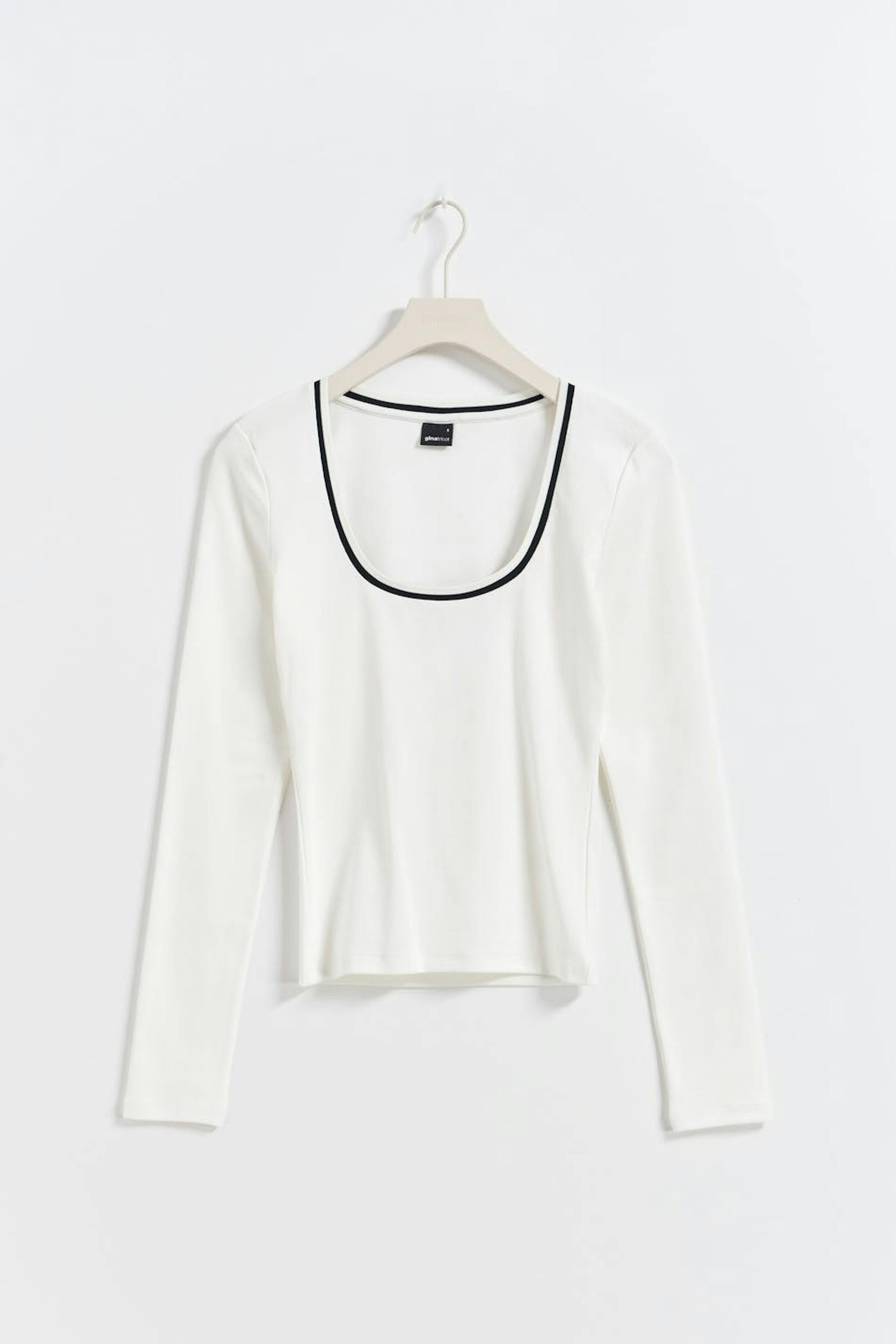 Long-sleeved top with figure-hugging fit. The top is white and has deep u-neck. It has ribbed quality, contrast-coloured detail on the neckline and regular length.